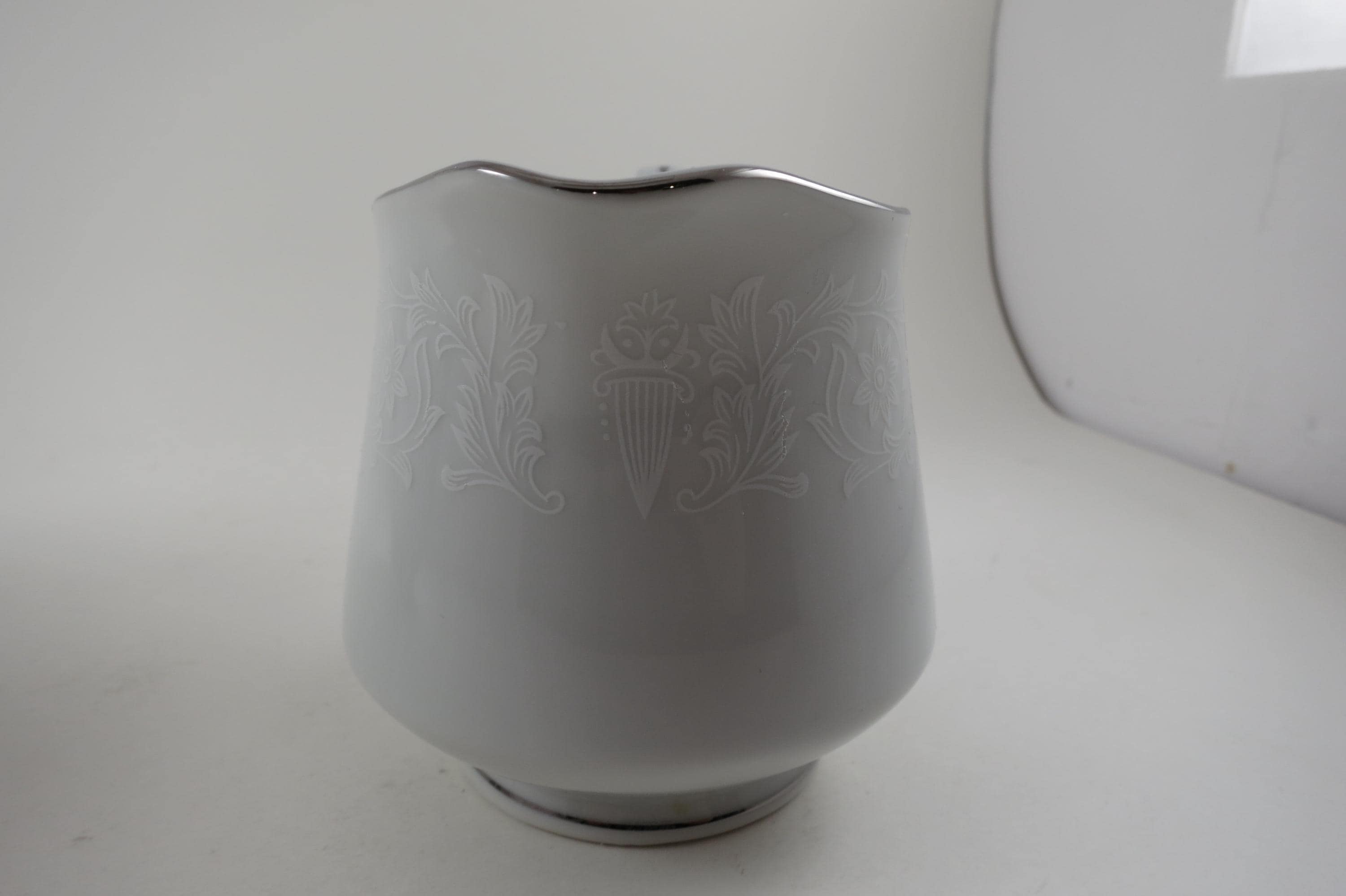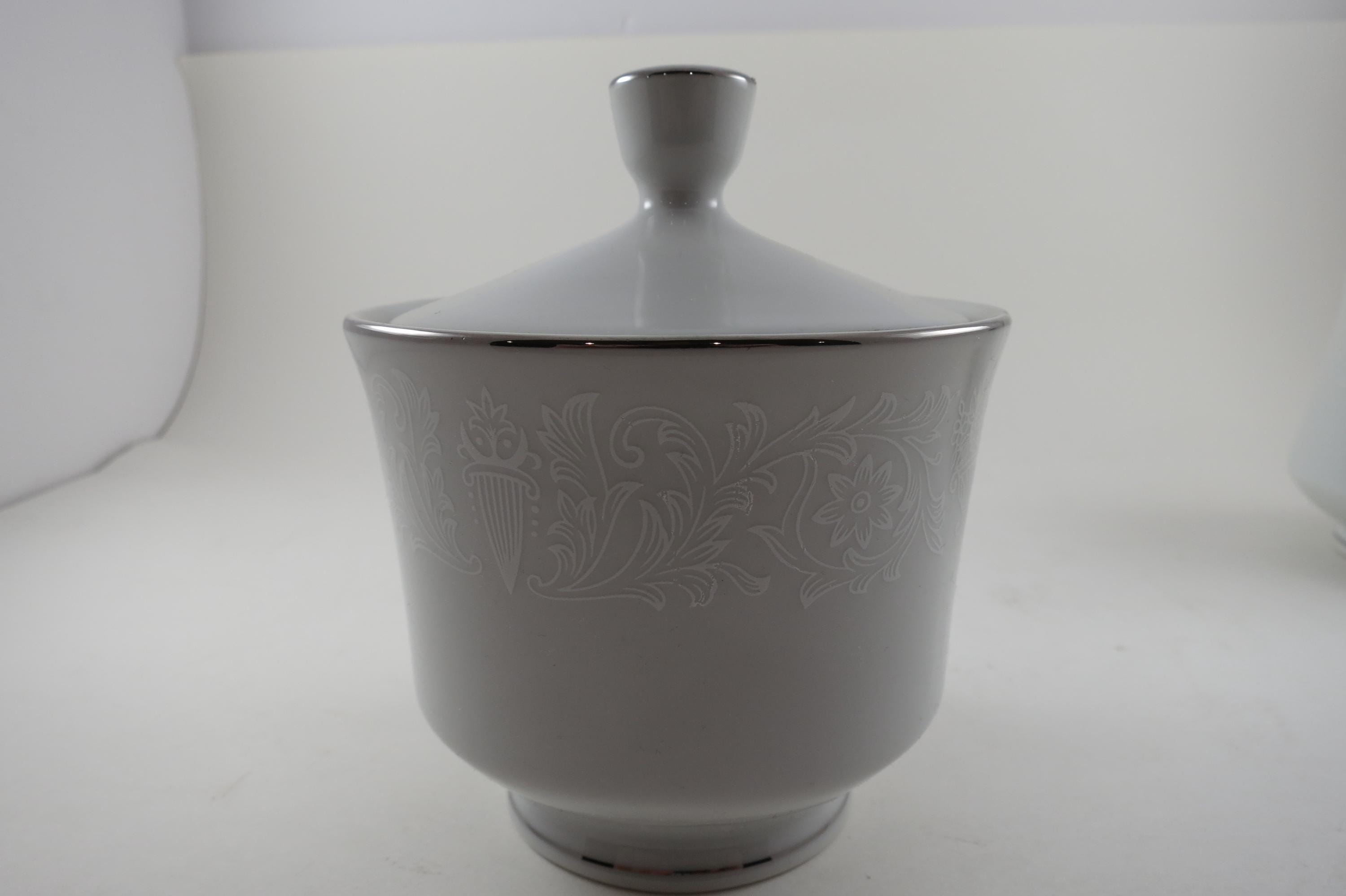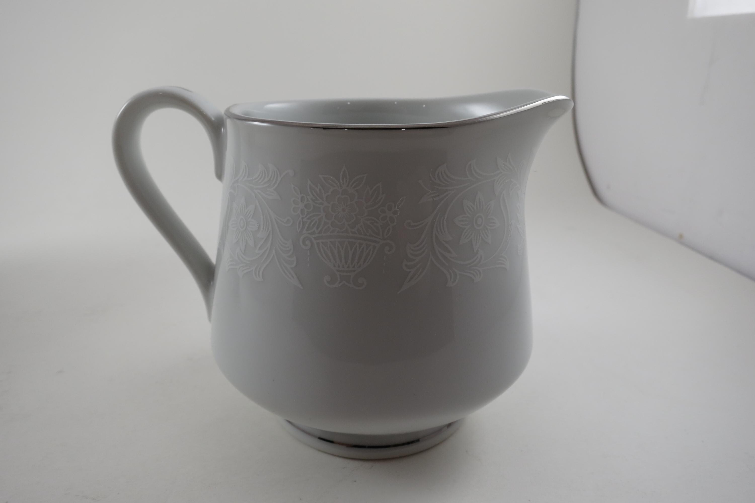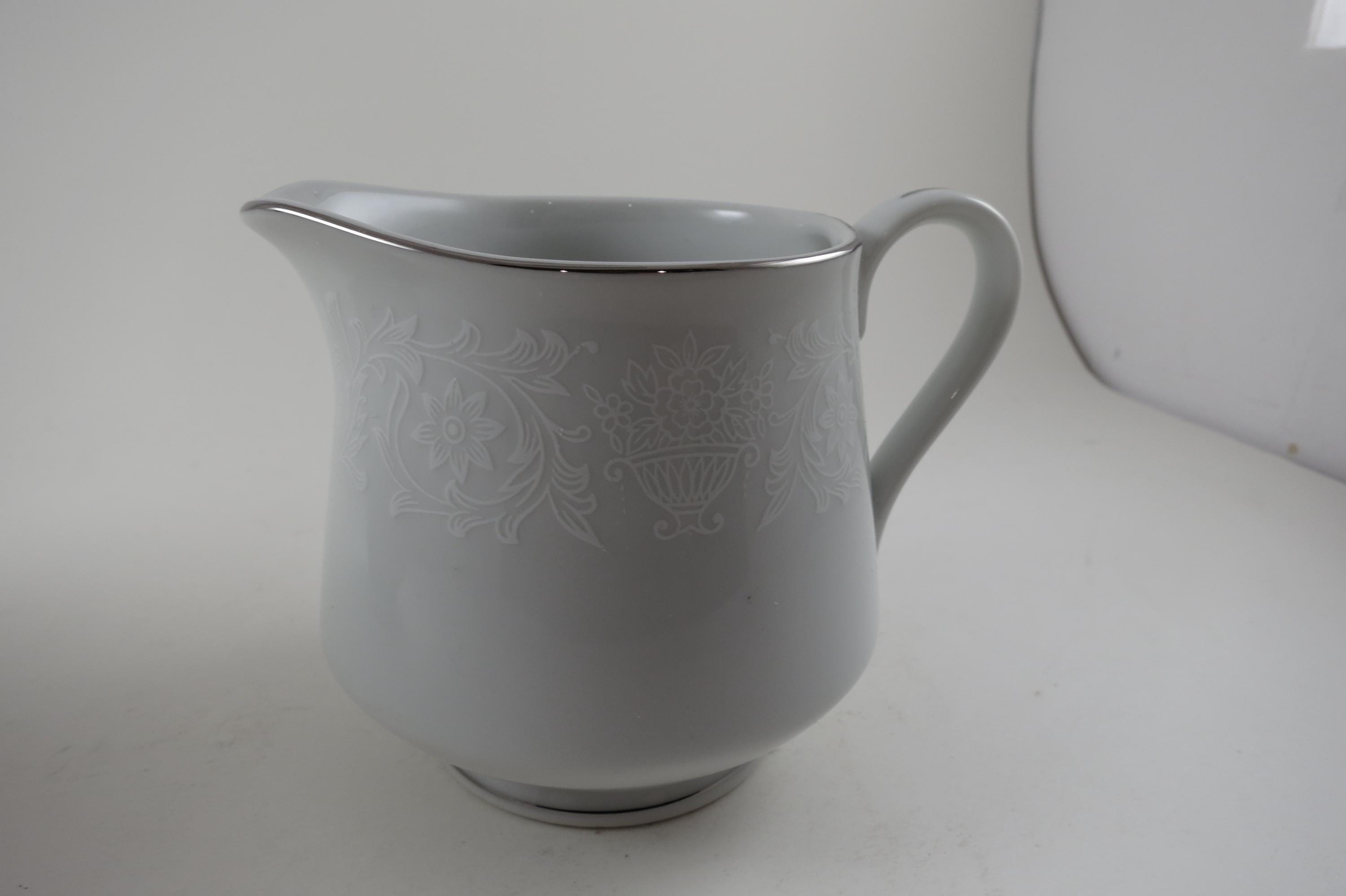 Vintage Crown Victoria Lovelace Fine China Creamer and Sugar Bowl with Lid. Beautiful White Background with white flowers and urns.