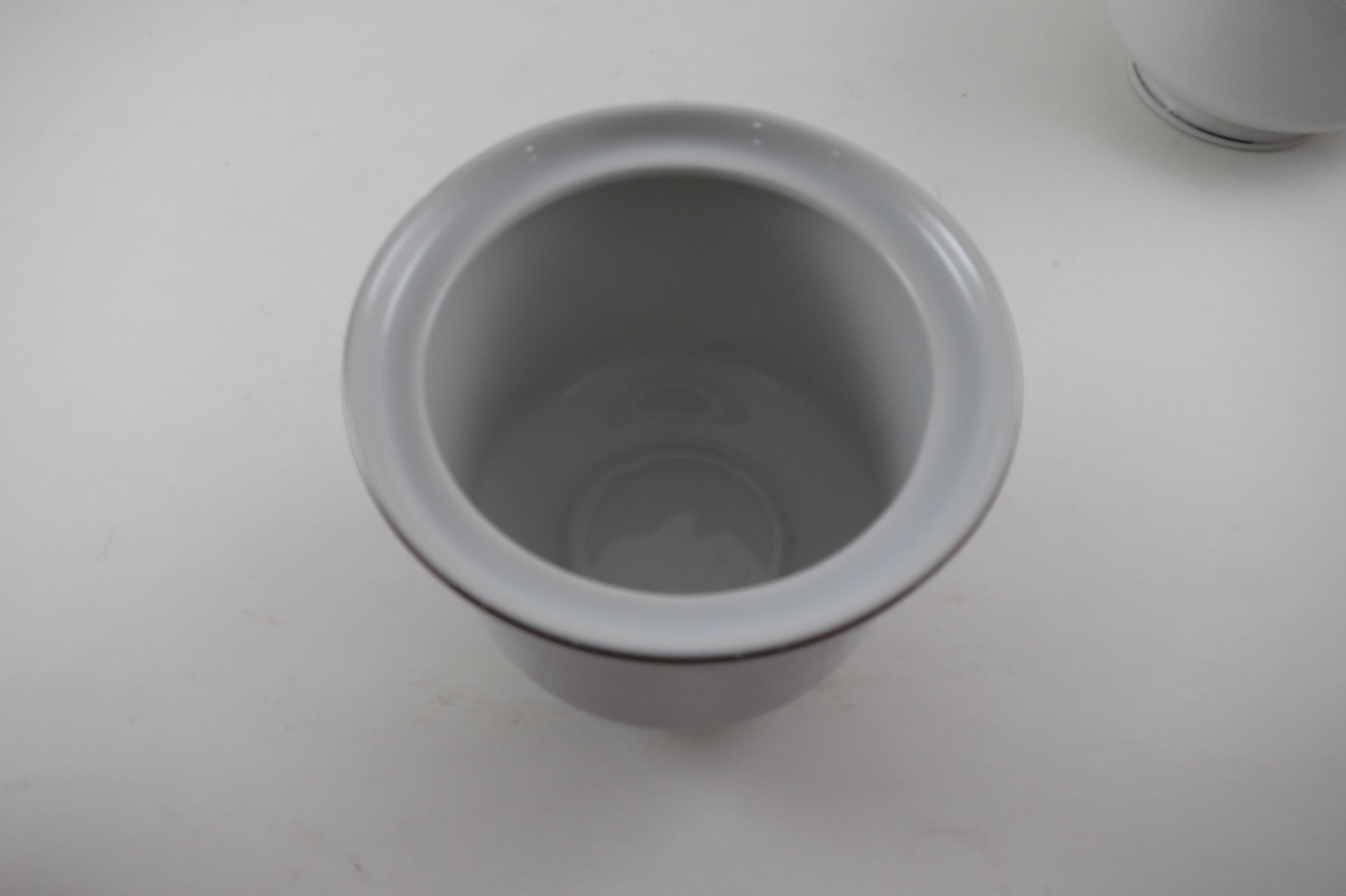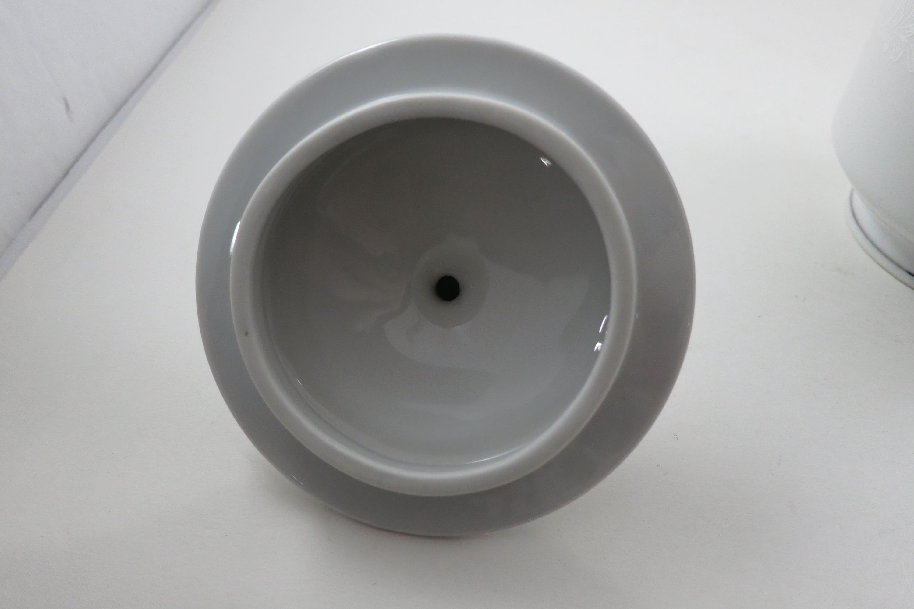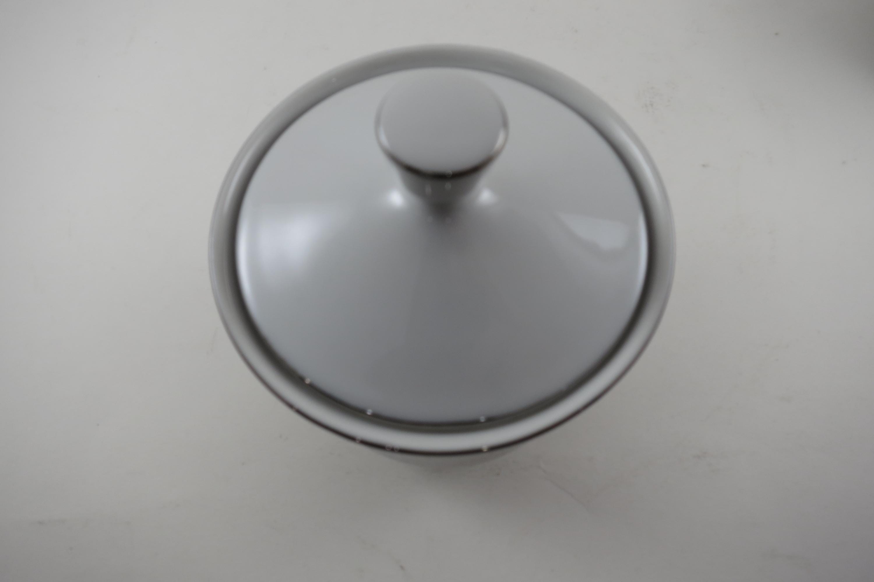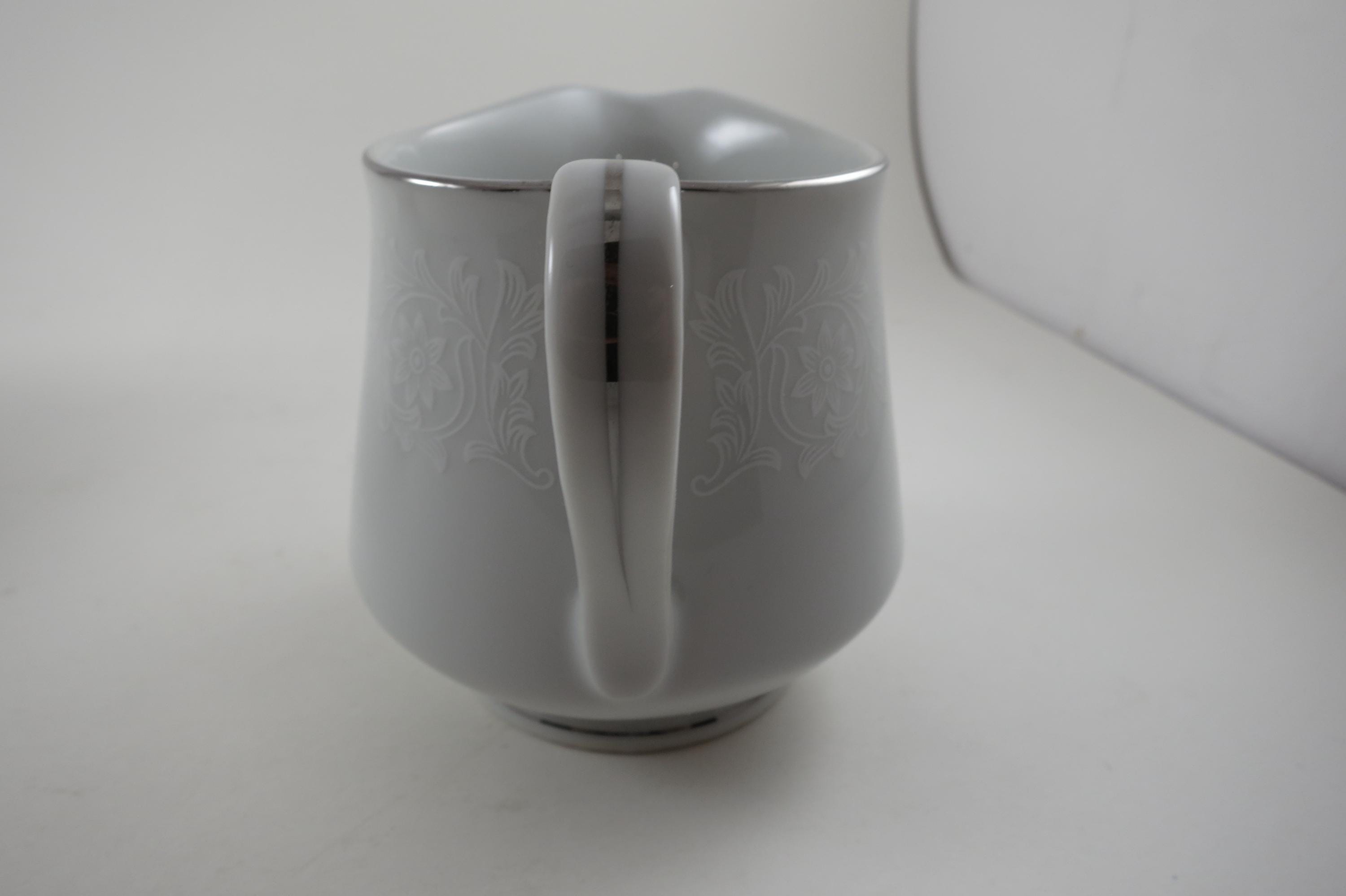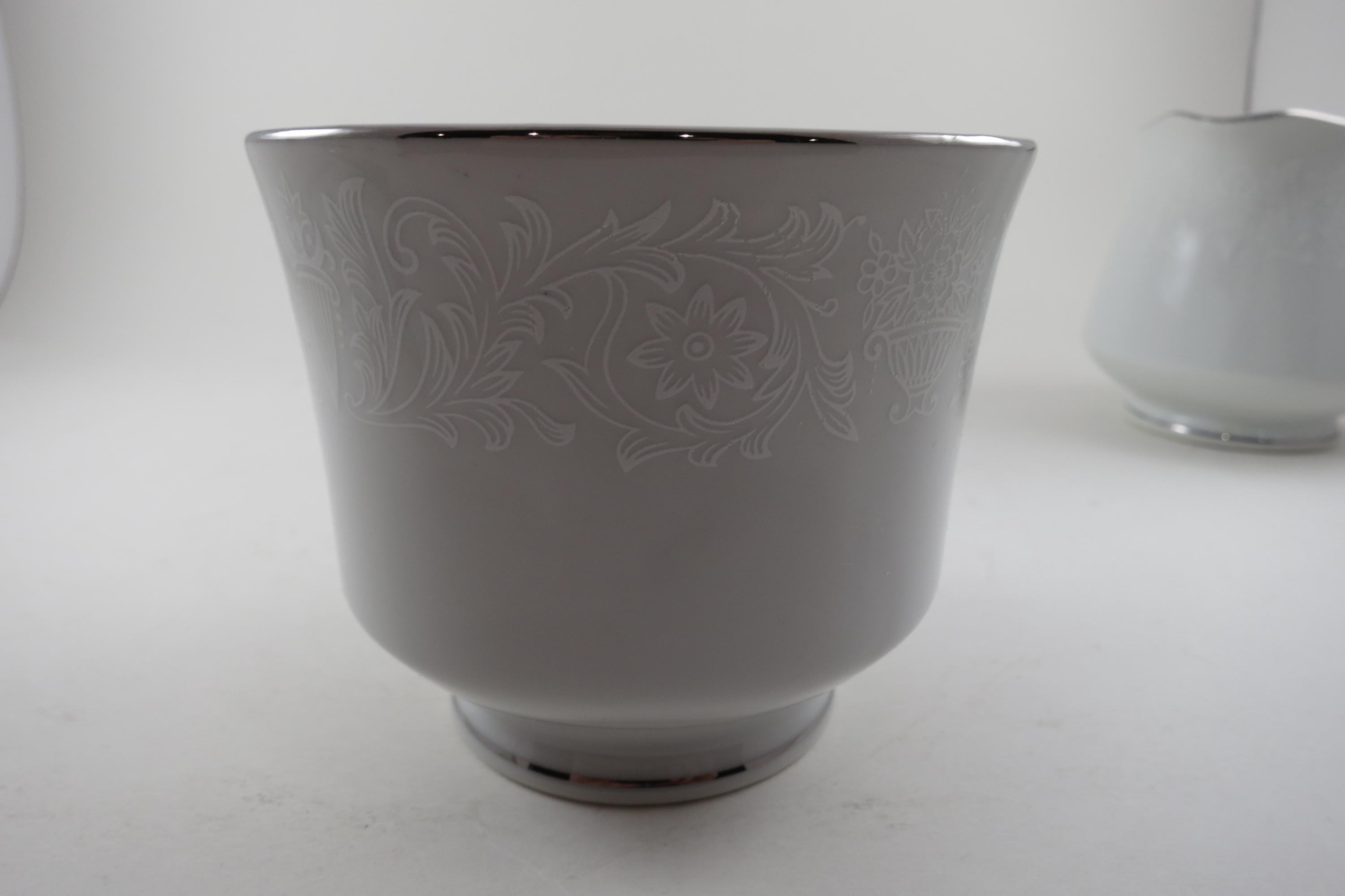 Vintage Crown Victoria Lovelace Fine China Creamer and Sugar Bowl with Lid. Beautiful White Background with white flowers and urns.