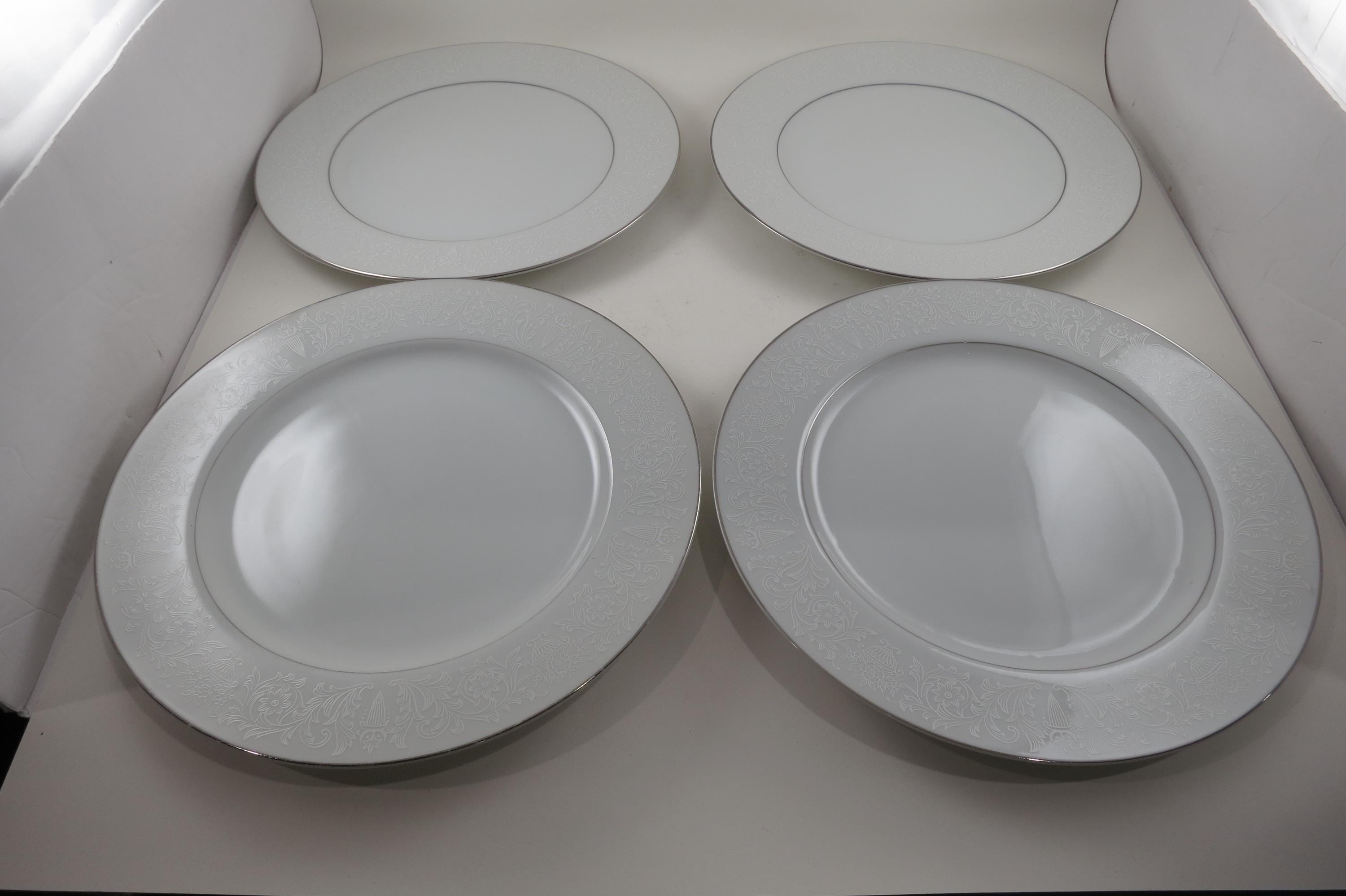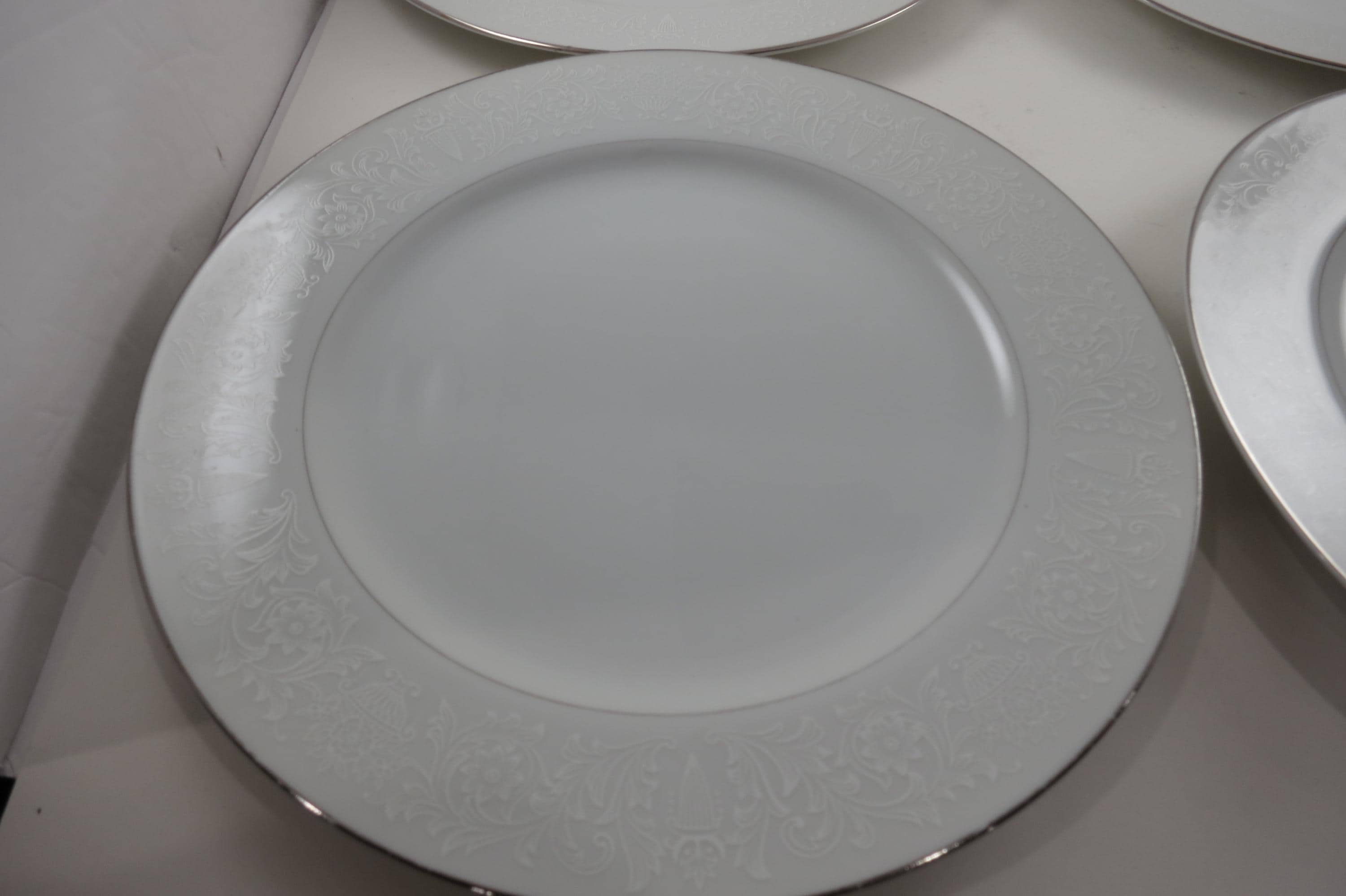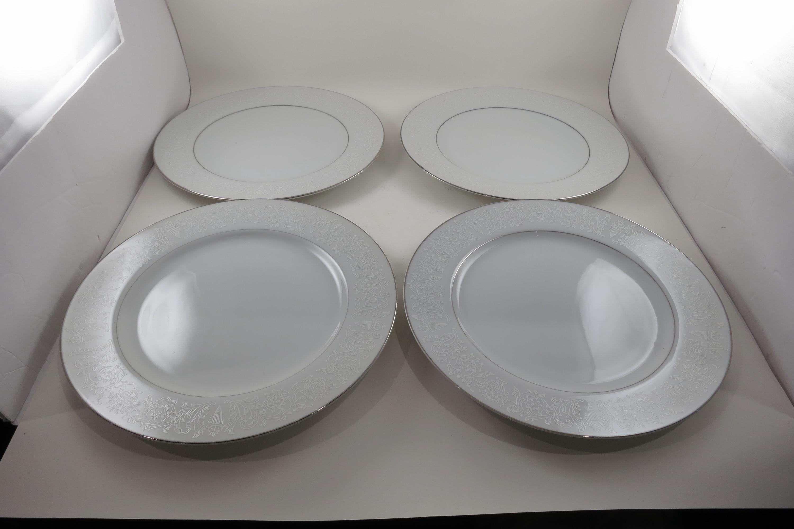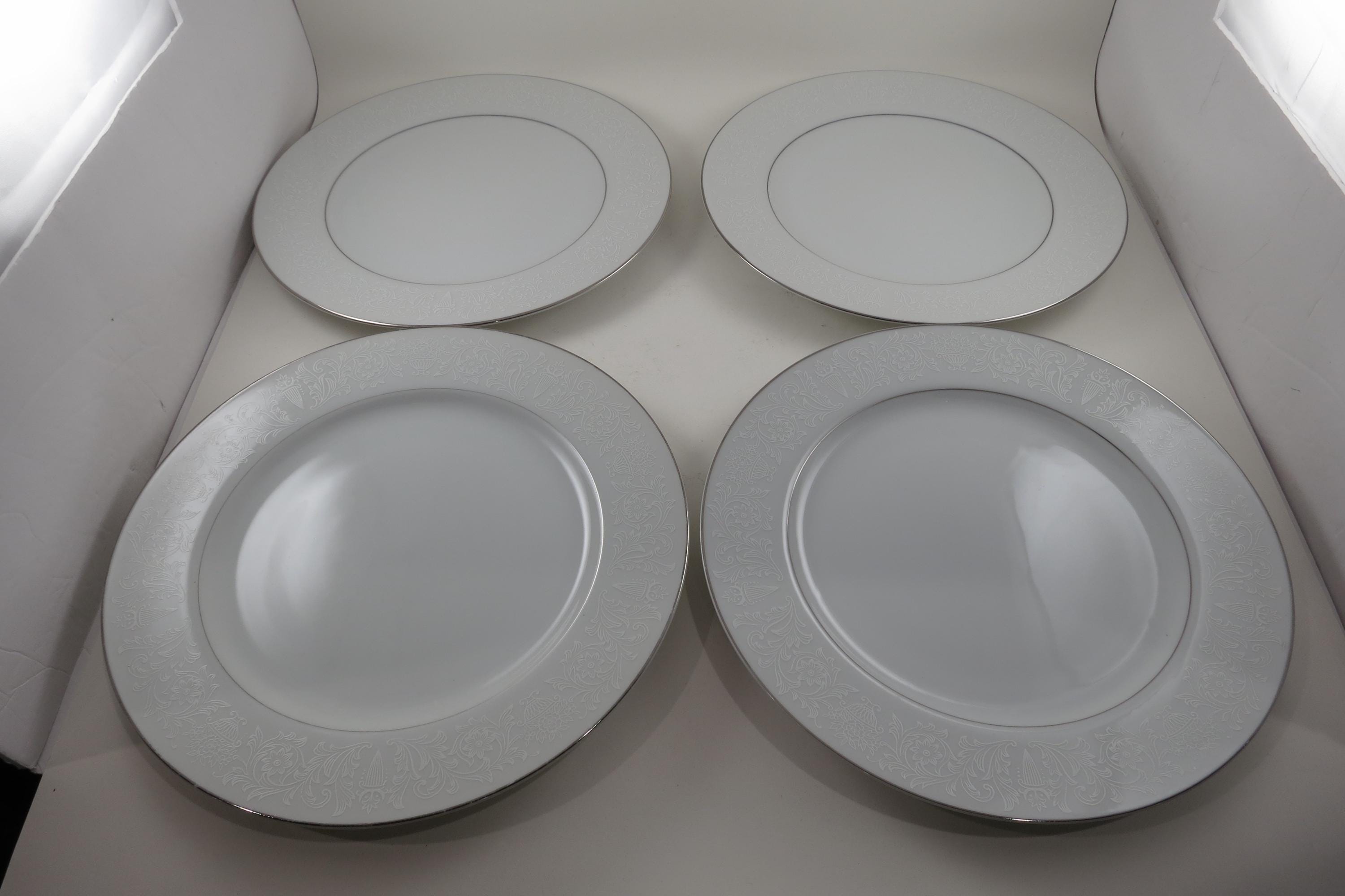 Vintage Crown Victoria Lovelace Fine China Set of 4 10 3/8 Inch Dinner Plates. Beautiful White Background with white flowers and urns.