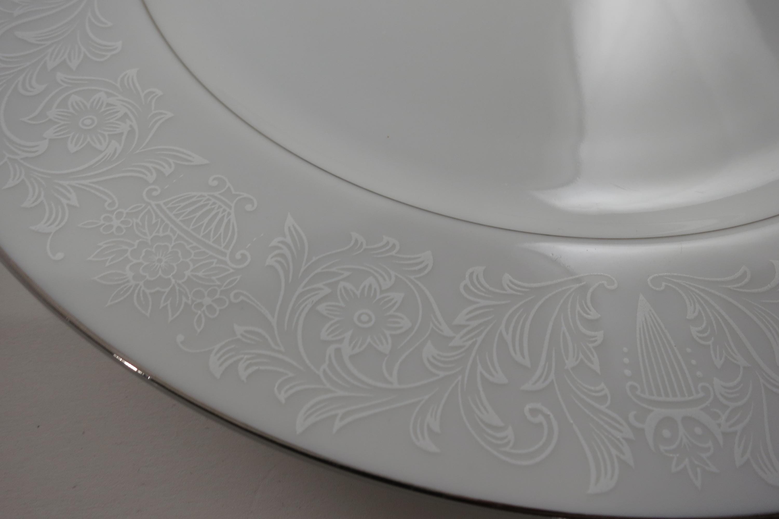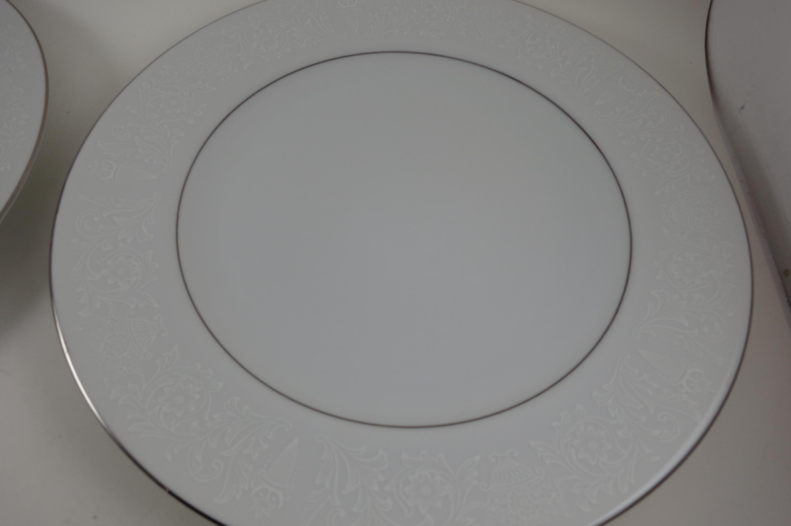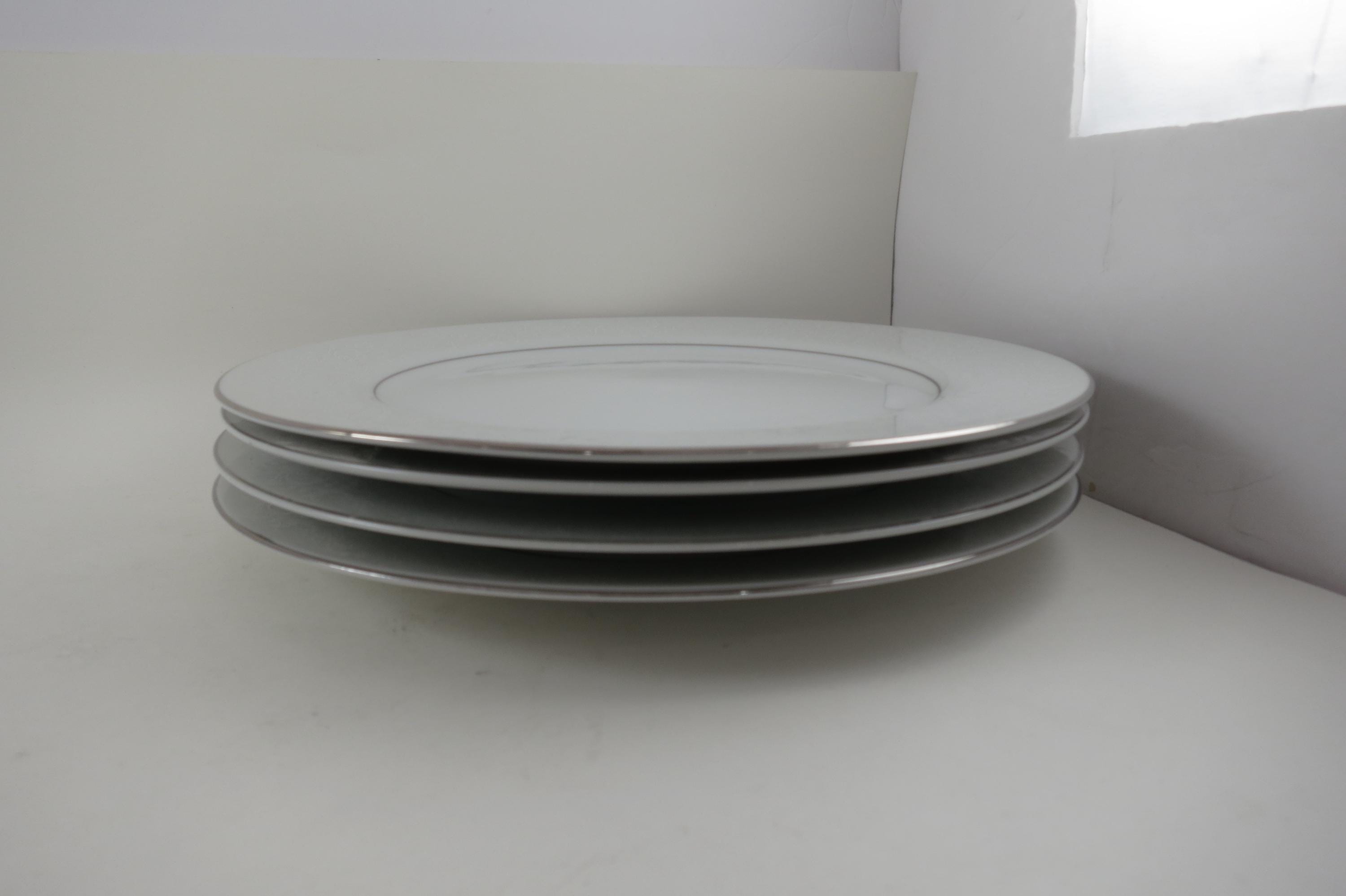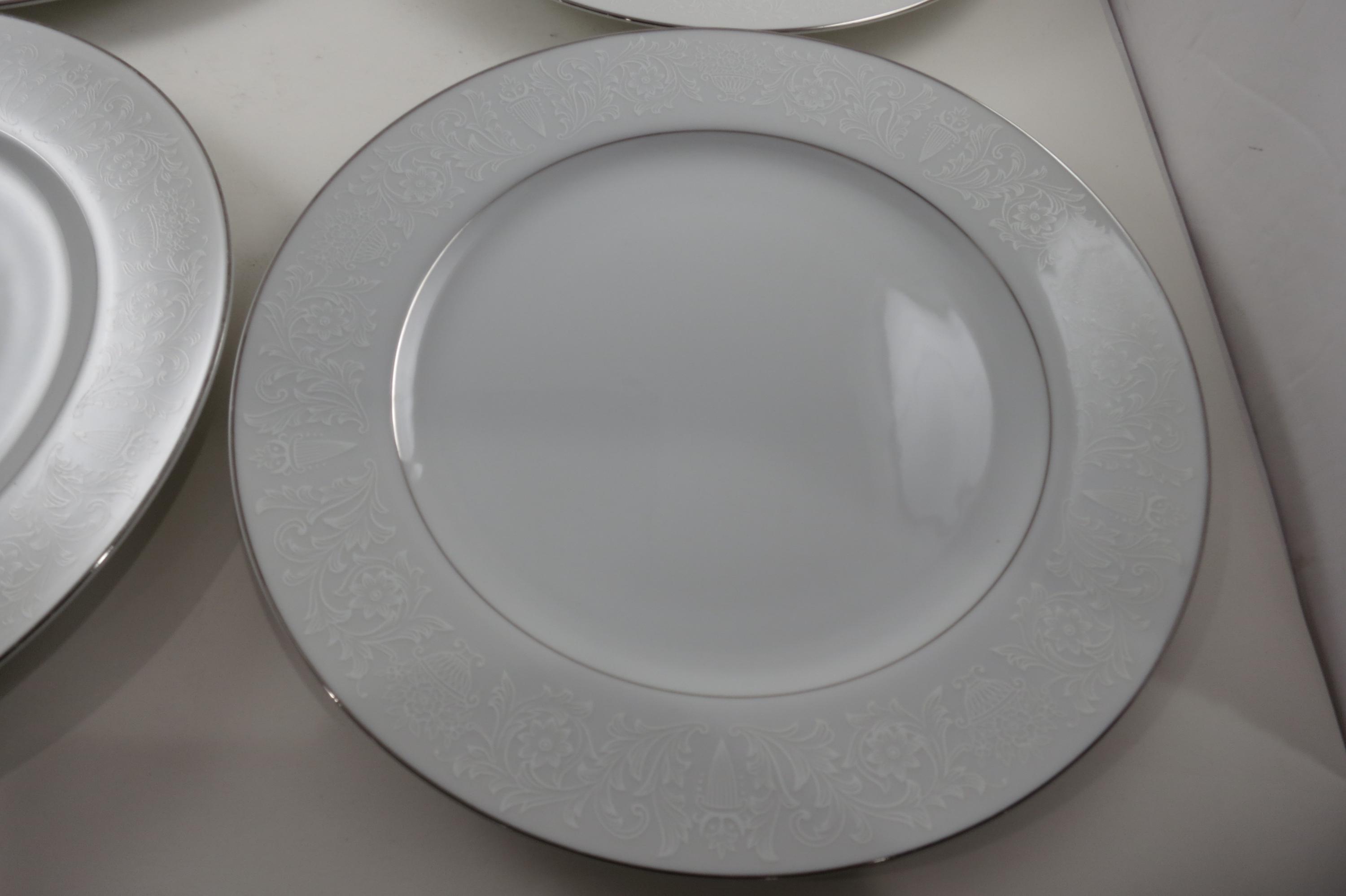 Vintage Crown Victoria Lovelace Fine China Set of 4 10 3/8 Inch Dinner Plates. Beautiful White Background with white flowers and urns.