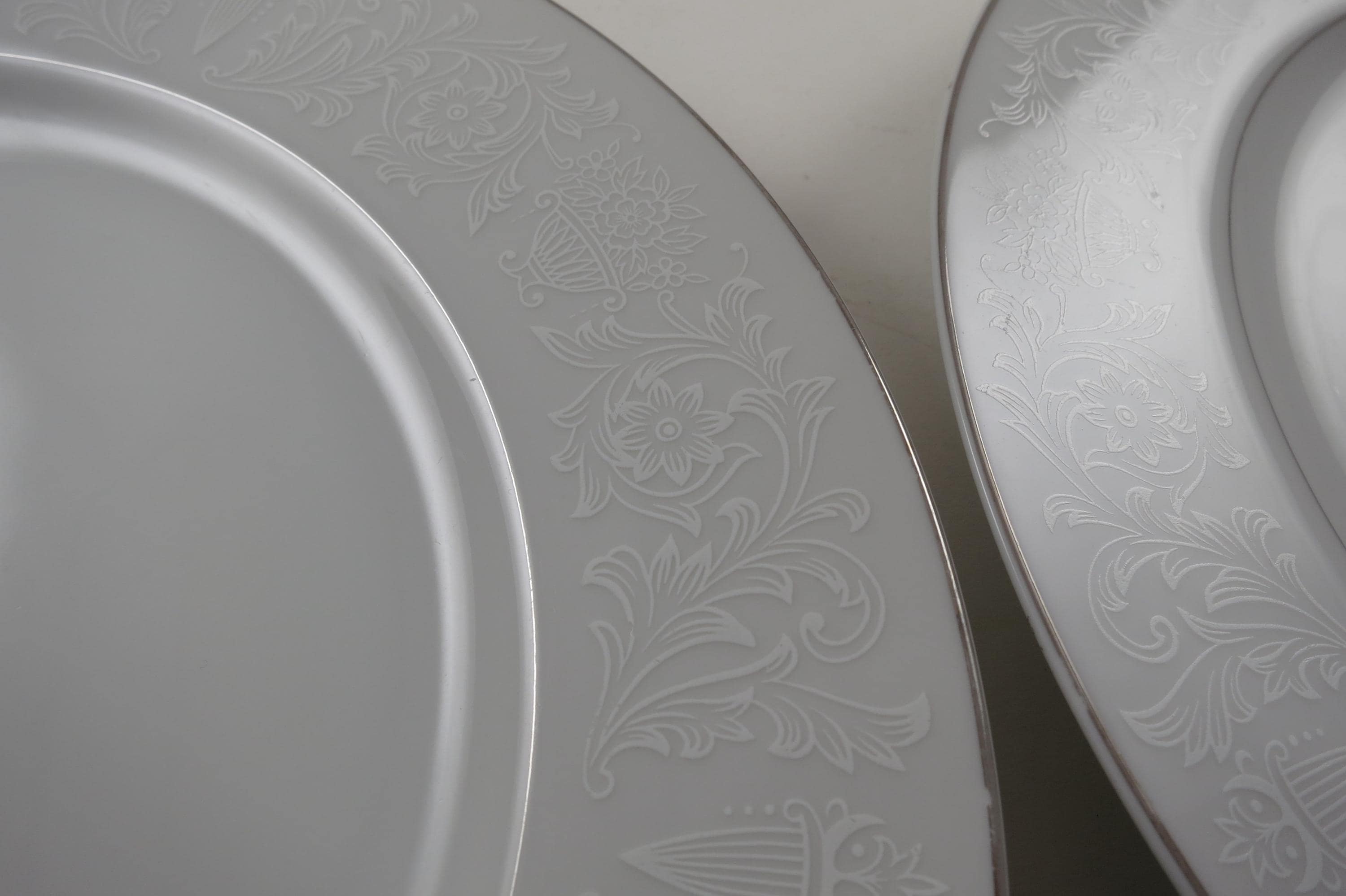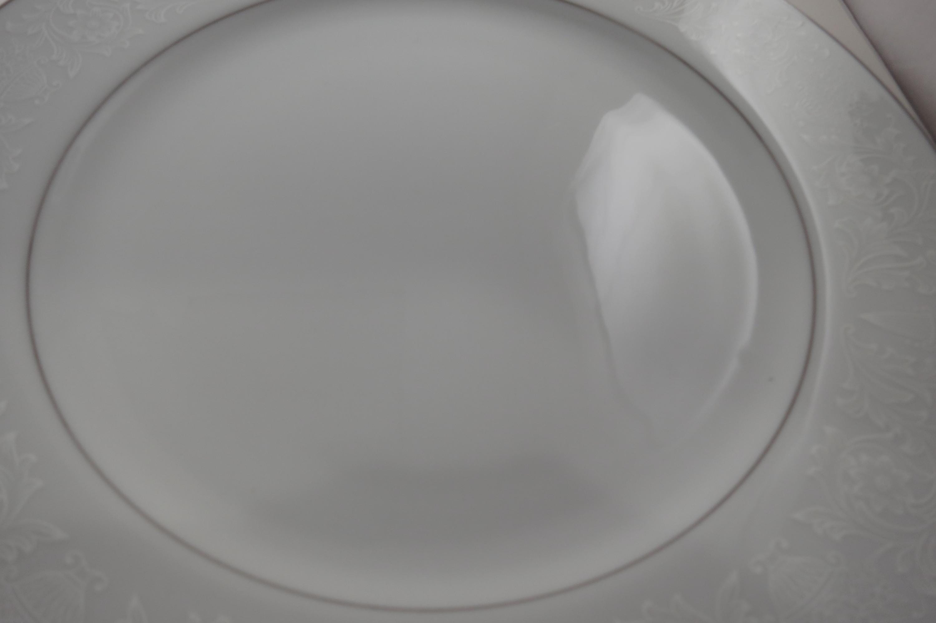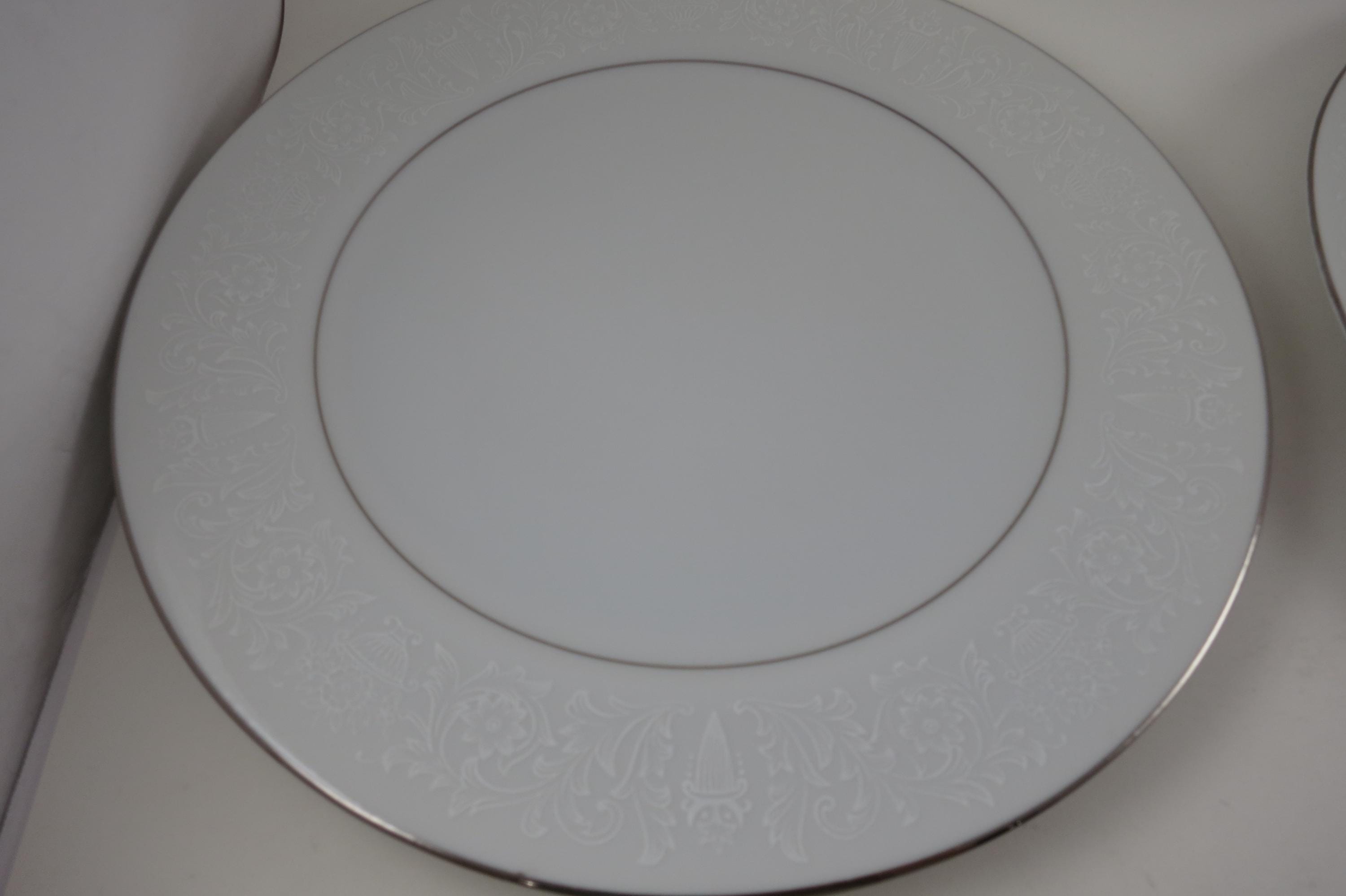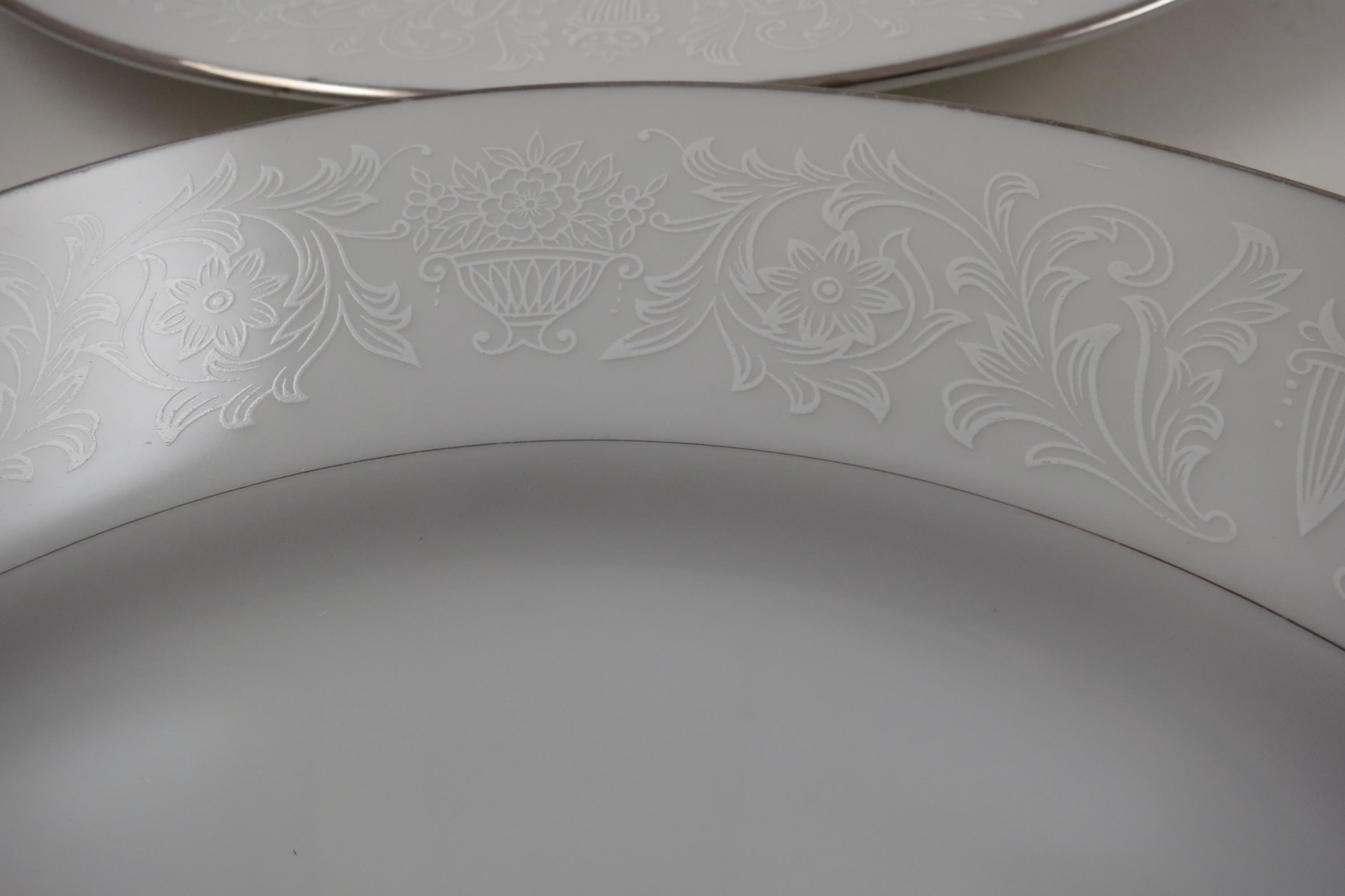 Vintage Crown Victoria Lovelace Fine China Set of 4 10 3/8 Inch Dinner Plates. Beautiful White Background with white flowers and urns.