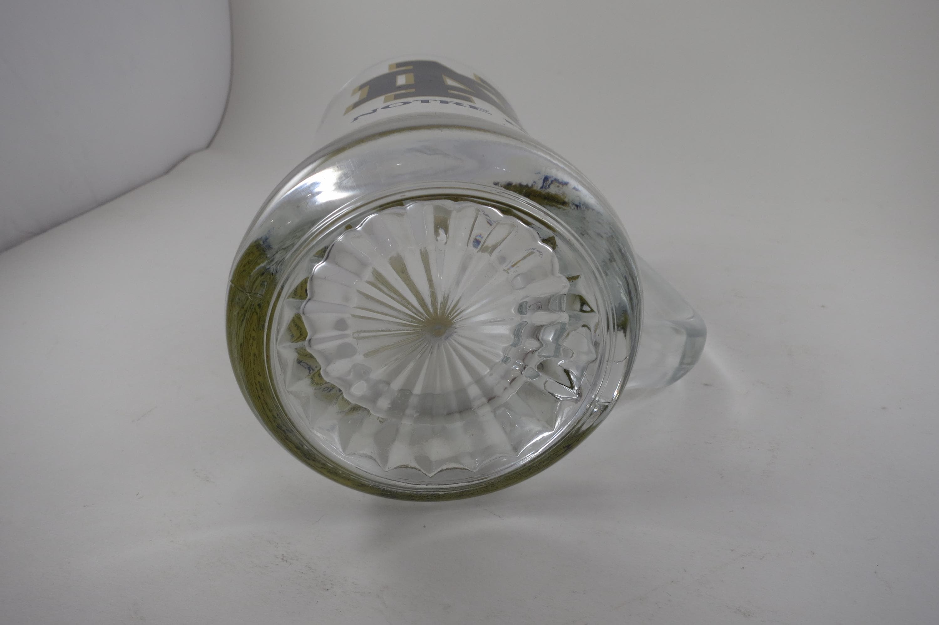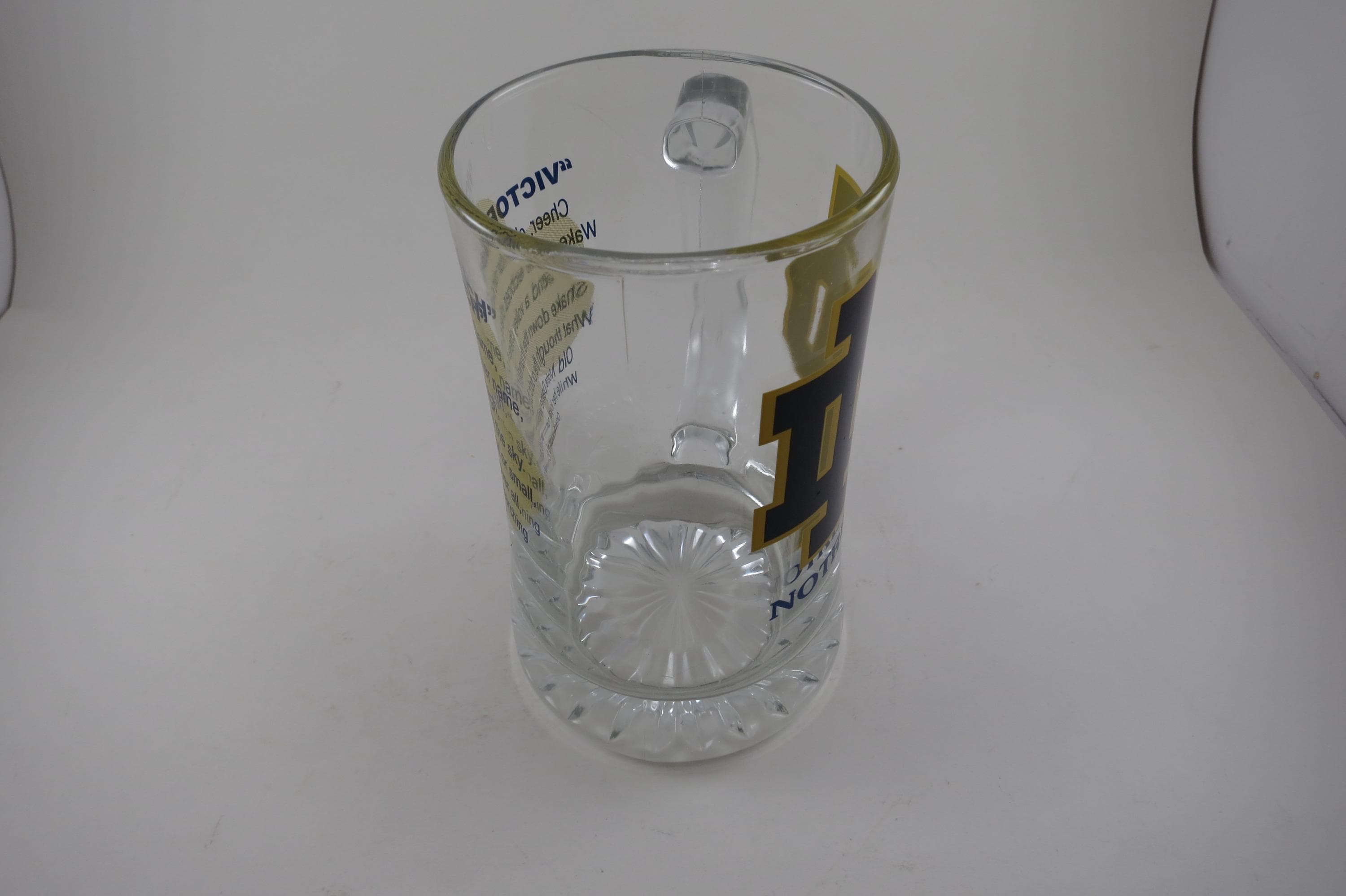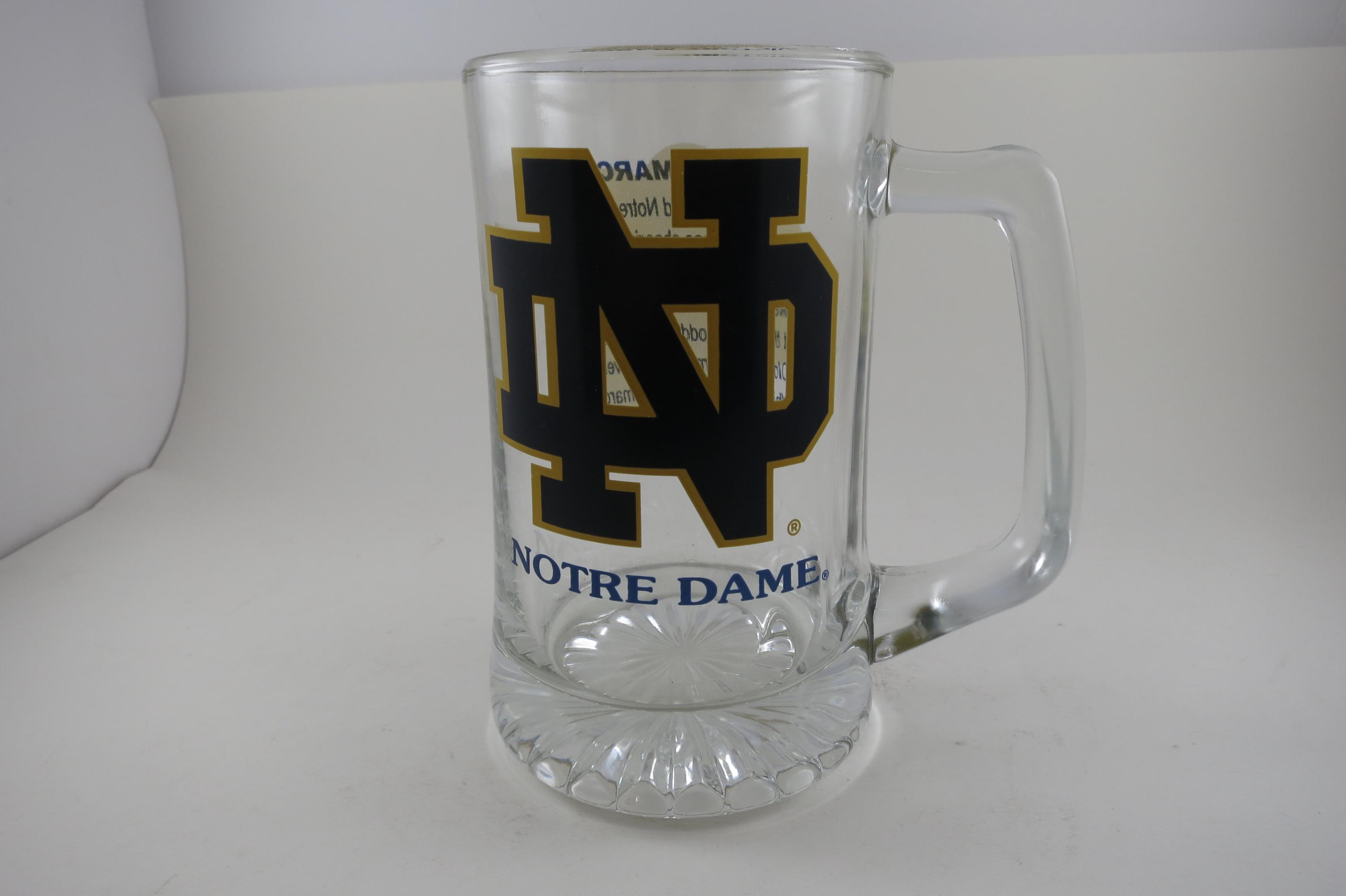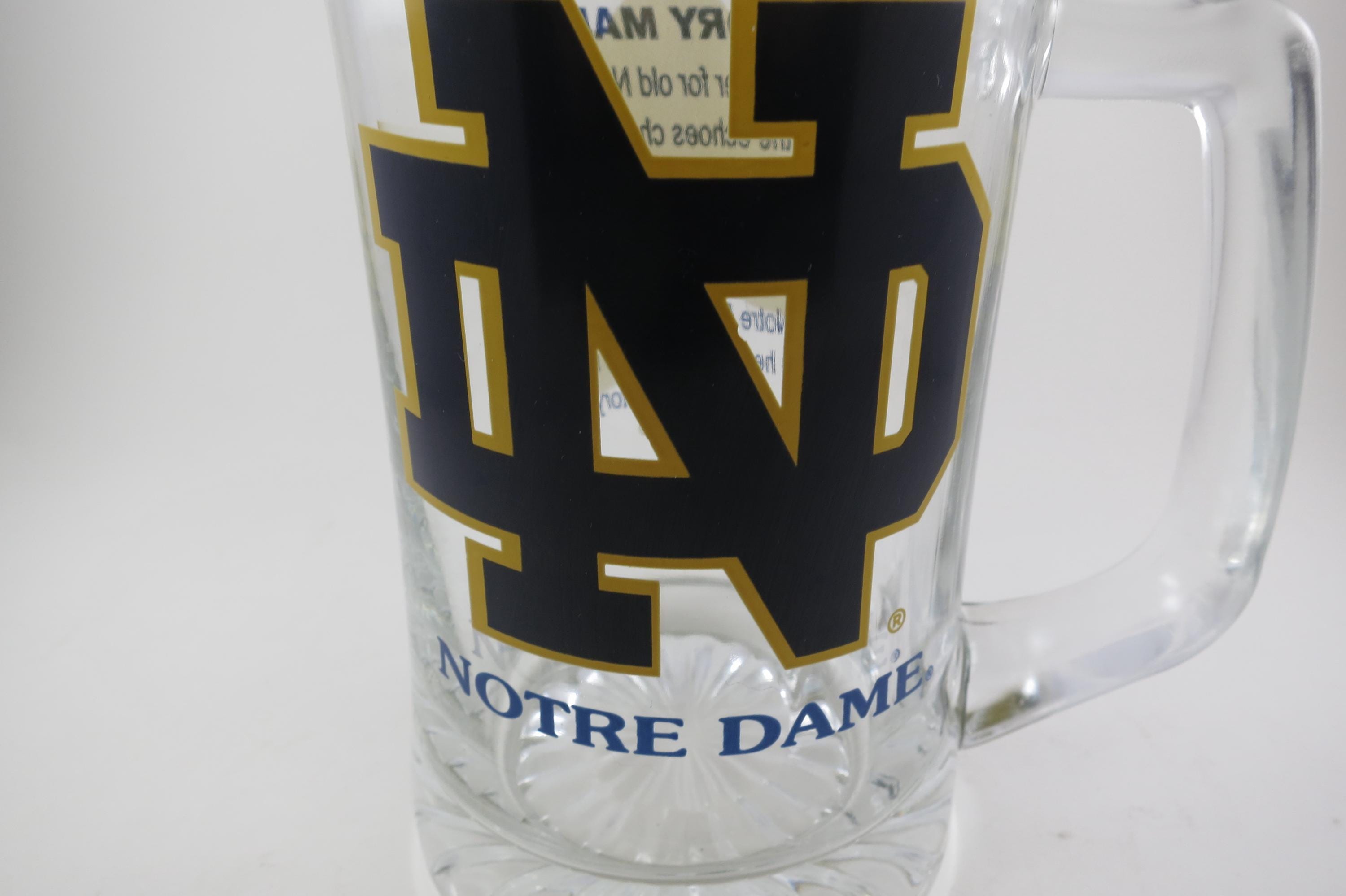 This is a huge and heavy tankard. Has the Notre Dame Logo on the front and the Victor March on the back. Measures 6 3/4 inches tall, 3 3/4 inches wide at the rim and 4 inches wide at the base. We have 2 Identical Available.