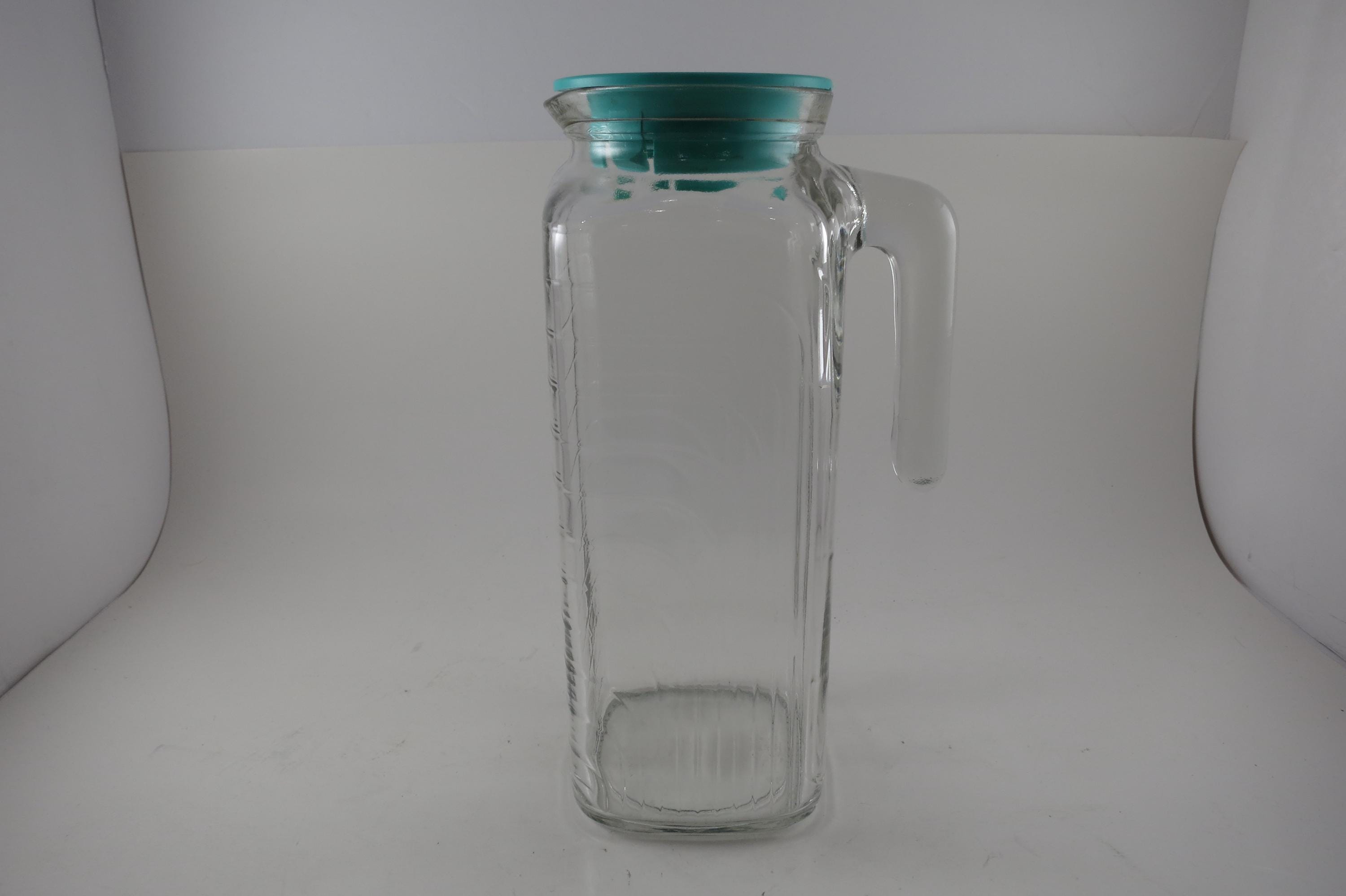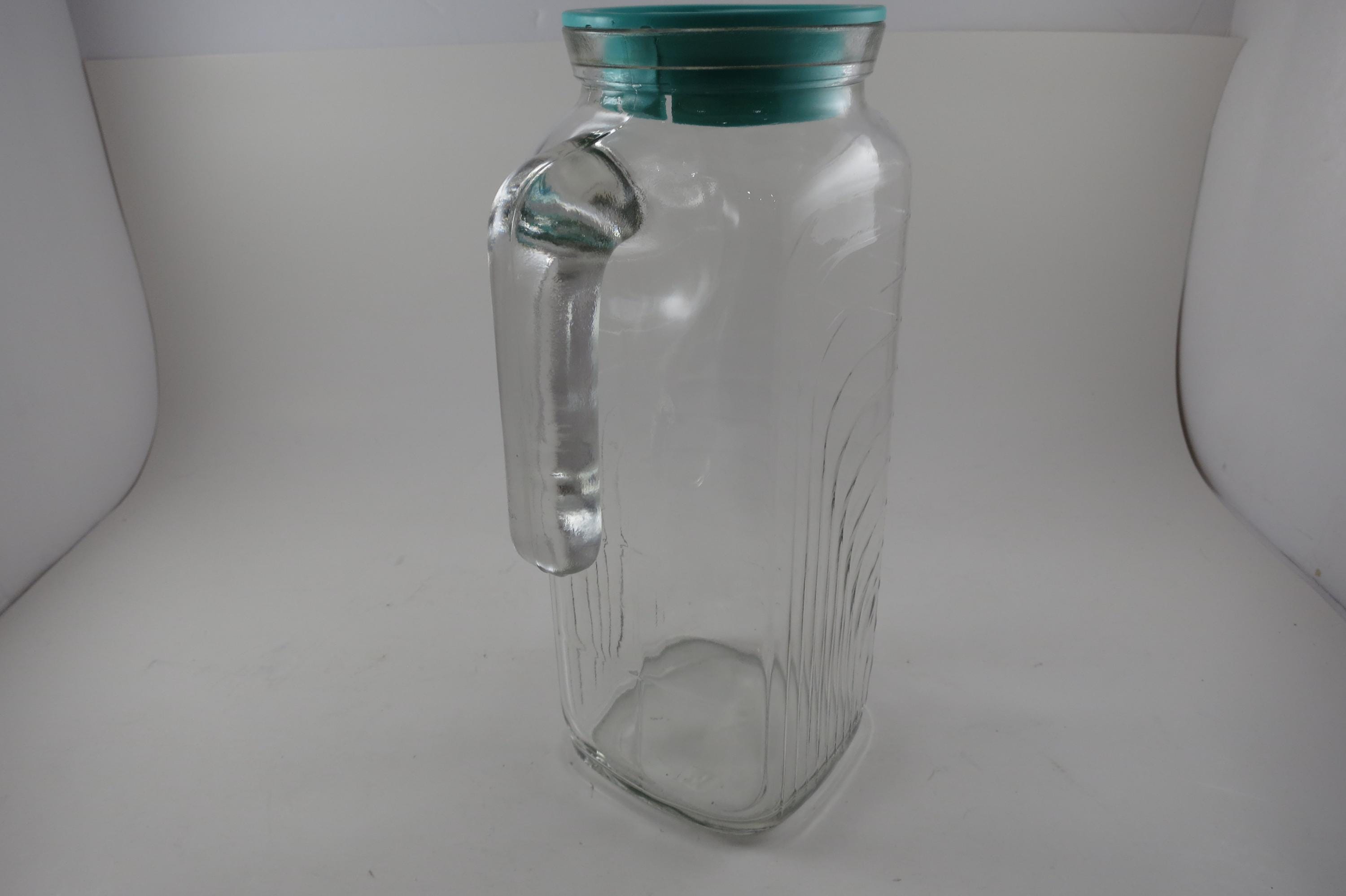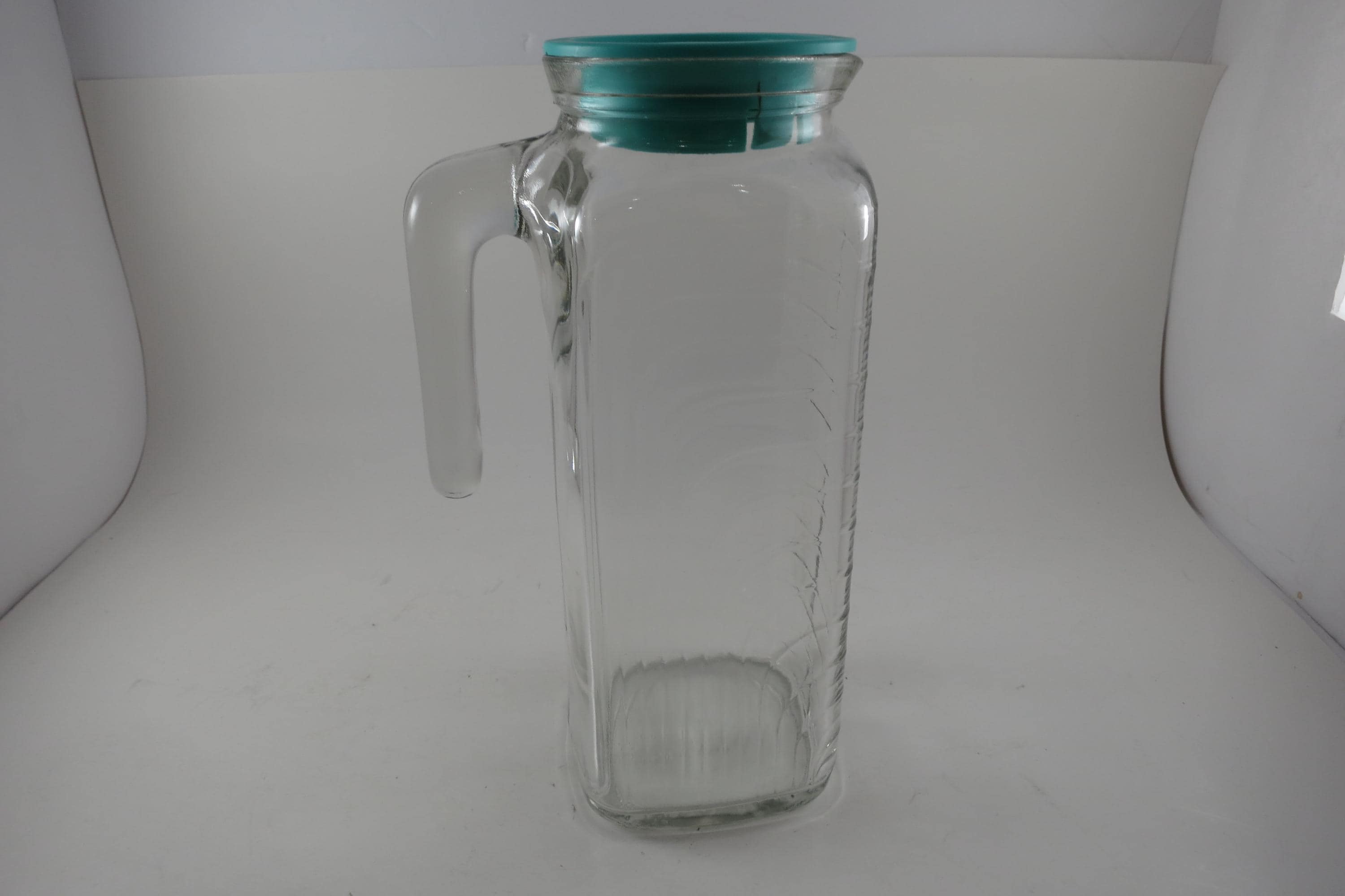 Vintage 9 Inch Bormioli Italian 1 Liter Juice Water Carafe with Original Green Lid. Measures 9 Inches tall. Green Lid. Excellent Condition with No chips, cracks or damages.