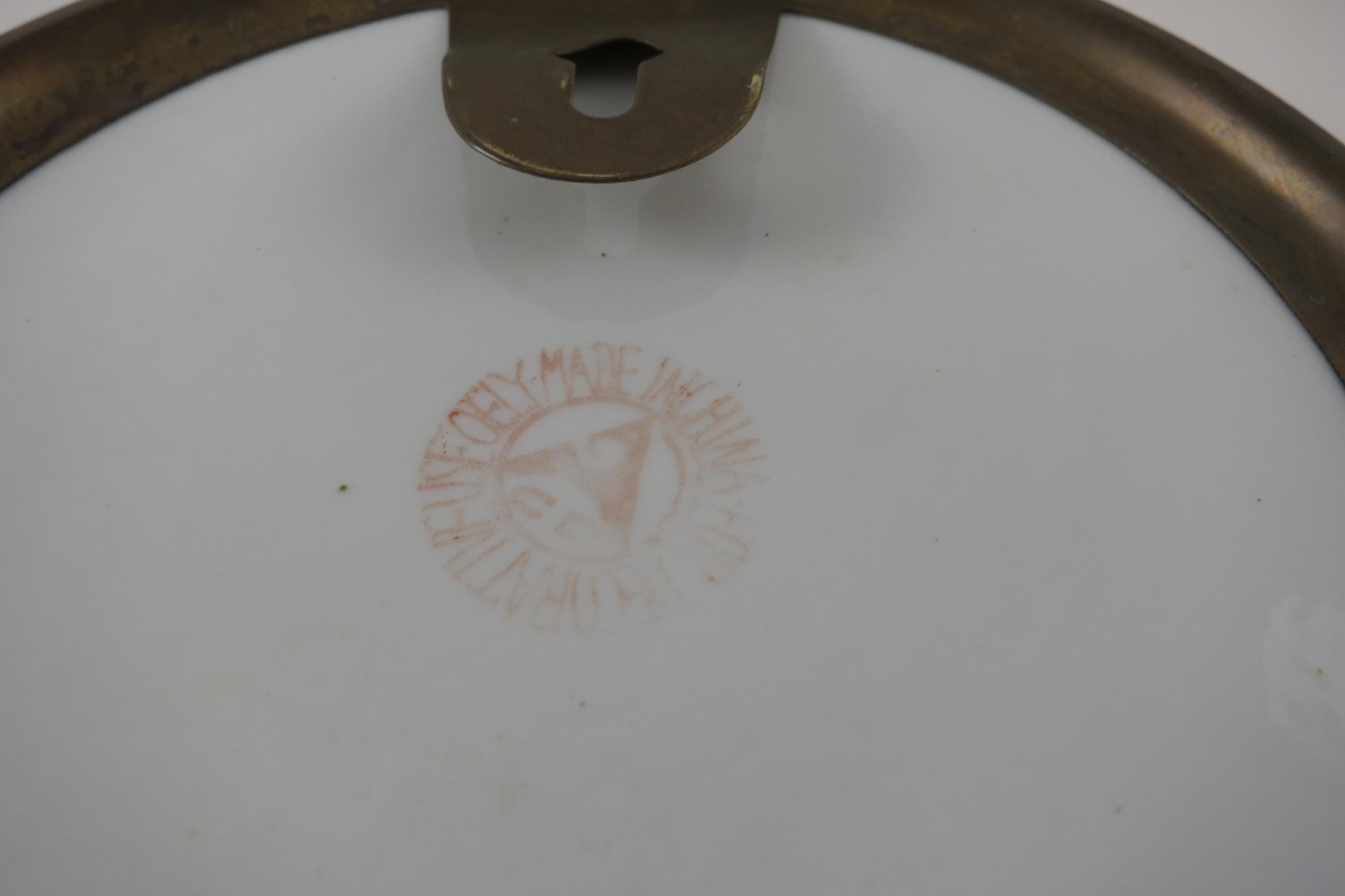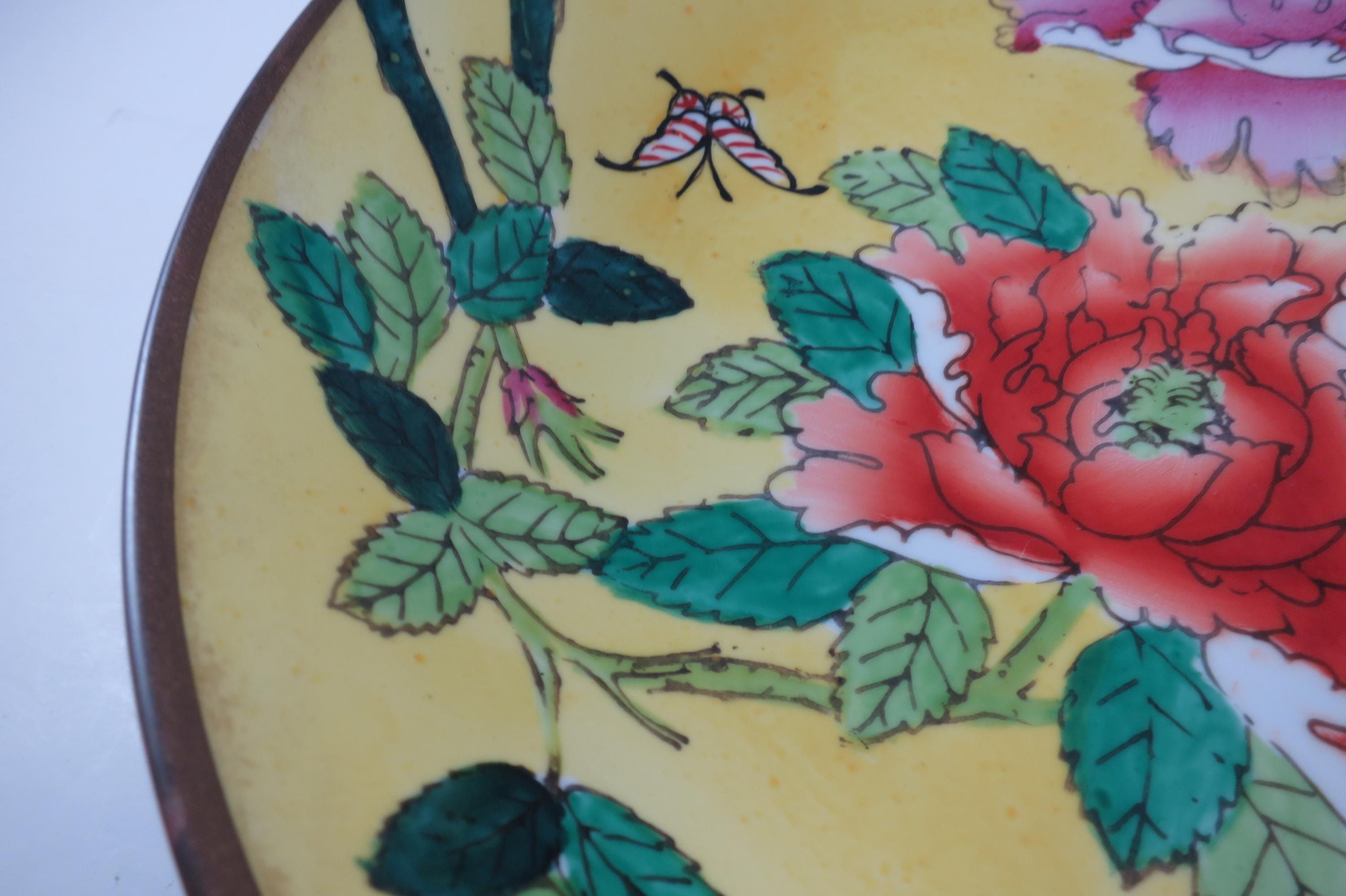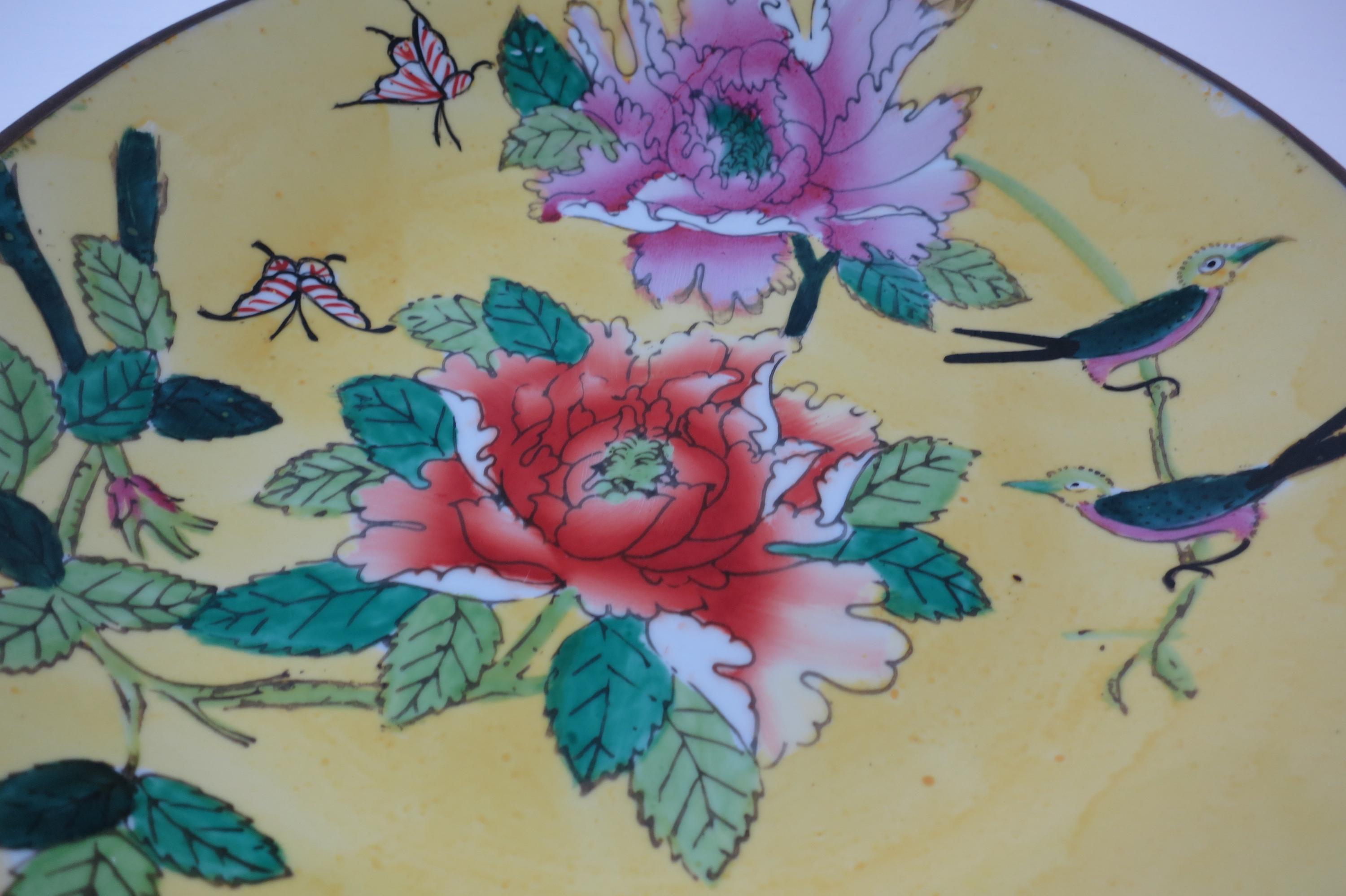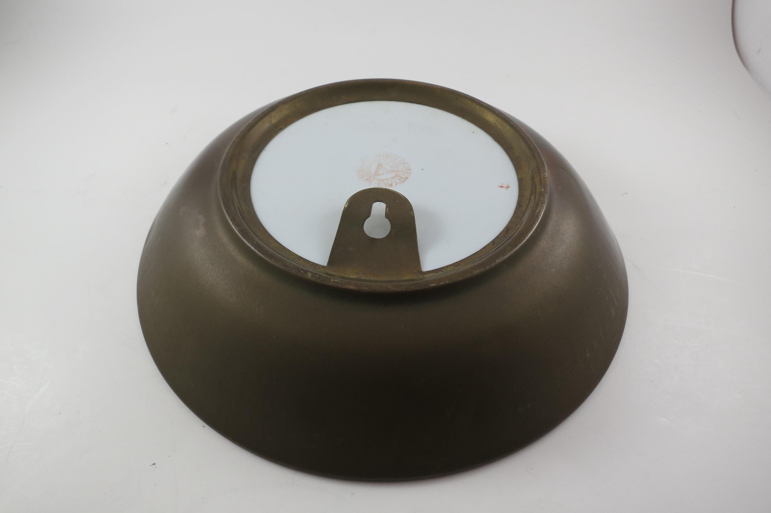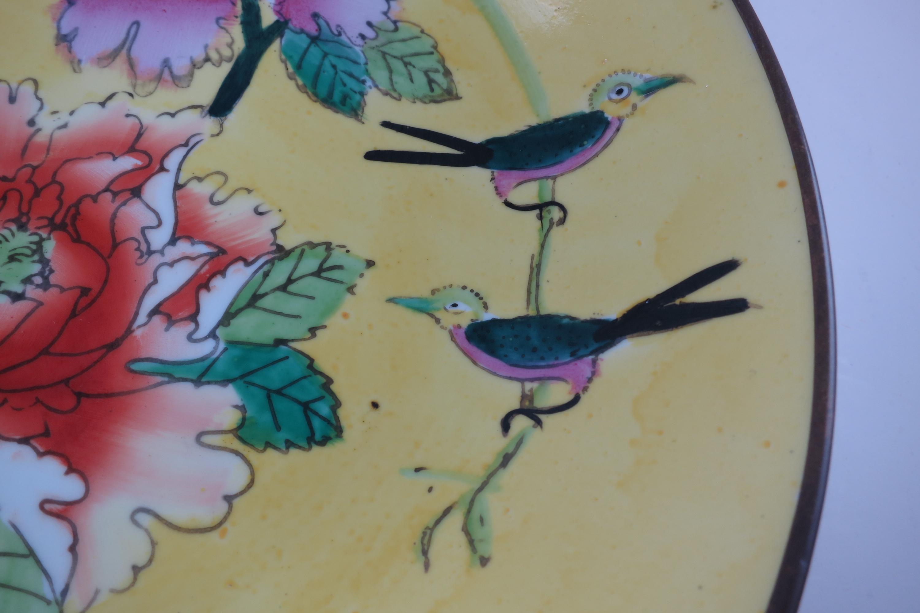 Vintage Porcelain Asian Copper Back Wall Plate Stamped Birds and Flowers with Hanger