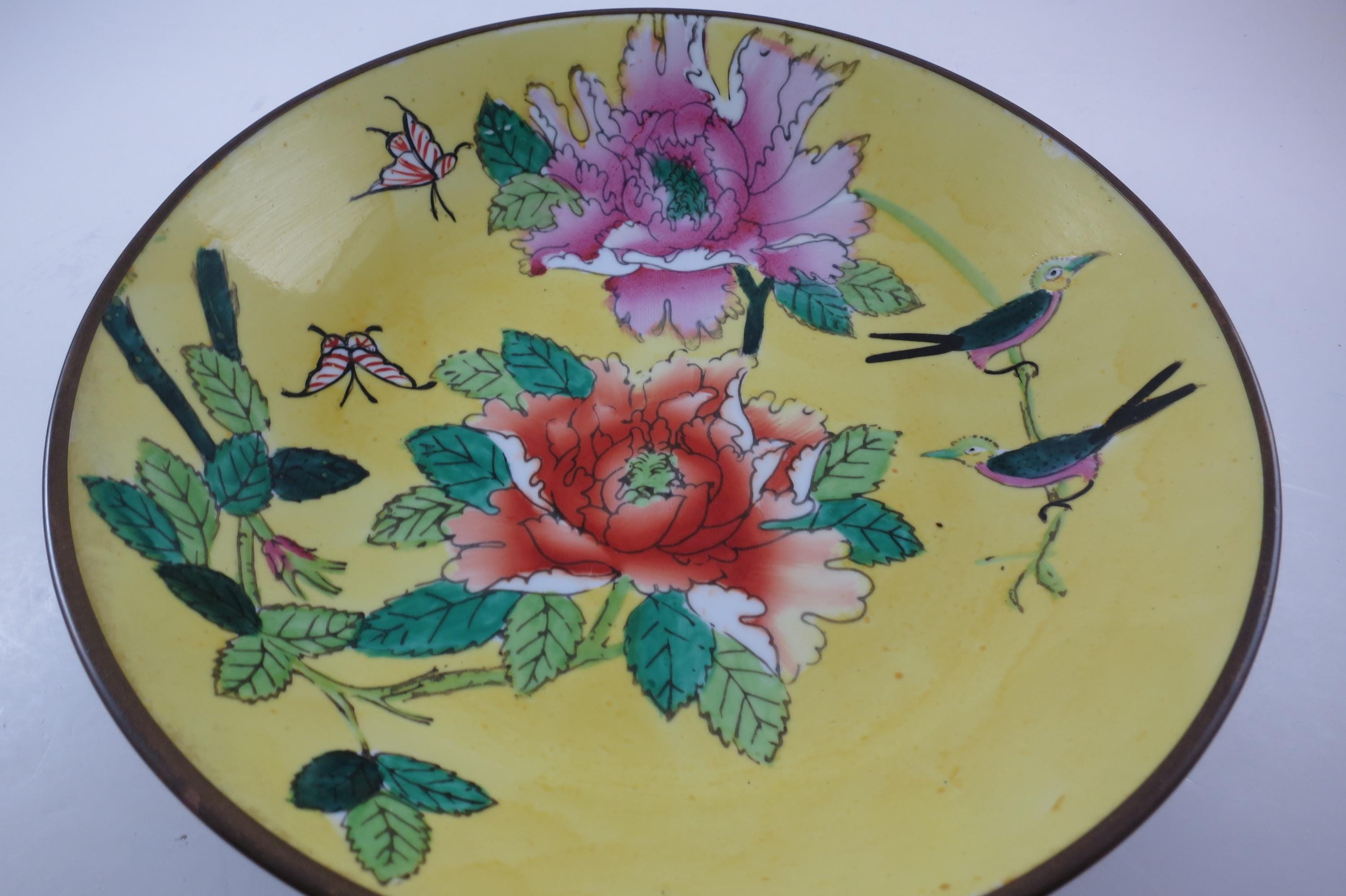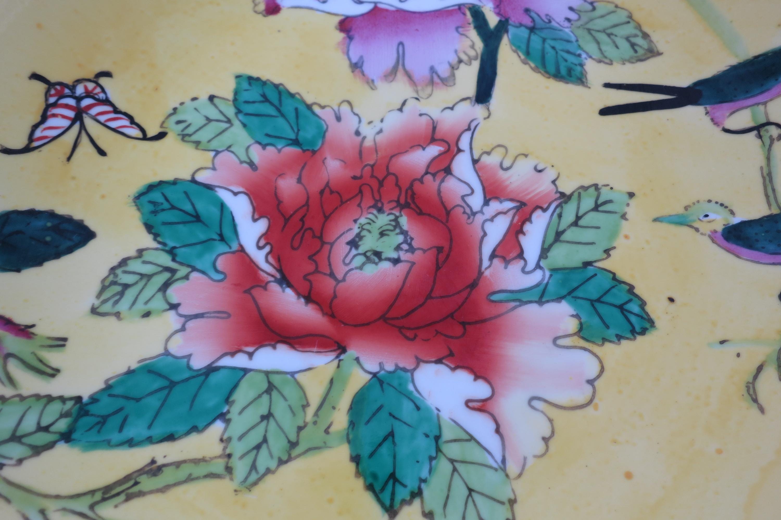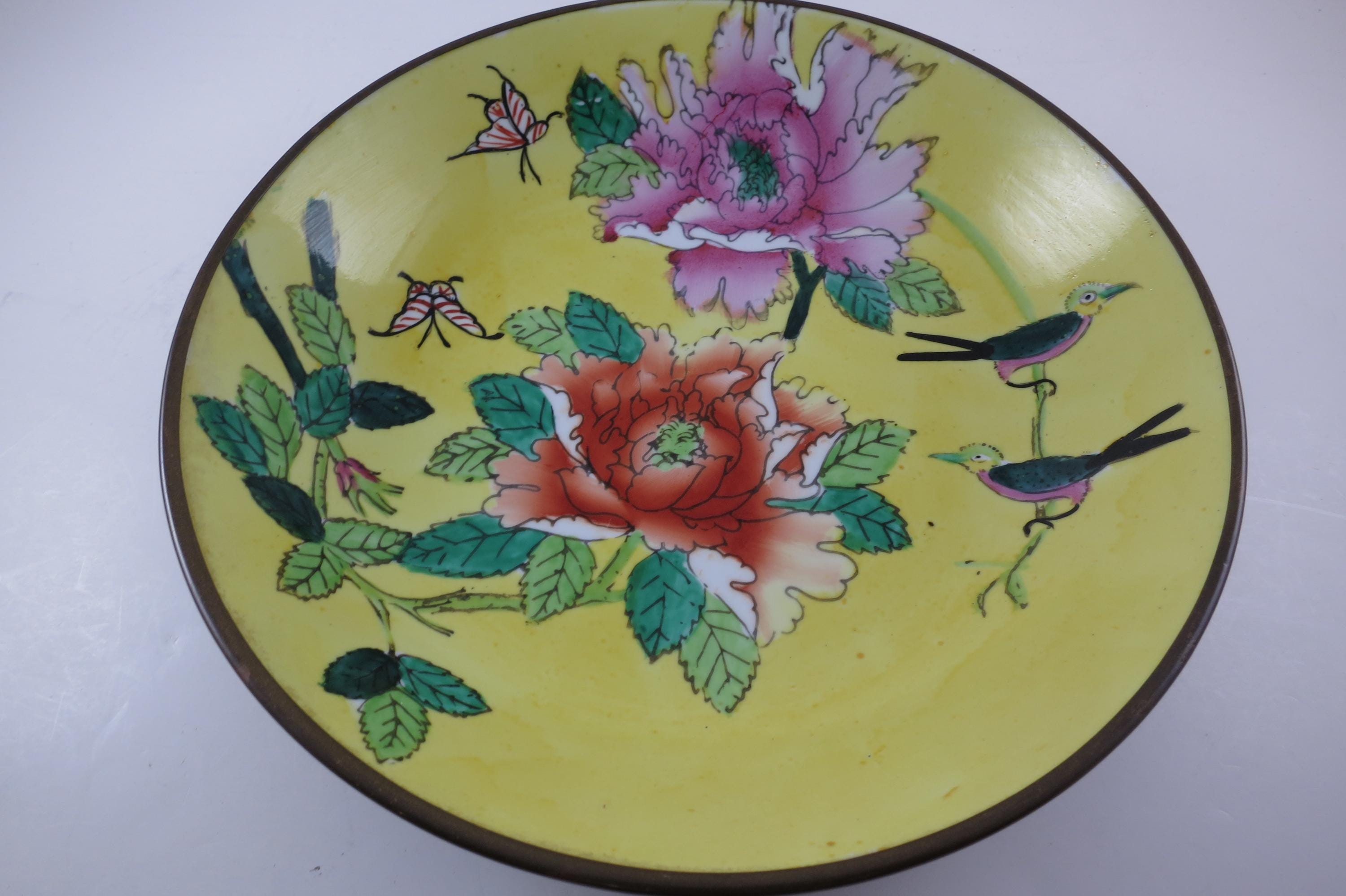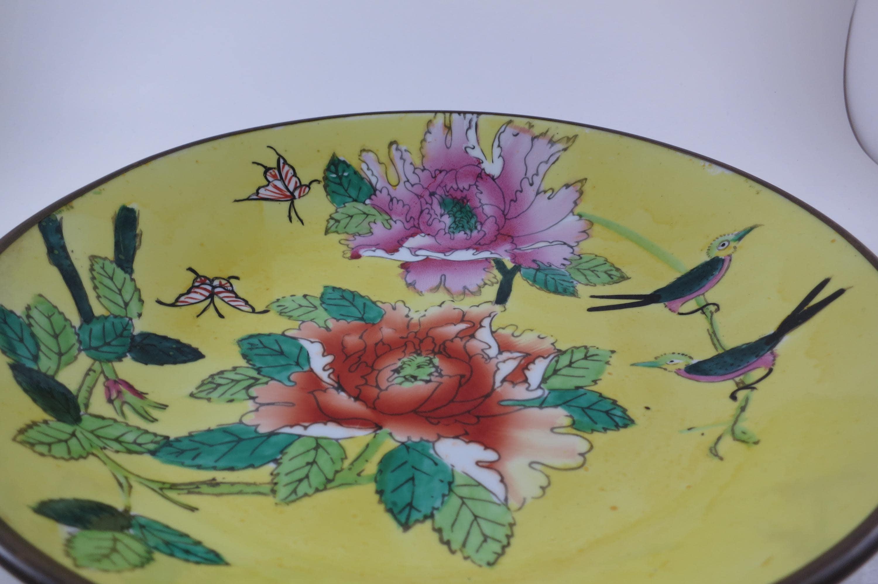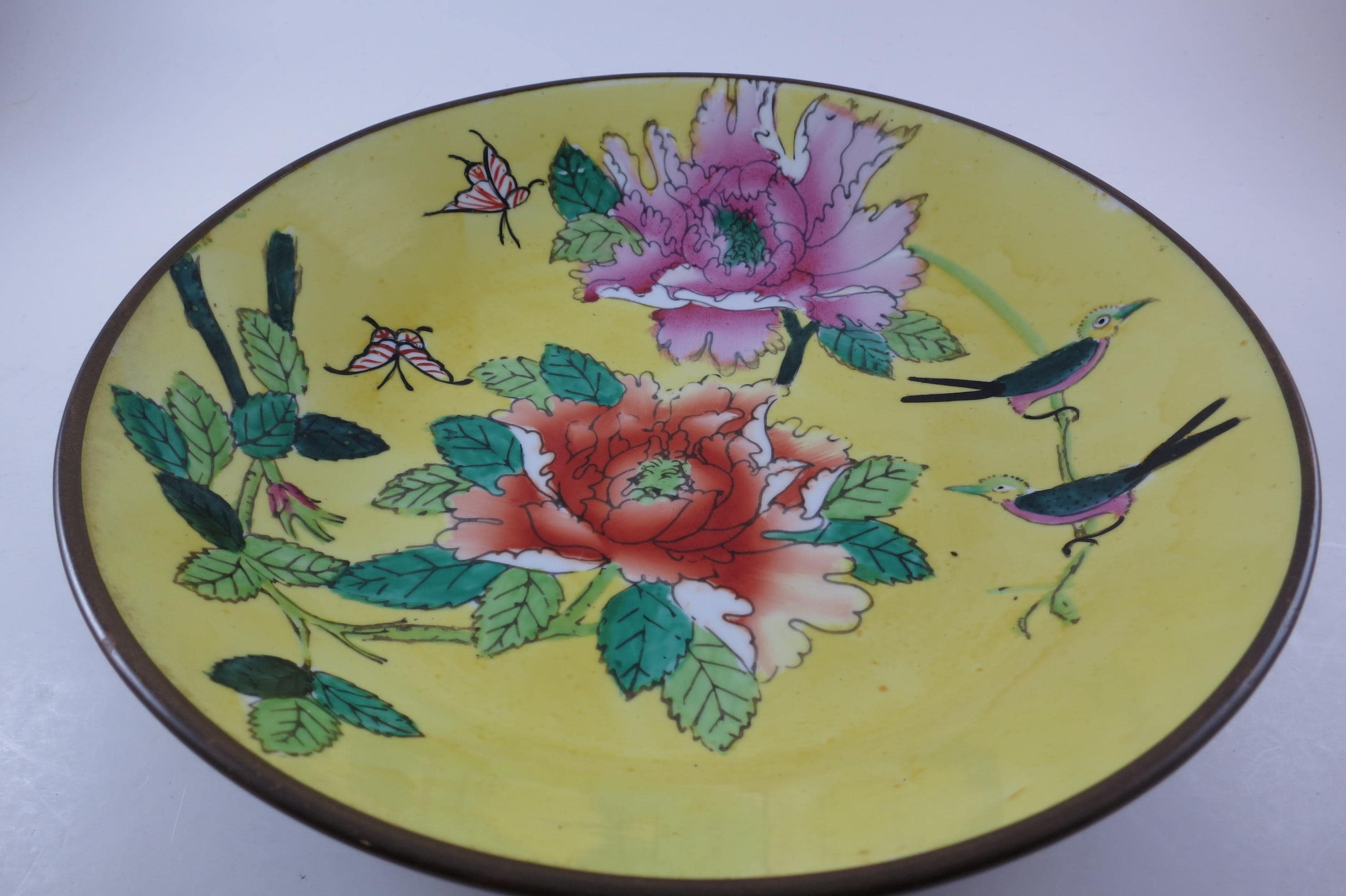 Vintage Porcelain Asian Copper Back Wall Plate Stamped Birds and Flowers with Hanger