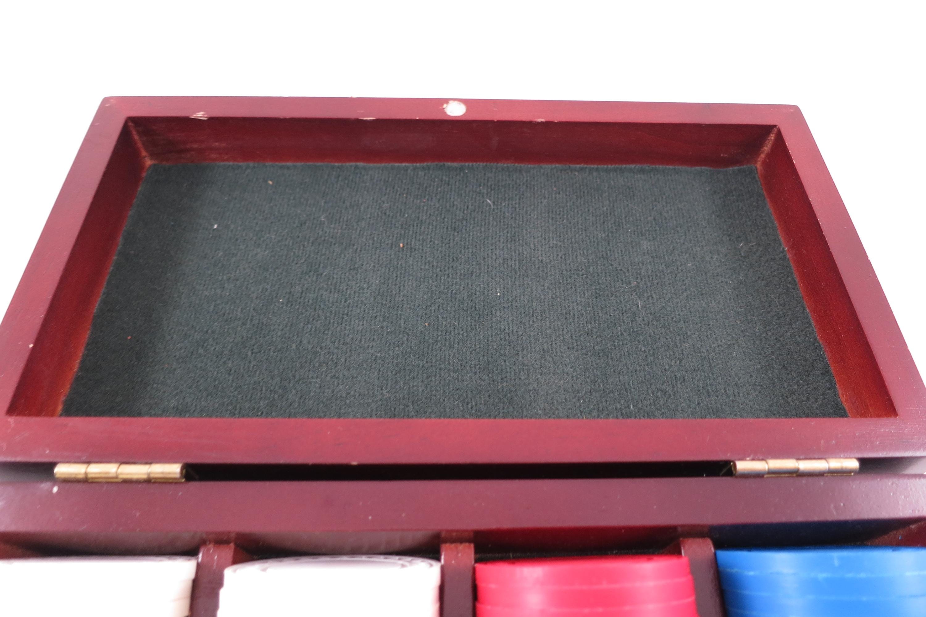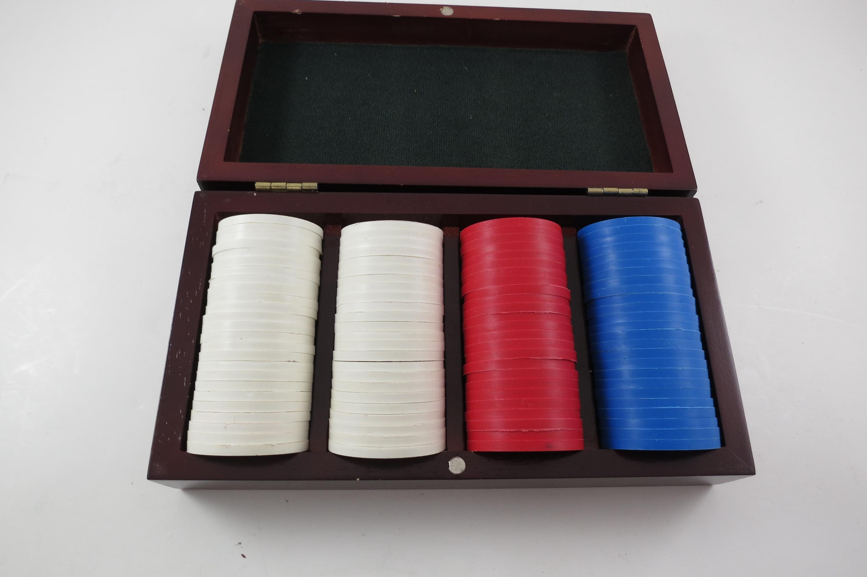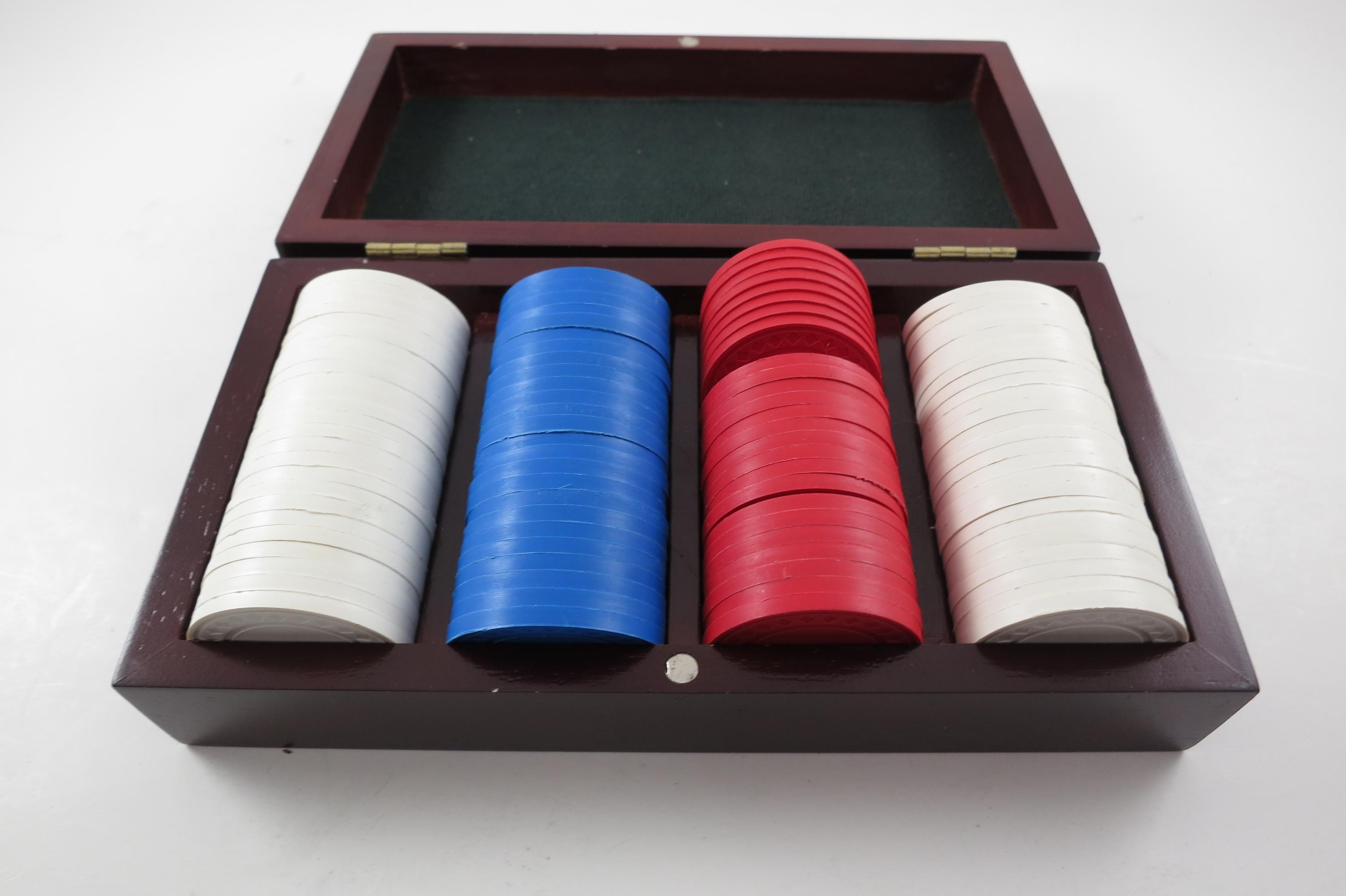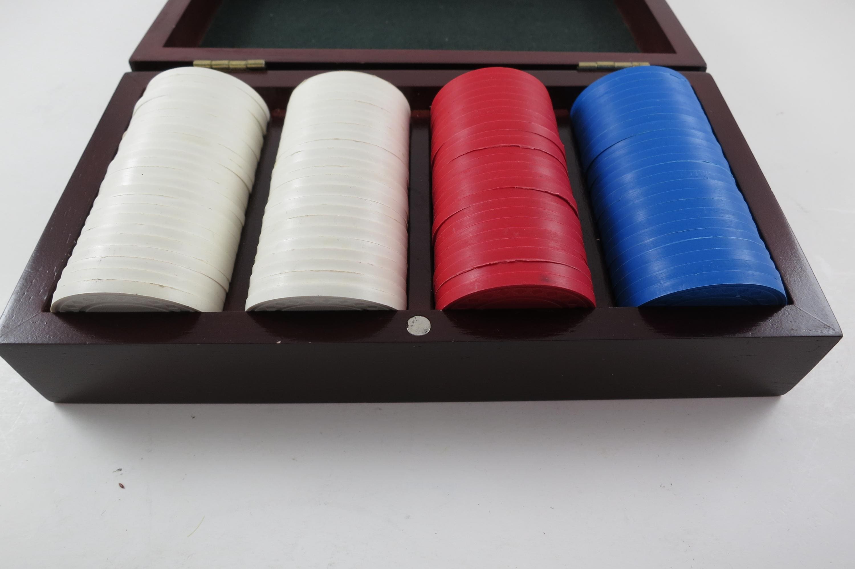 Vintage Faux Cherry Wood 3 Row Box Poker Chip Holder with 100 Chips. Three divided rows inside on a classy looking green interior. There are 25 blue, 25 red and 50 white chips. Box measures 7 3/4 inches wide, 4 1/4 inches deep and 2 inches tall.