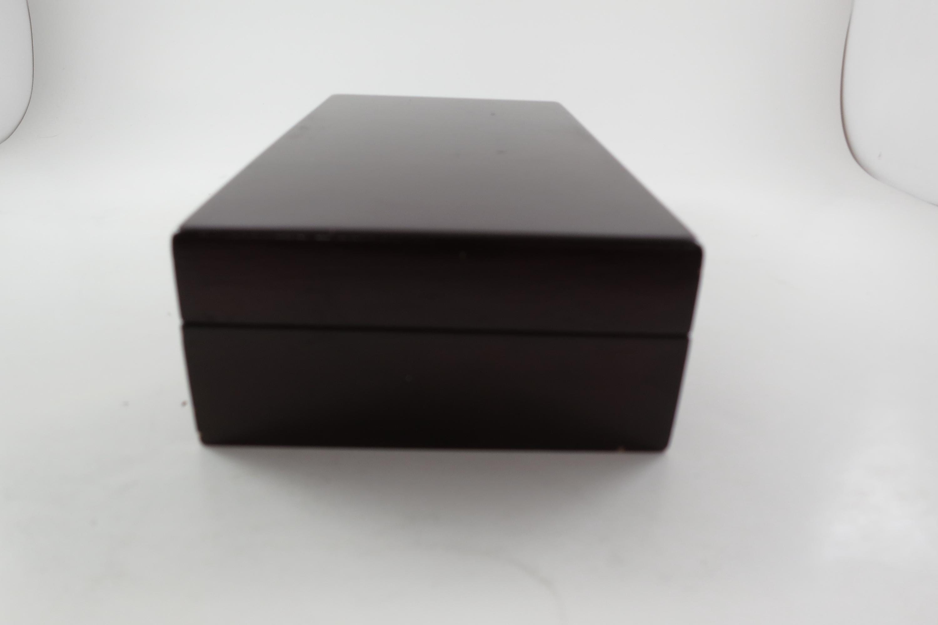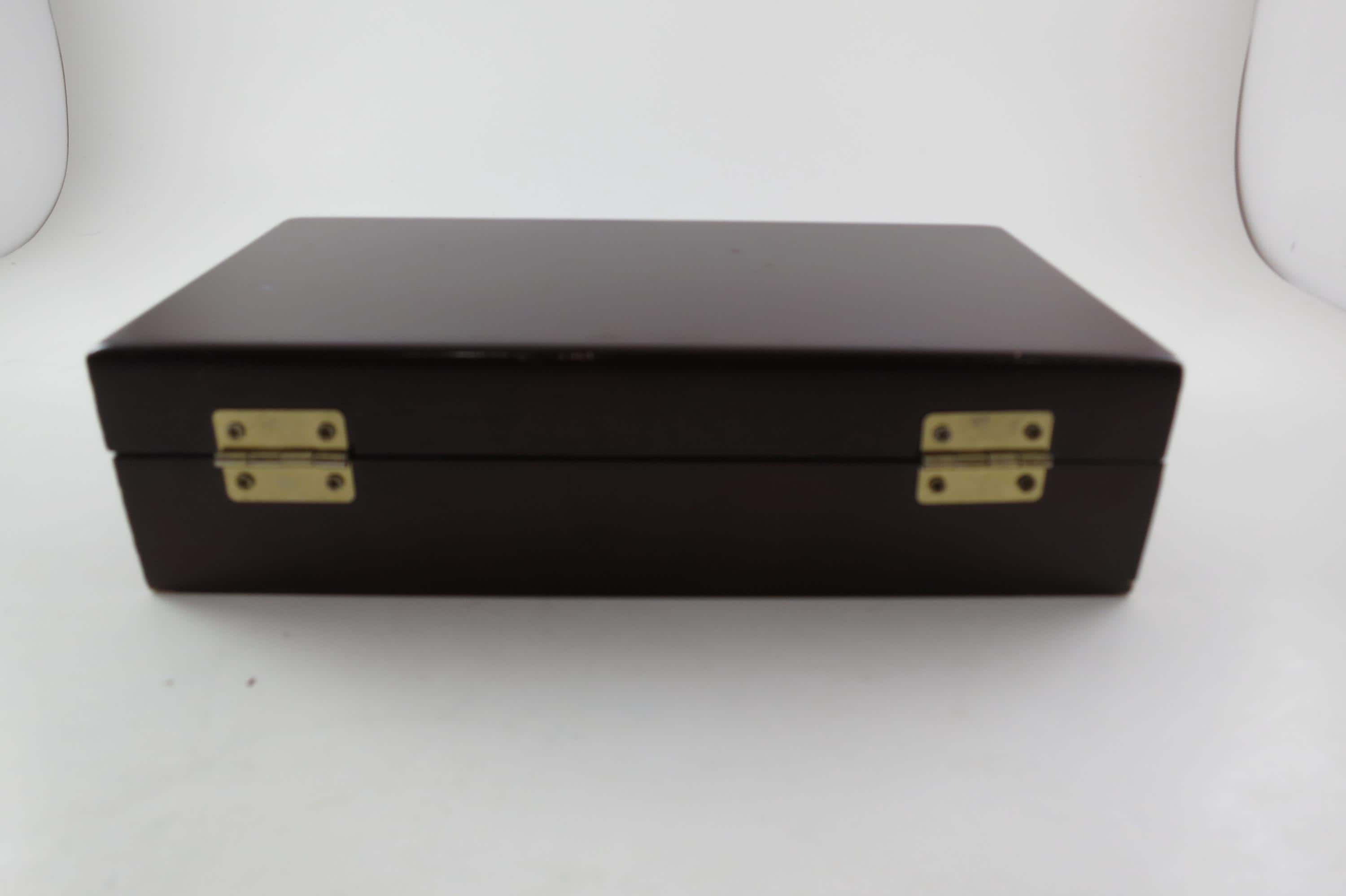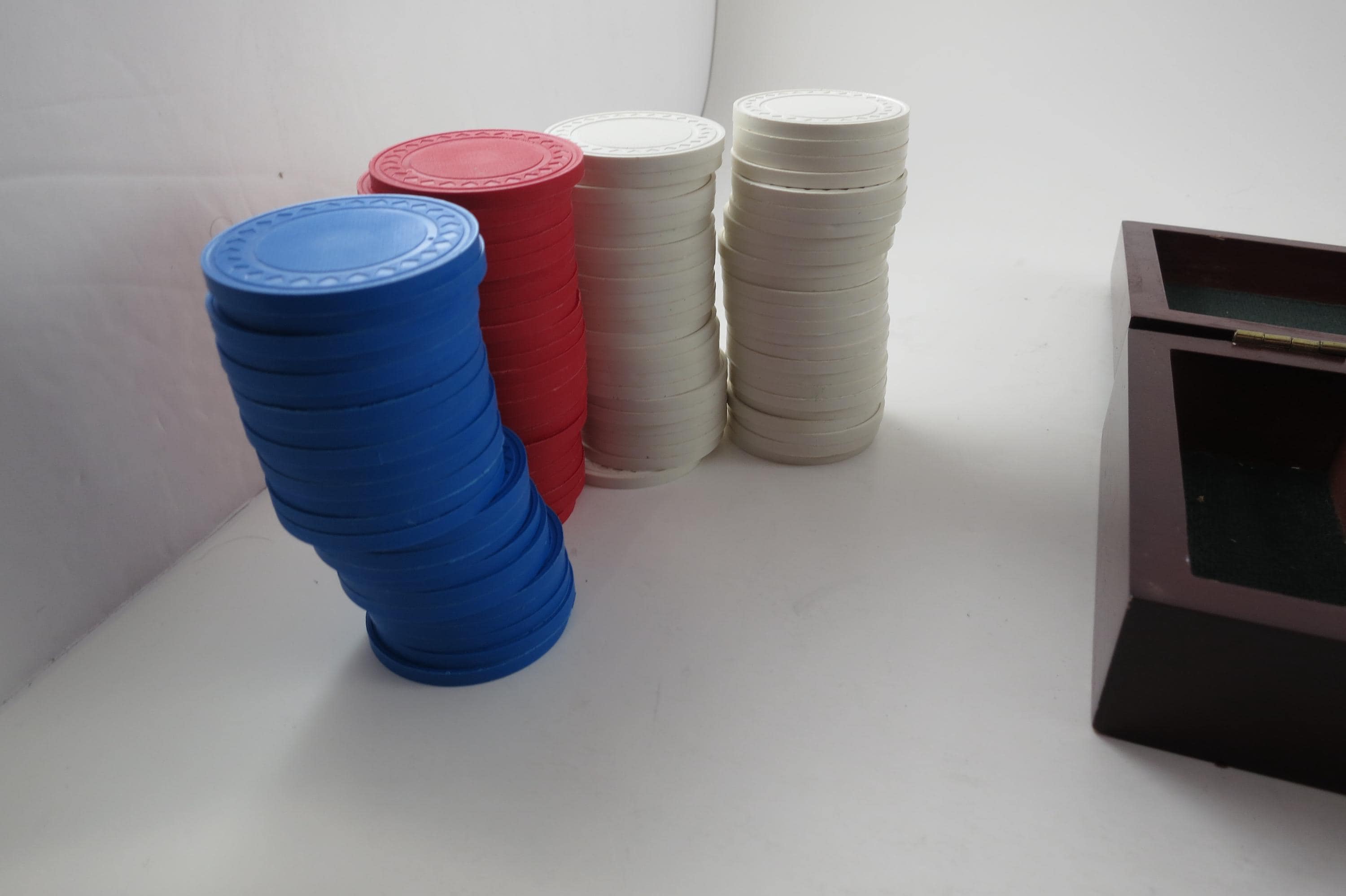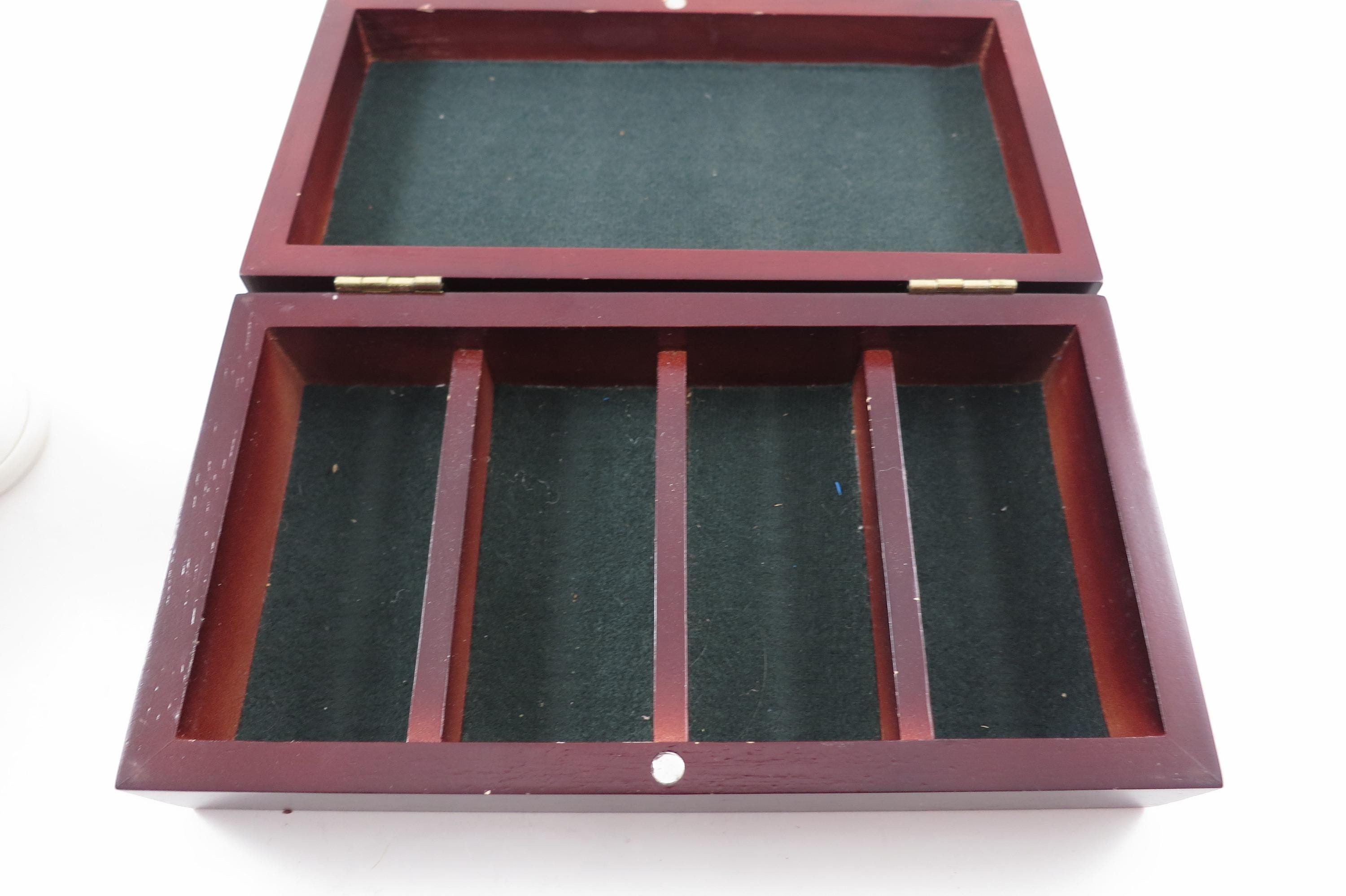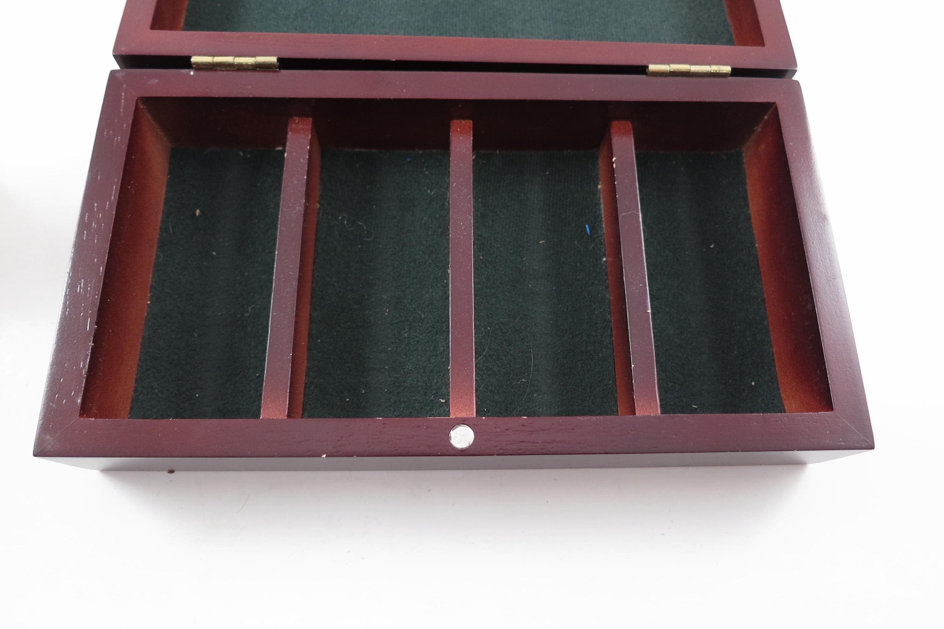 Vintage Faux Cherry Wood 3 Row Box Poker Chip Holder with 100 Chips. Three divided rows inside on a classy looking green interior. There are 25 blue, 25 red and 50 white chips. Box measures 7 3/4 inches wide, 4 1/4 inches deep and 2 inches tall.