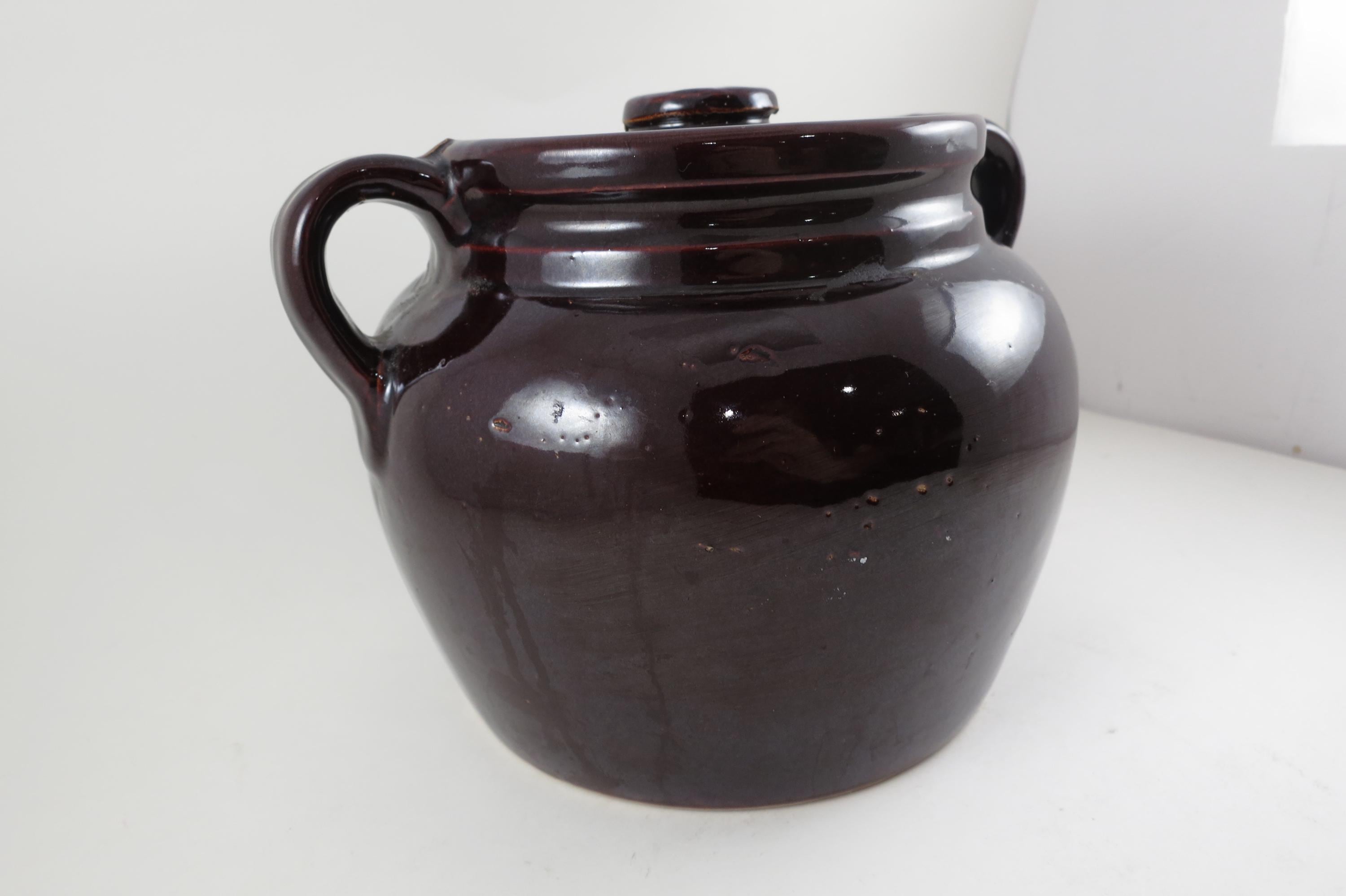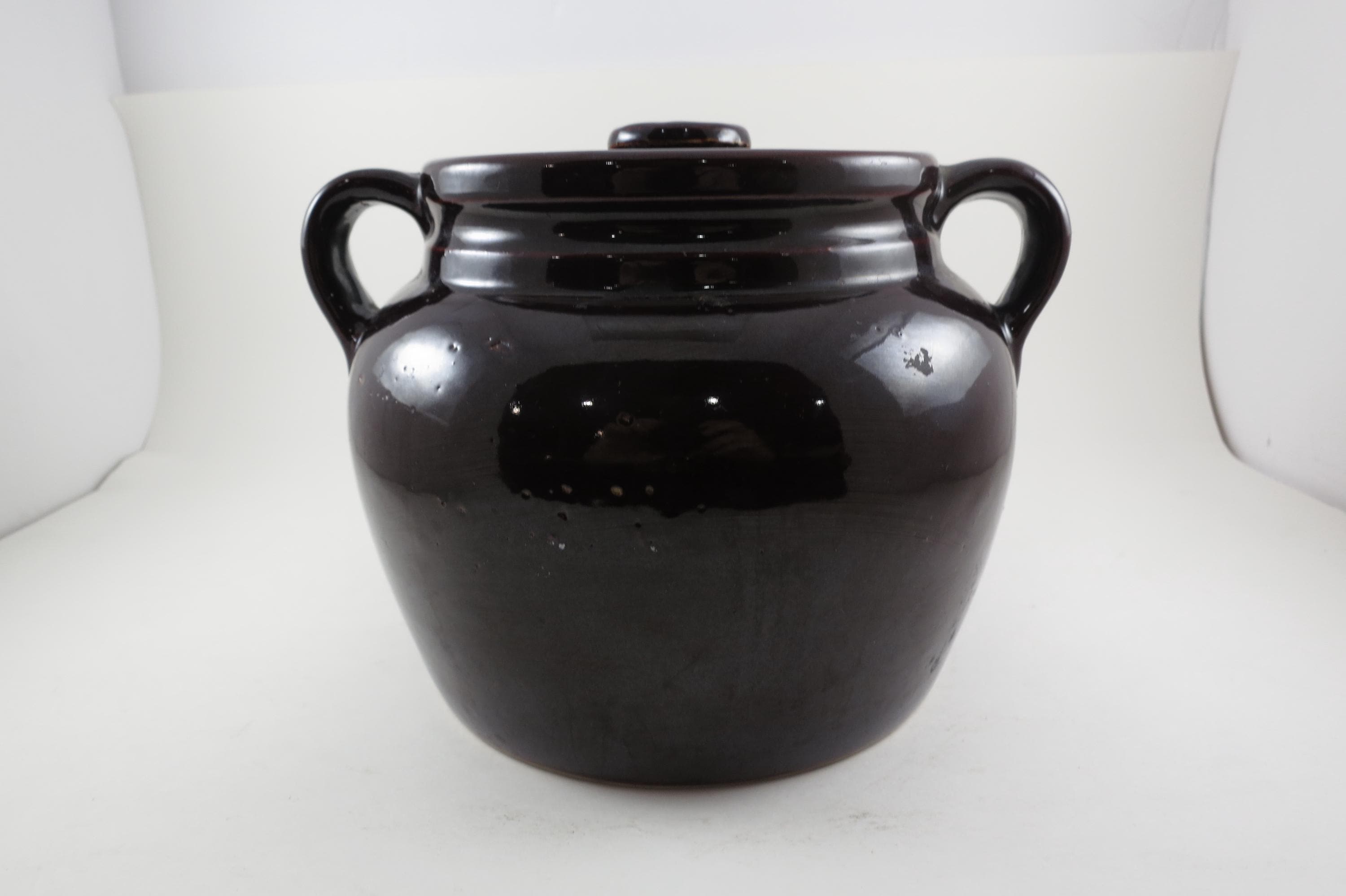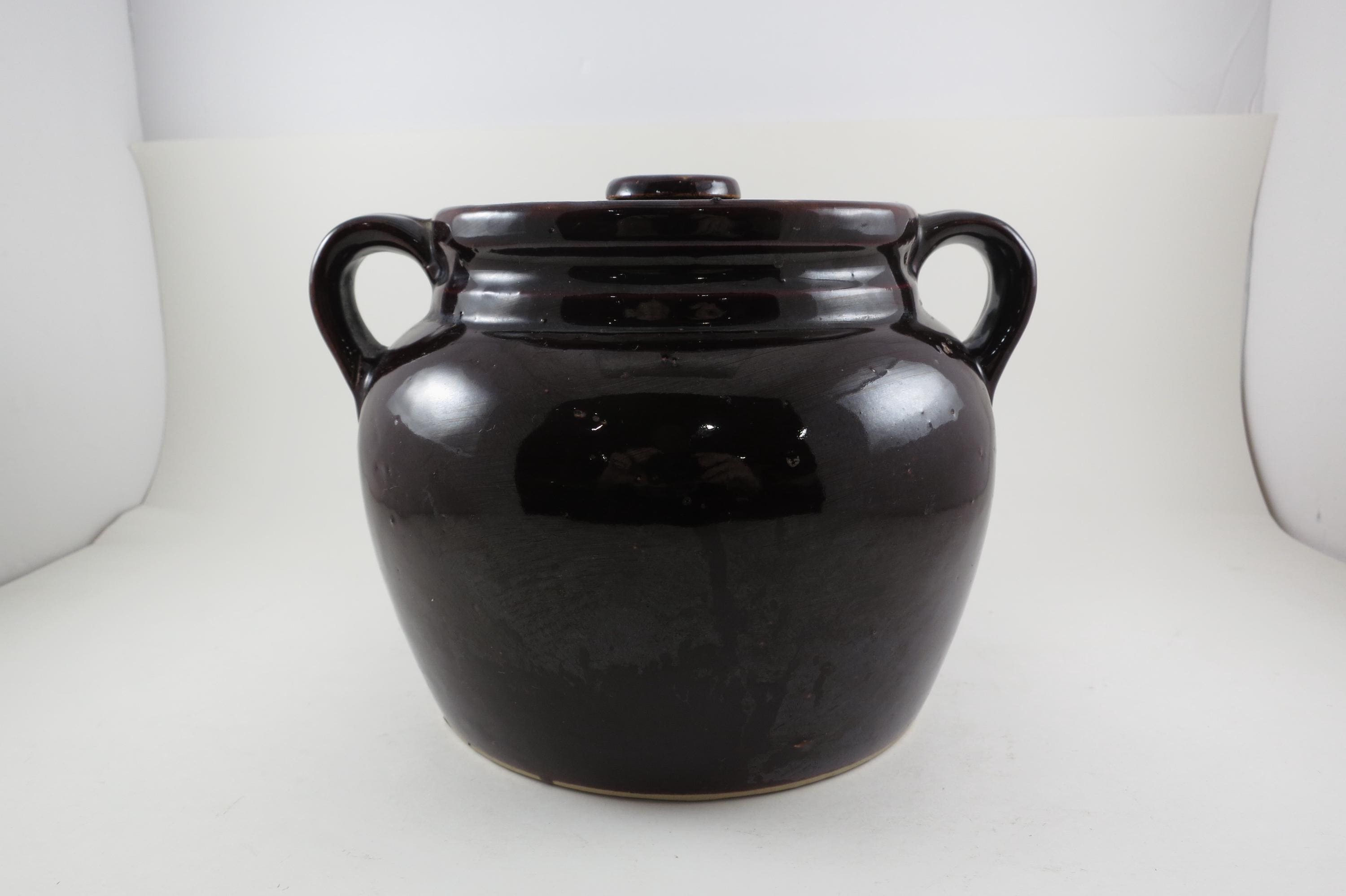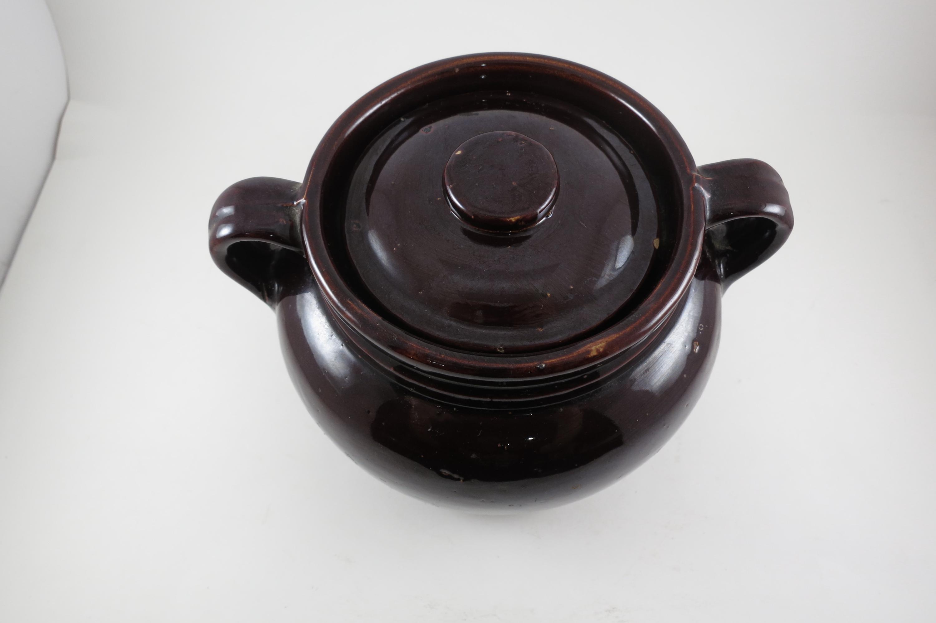 Dark Brown Double Handled Bean Pot with Original Lid. Measures 8 Inches wide and 6 inches tall. Beautiful piece with no chips, cracks or damages.