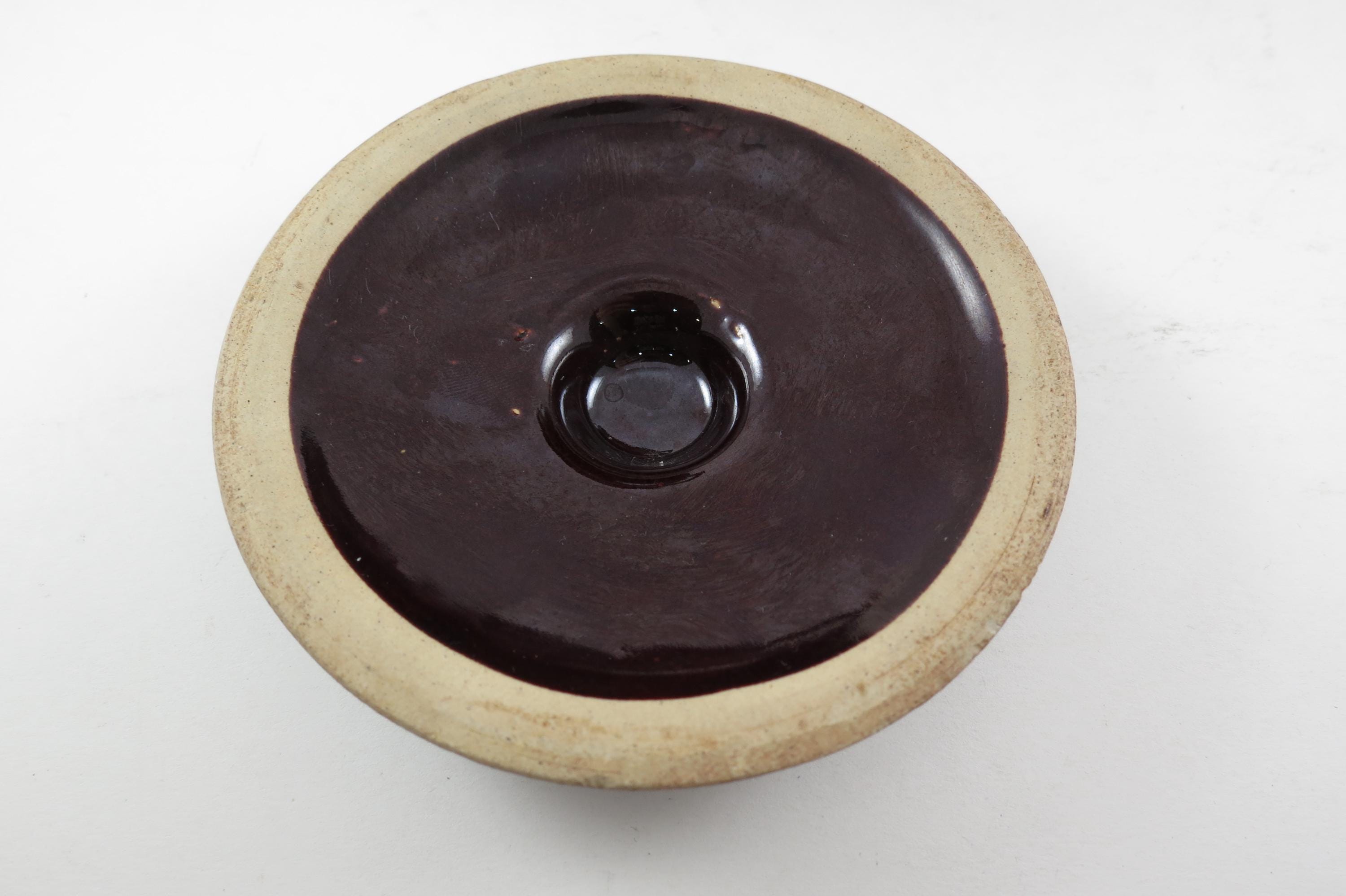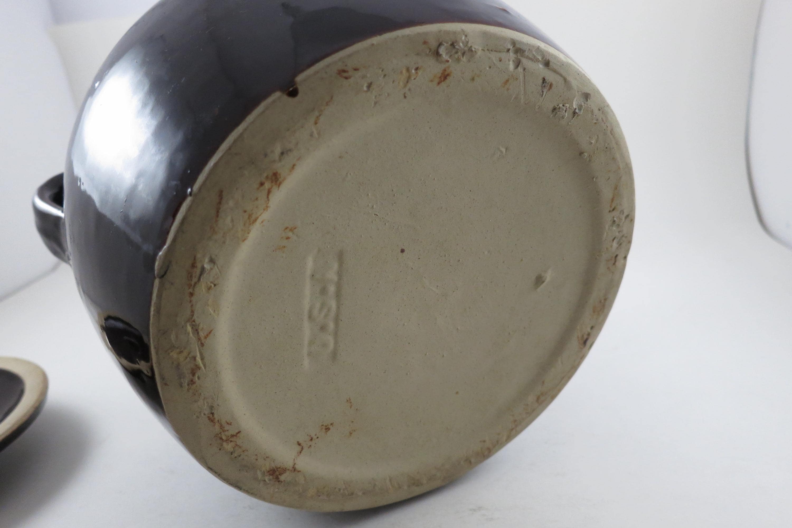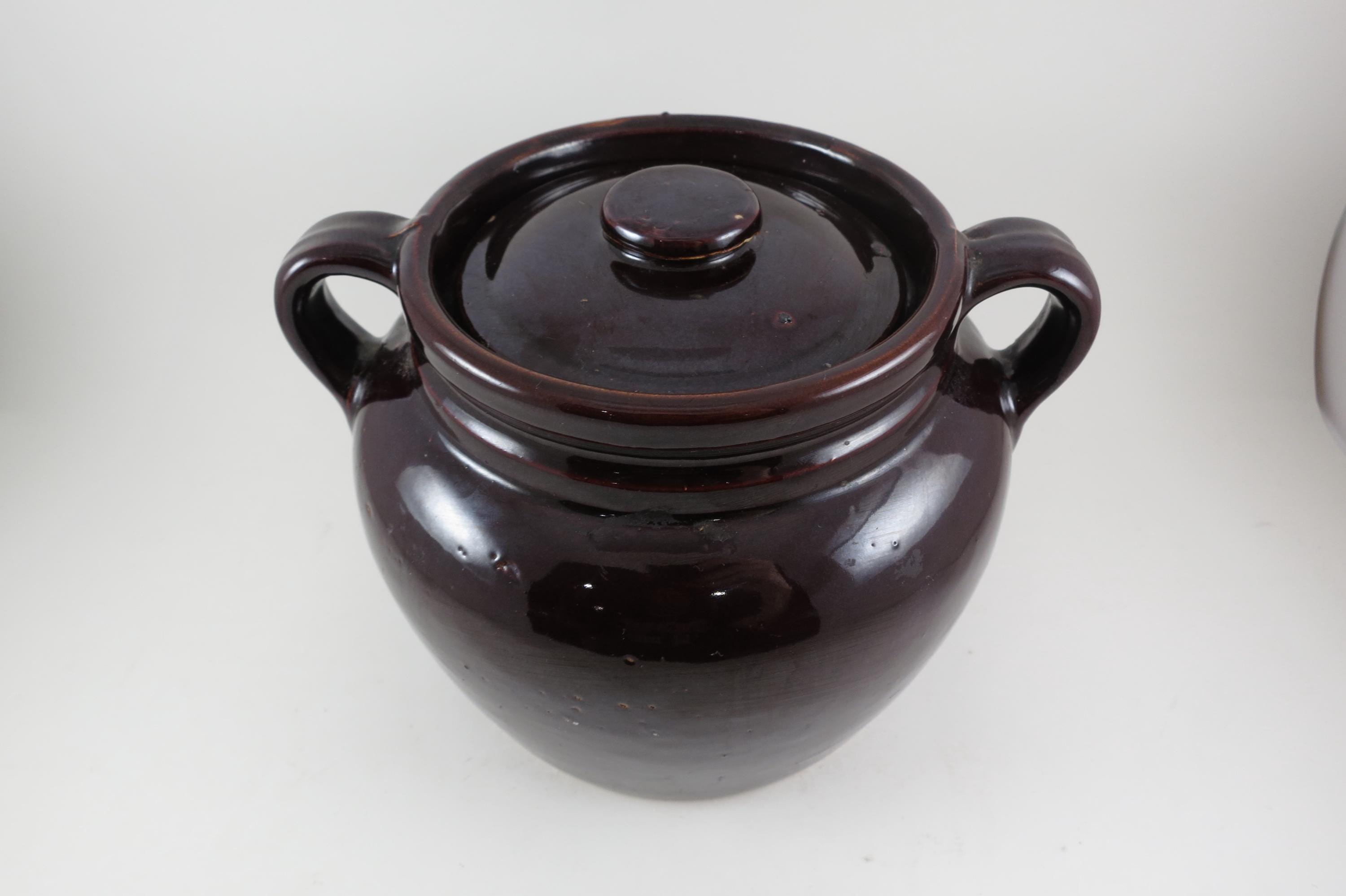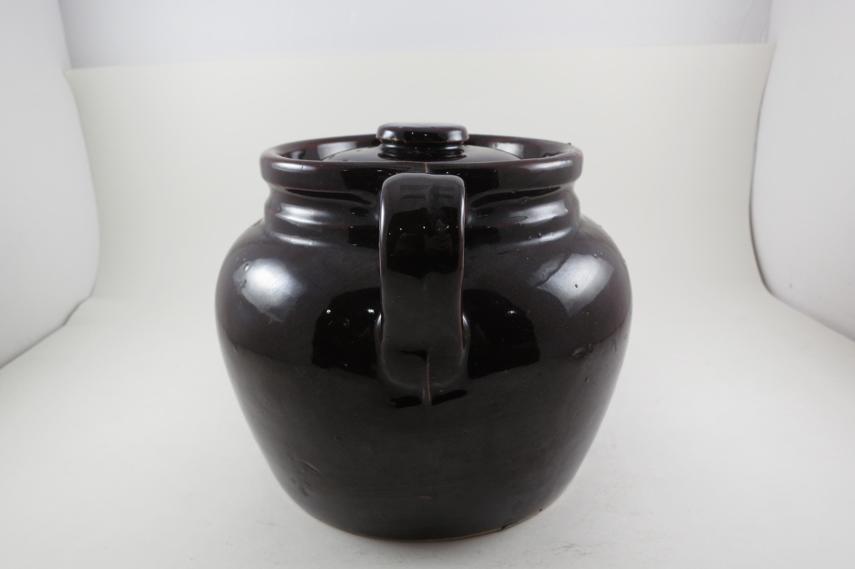 Dark Brown Double Handled Bean Pot with Original Lid. Measures 8 Inches wide and 6 inches tall. Beautiful piece with no chips, cracks or damages.