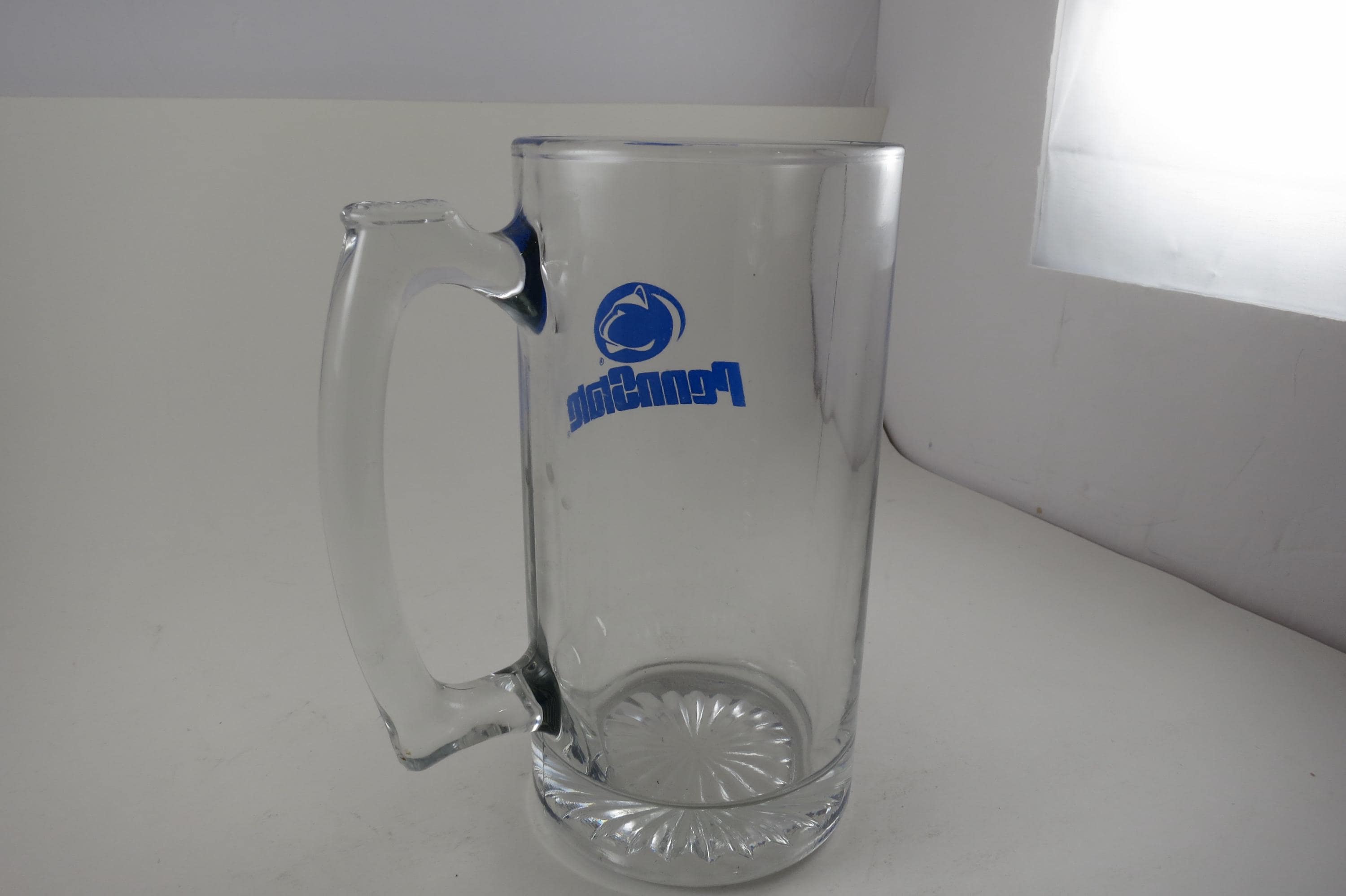 This is a large heavy tankard. Has the Penn State Logo in Blue on the front. Measures 7 1/4 inches tall.