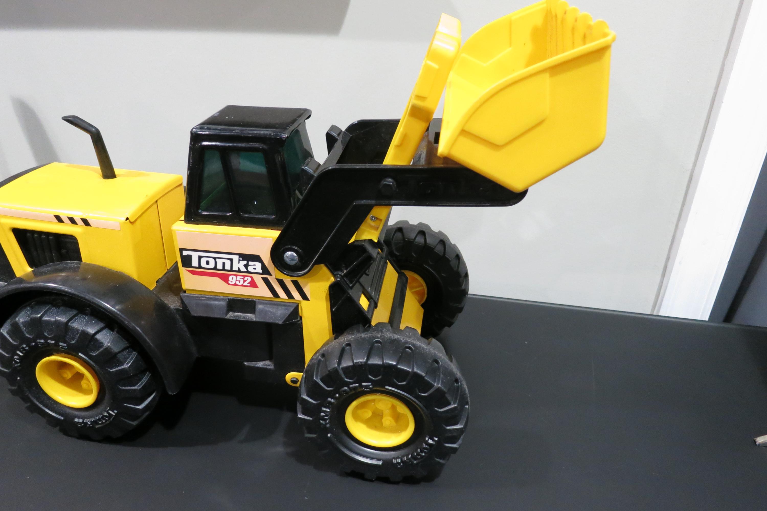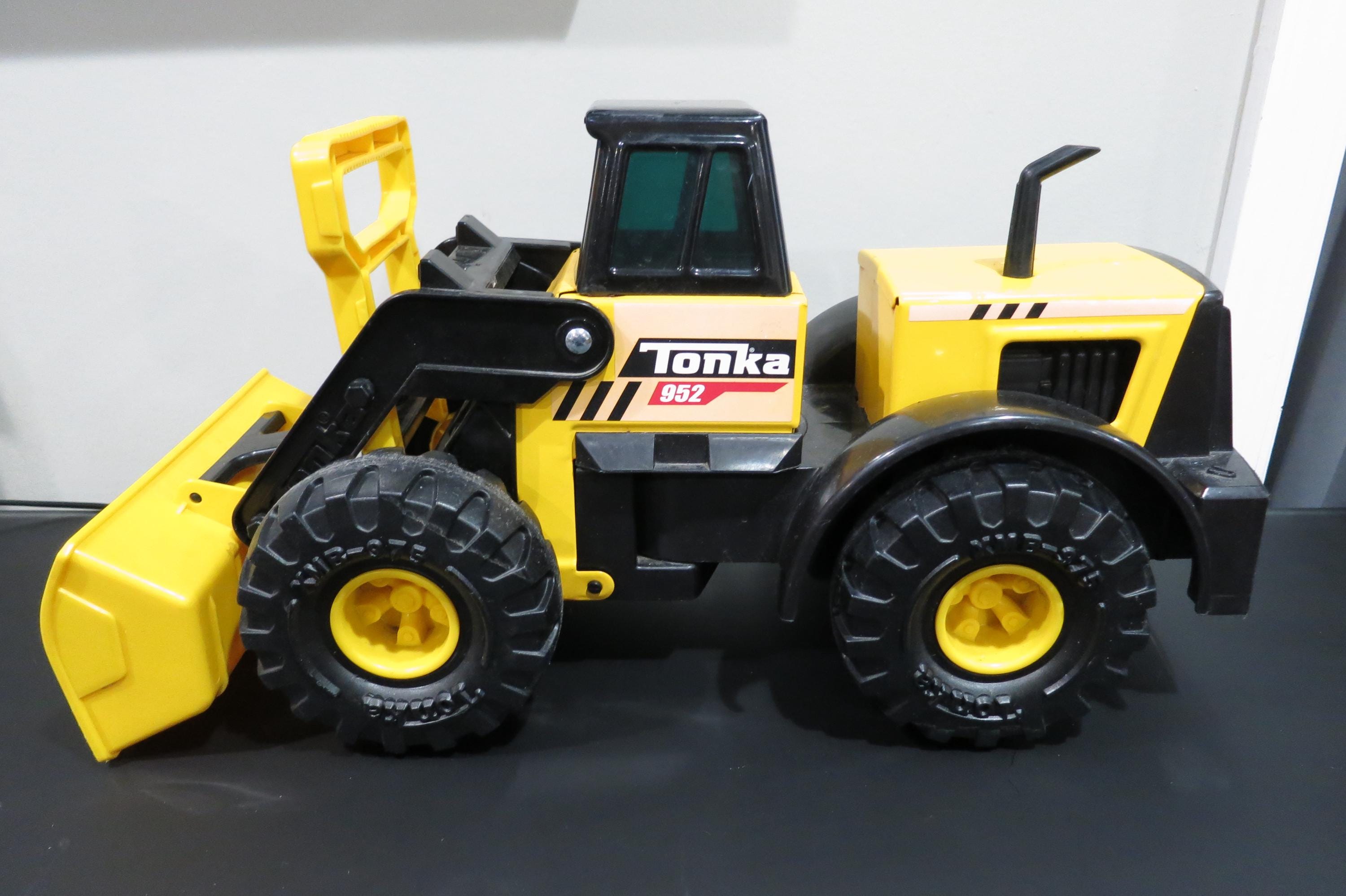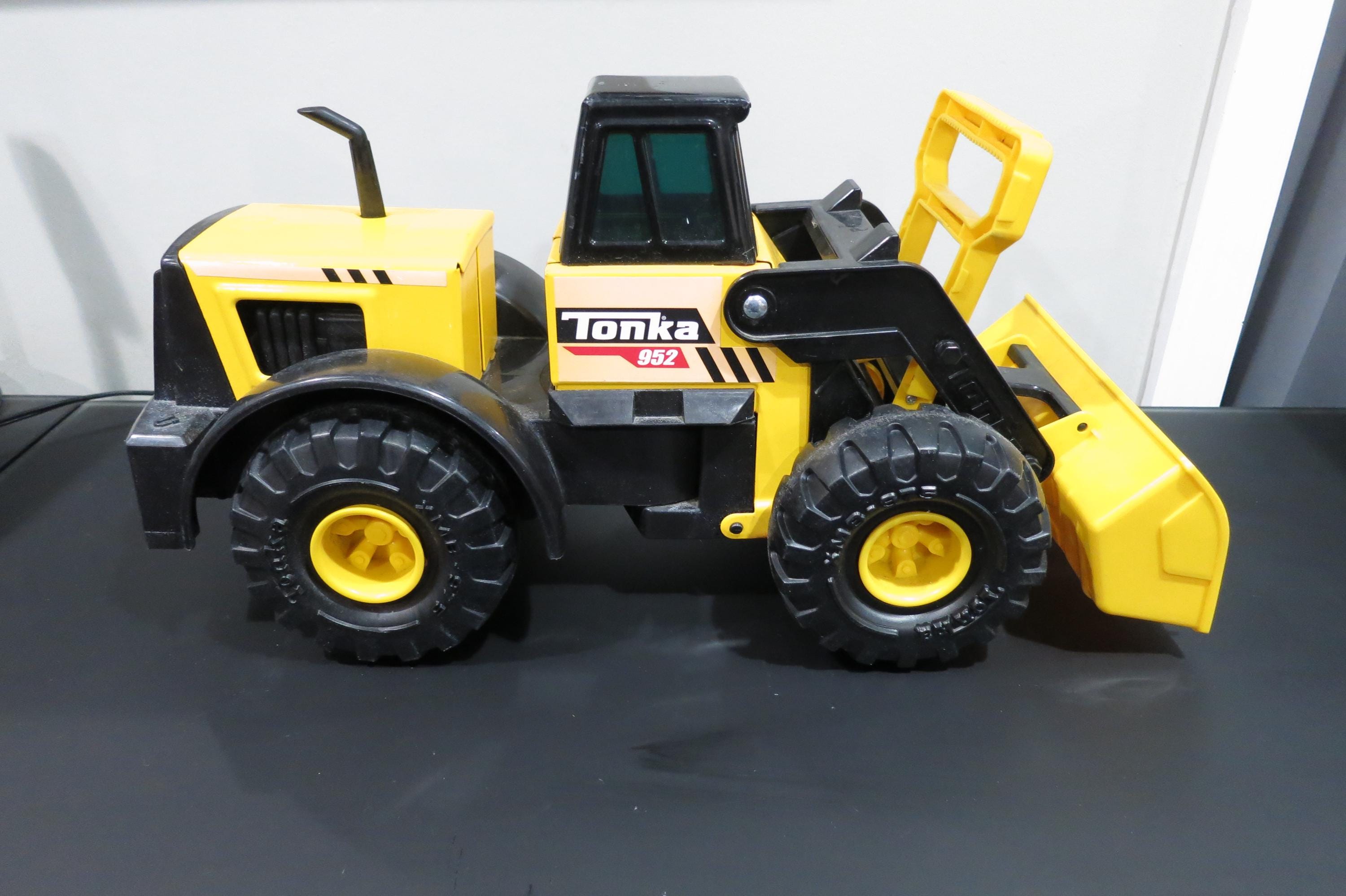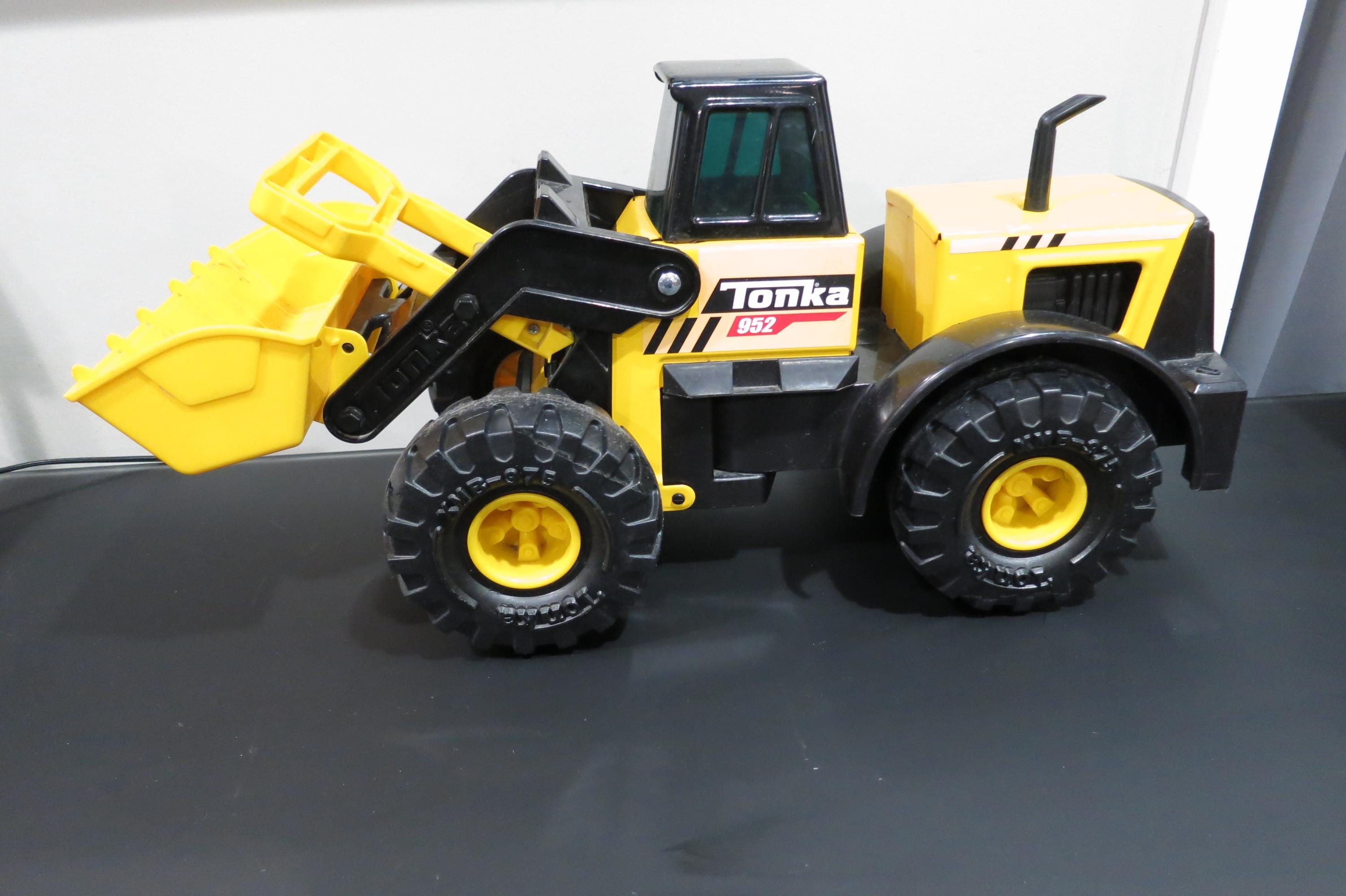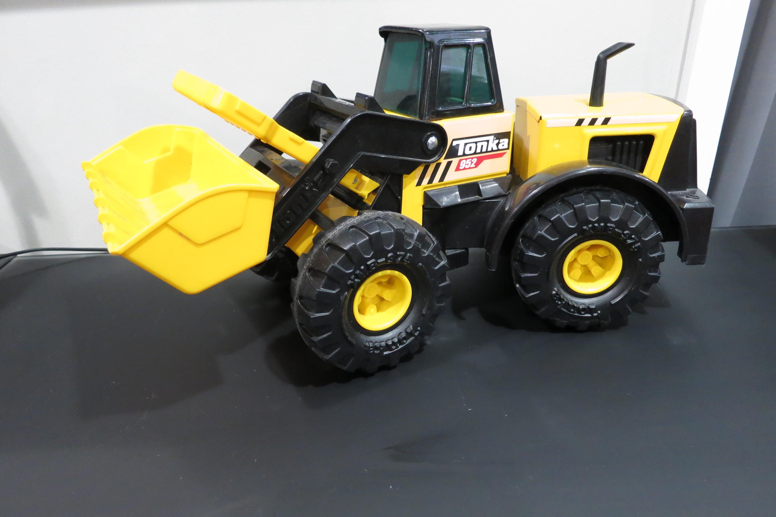 Vintage Mighty Tonka Front End Loader 952 Pressed Steel Works Perfectly. Measures 18 inches long, 8 inches wide and 9 1/2 inches tall (at the smallest configuration) All the mechanics operate as they should. Original Paint and stickers, lightly played with, sold as shown, including the dirt! Great Gift!! We offer free shipping on all orders over 35 dollars. (Saves you lots, this is a big truck!!)