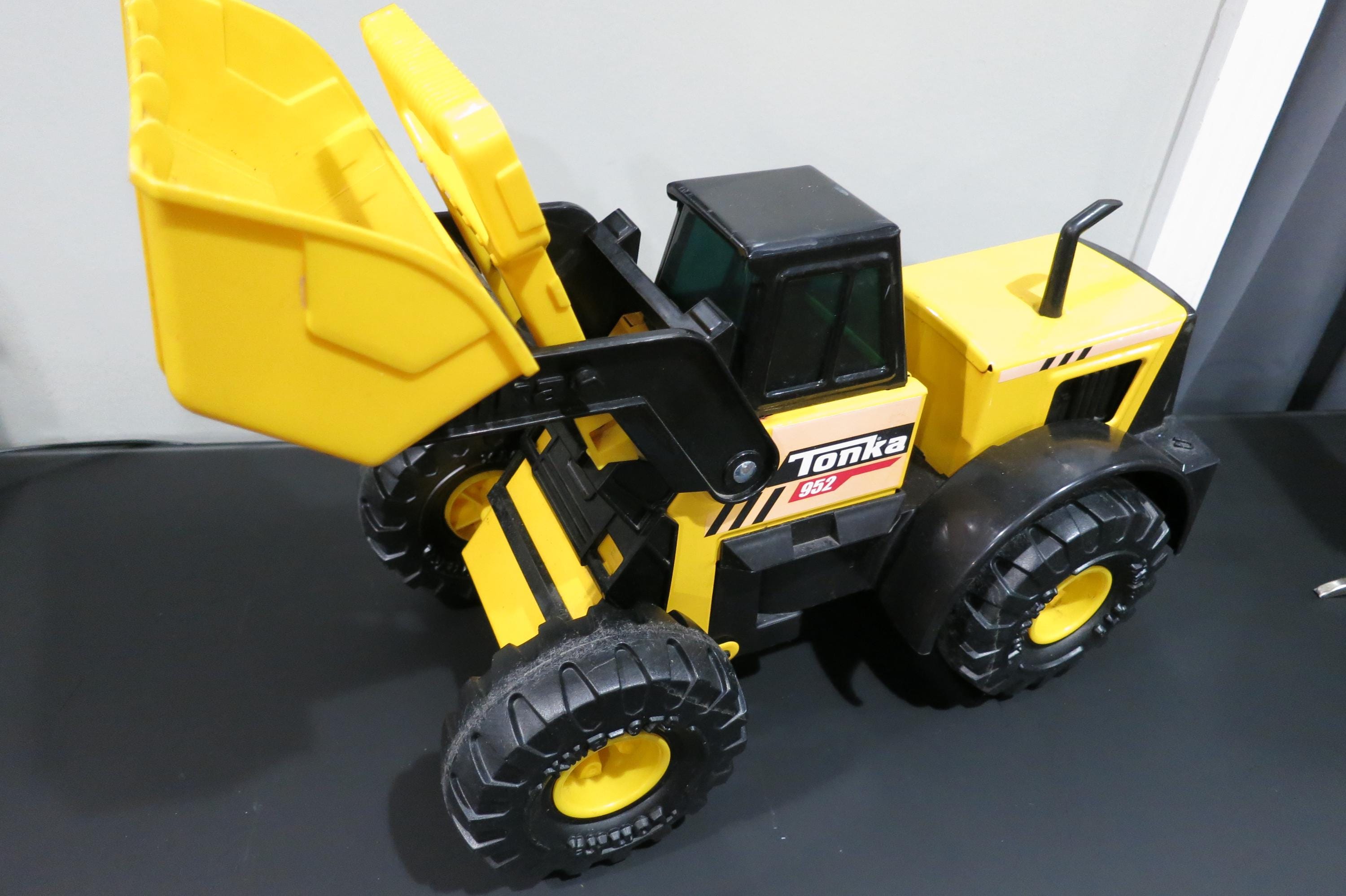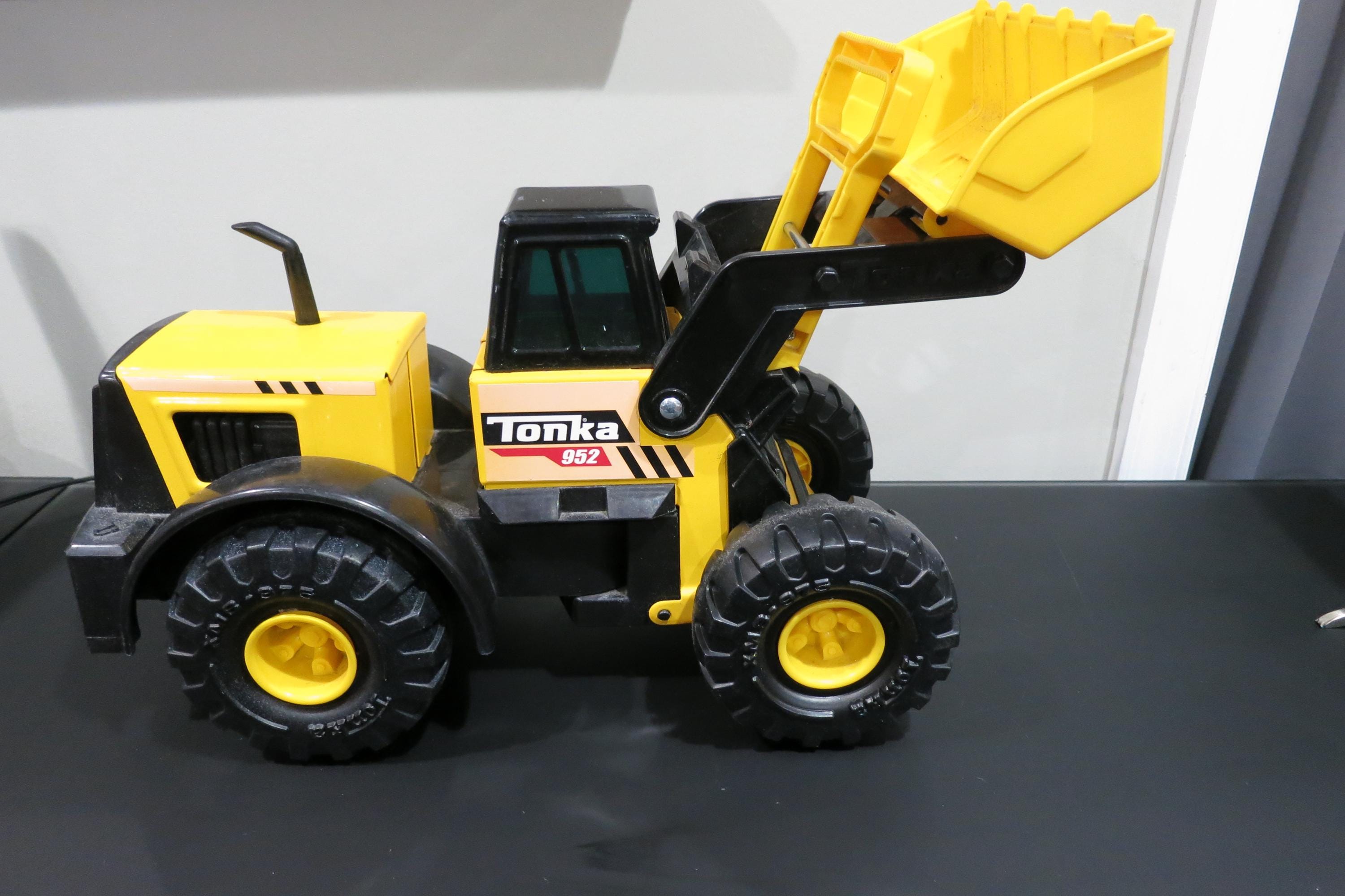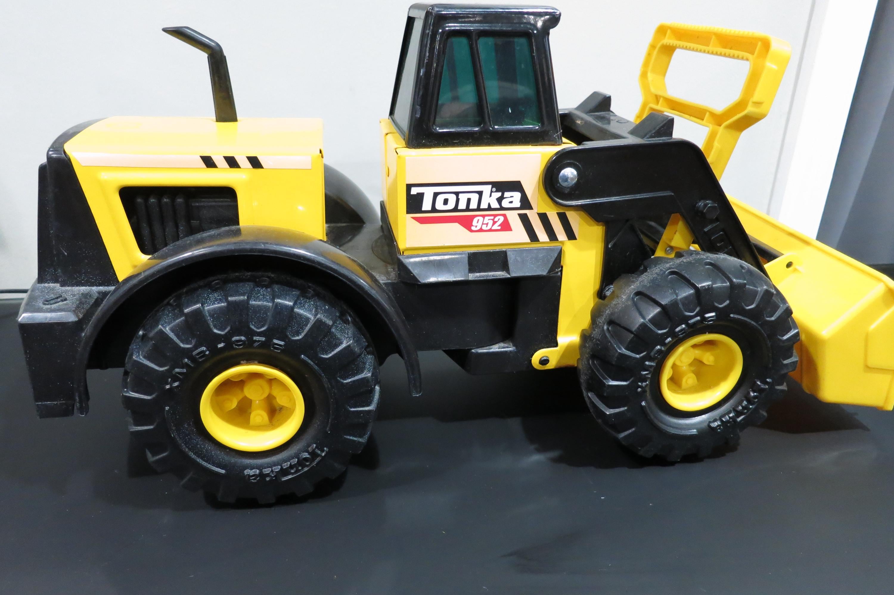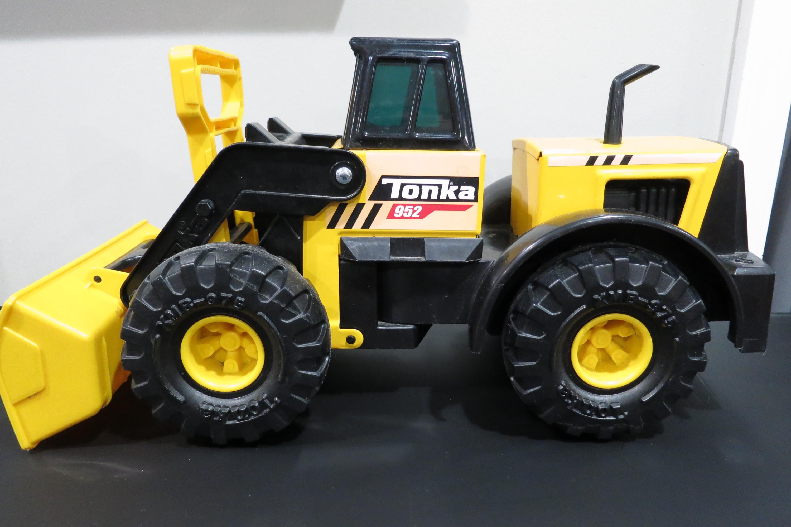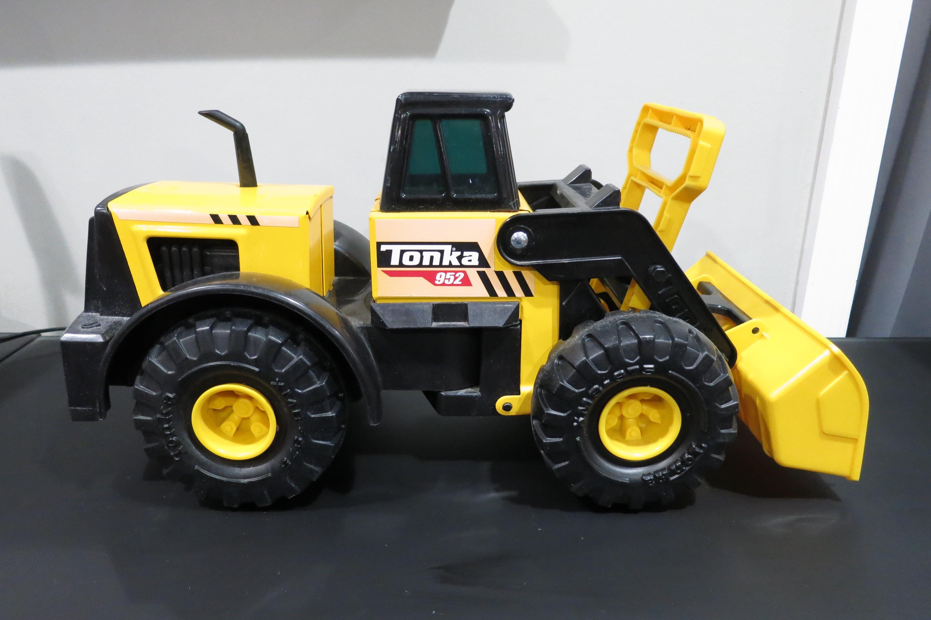 Vintage Mighty Tonka Front End Loader 952 Pressed Steel Works Perfectly. Measures 18 inches long, 8 inches wide and 9 1/2 inches tall (at the smallest configuration) All the mechanics operate as they should. Original Paint and stickers, lightly played with, sold as shown, including the dirt! Great Gift!! We offer free shipping on all orders over 35 dollars. (Saves you lots, this is a big truck!!)
