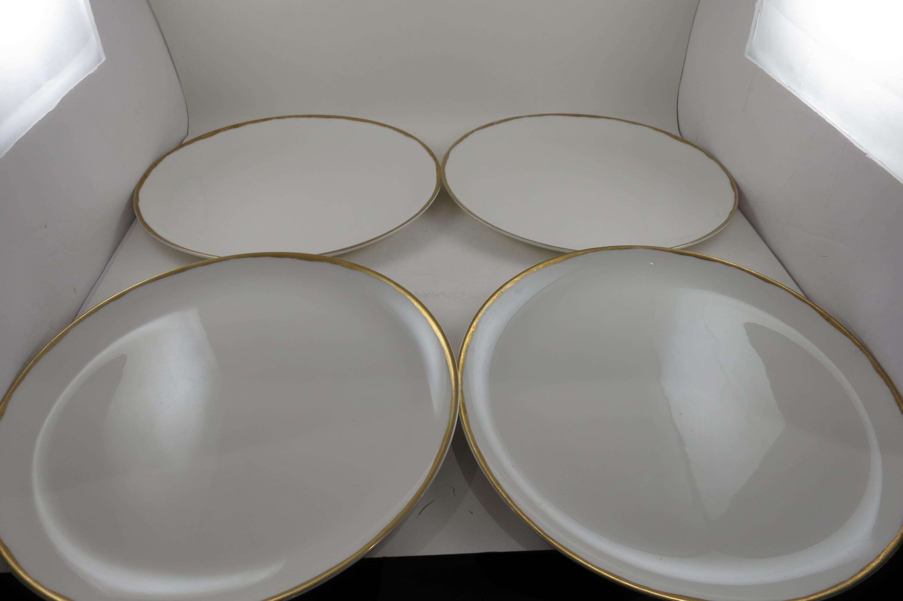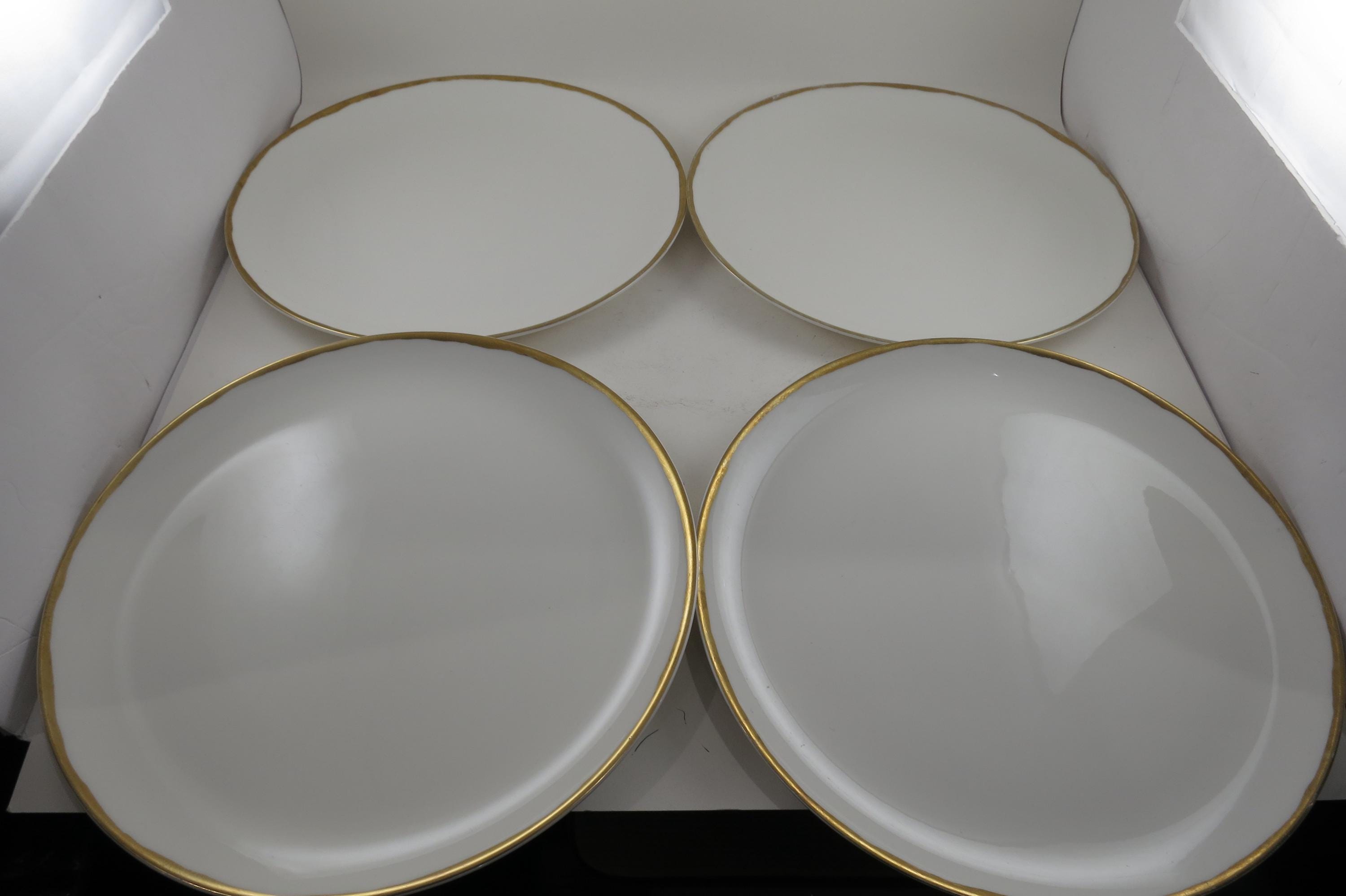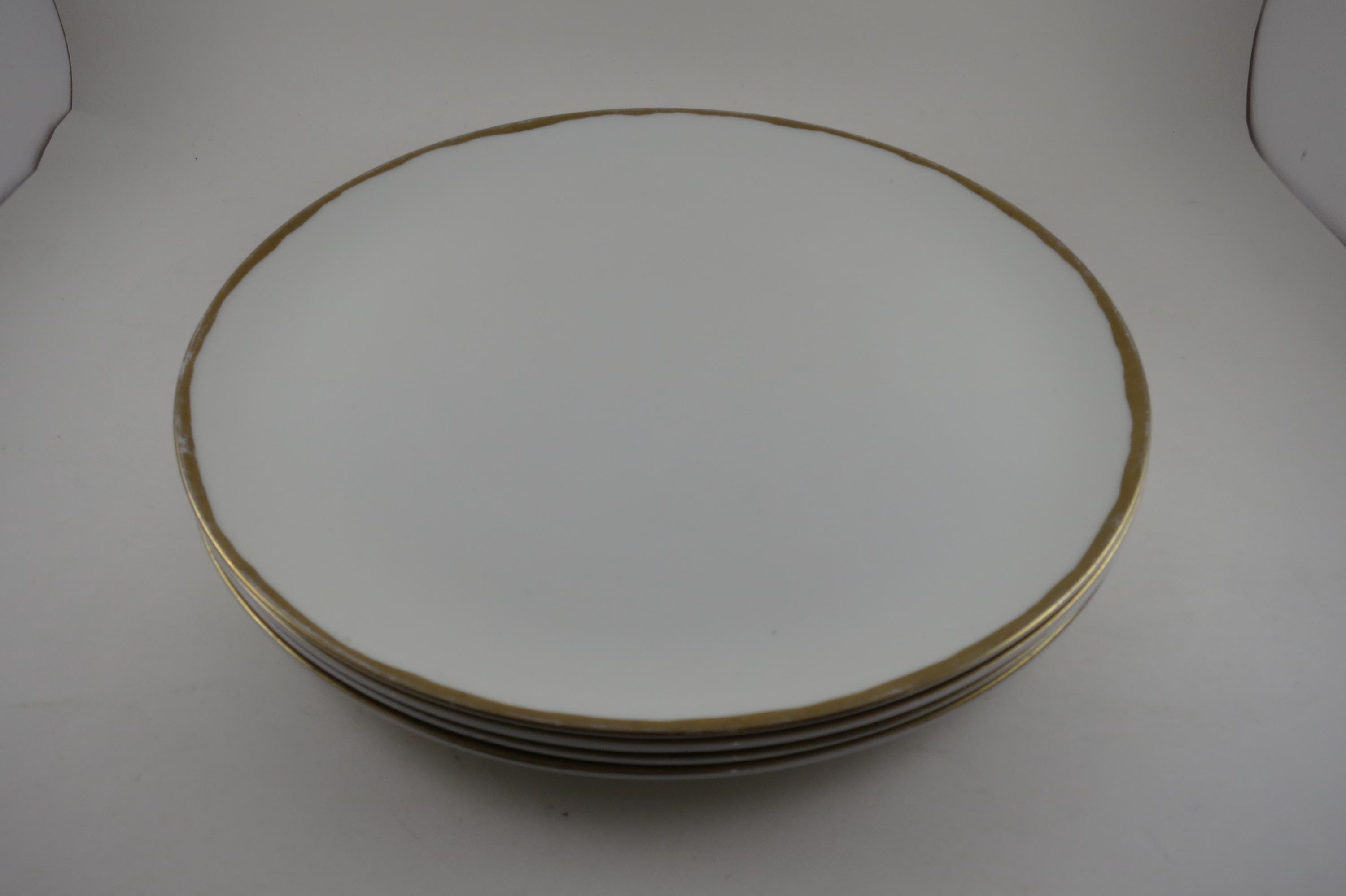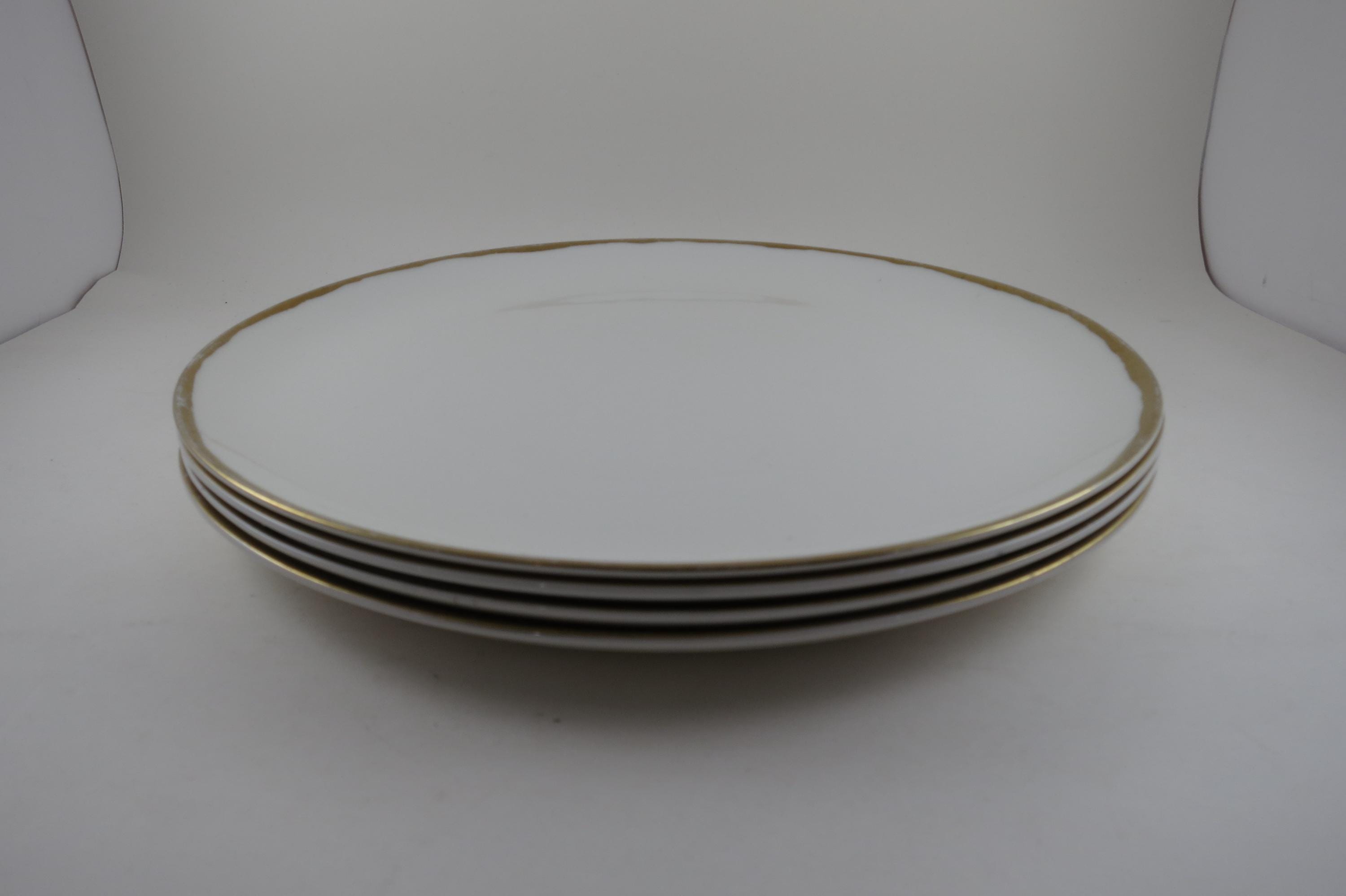 Beautiful gold trim plates, measuring 11 1/4 inches in diameter. They show normal use wear and are in very good used condition with no chips or cracks. Set of Four.