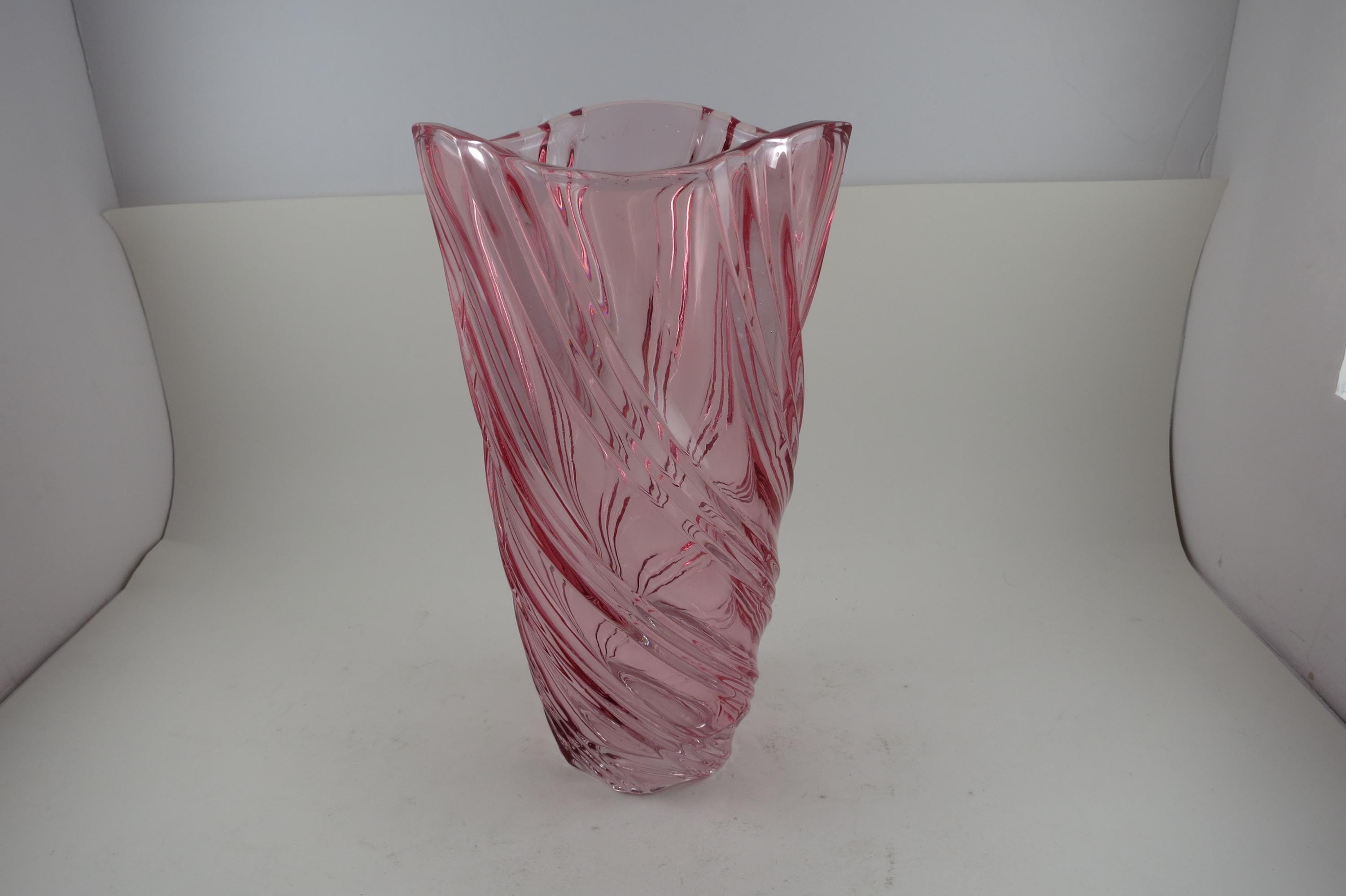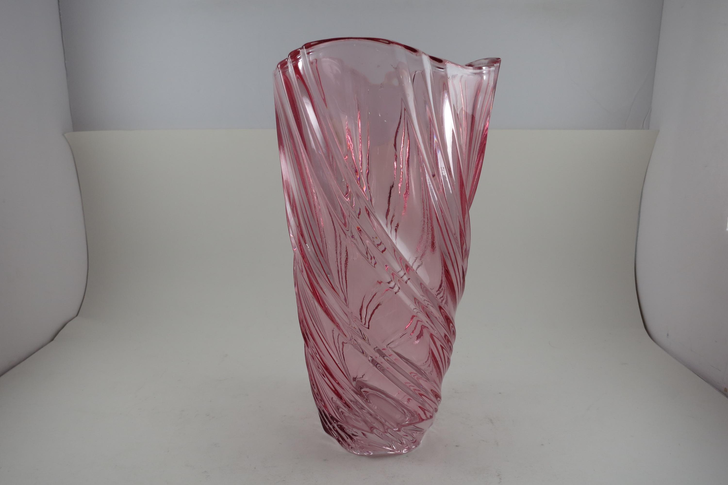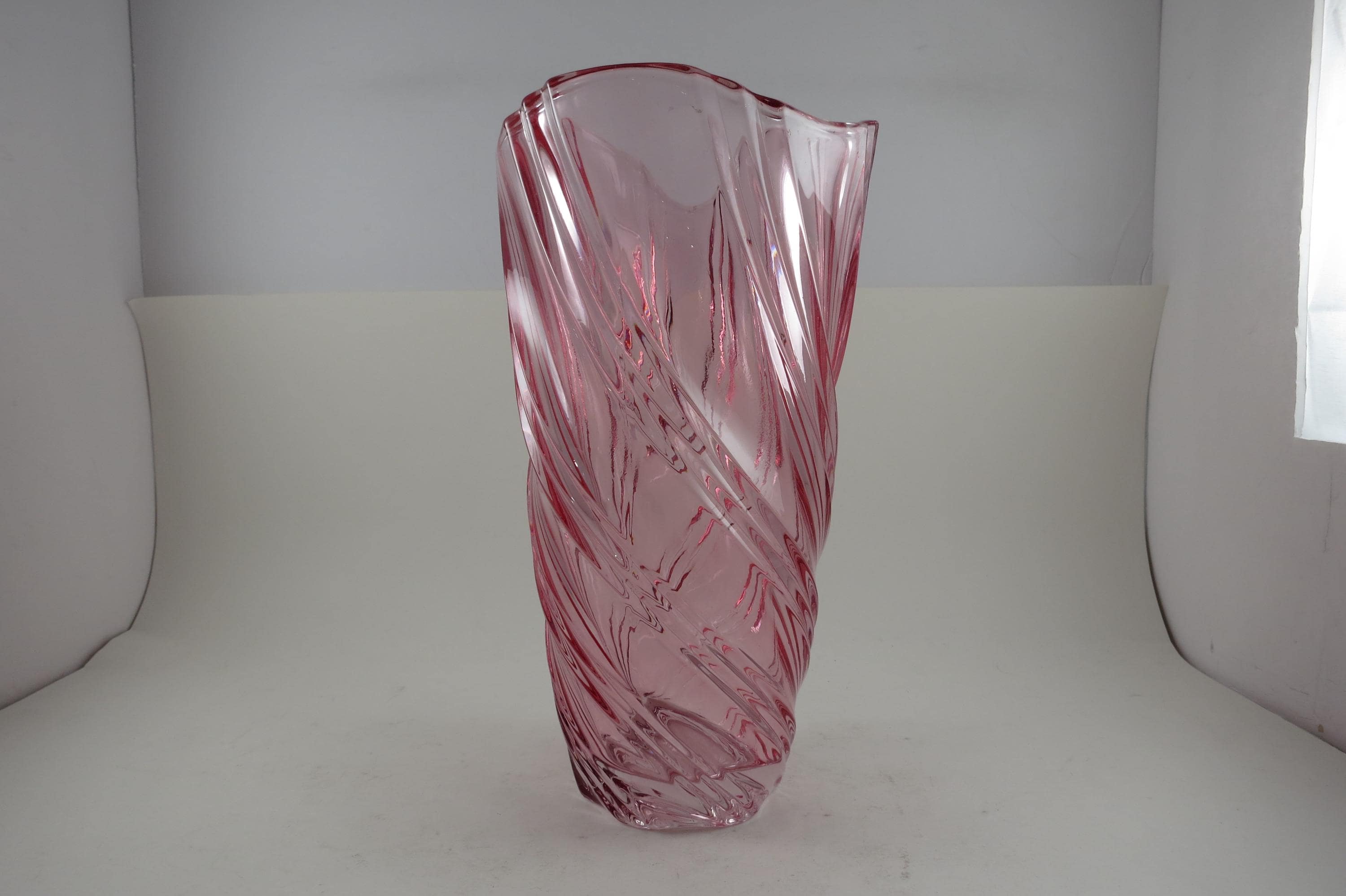 Vintage Pink Peppermint Swirl Heavy Twisted Art Glass Vase 9 1/4 Inches Tall.