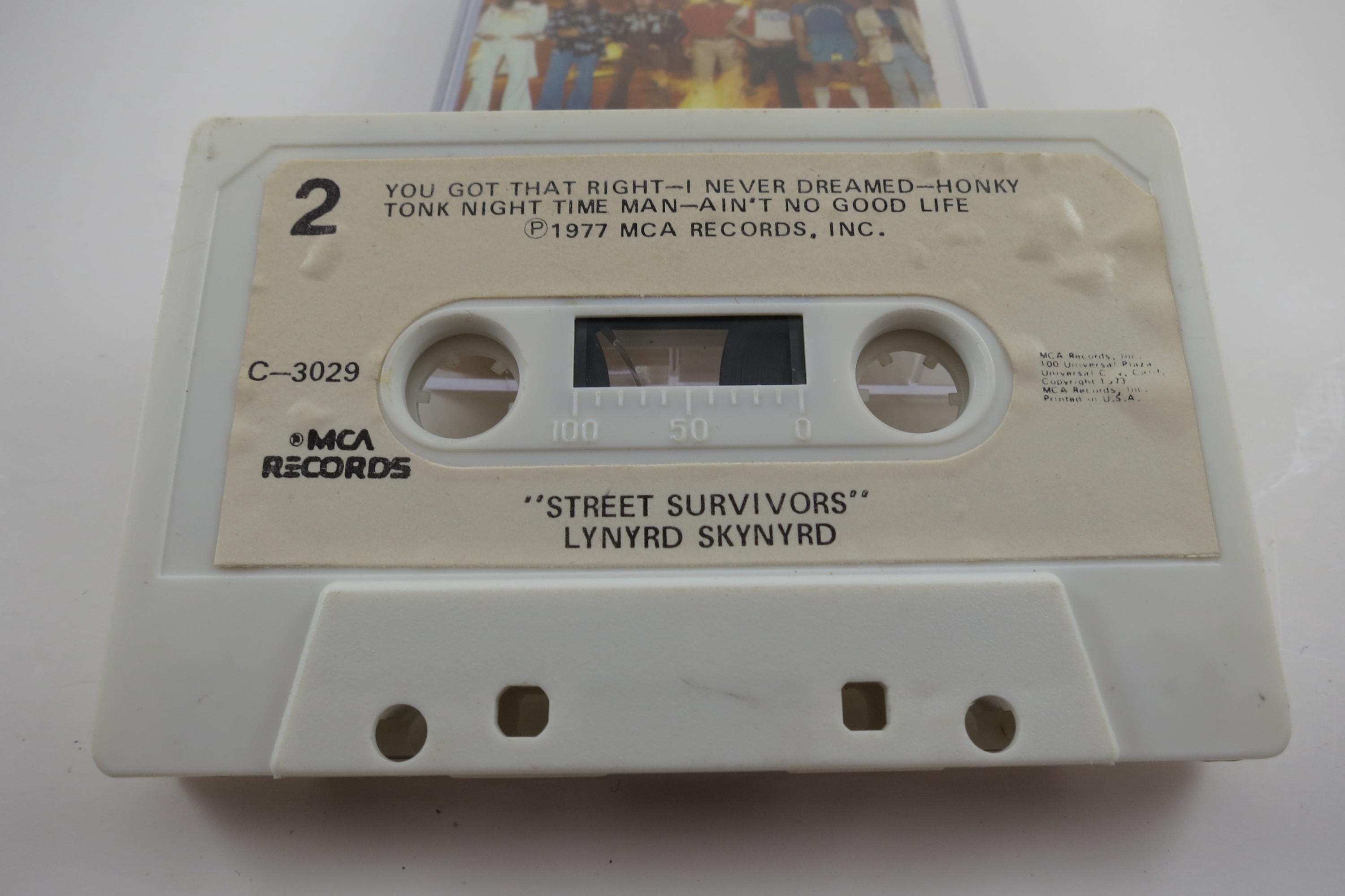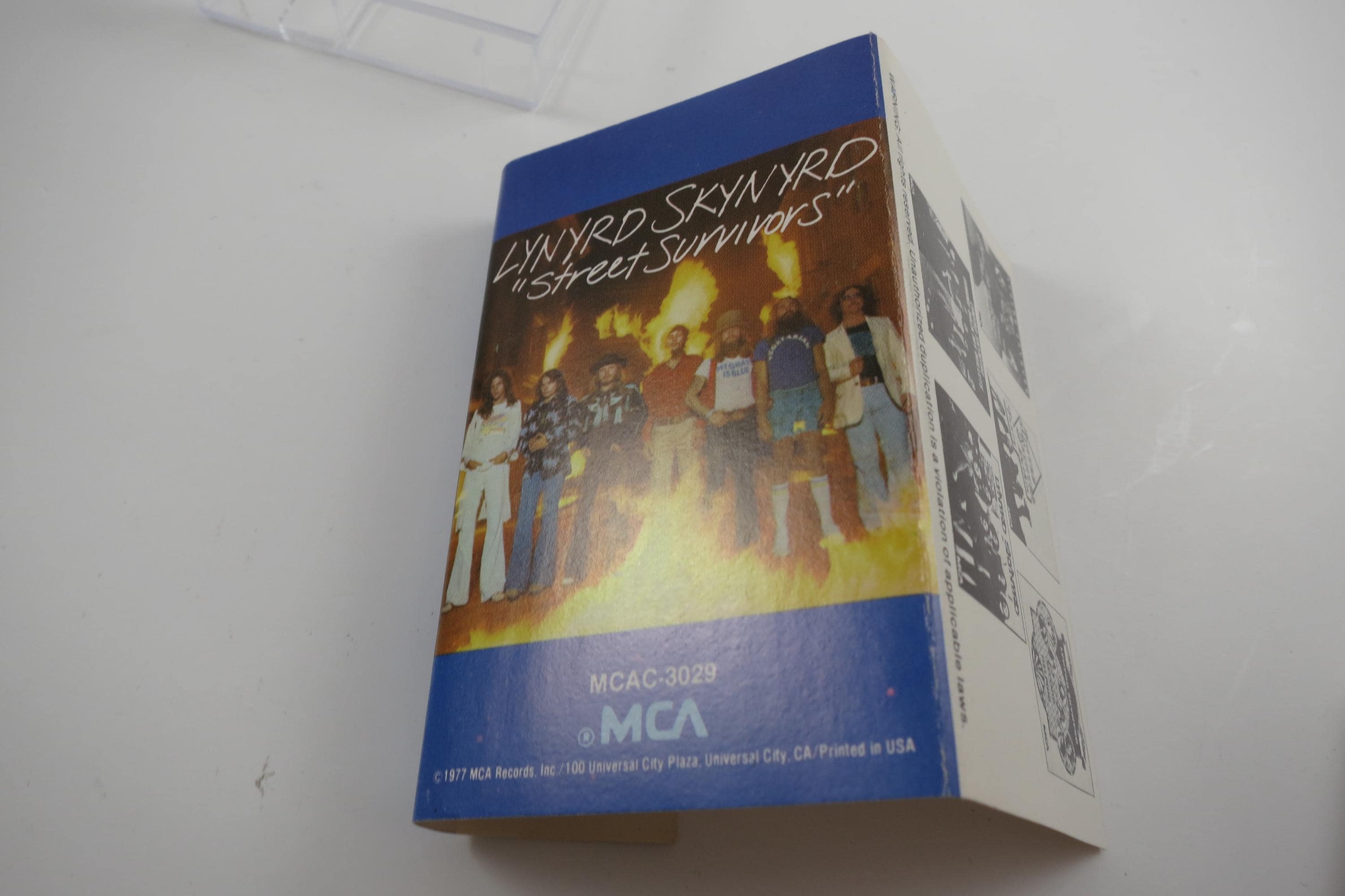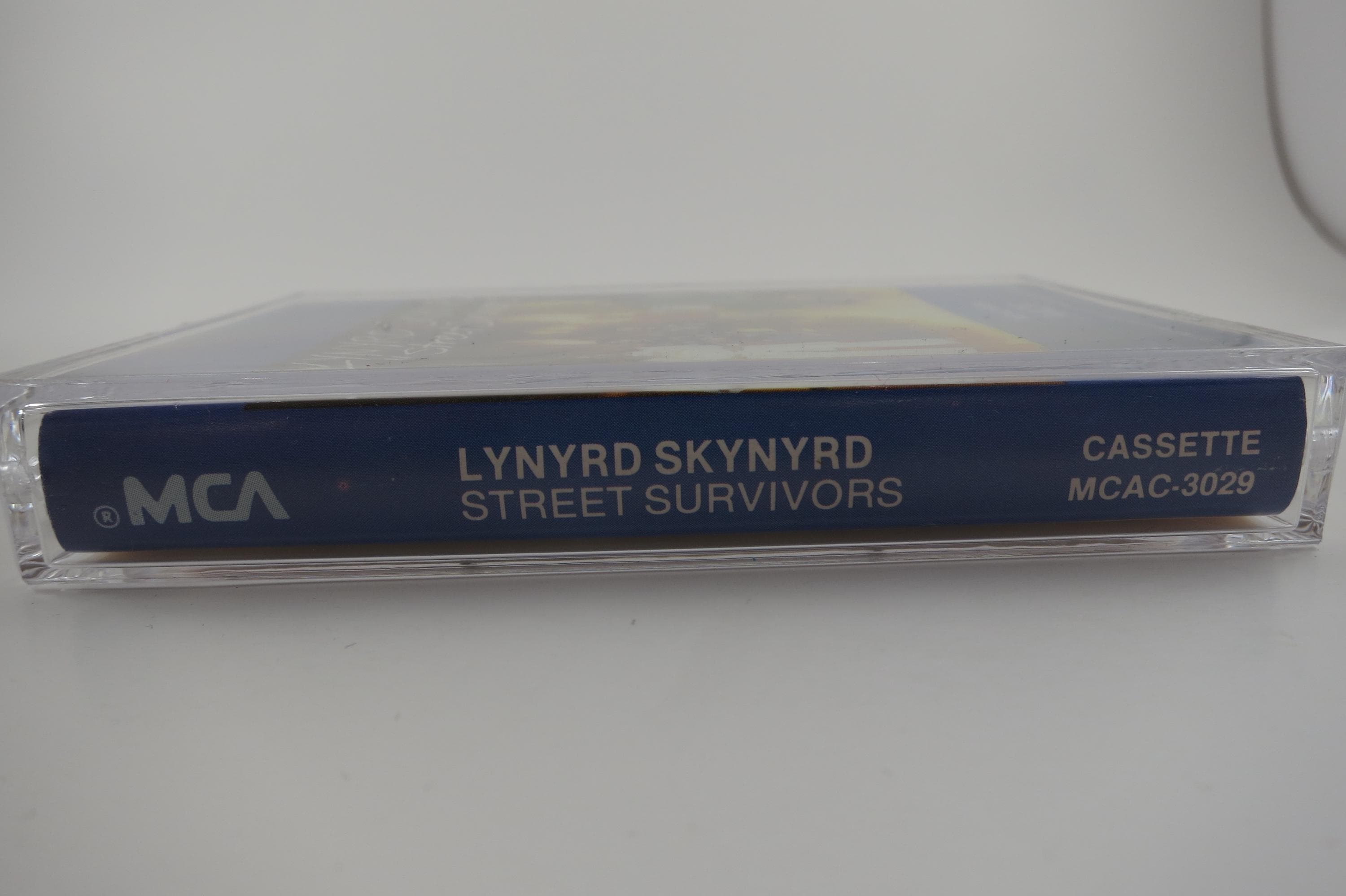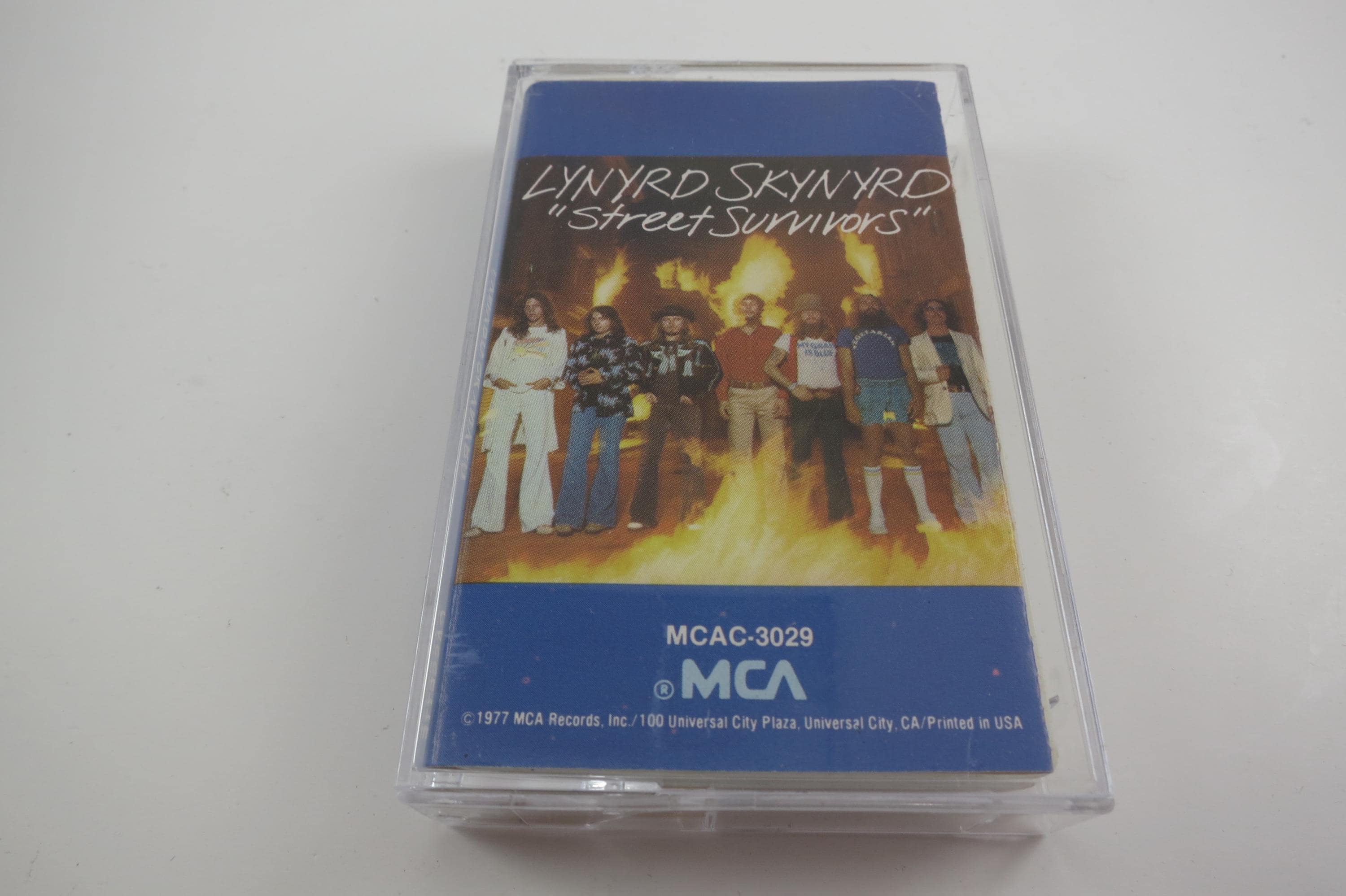 Vintage 1977 Lynyrd Skynyrd Cassette Tape Street Survivors Original Flames Cover. Exceptionally rare tape, as it was withdrawn after only a few days in production because of the plane crash. Almost all copies of this have the black cover. This tape is an original, and even features the paper labels on the cassette itself!