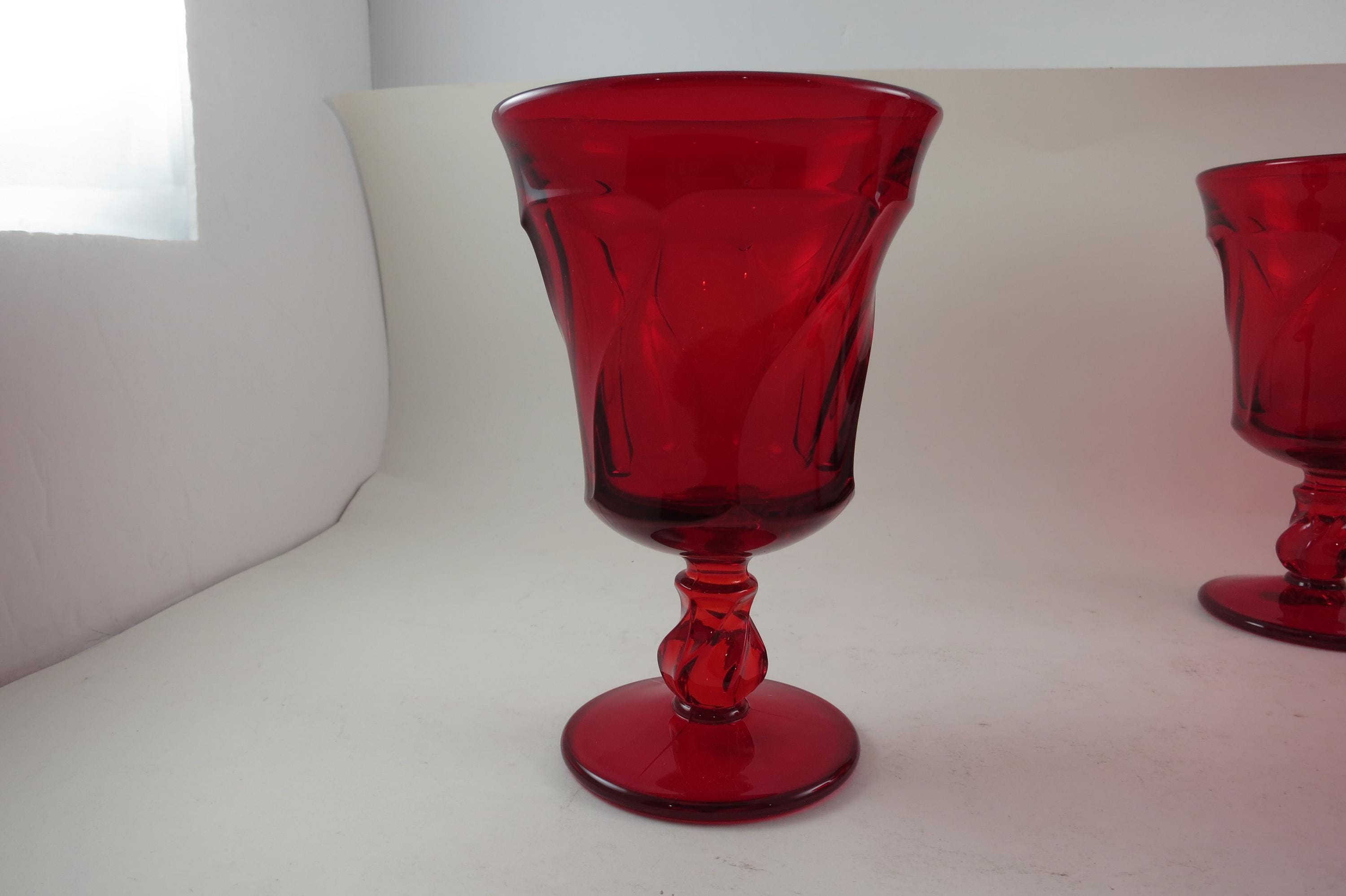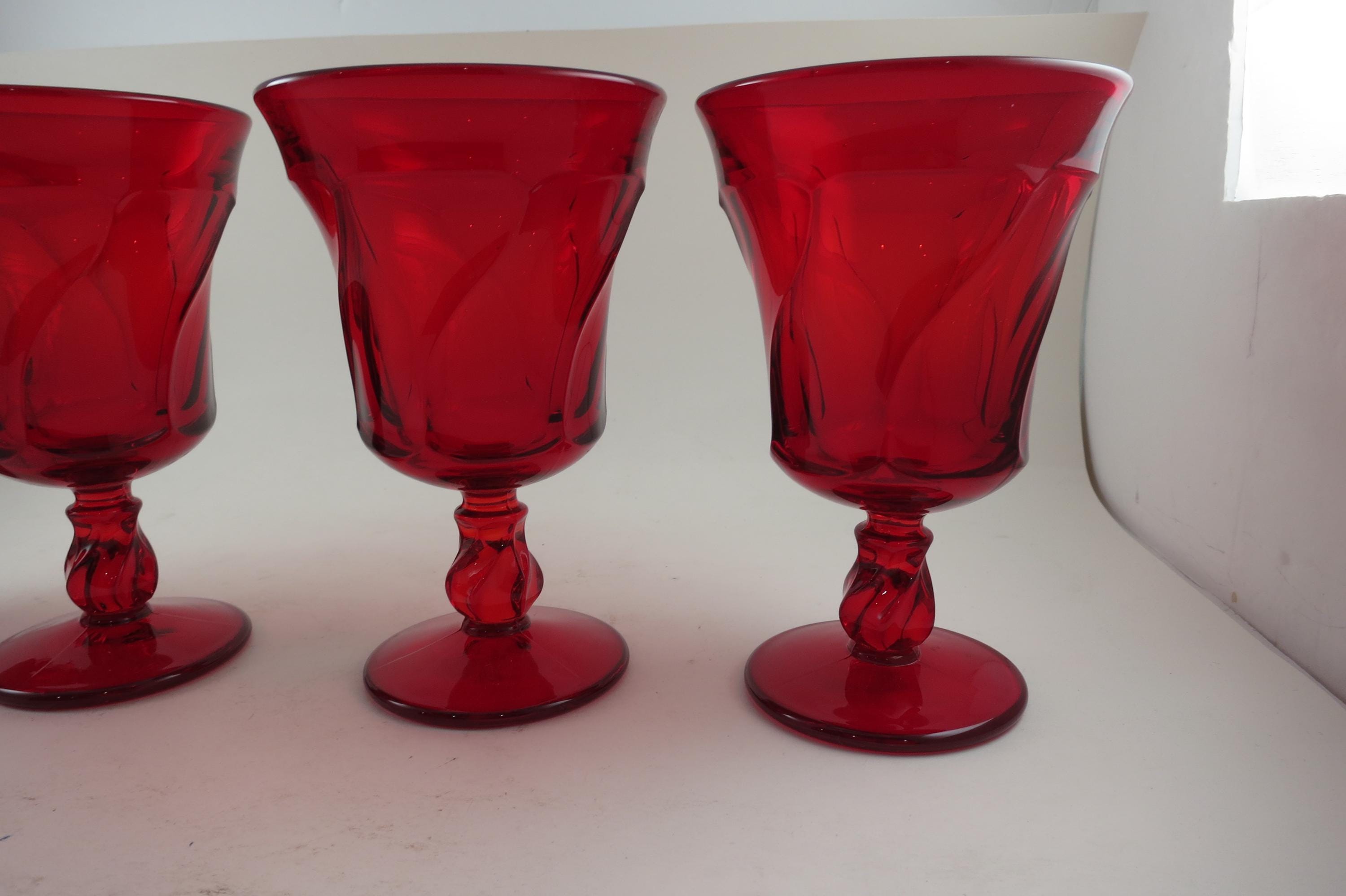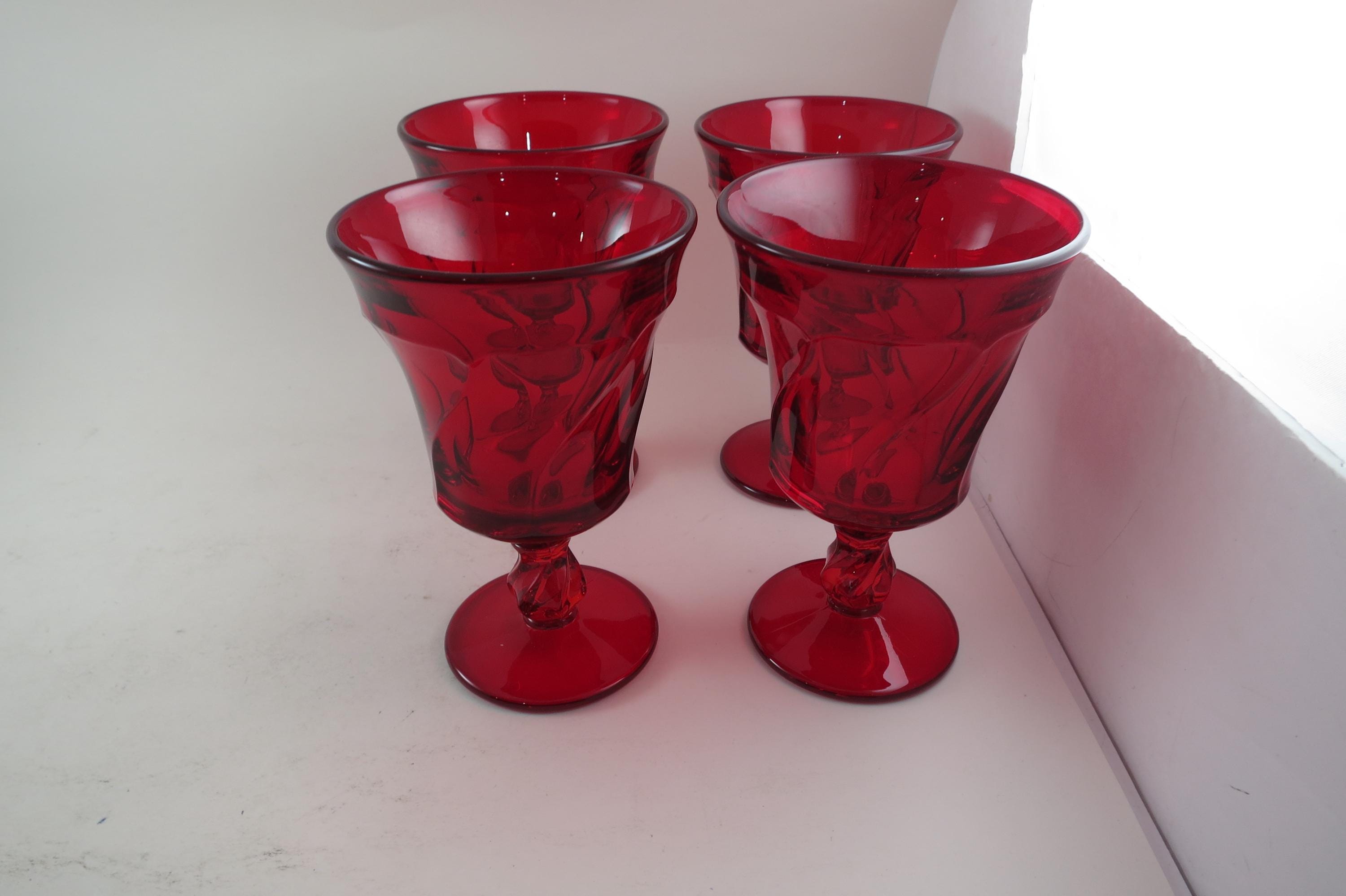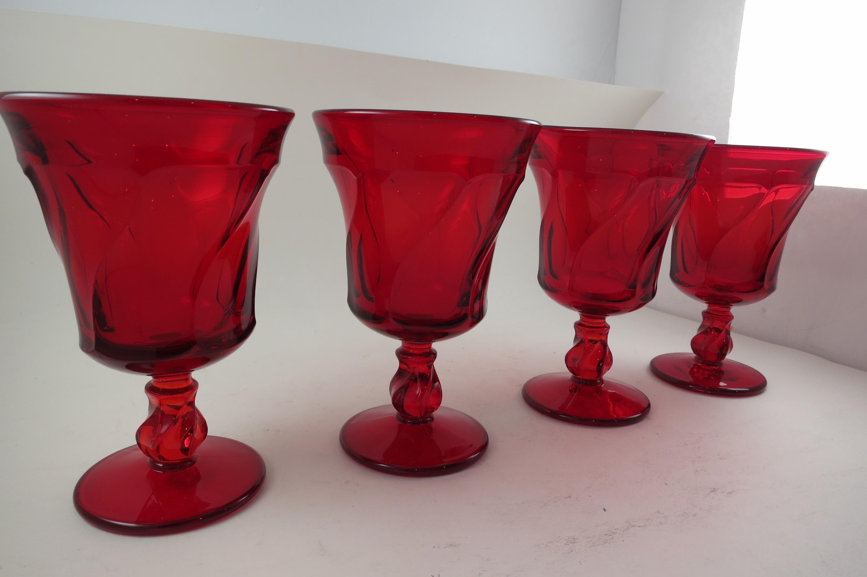 Set of Four Ruby Red Fostoria Jamestown Pedestal Water/Tea Glasses. All four are in excellent condition with no damages. Beautiful Ruby Red glass! Each measures 6 inches tall and 3 3/4 inches wide at the rim.