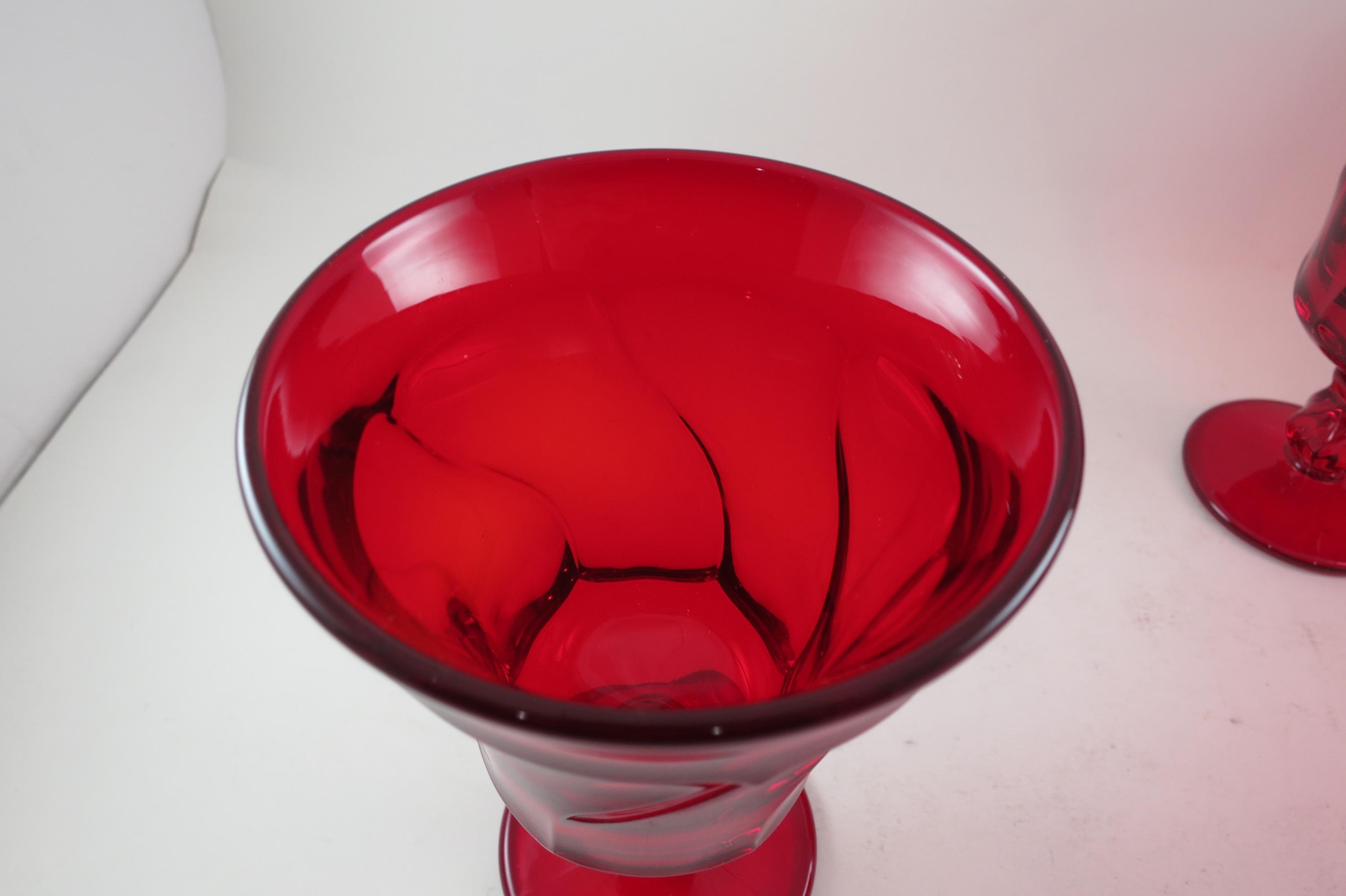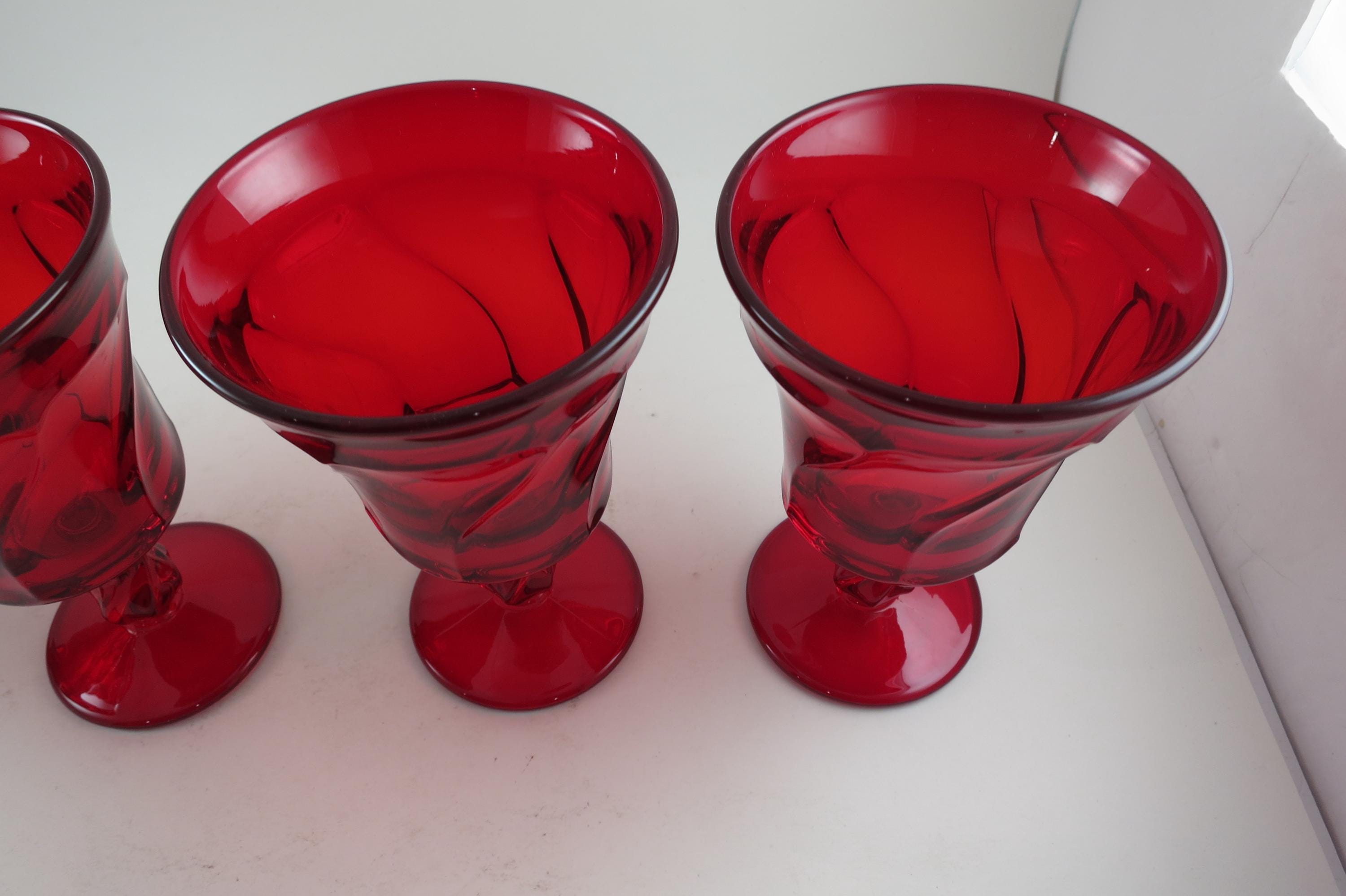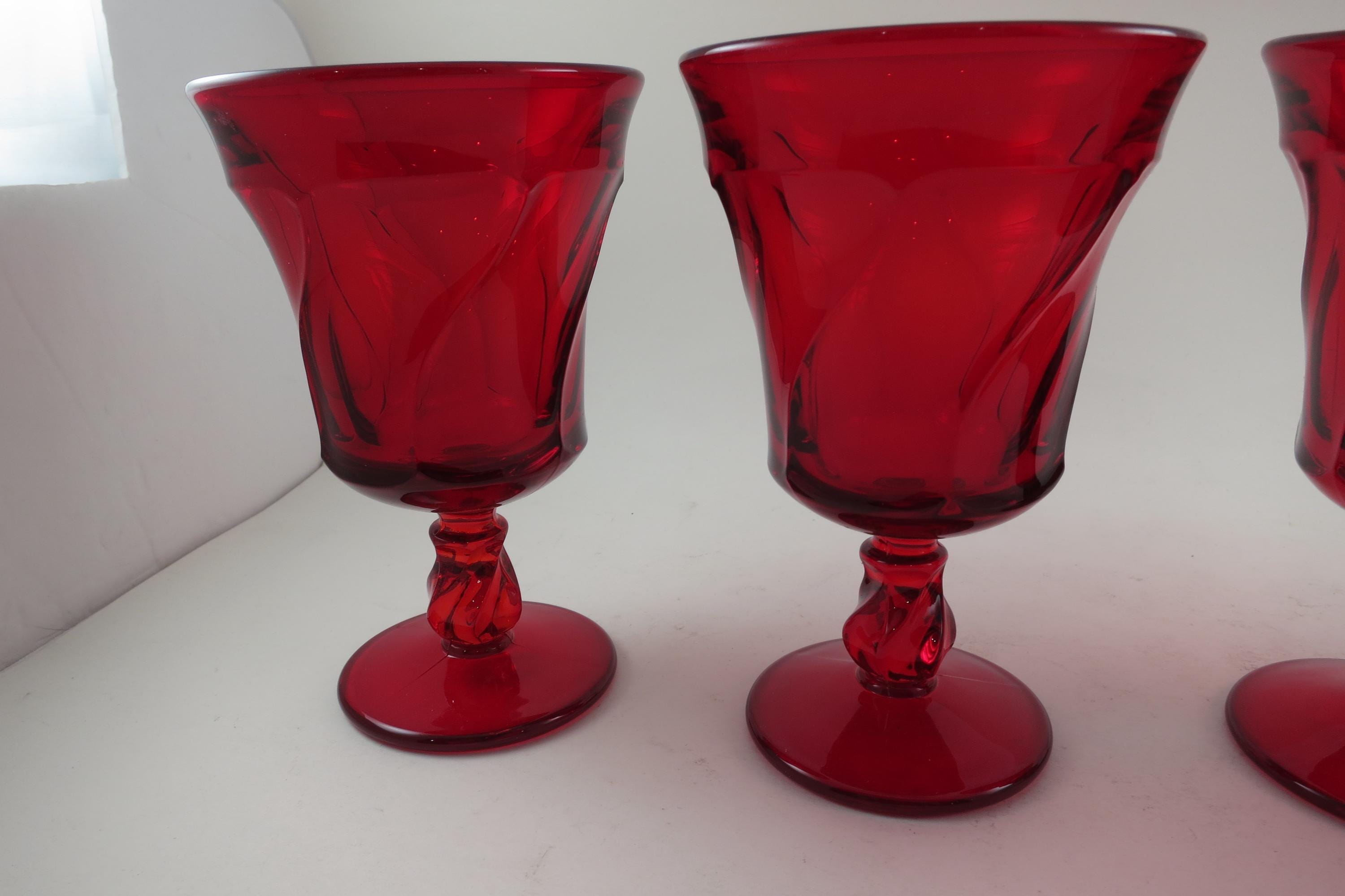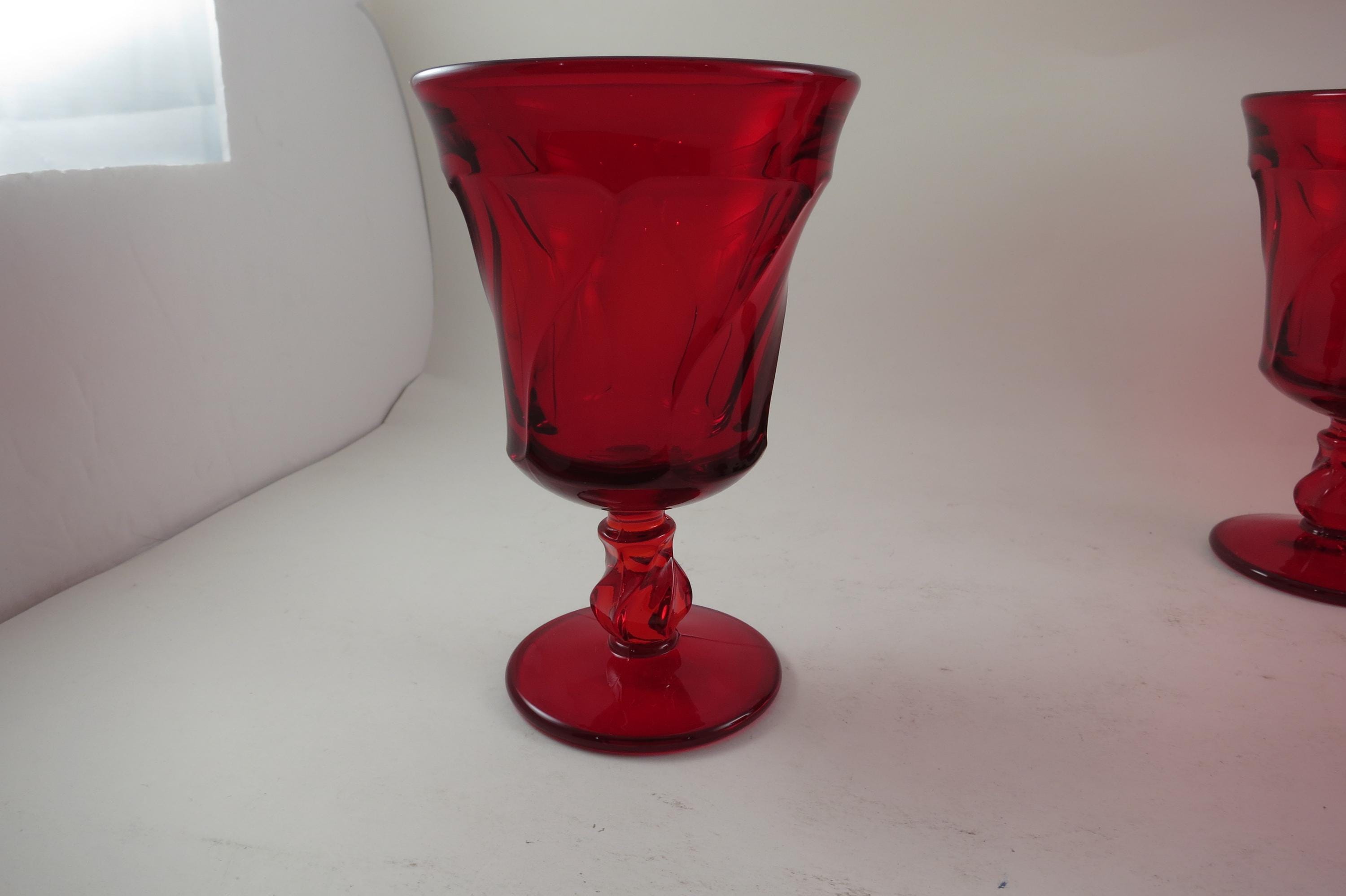 Set of Four Ruby Red Fostoria Jamestown Pedestal Water/Tea Glasses. All four are in excellent condition with no damages. Beautiful Ruby Red glass! Each measures 6 inches tall and 3 3/4 inches wide at the rim.