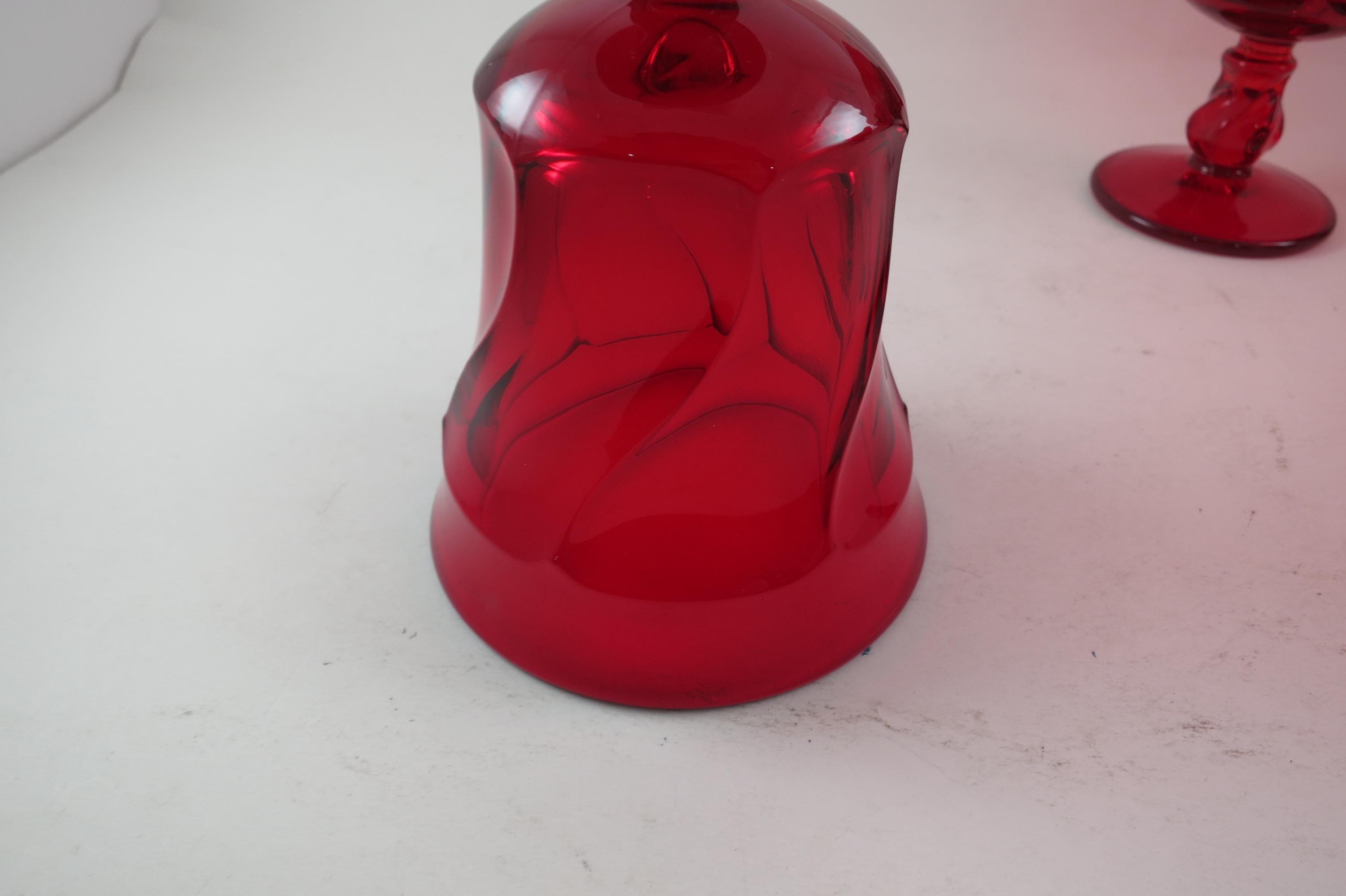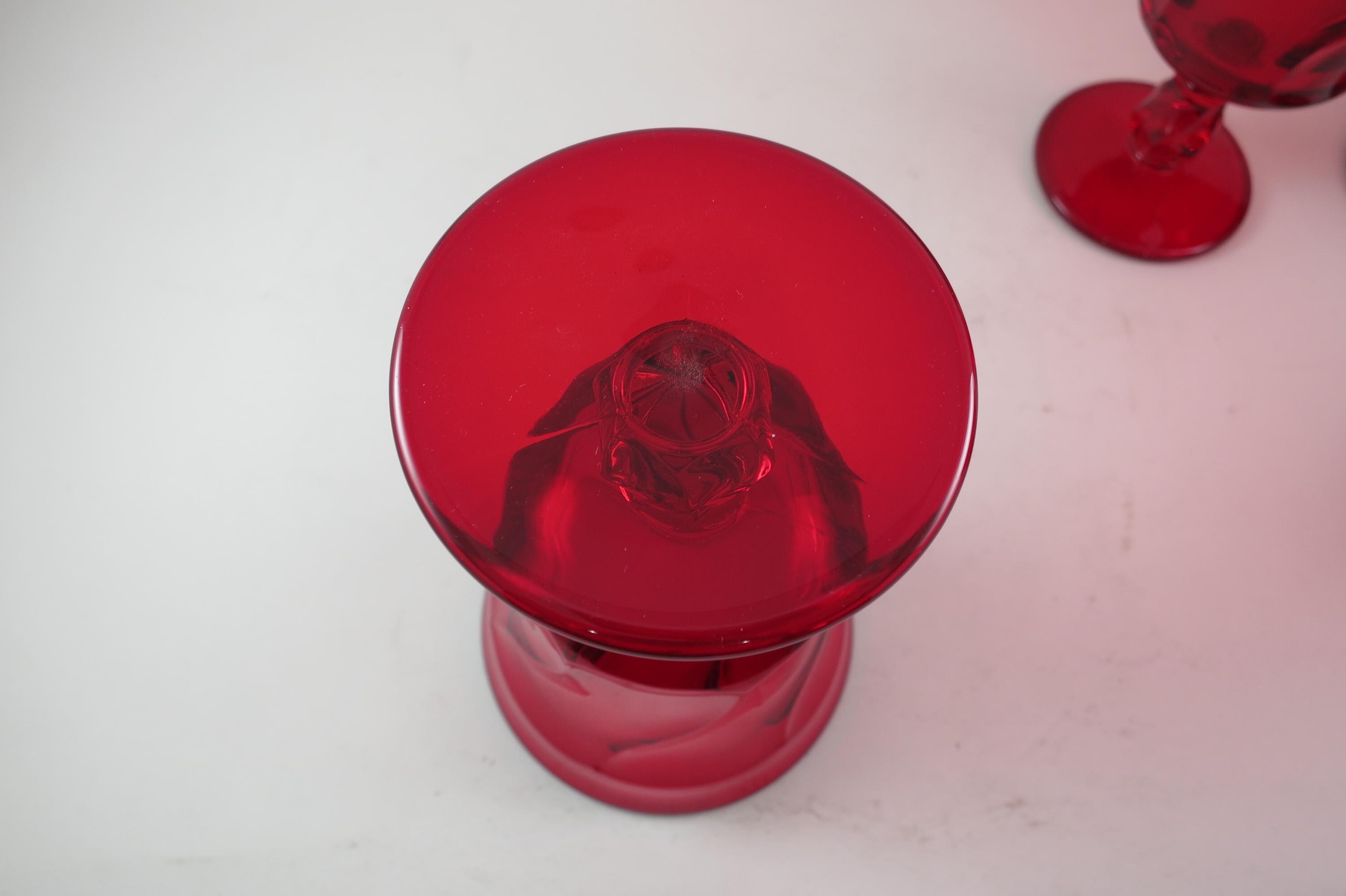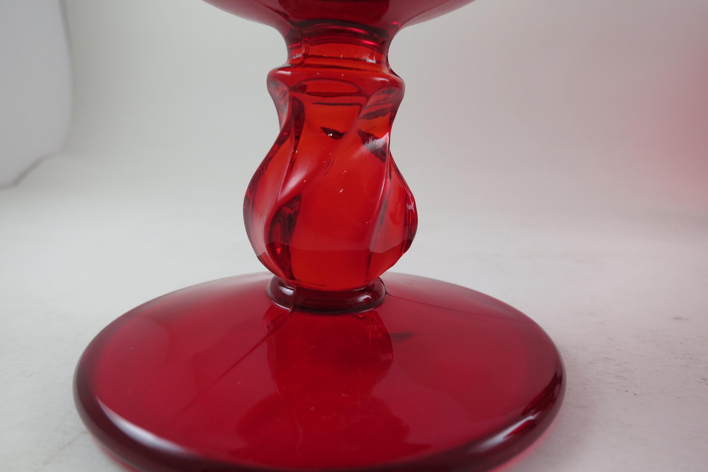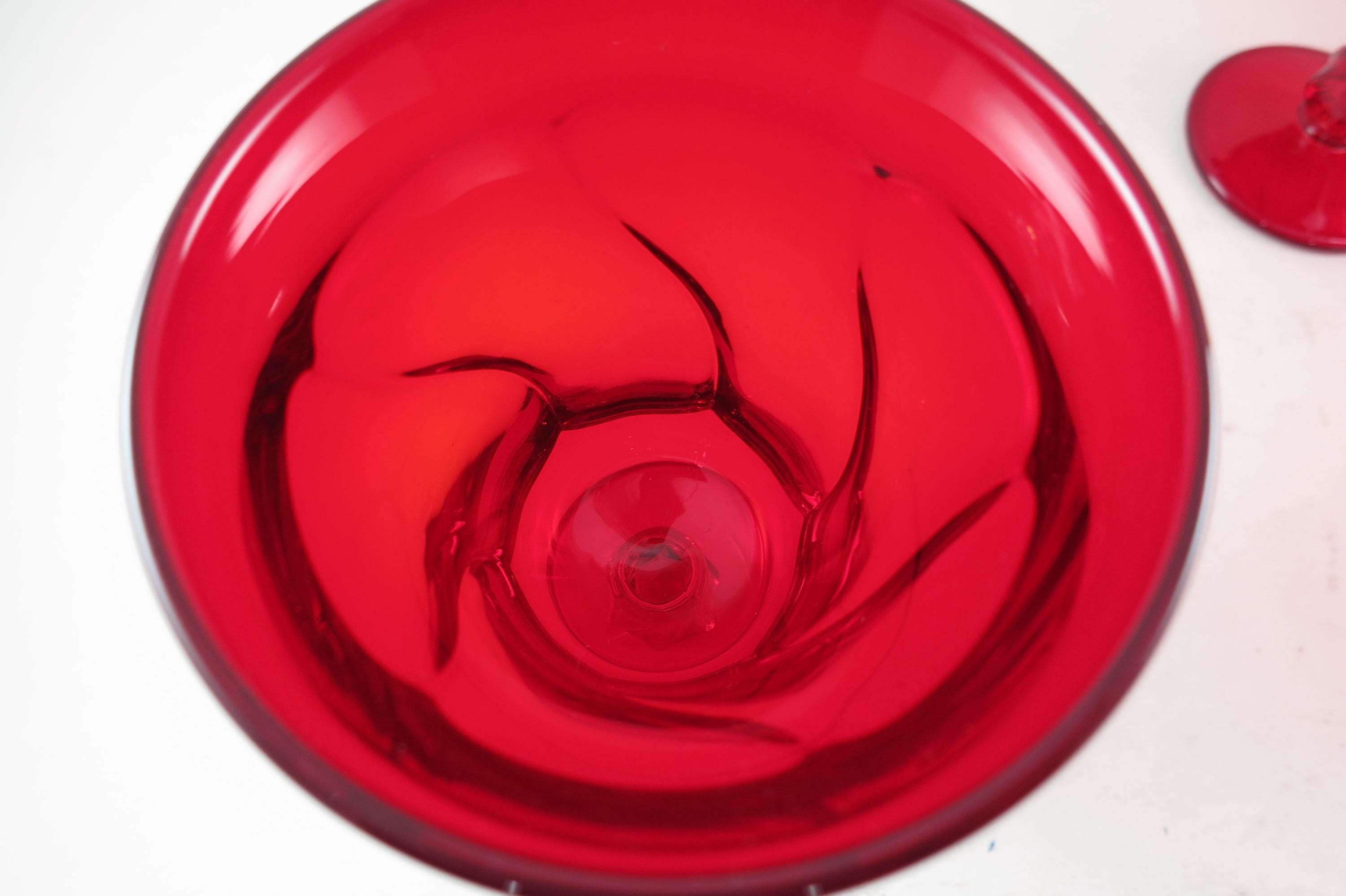 Set of Four Ruby Red Fostoria Jamestown Pedestal Water/Tea Glasses. All four are in excellent condition with no damages. Beautiful Ruby Red glass! Each measures 6 inches tall and 3 3/4 inches wide at the rim.