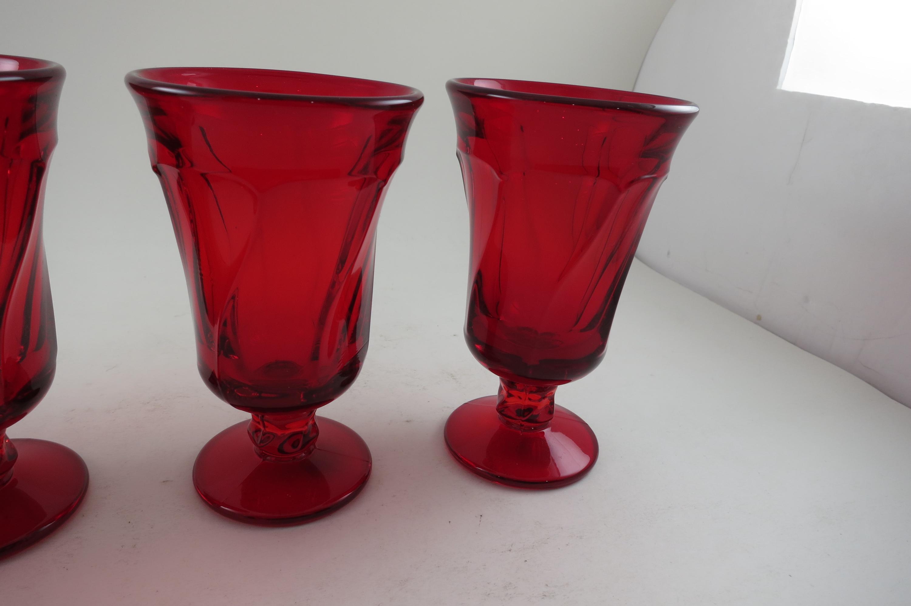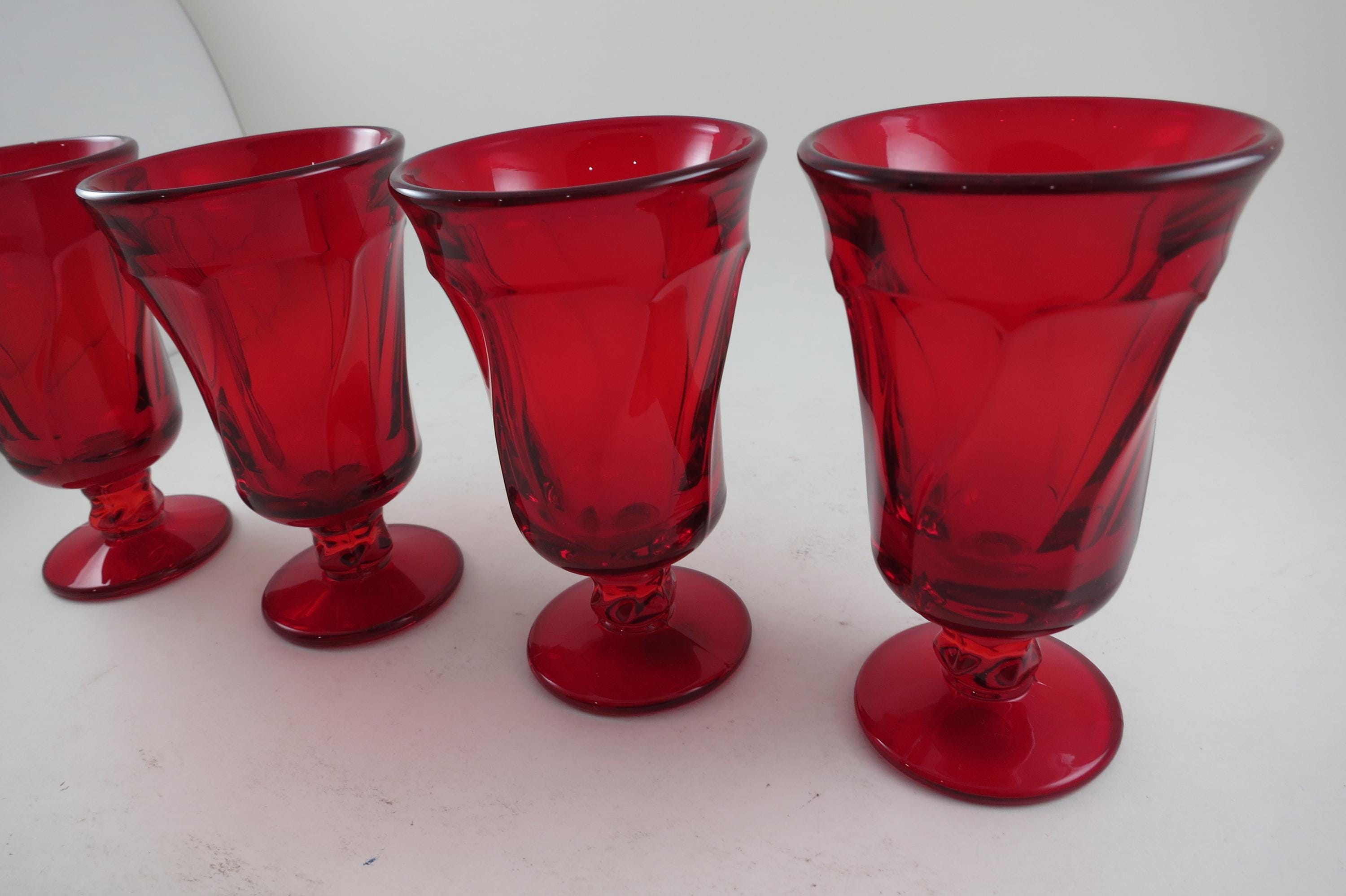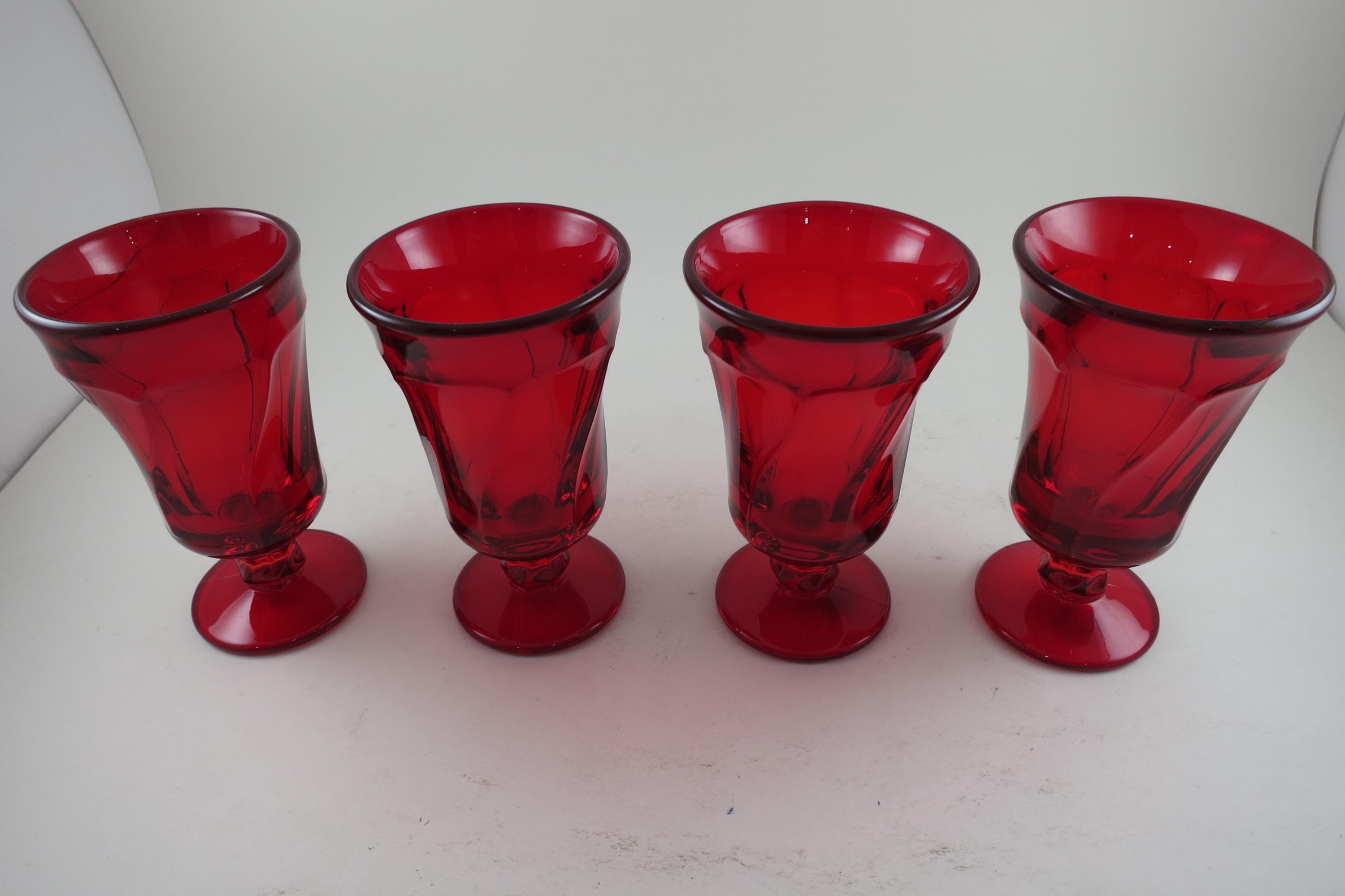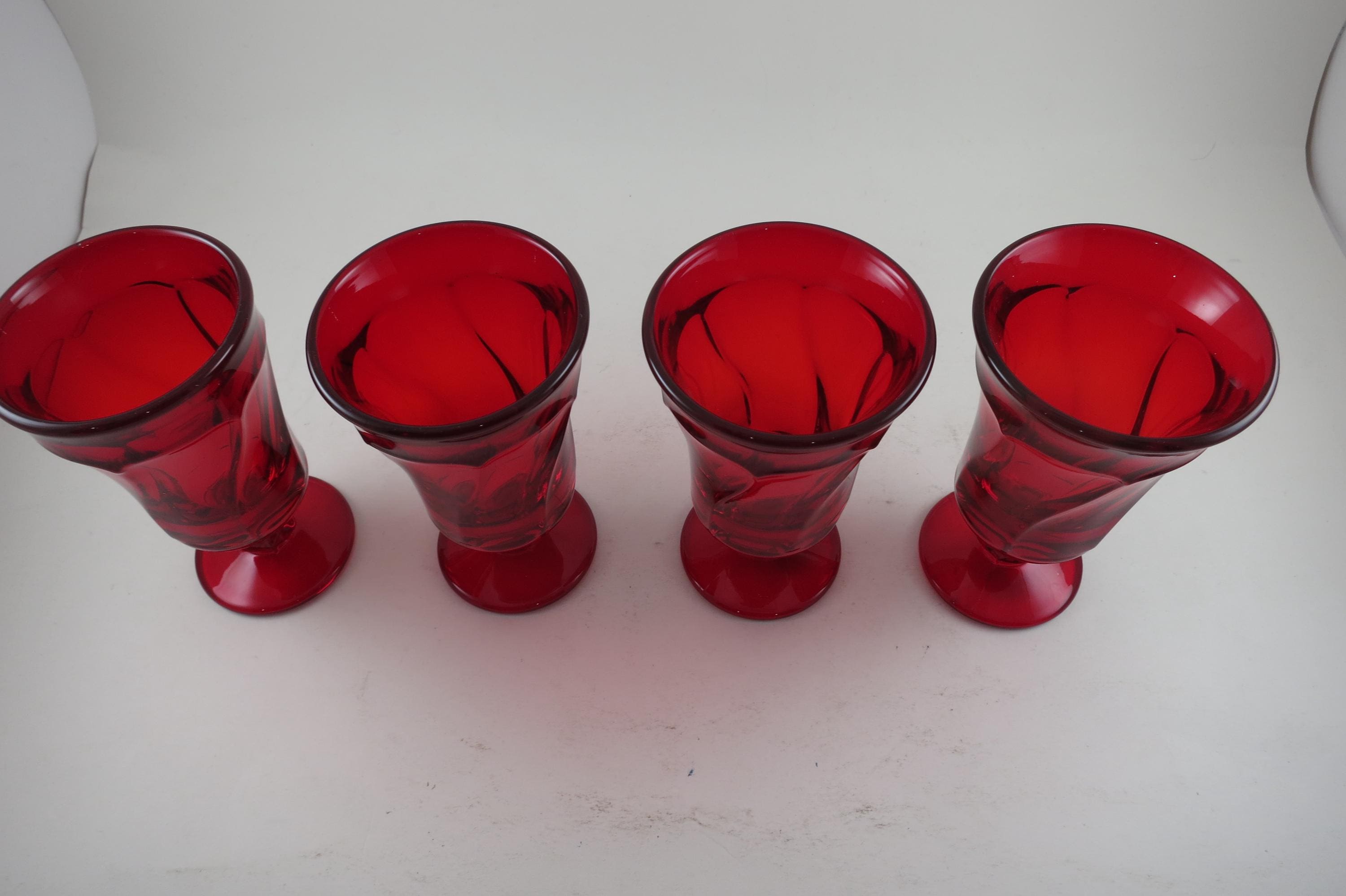 Set of Four Ruby Red Fostoria Jamestown Juice Glasses. All four are in excellent condition with no damages. Beautiful Ruby Red glass! Each measures 4 3/4 inches tall and 2 3/4 inches wide at the rim.