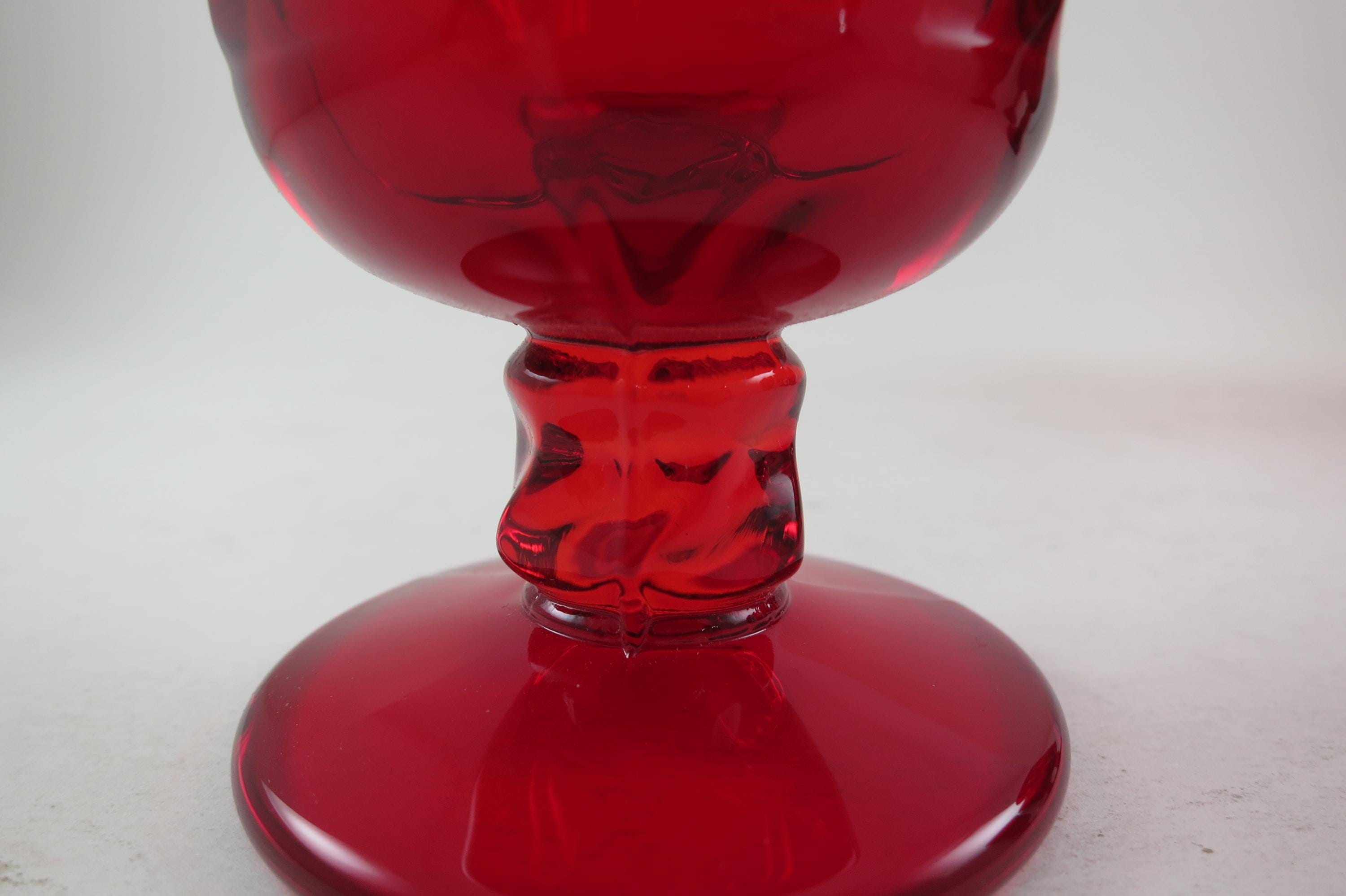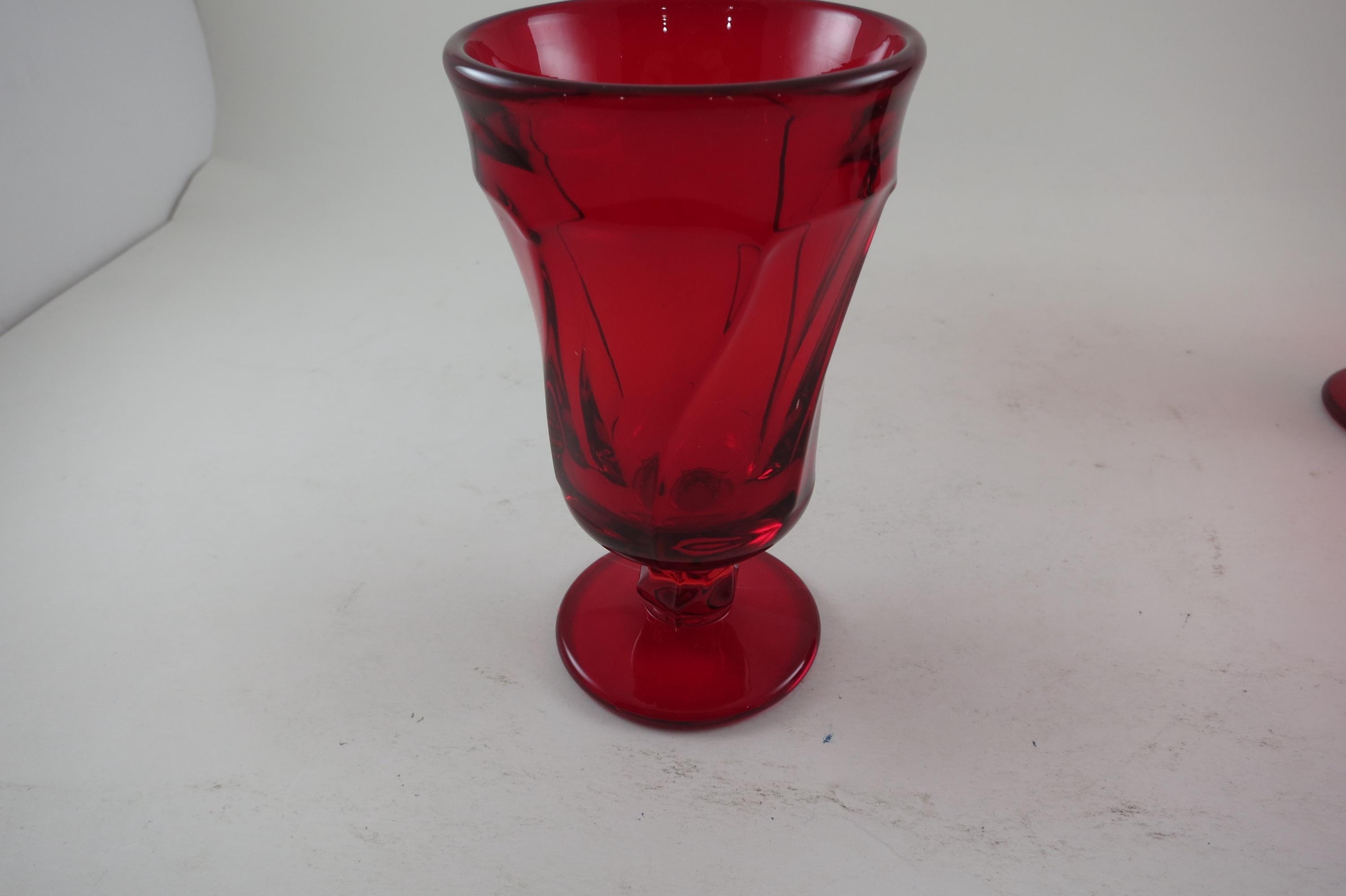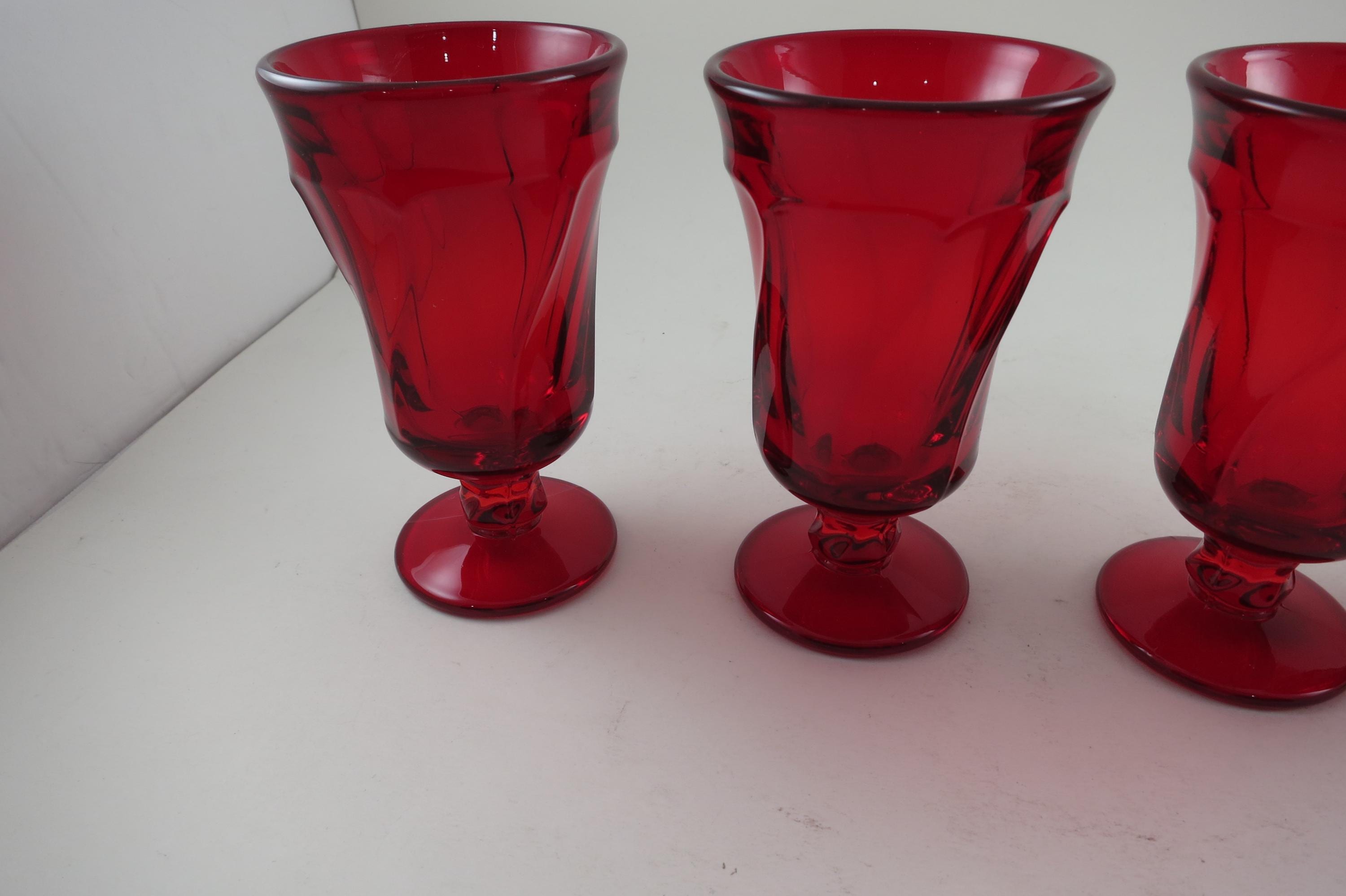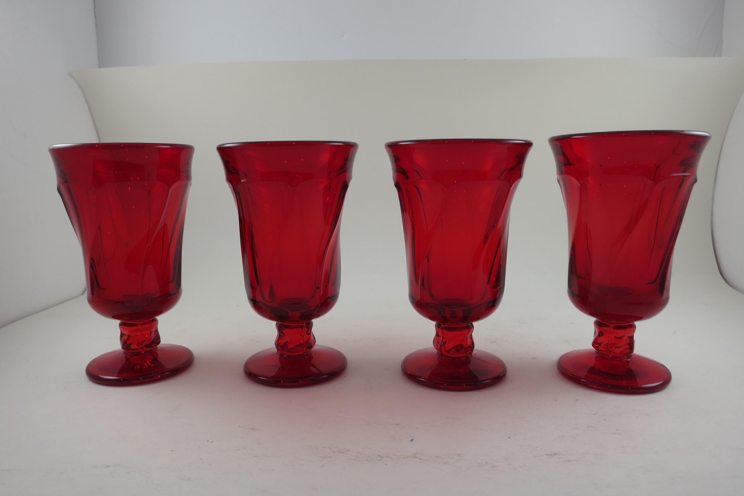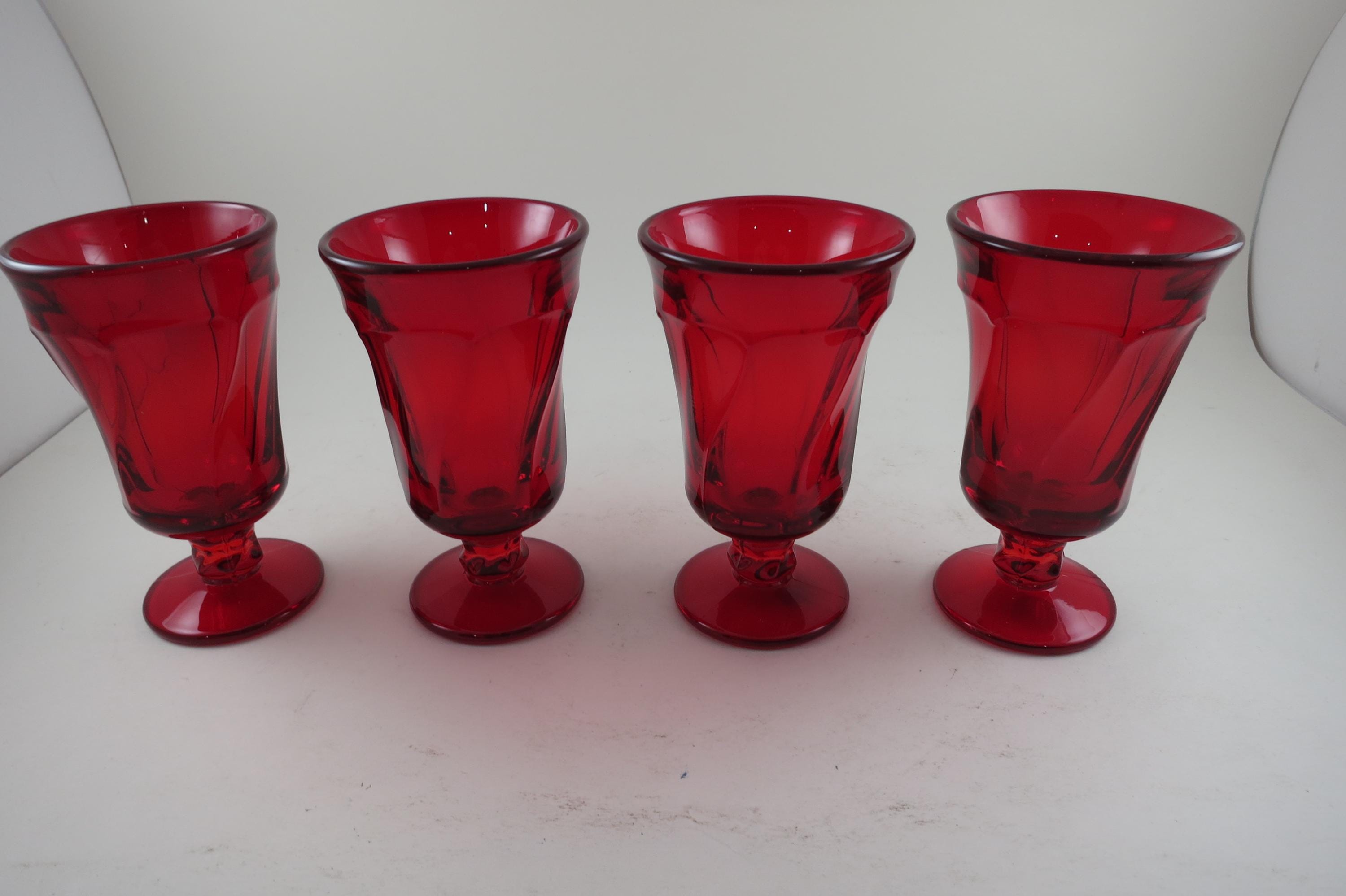 Set of Four Ruby Red Fostoria Jamestown Juice Glasses. All four are in excellent condition with no damages. Beautiful Ruby Red glass! Each measures 4 3/4 inches tall and 2 3/4 inches wide at the rim.