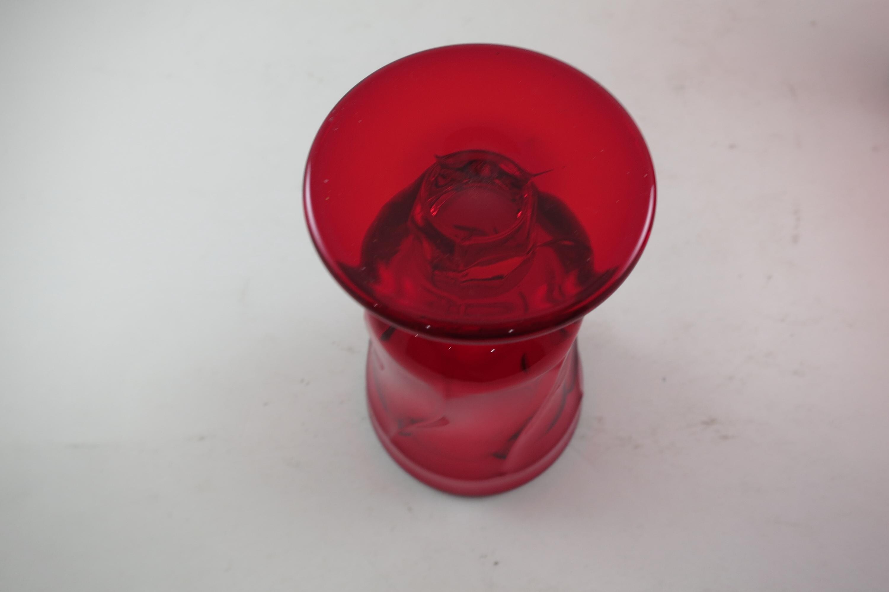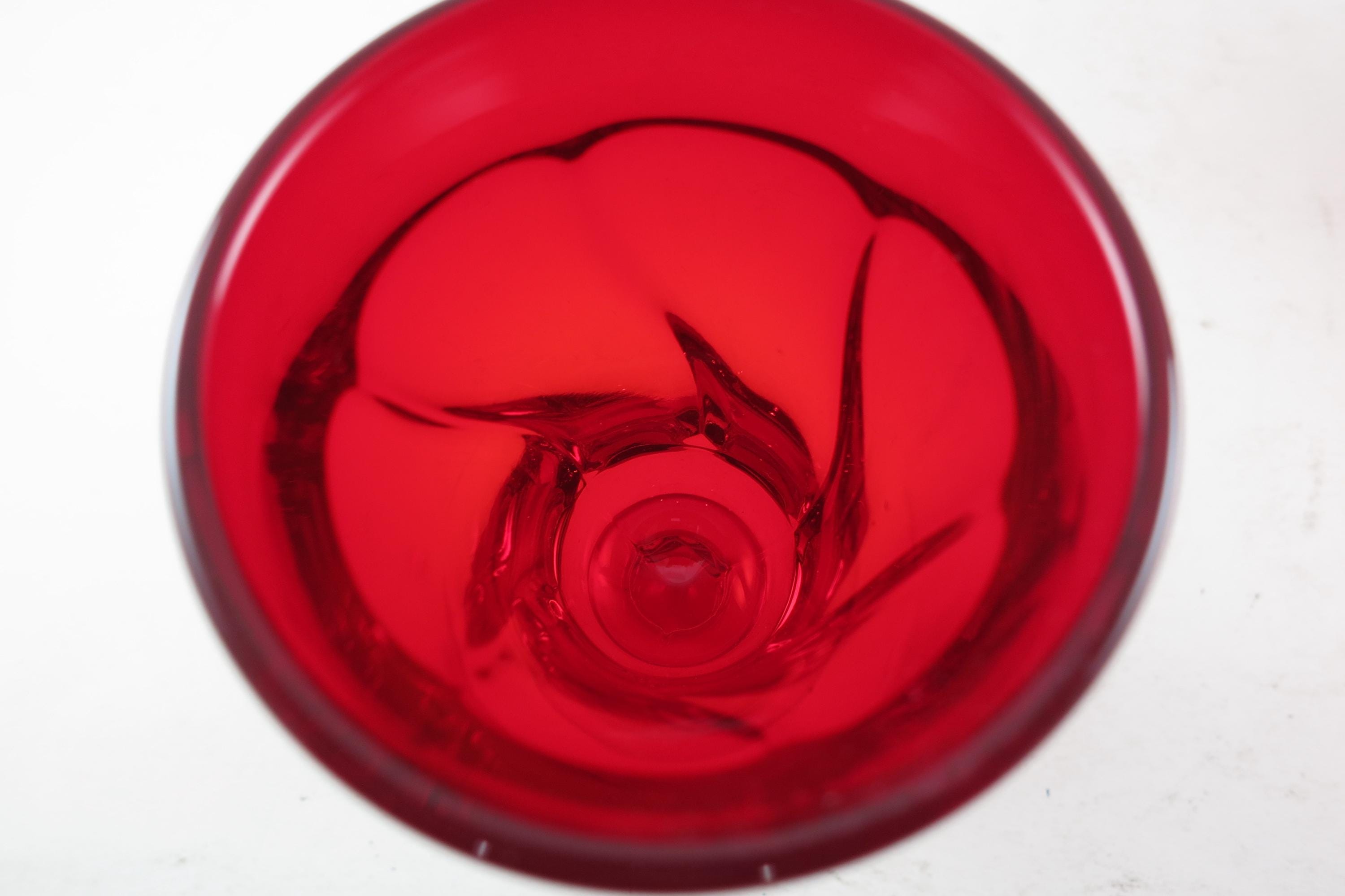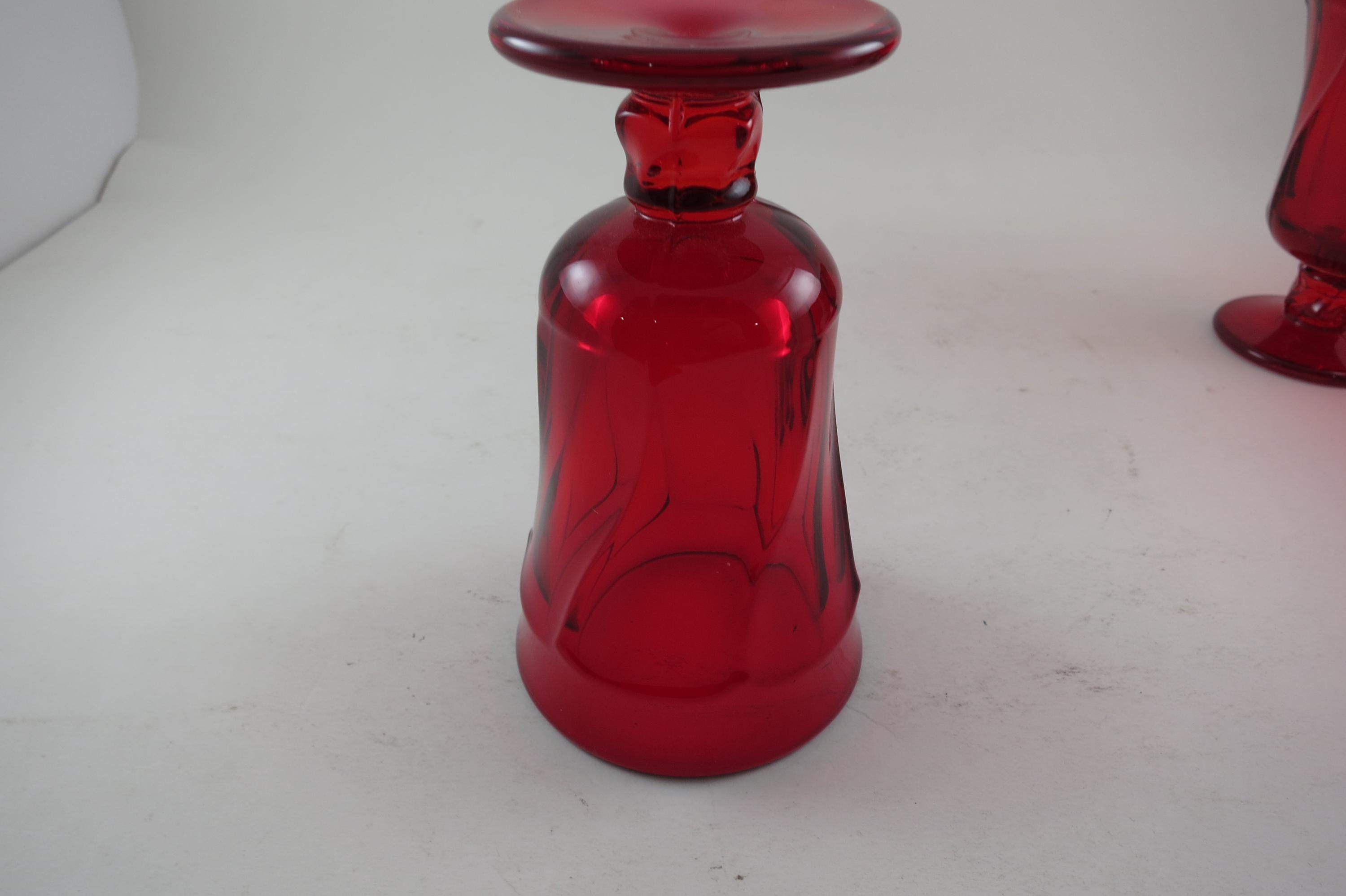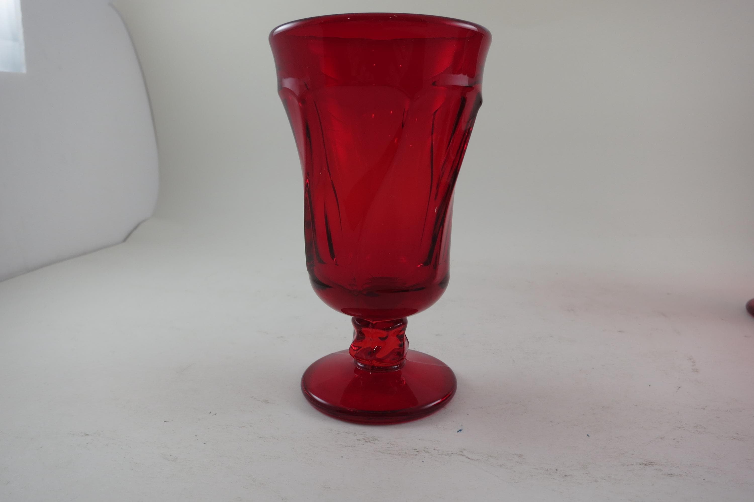 Set of Four Ruby Red Fostoria Jamestown Juice Glasses. All four are in excellent condition with no damages. Beautiful Ruby Red glass! Each measures 4 3/4 inches tall and 2 3/4 inches wide at the rim.