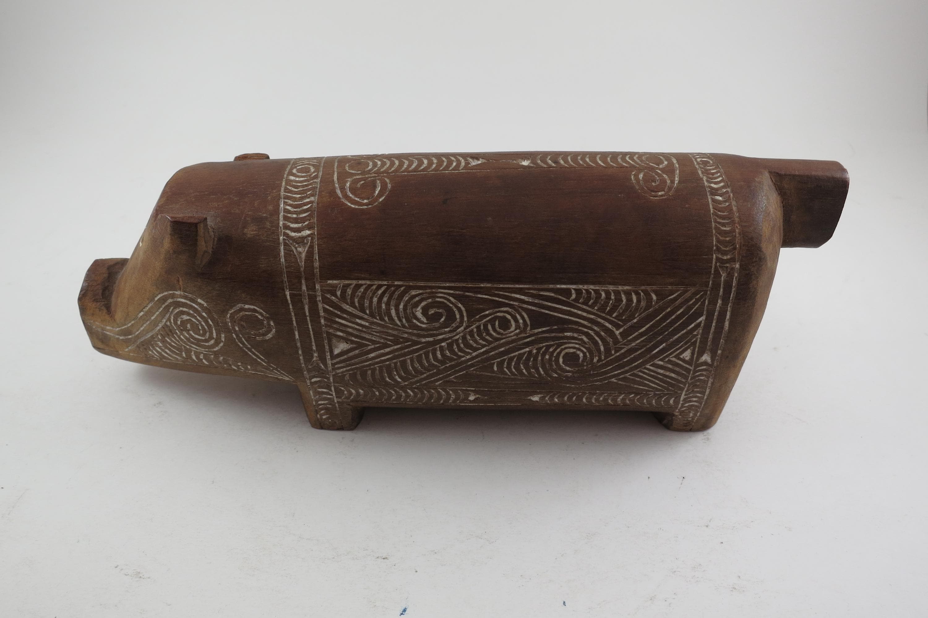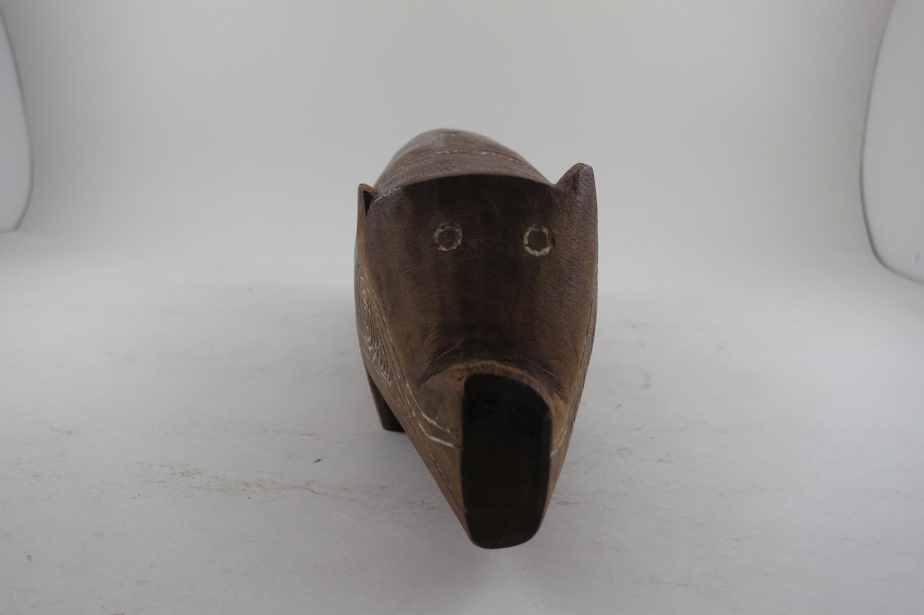 Solid wood pig, hand carved, small wood chip on the ear. Measures 8 1/2 inches long and 3 inches tall.