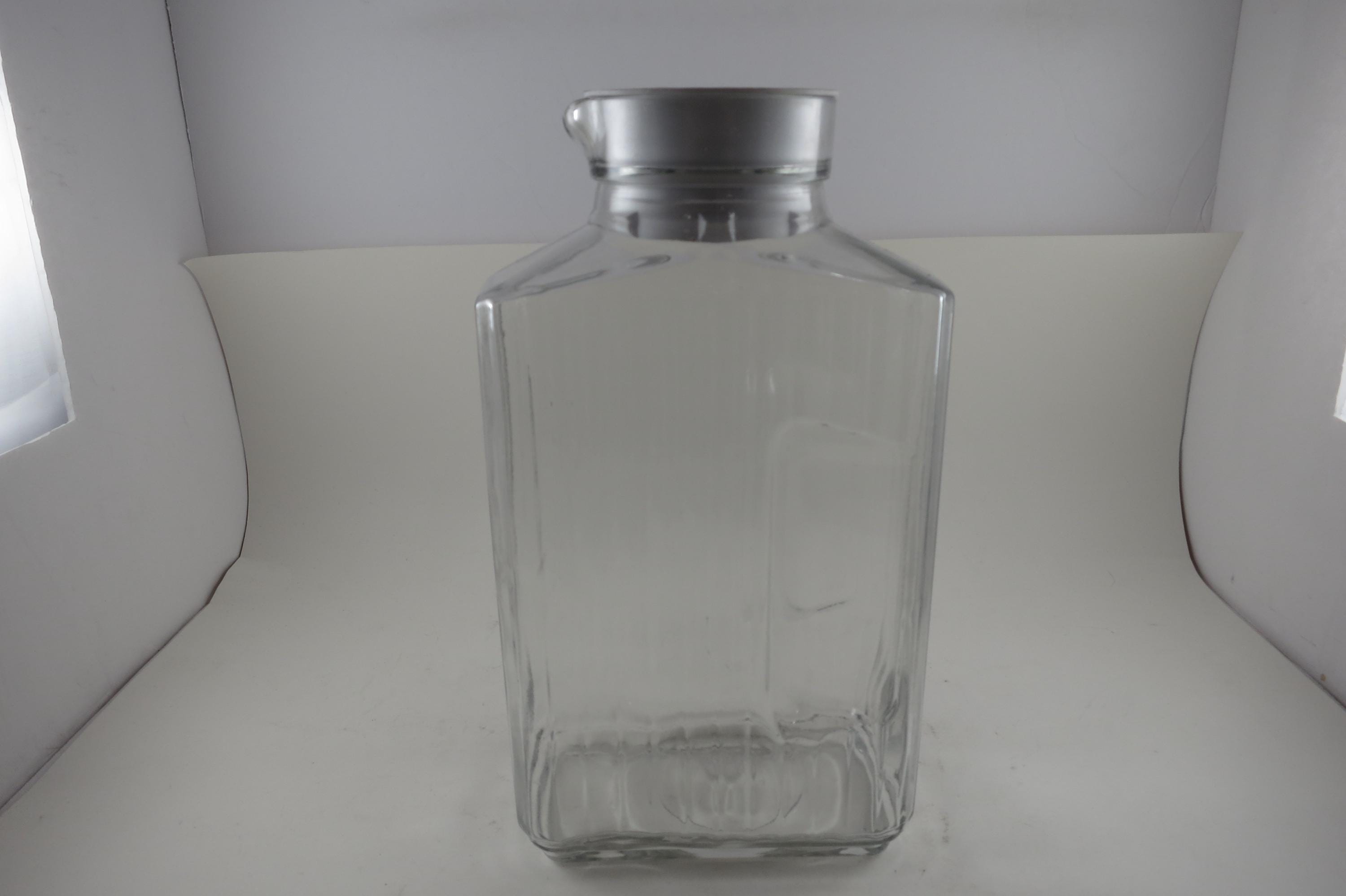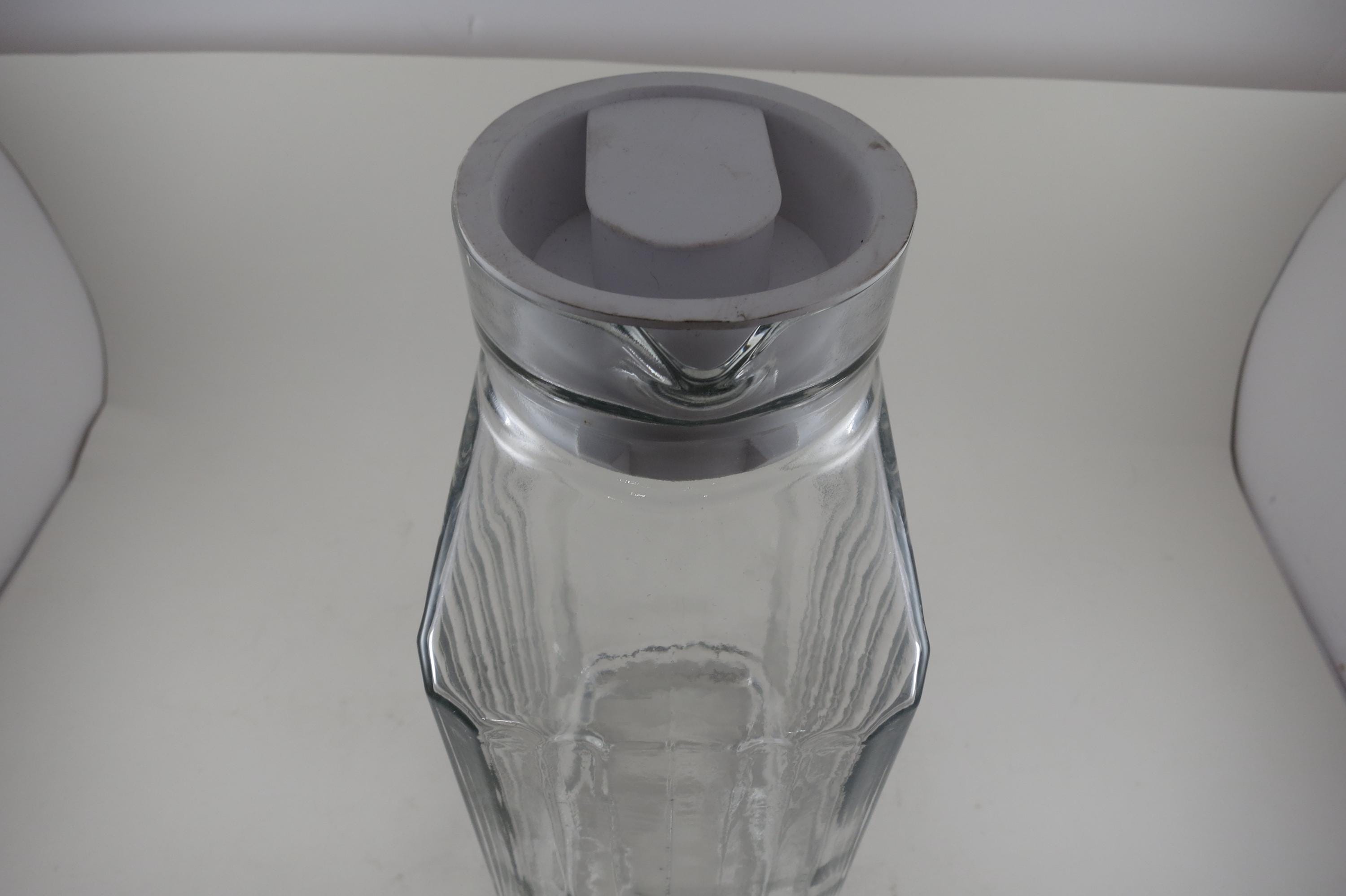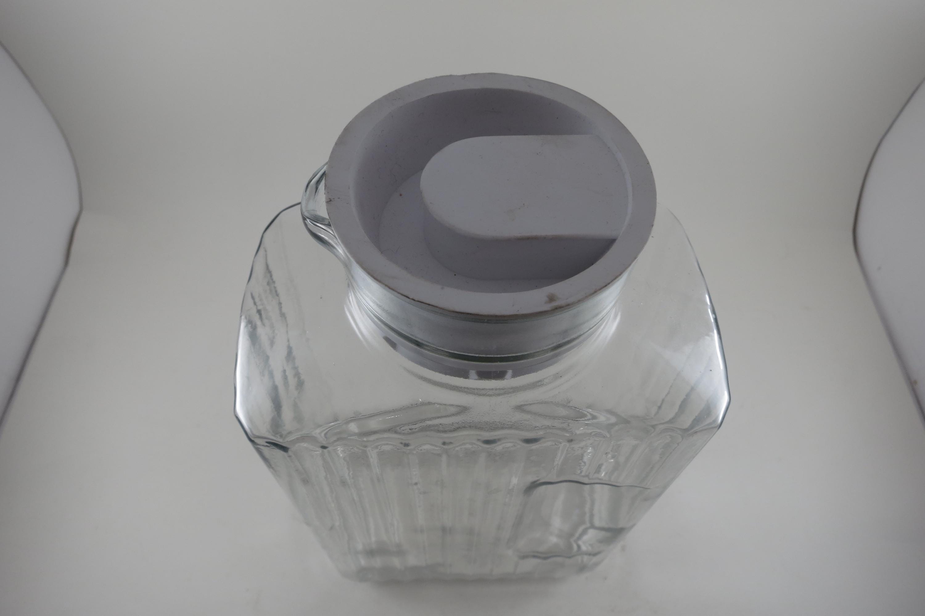 Vintage Anchor Hocking Ribbed Glass Juice/Water Jar with Original White Lid 2 Liter Excellent Original Condition. Measures 10 1/2 Inches Tall and 5 1/2 inches wide. Excellent Condition with No chips, cracks or damages.