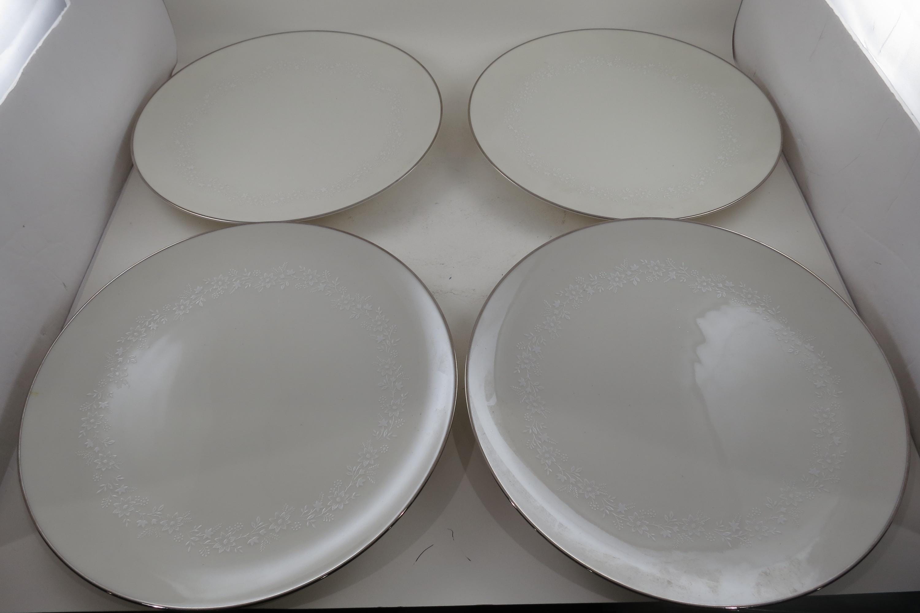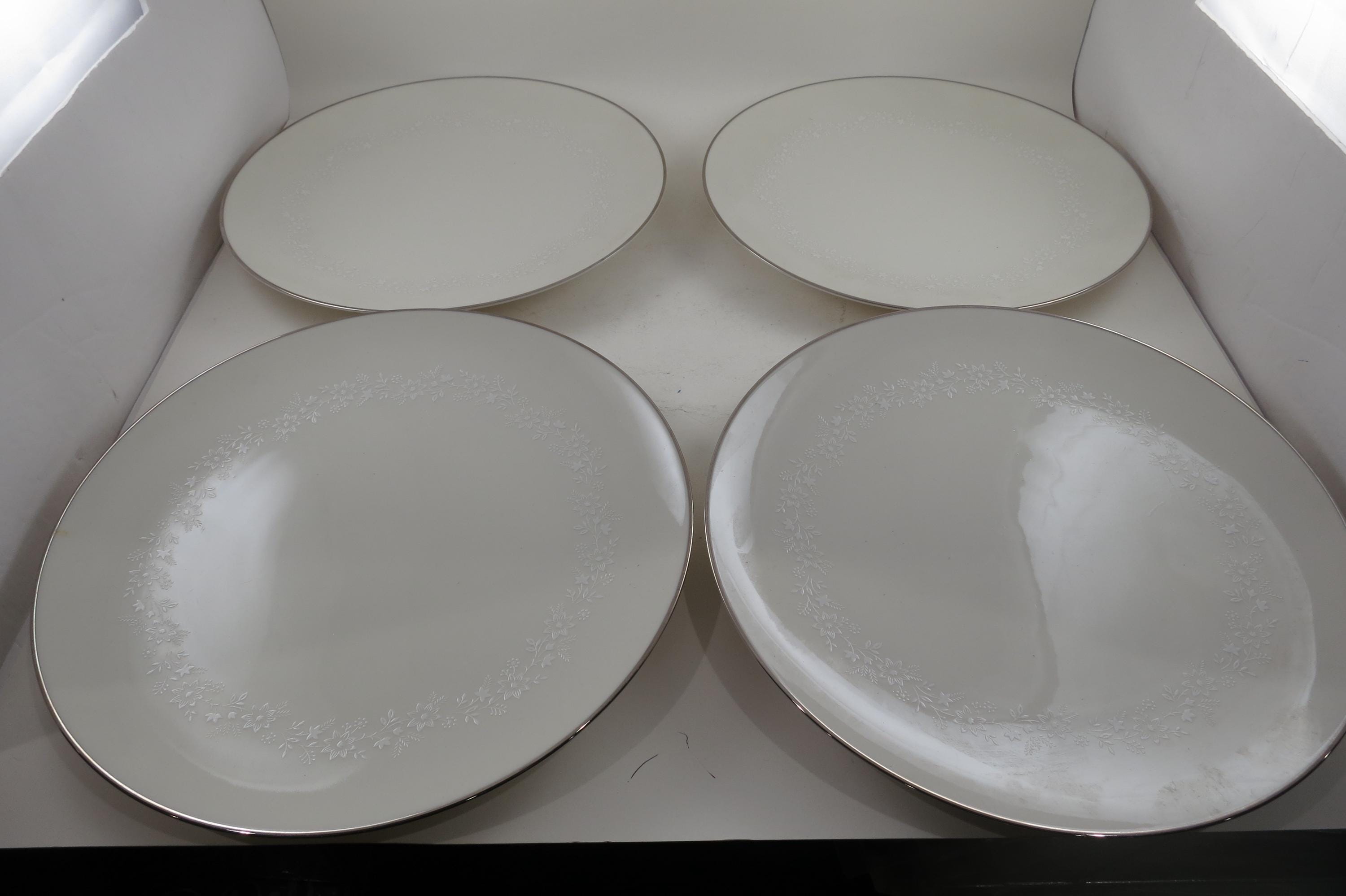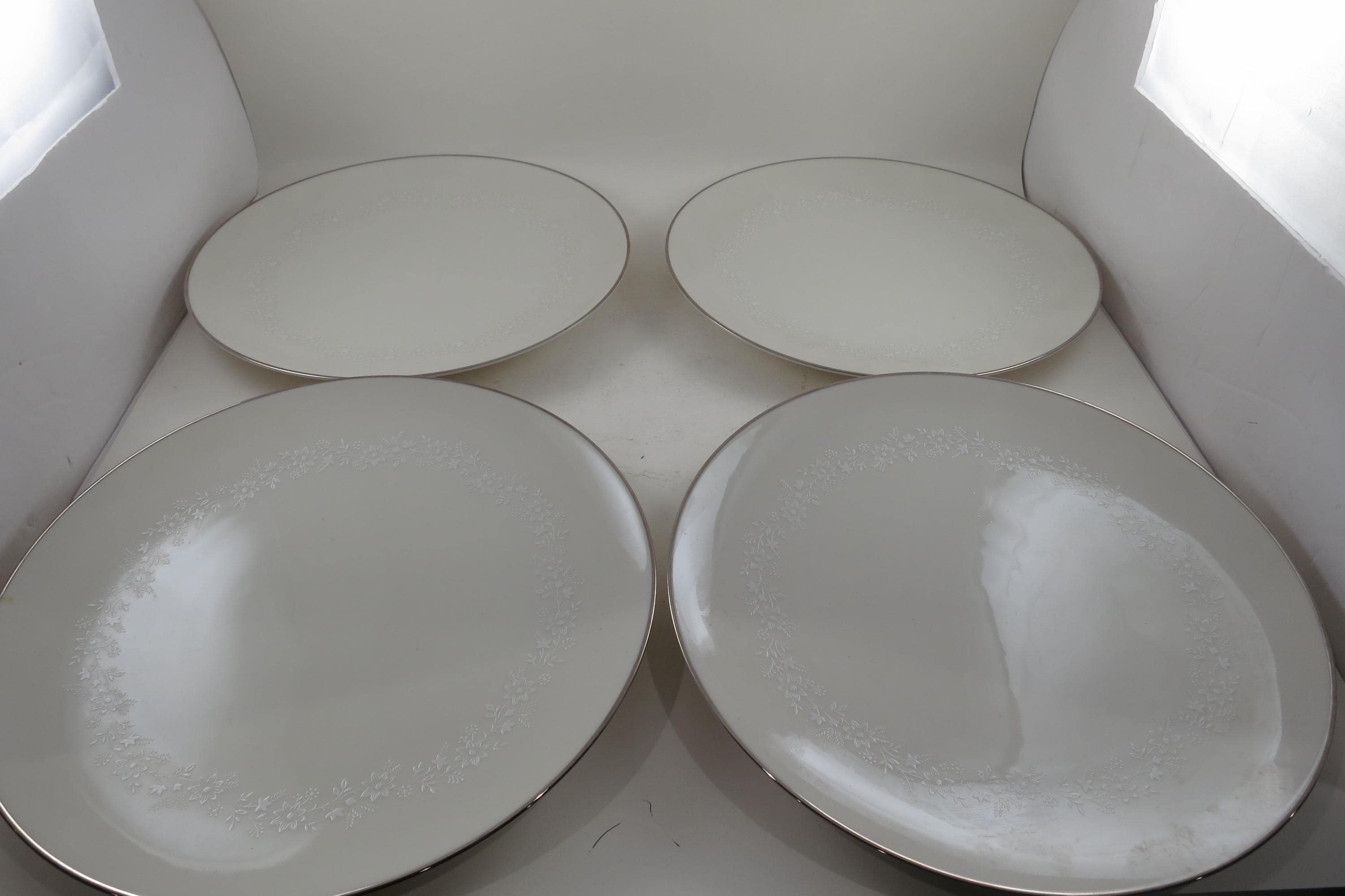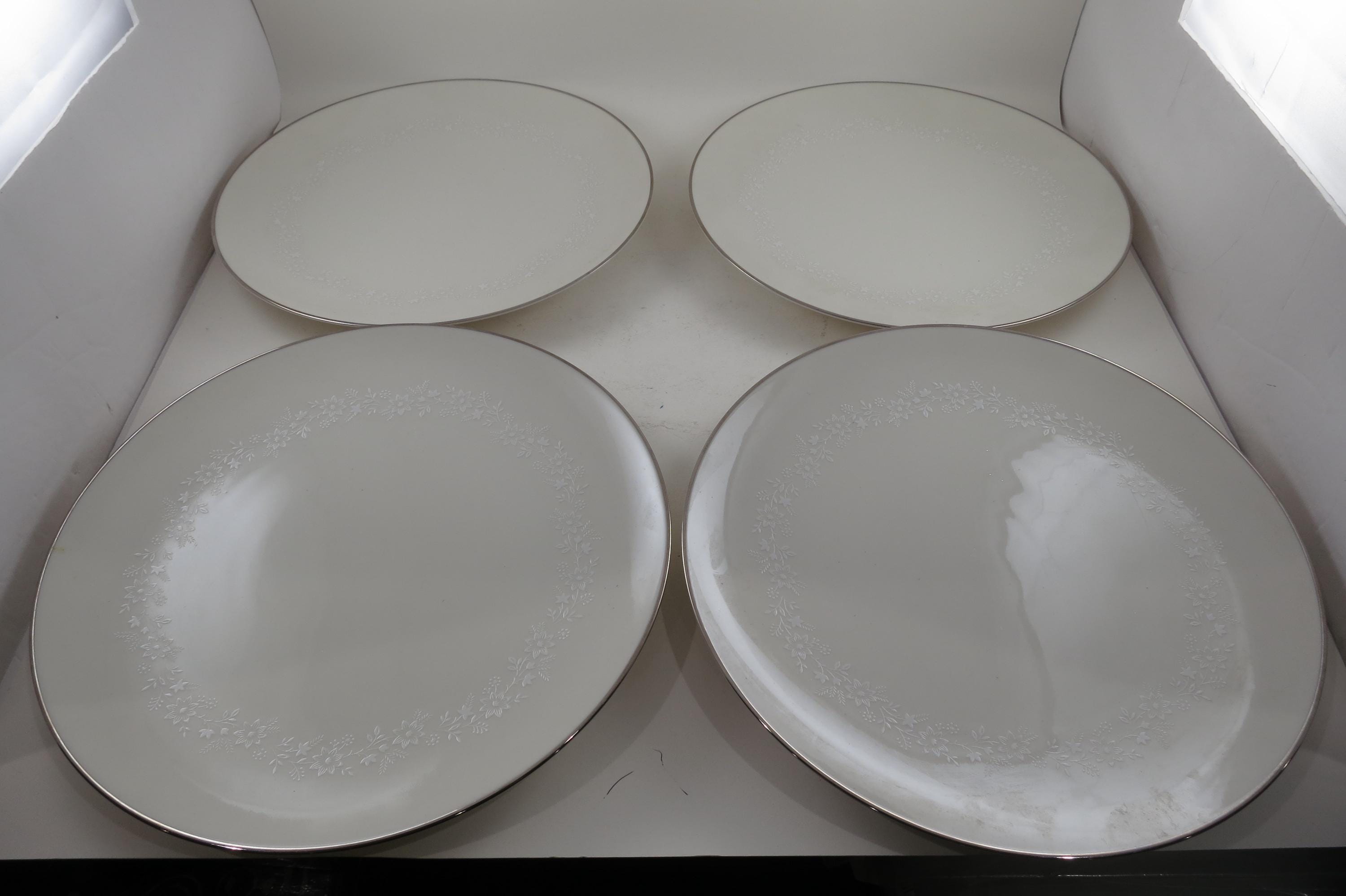 Beautiful Ivory with white floral and a platinum band pattern. All four plates are in very good used condition with no damages, they do show normal use wear.