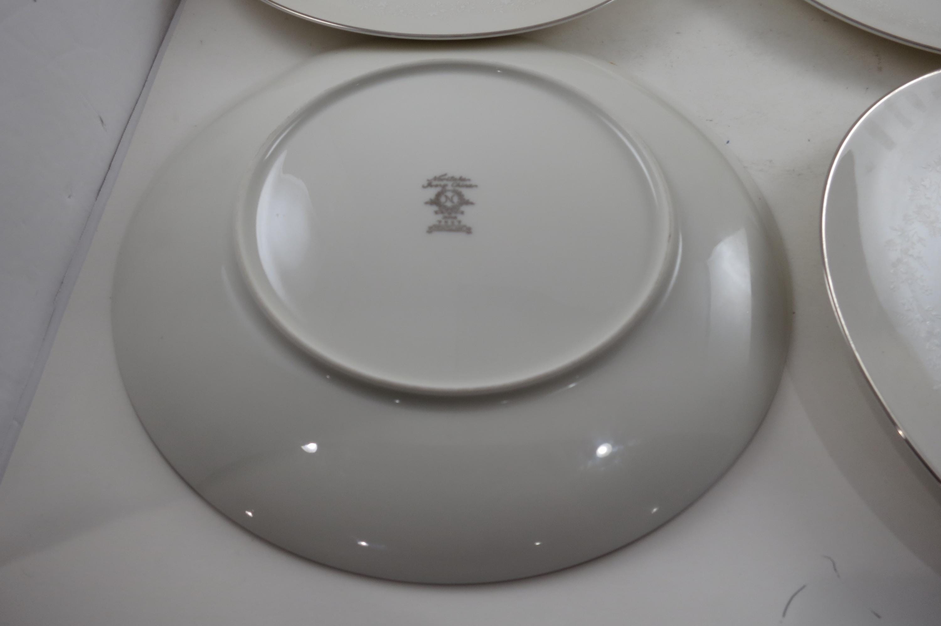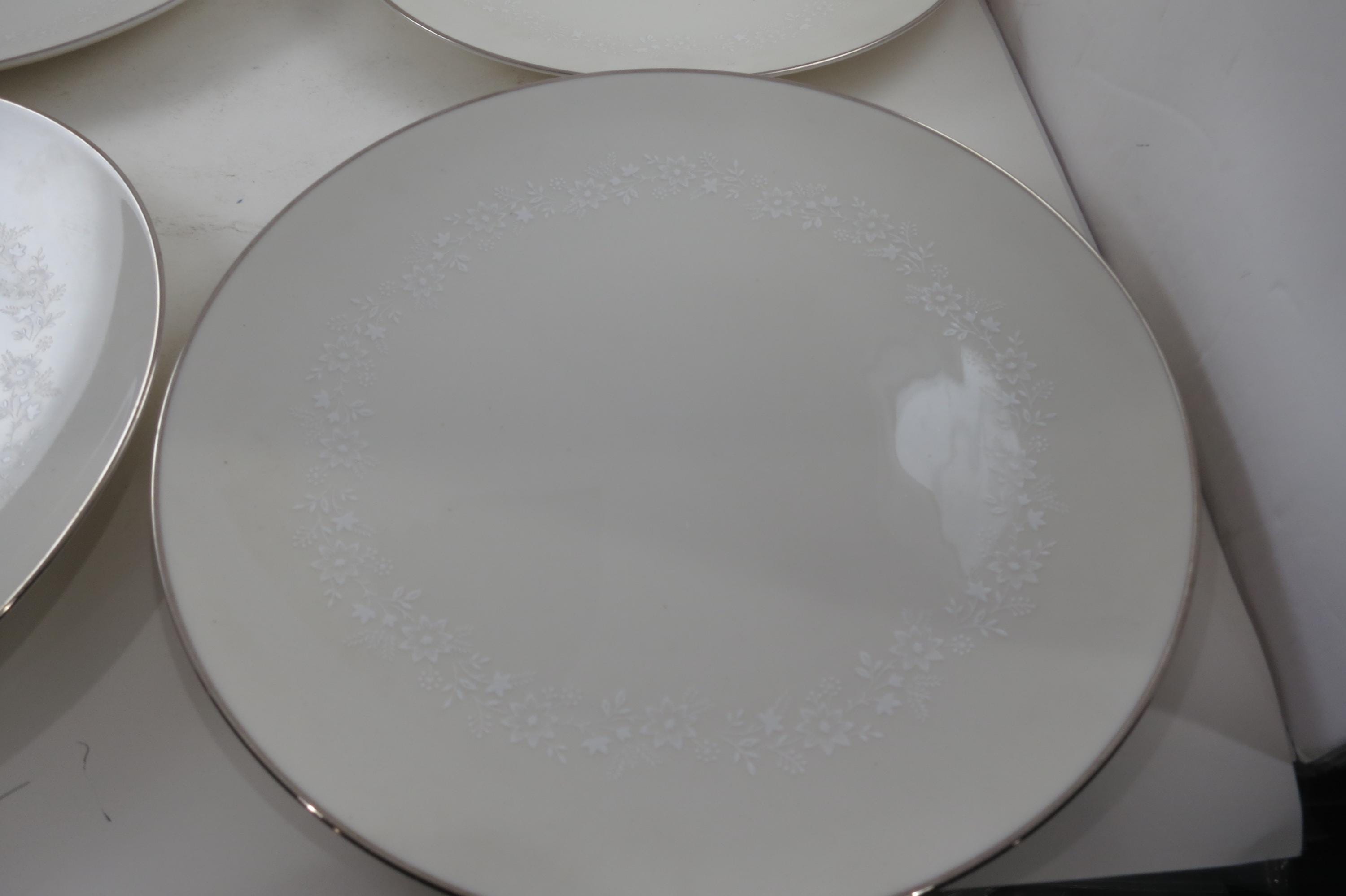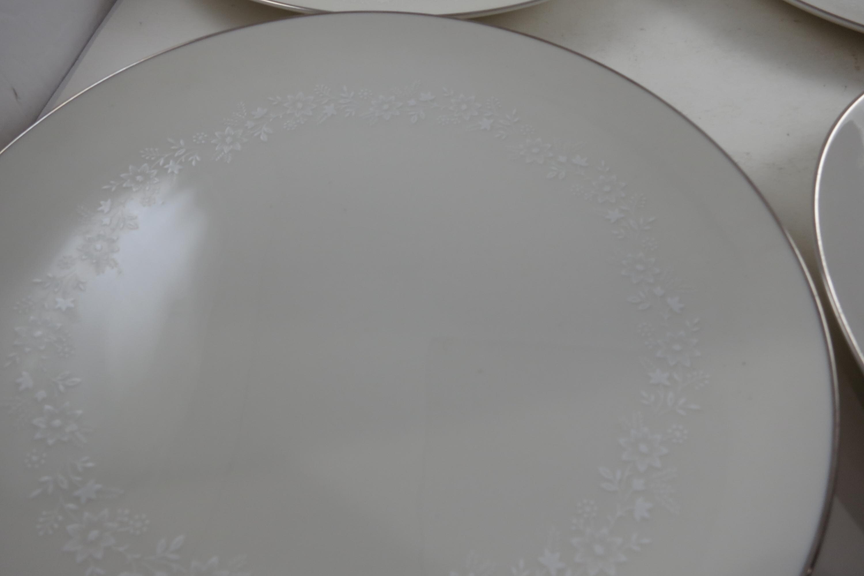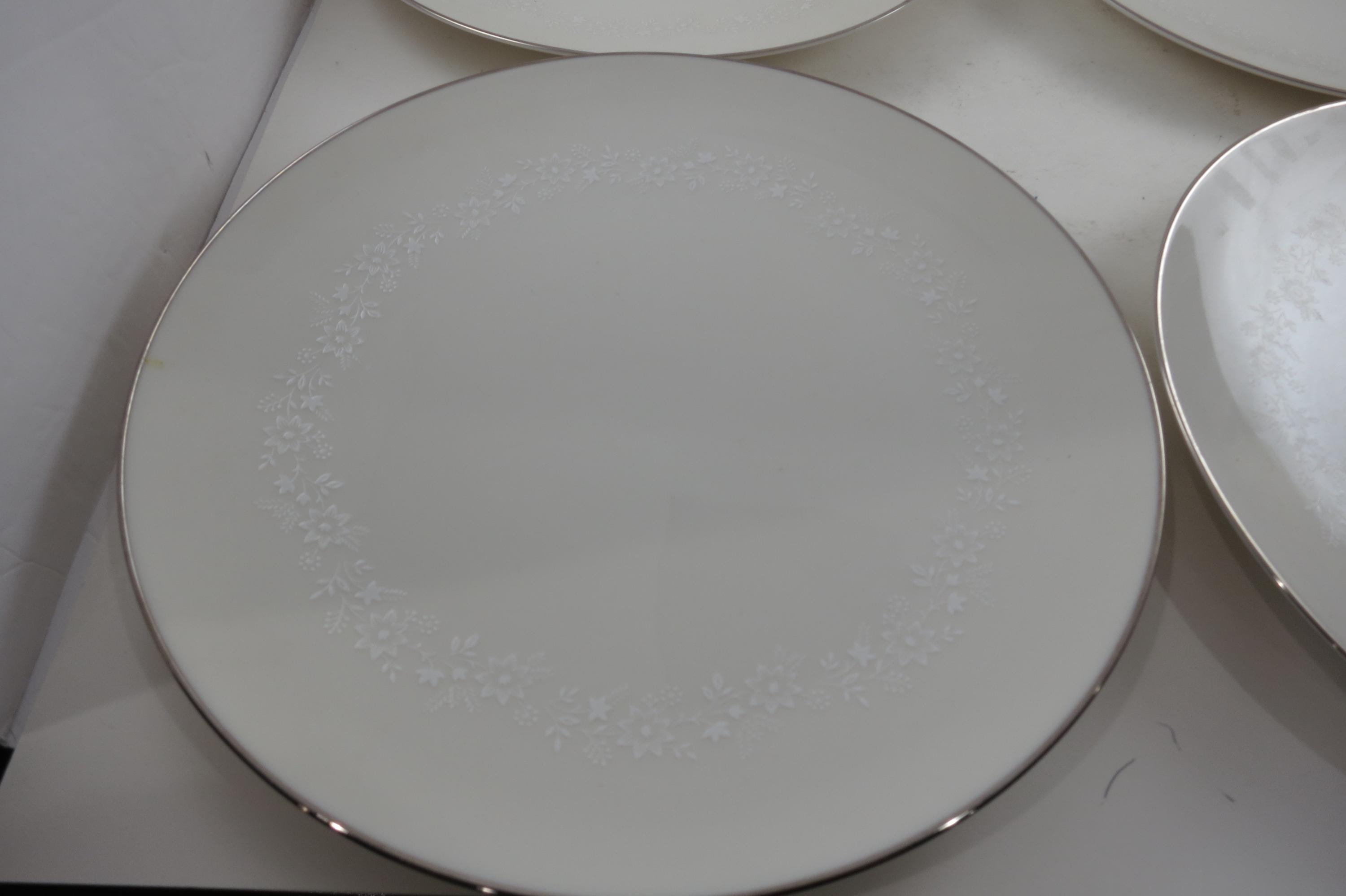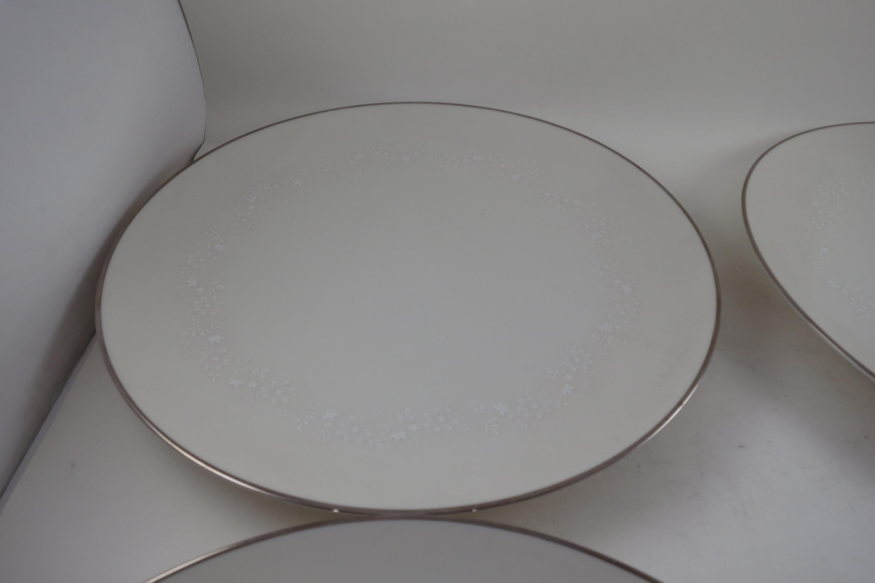 Beautiful Ivory with white floral and a platinum band pattern. All four plates are in very good used condition with no damages, they do show normal use wear.