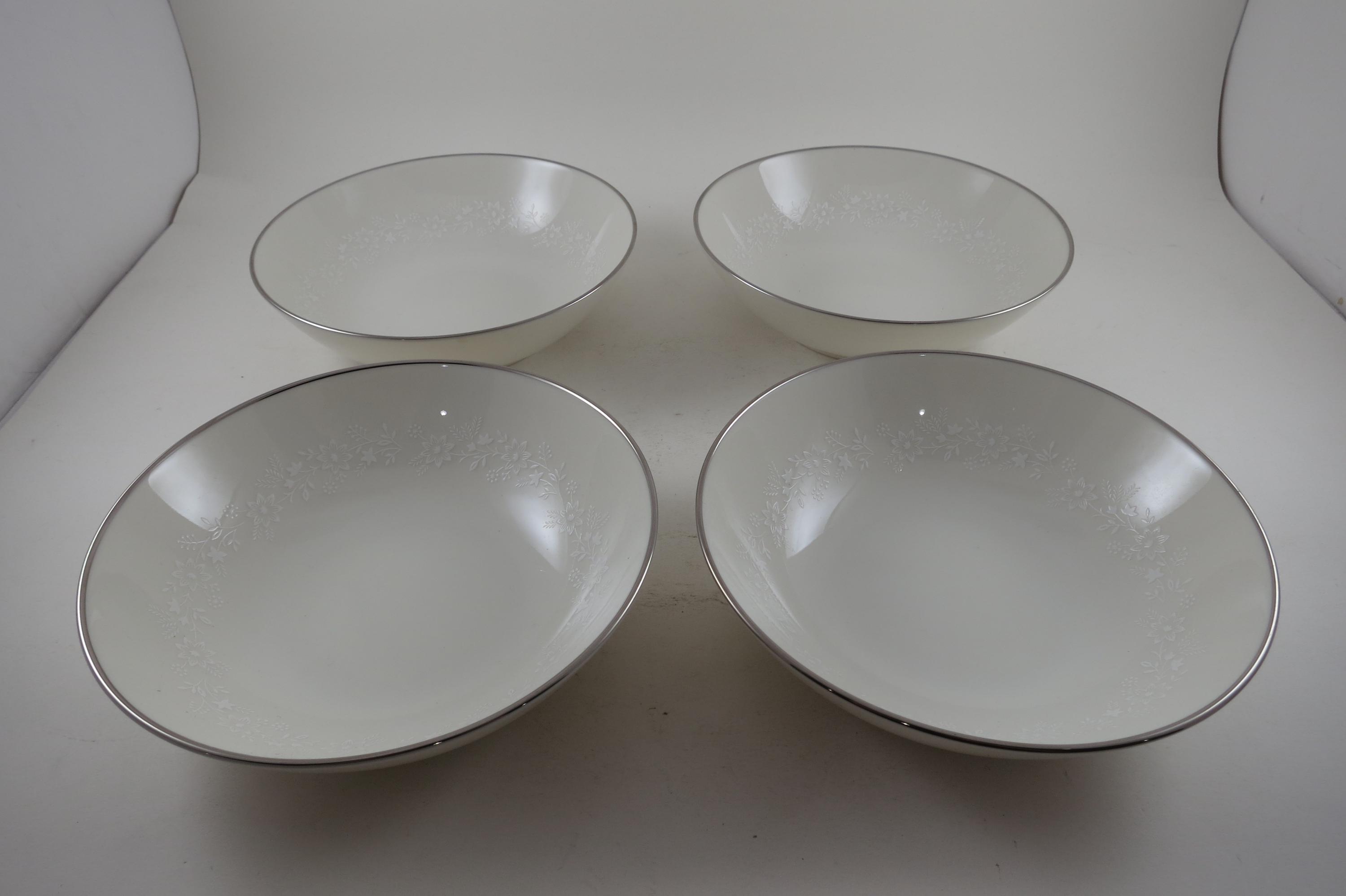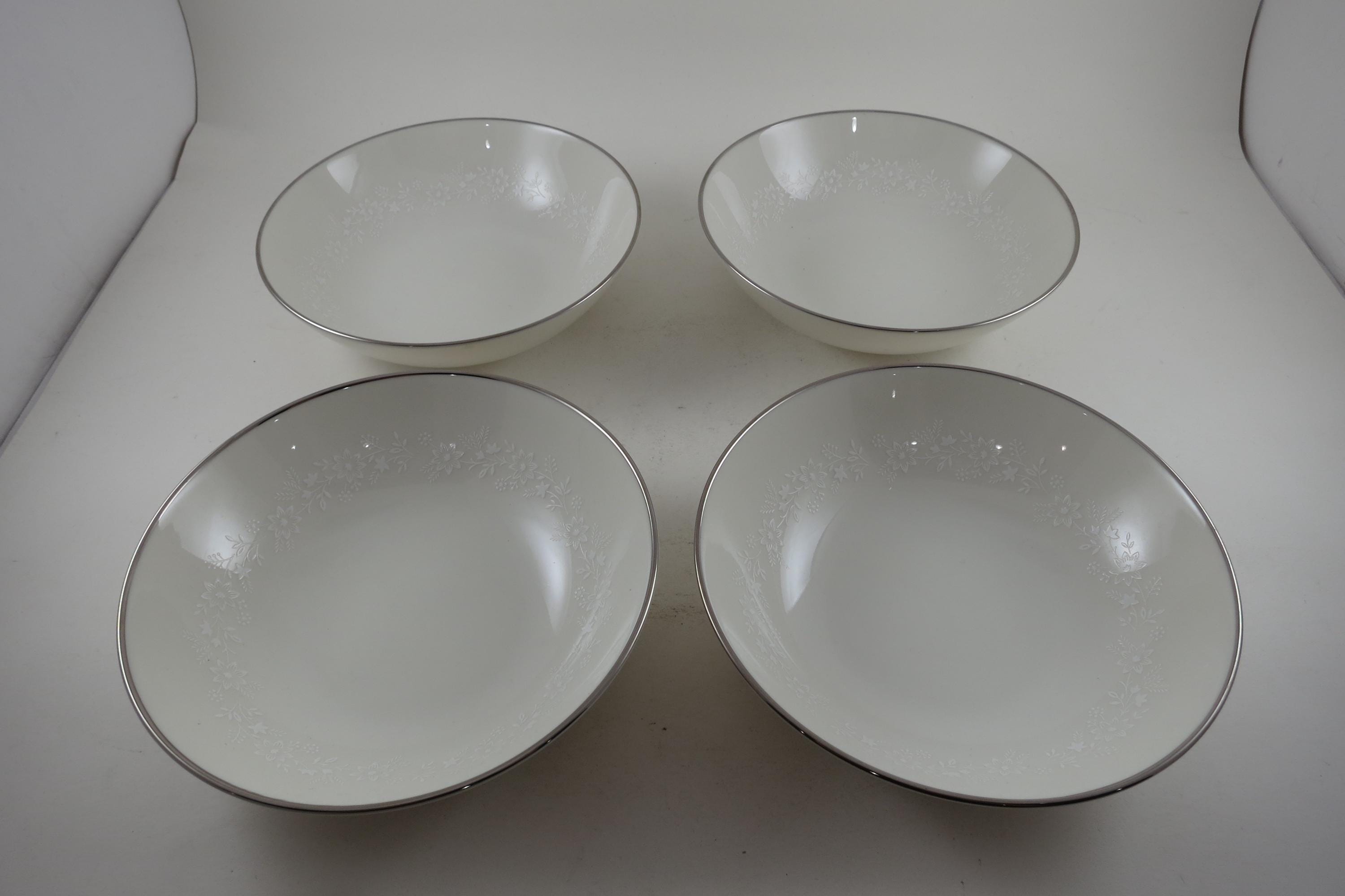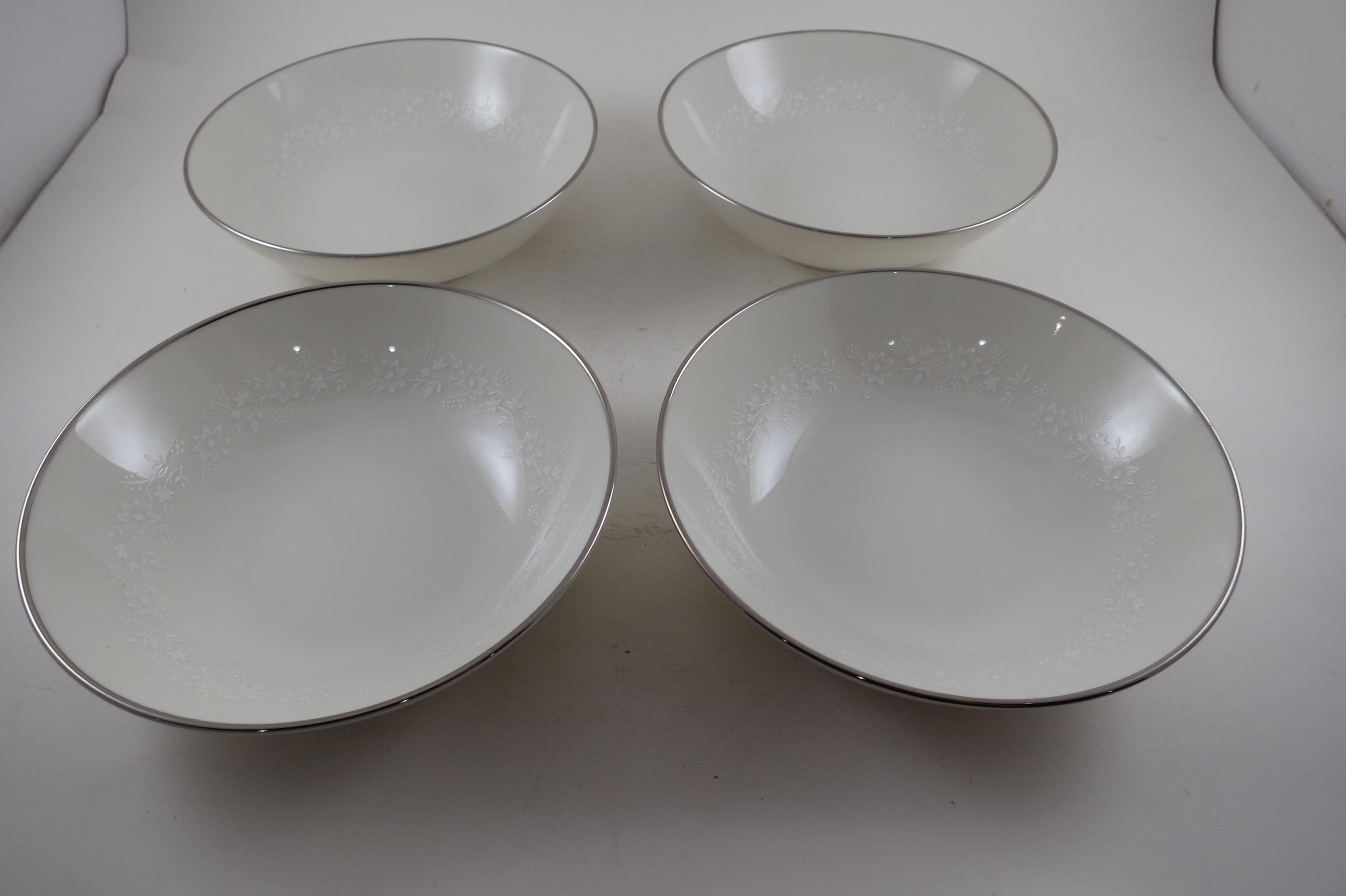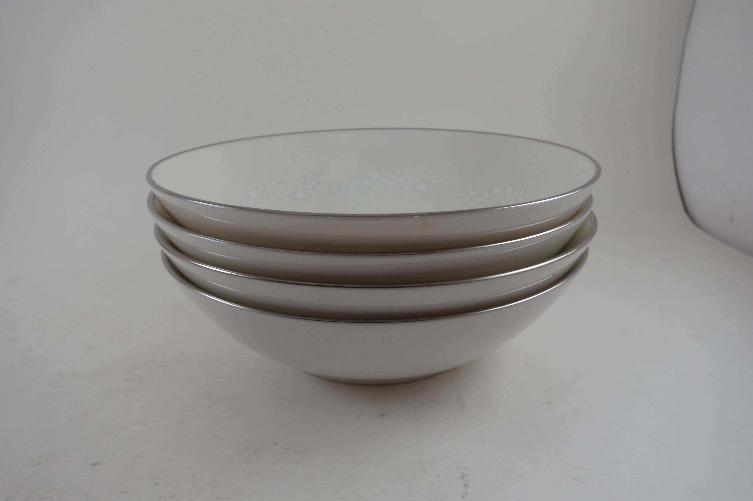 Beautiful Ivory with white floral and a platinum band pattern. All four bowls are in excellent condition with no damages.