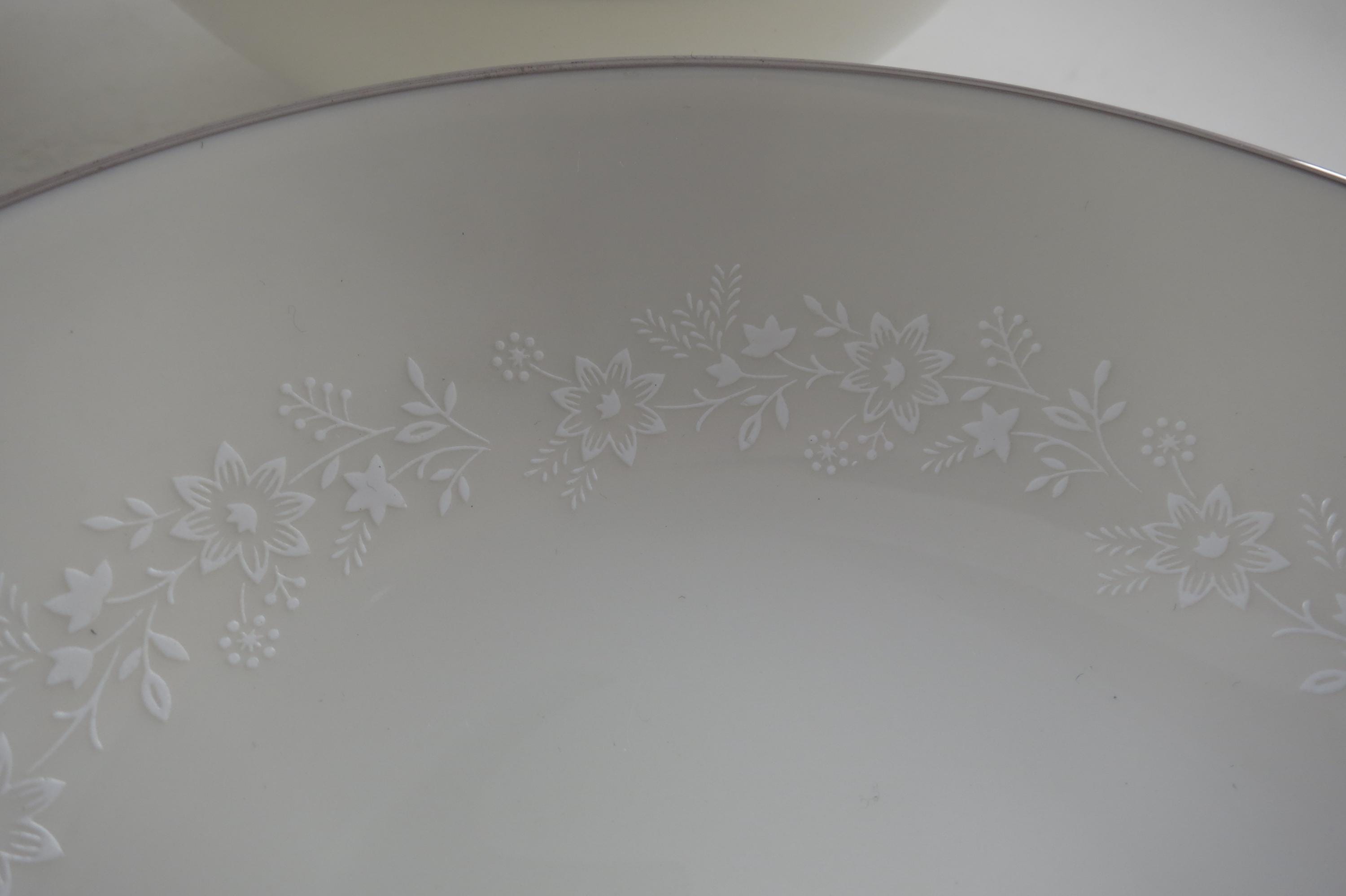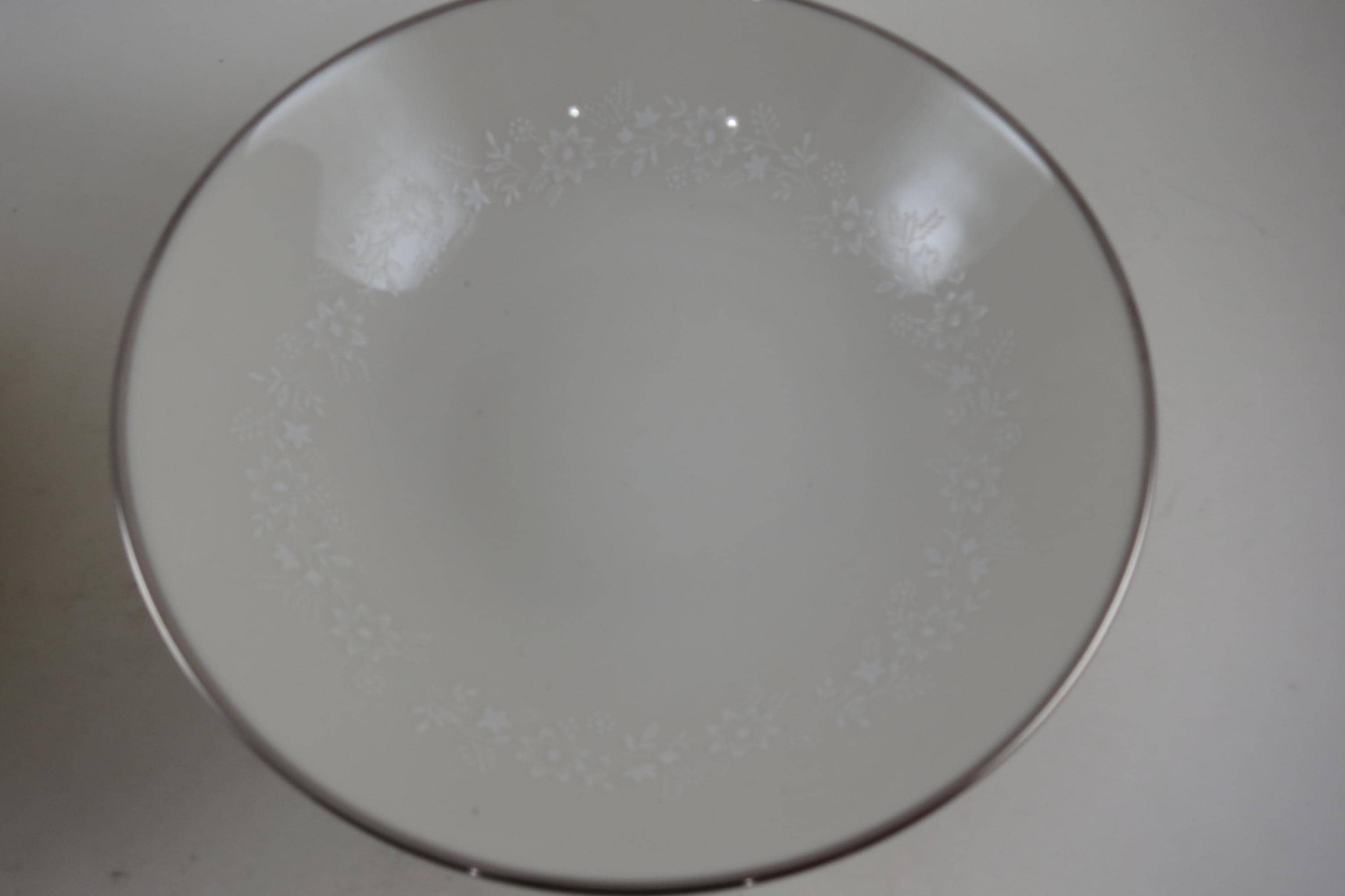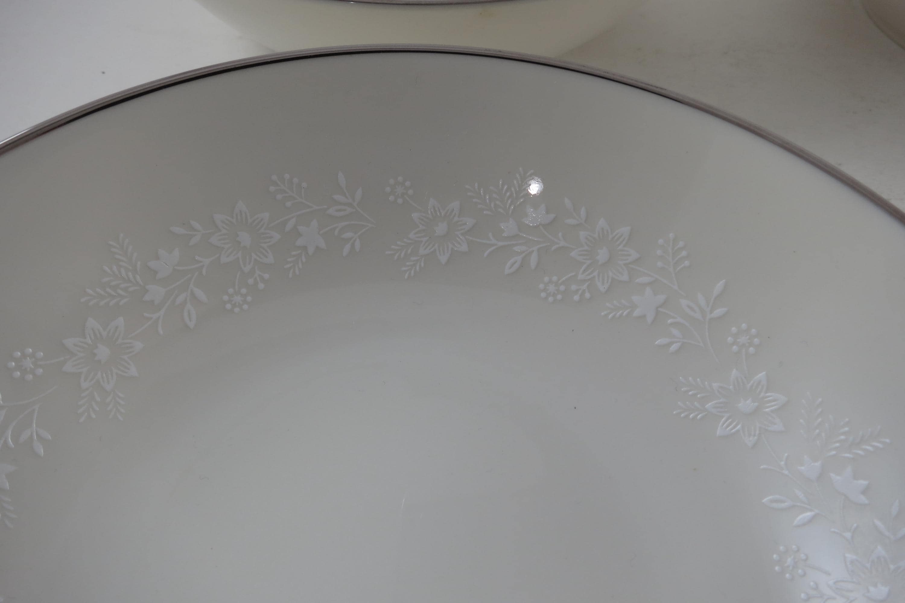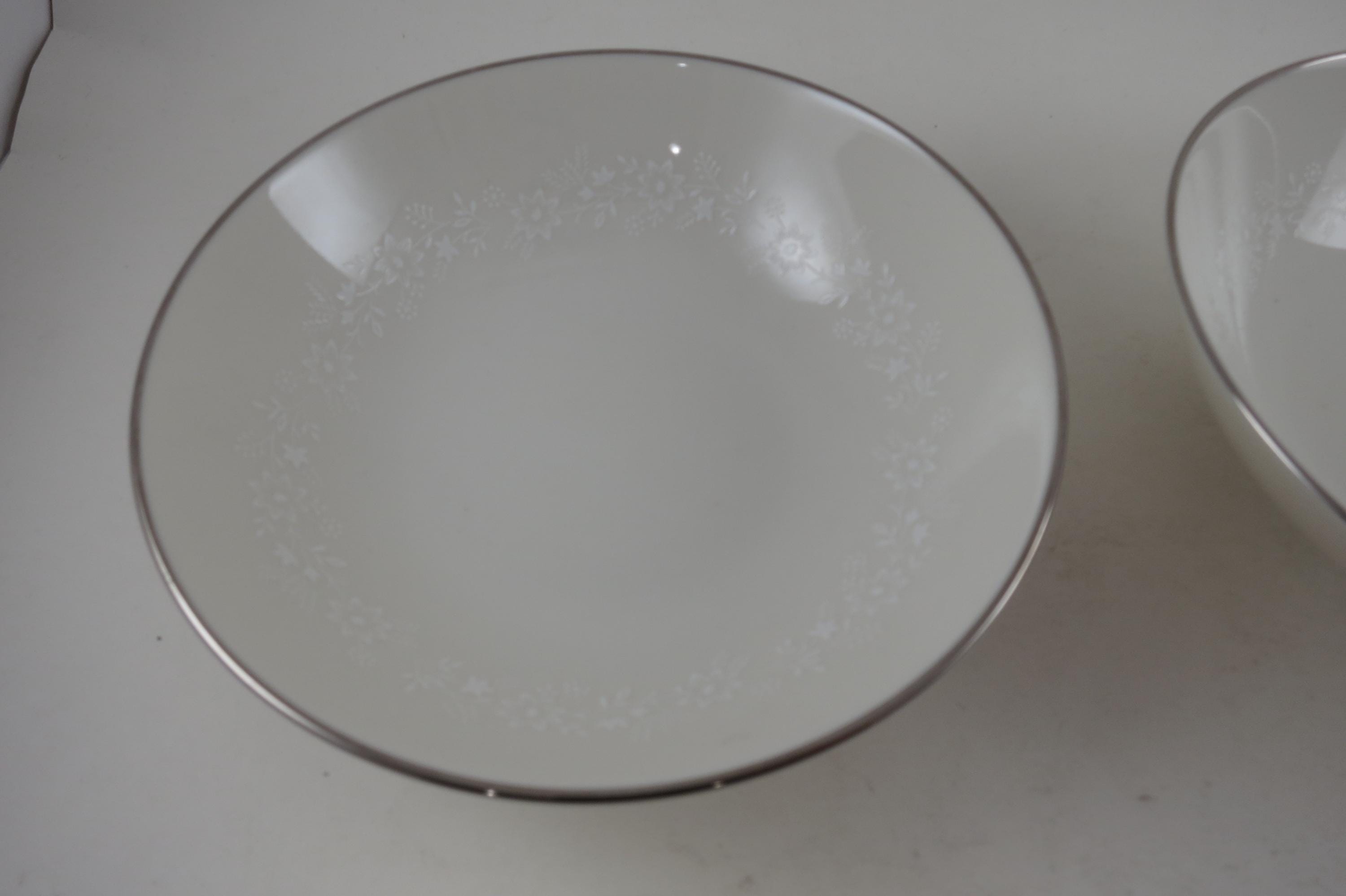 Beautiful Ivory with white floral and a platinum band pattern. All four bowls are in excellent condition with no damages.