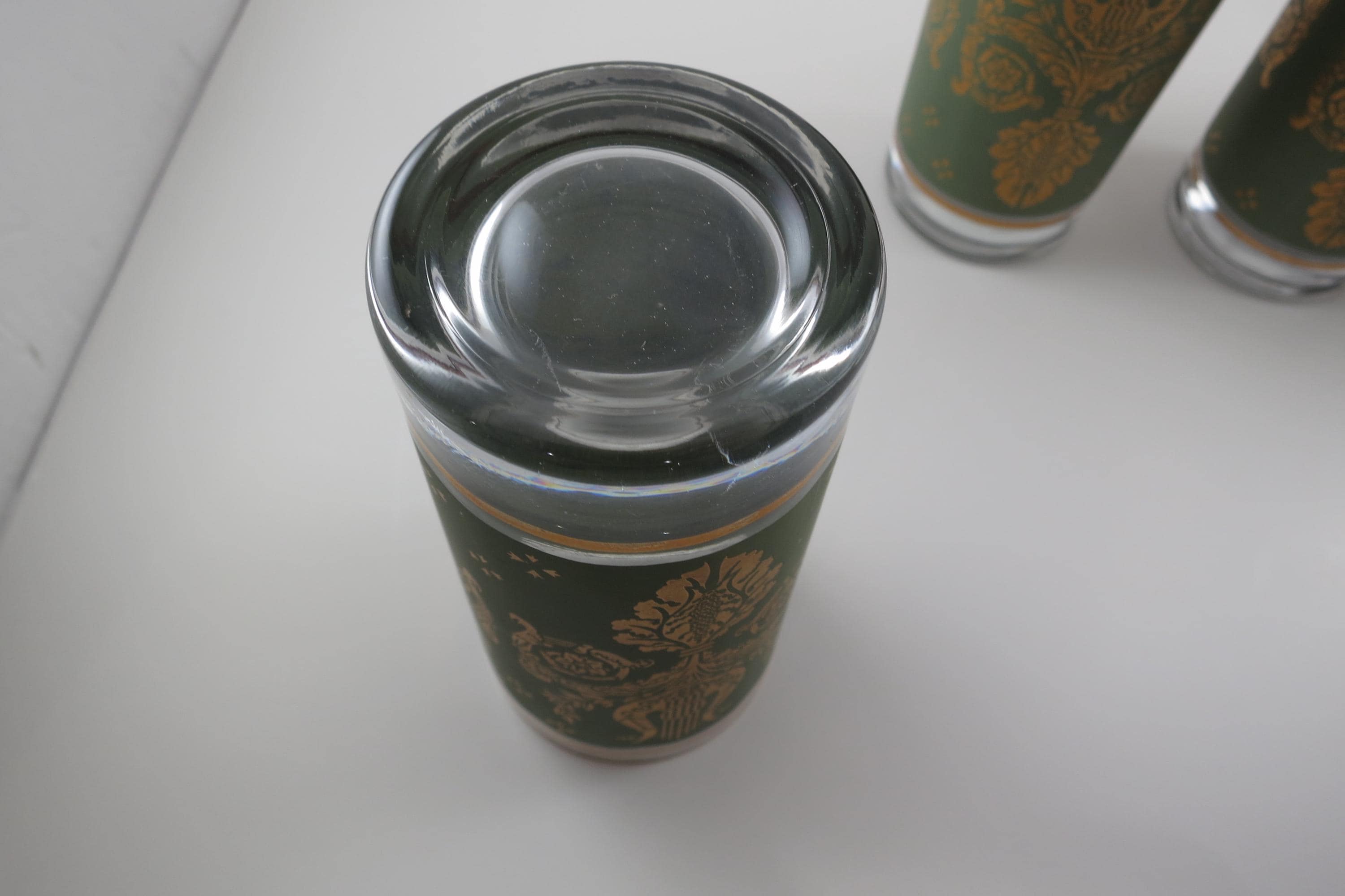 Excellent condition, showing almost no wear. They are 5 1/2 inches tall and will hold 12 ounces.