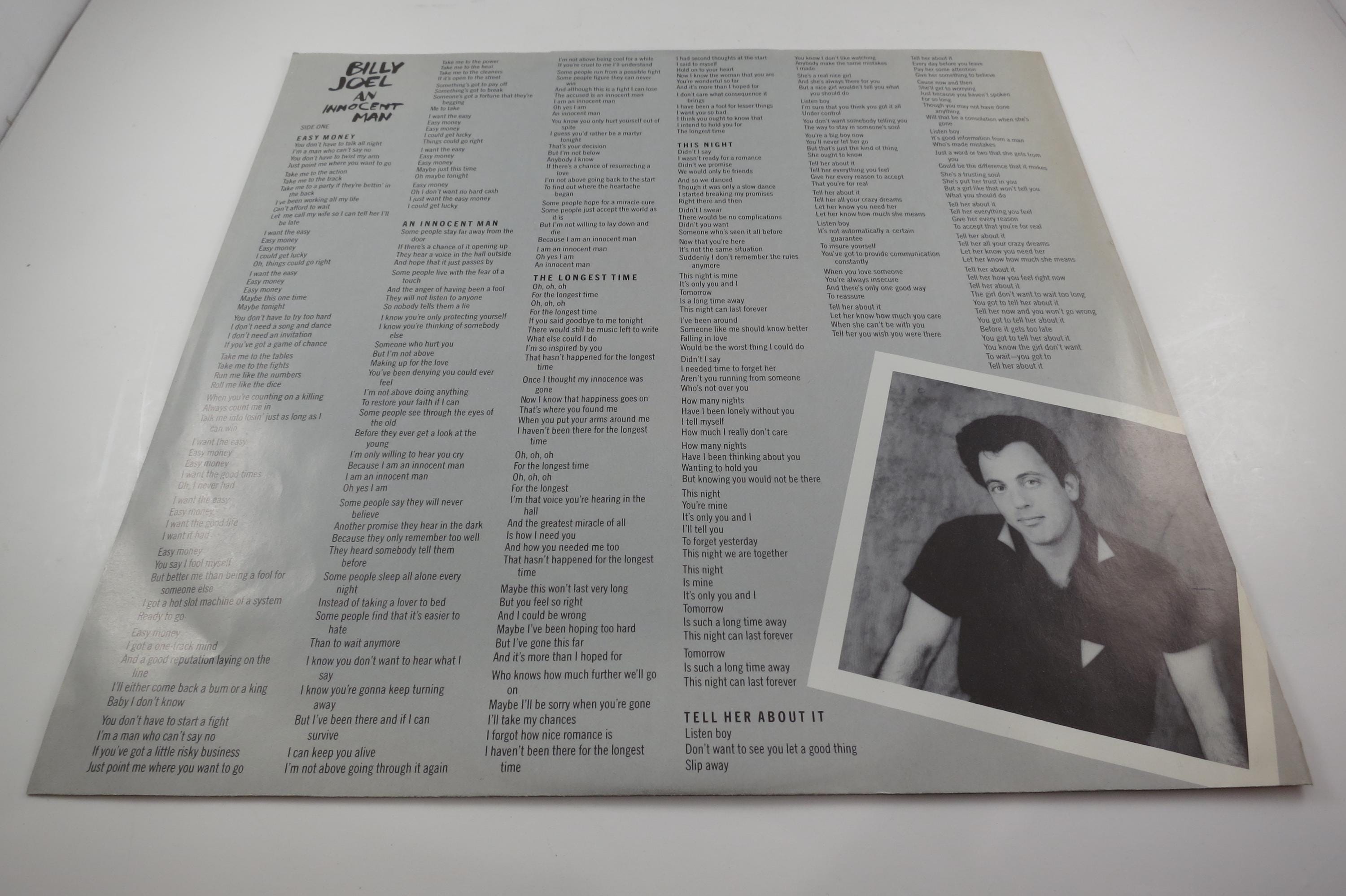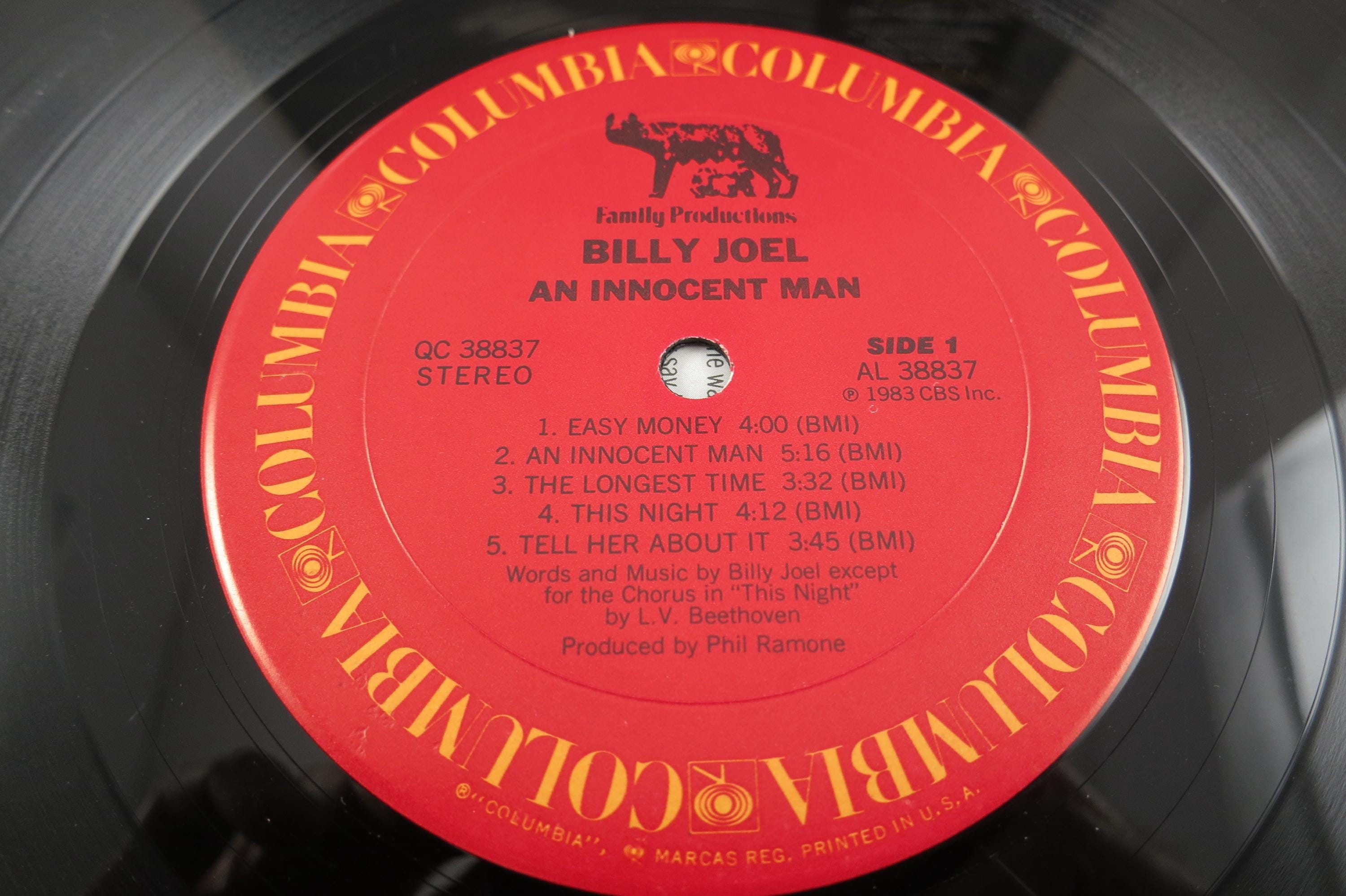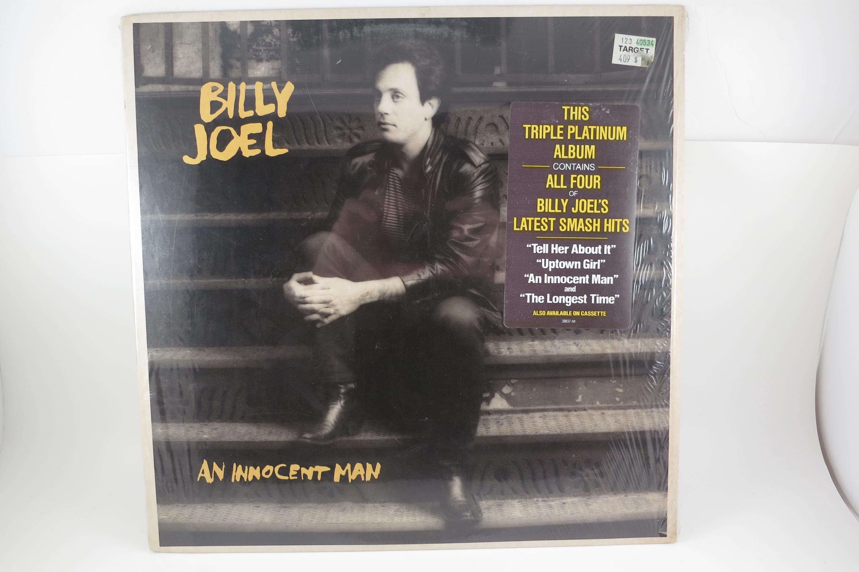 Vintage 1983 Vinyl LP Record Billy Joel An Innocent Man Excellent Condition In Shrink Hype Sticker. Original cover is in Near Mint condition and includes the original inner sleeve, factory shrink wrap and hype sticker. Record is excellent with a few light marks. Tracks are as follows