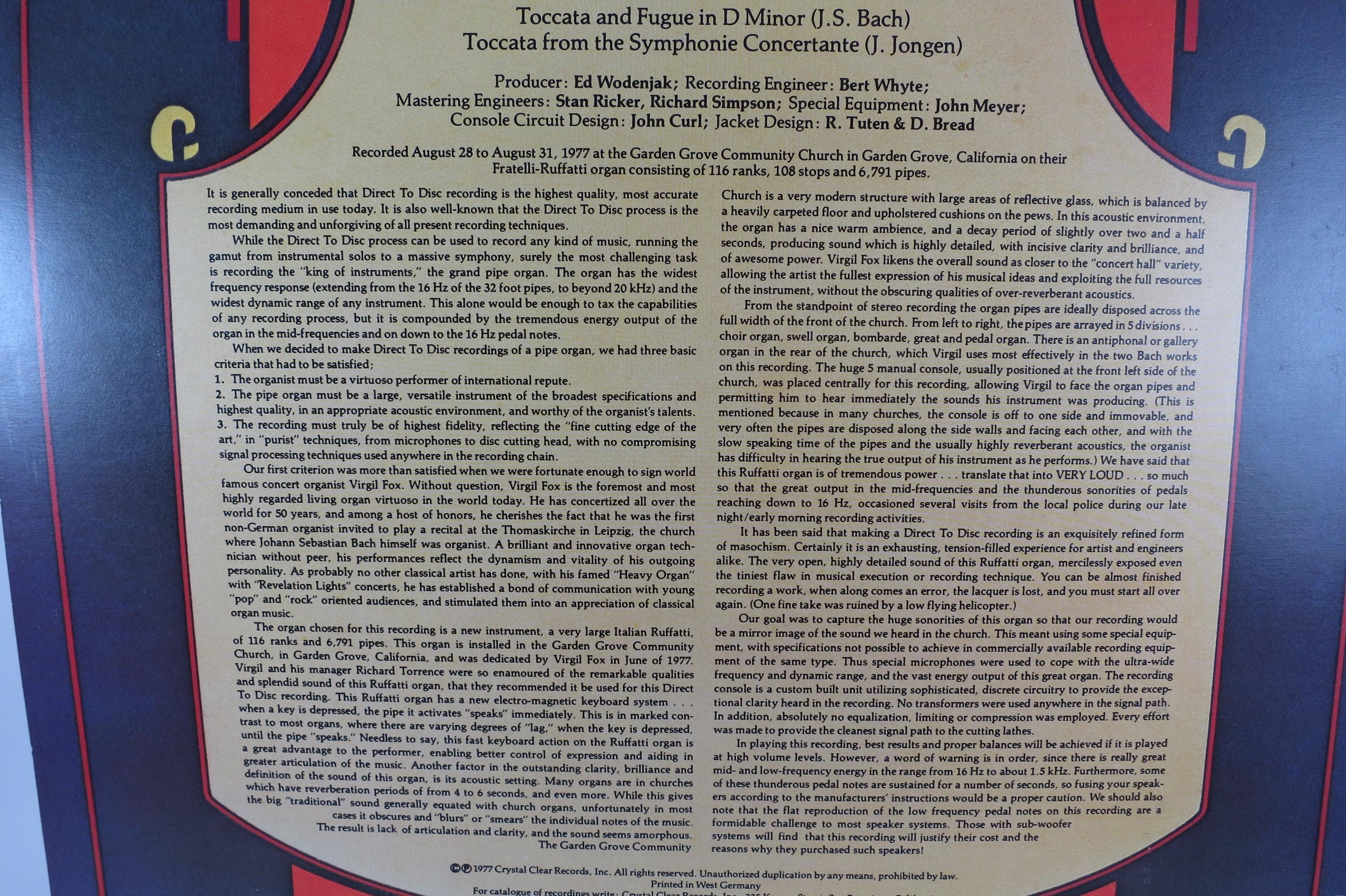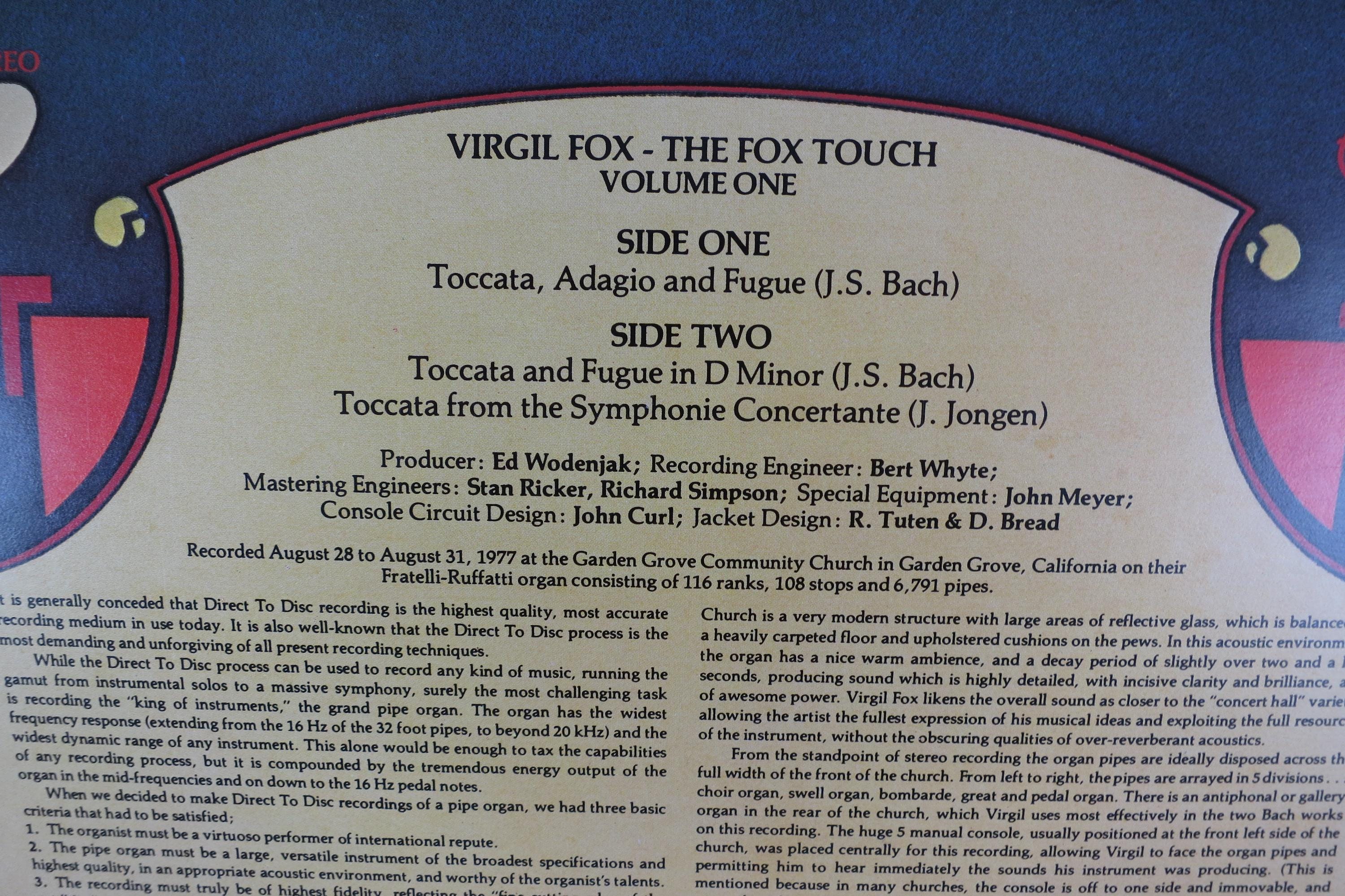 Vintage 1977 Vinyl LP Record The Fox Touch Volume One Virgil Fox Direct to Disc Recording Near Mint Condition. Original cover is in excellent condition and includes the inner paper sleeve. Record is Near Mint. Tracks are as follows