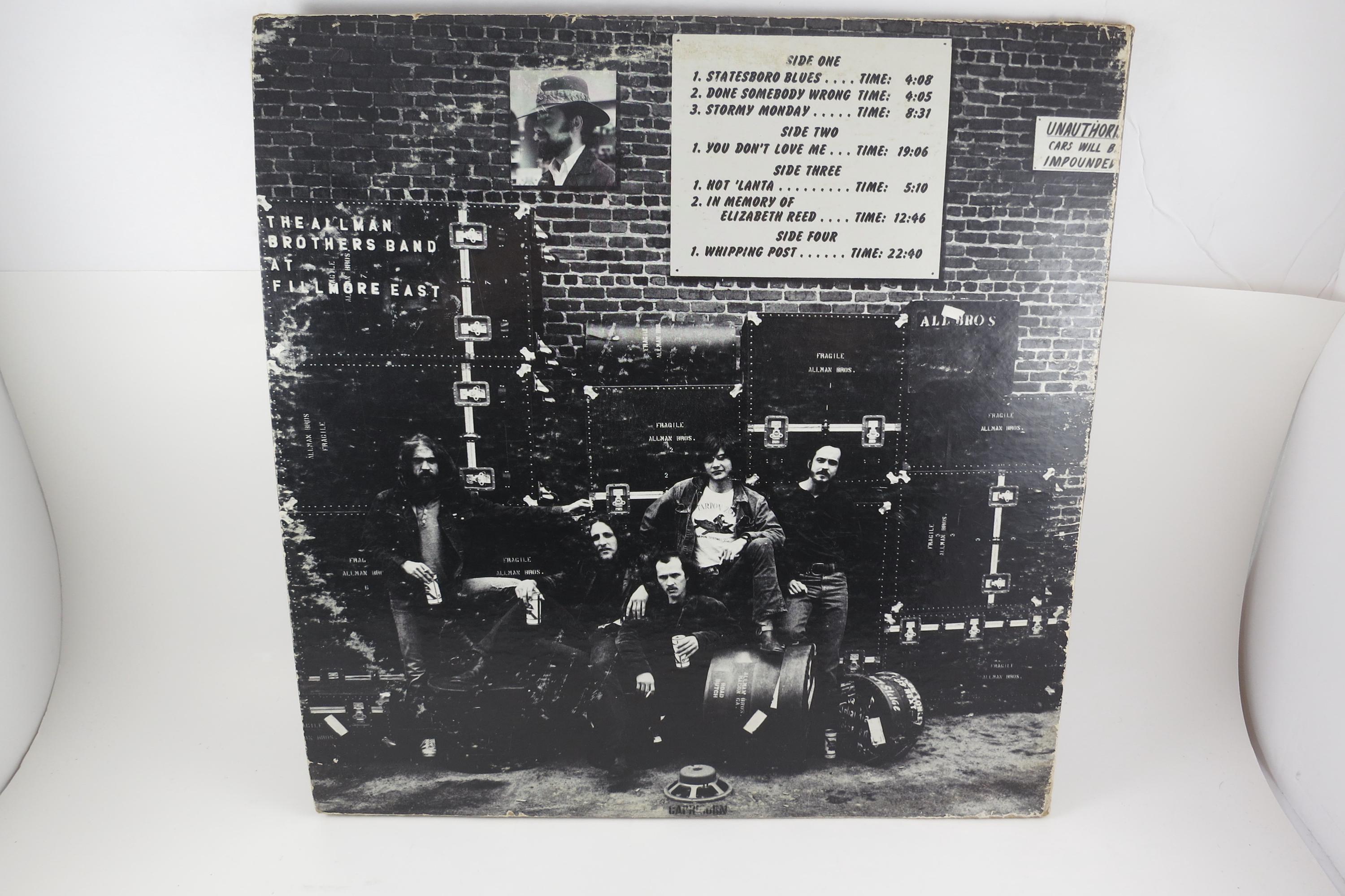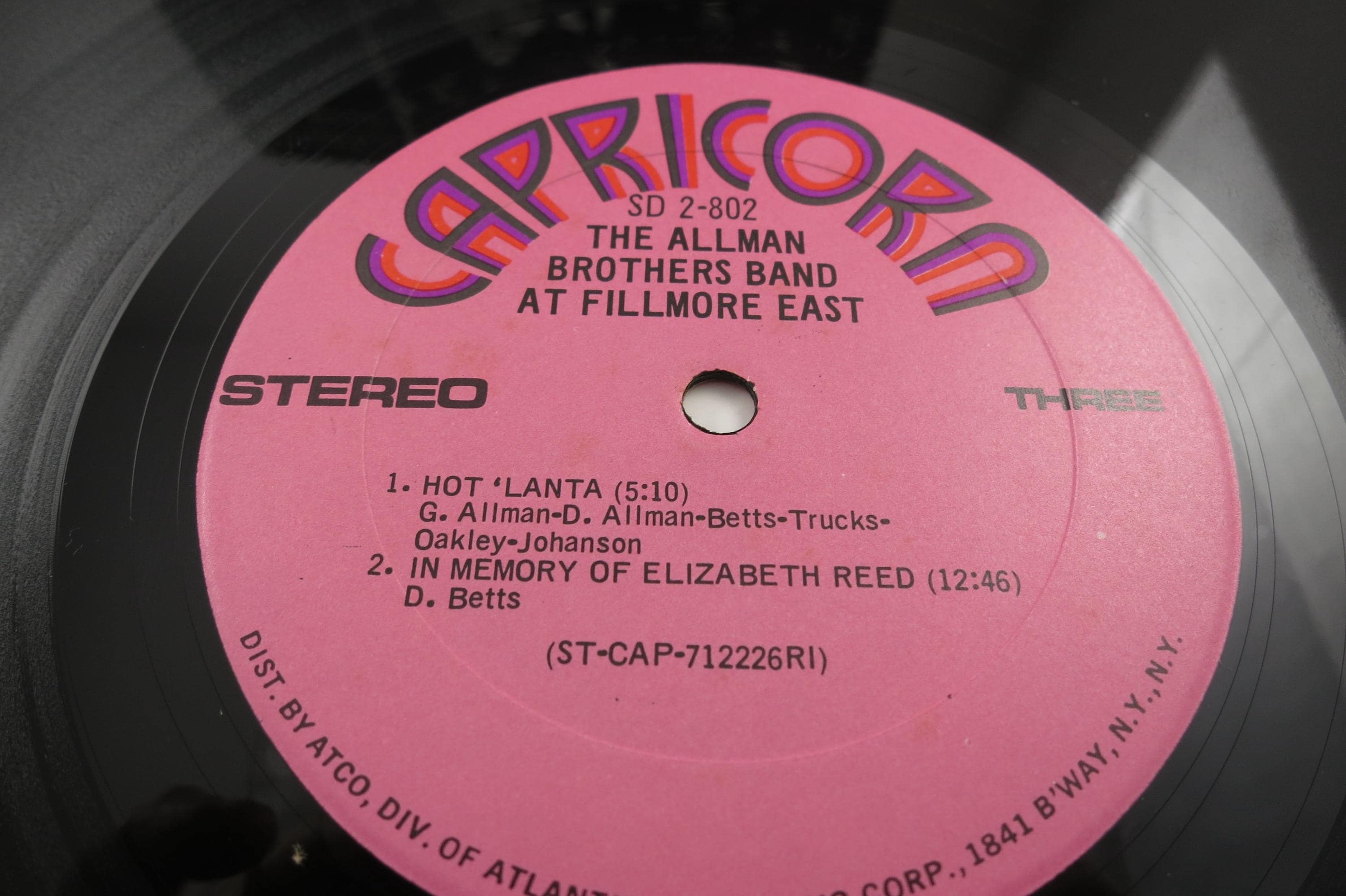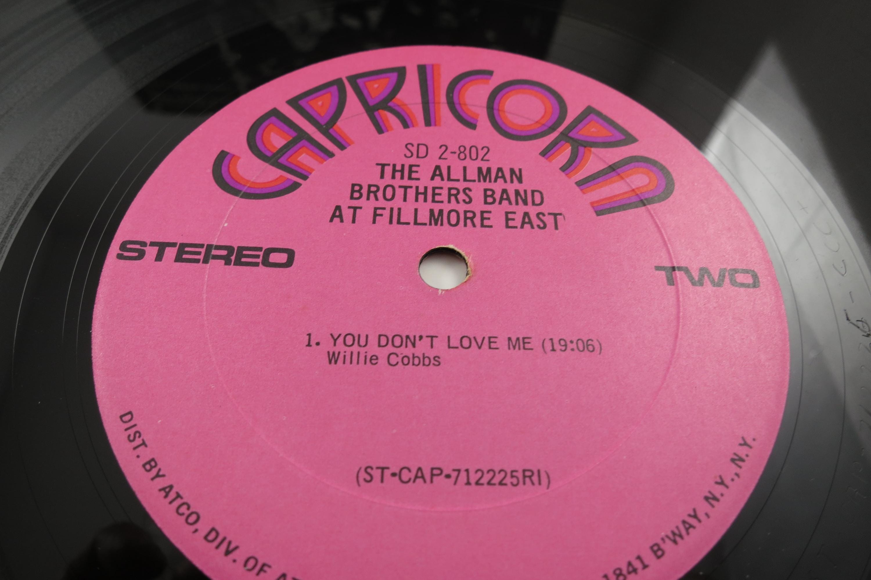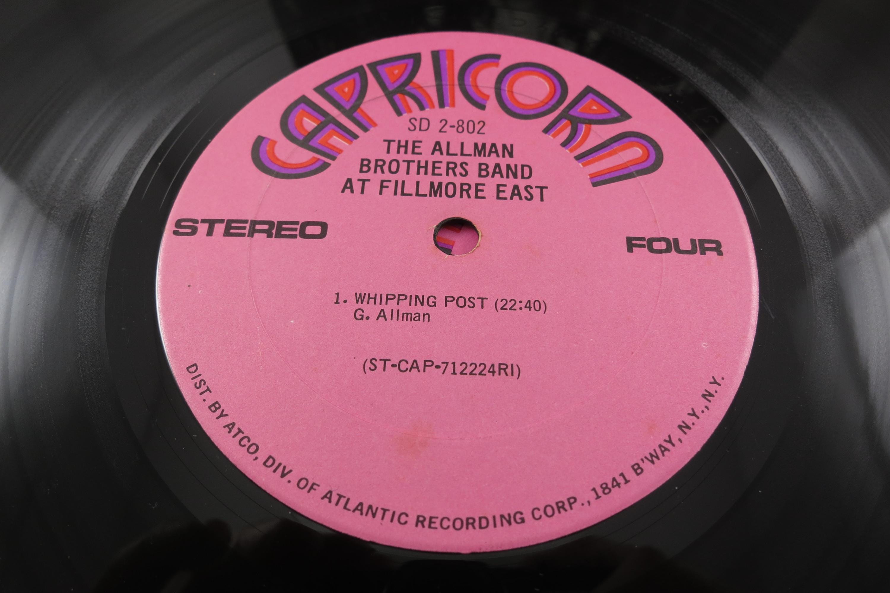 Vintage 1971 LP Vinyl Record The Allman Brothers Band at Fillmore East Excellent Condition. Original gate fold cover is in very good condition and includes the inner paper sleeves. Has a taped bottom seam. Records are both excellent and have marks. First pressing with the Pink Labels!! Tracks are as follows