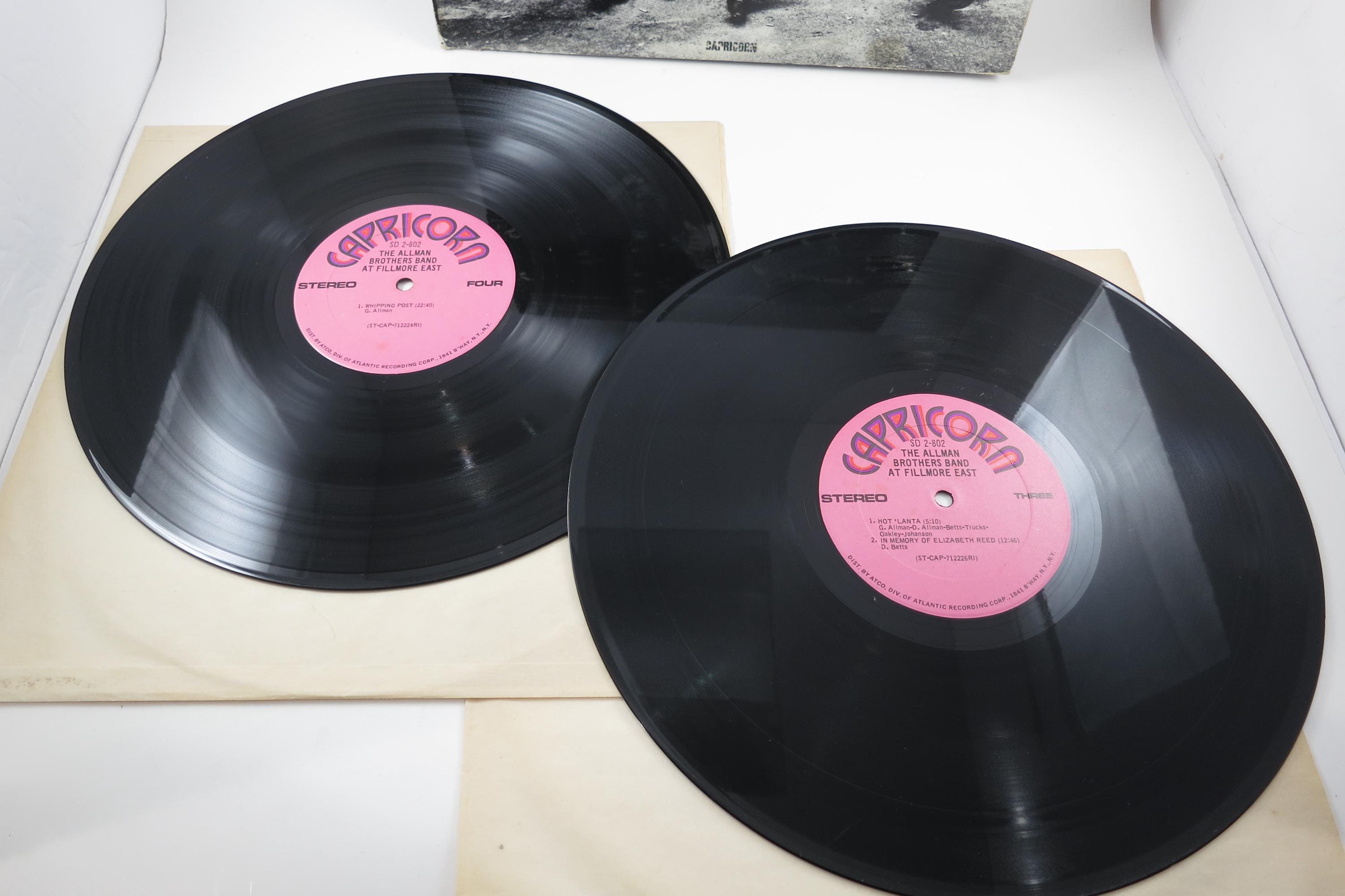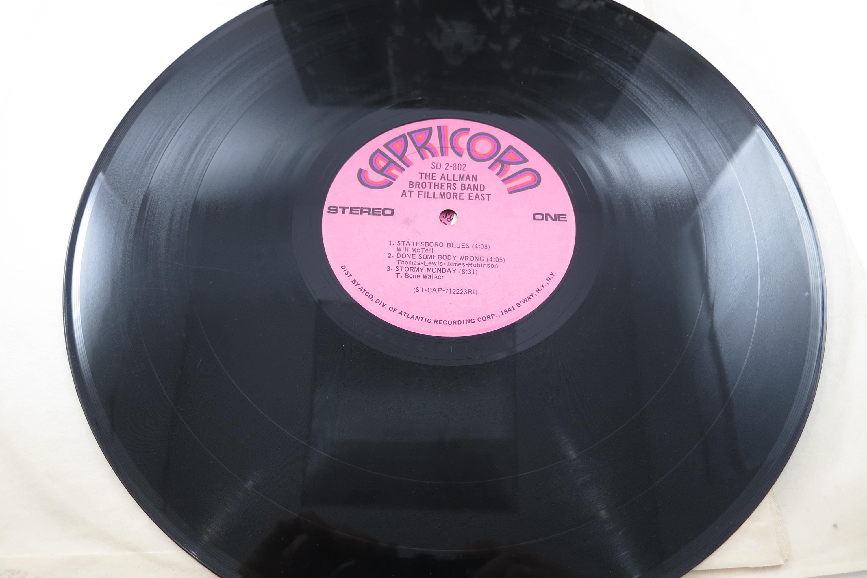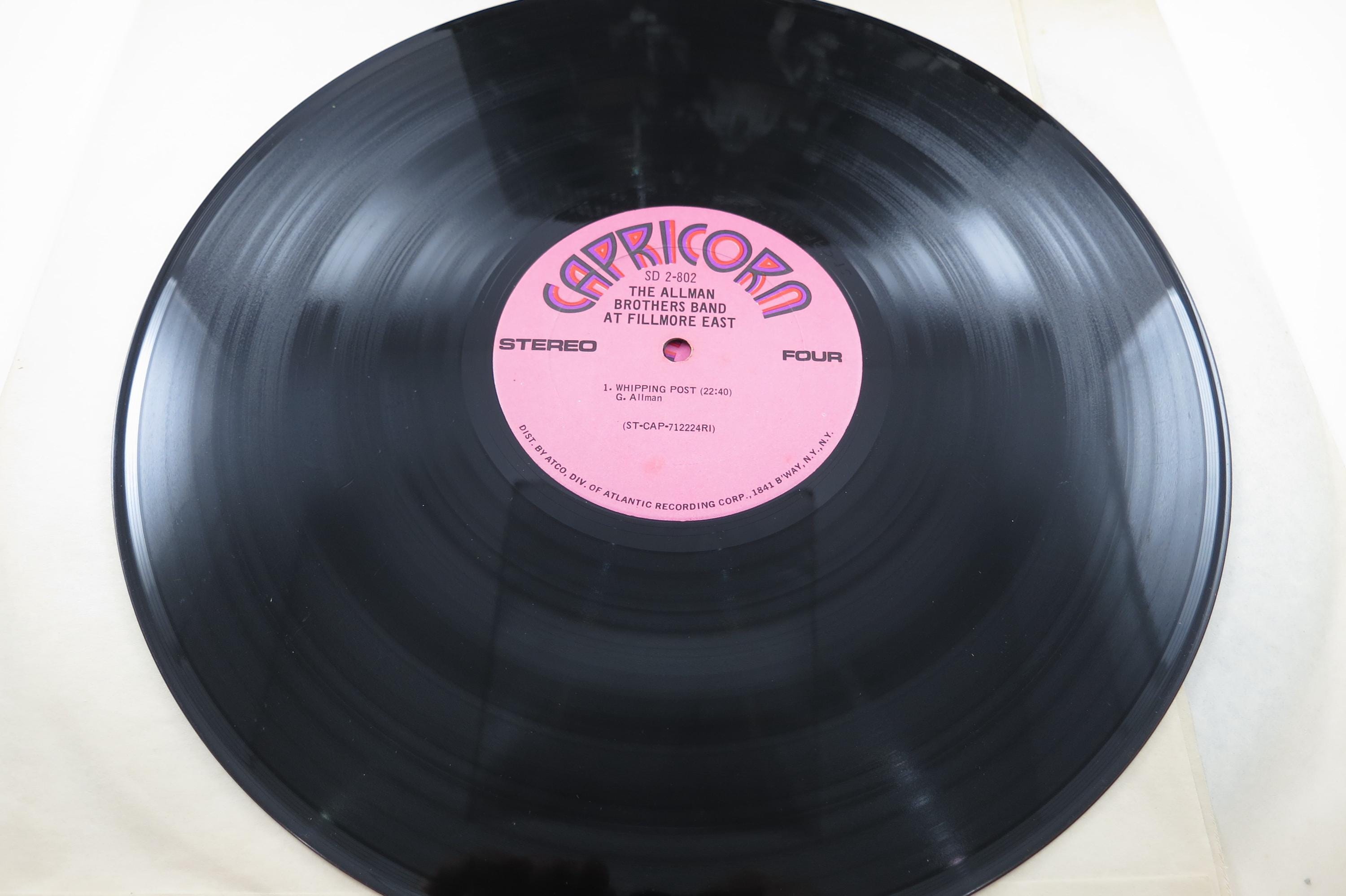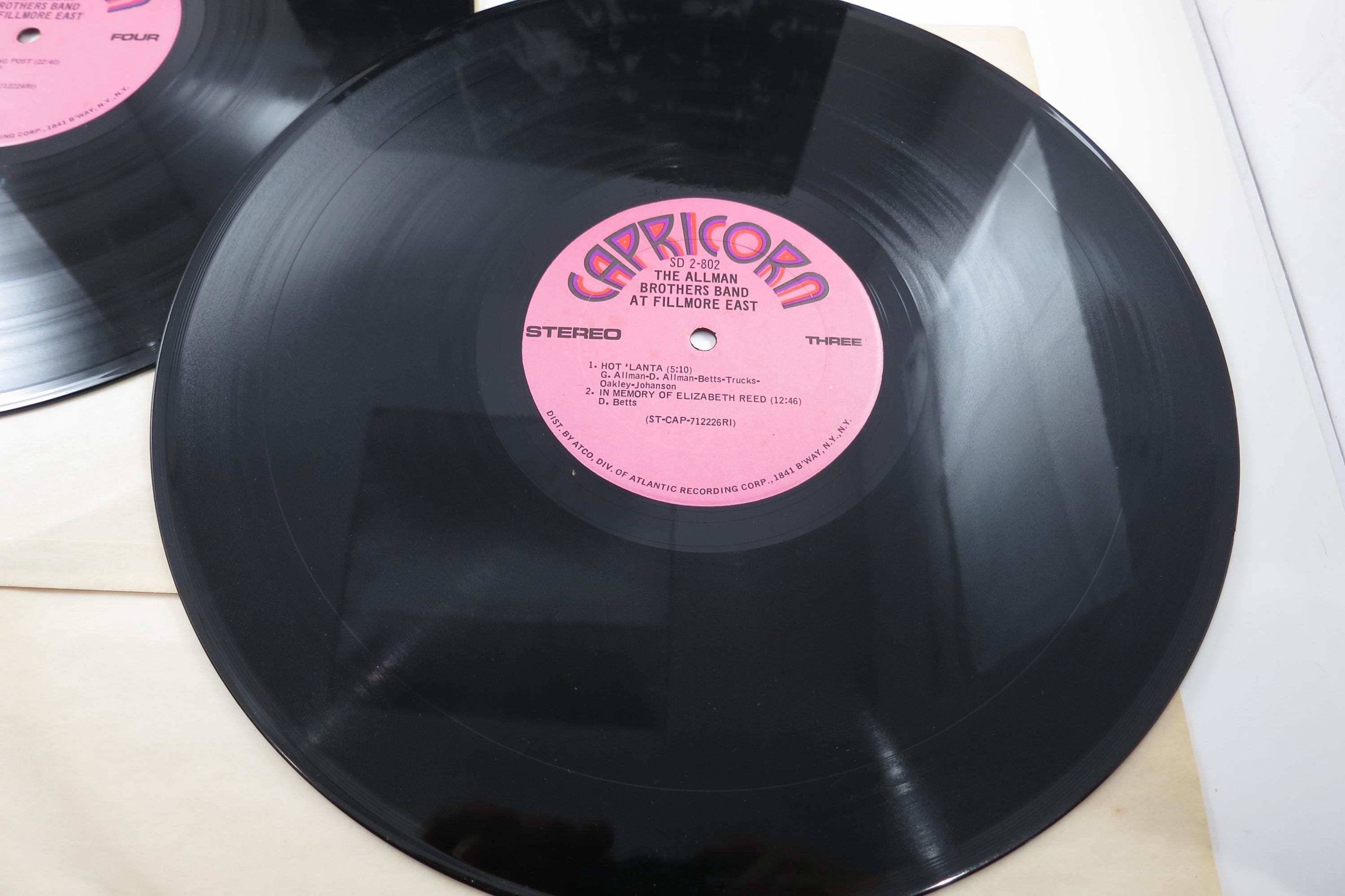 Vintage 1971 LP Vinyl Record The Allman Brothers Band at Fillmore East Excellent Condition. Original gate fold cover is in very good condition and includes the inner paper sleeves. Has a taped bottom seam. Records are both excellent and have marks. First pressing with the Pink Labels!! Tracks are as follows