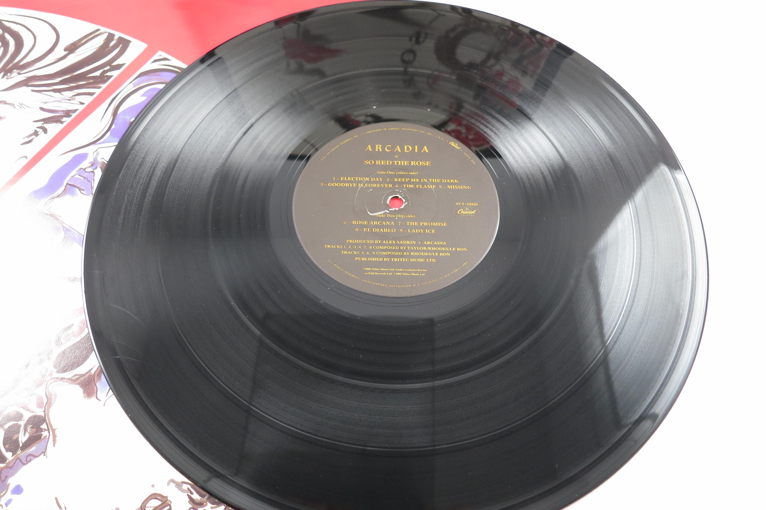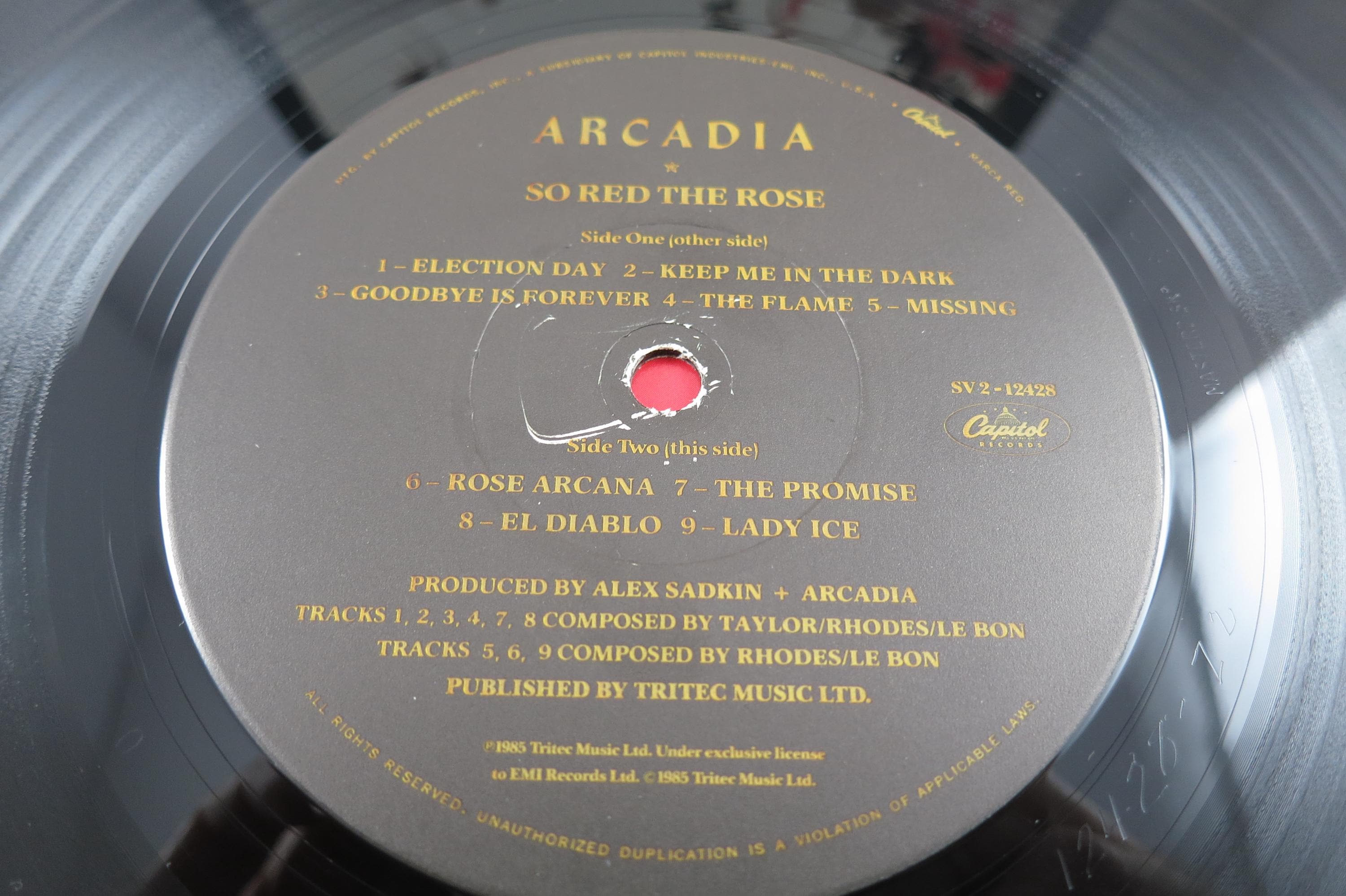 1985 Vinyl LP Rock Record So Red The Rose Arcadia Excellent Plus Condition. Original cover is in excellent condition and includes the original inner paper sleeve and the lyric insert. Record is excellent plus and is the limited Brown Translucent Vinyl Pressing!! Tracks are as follows