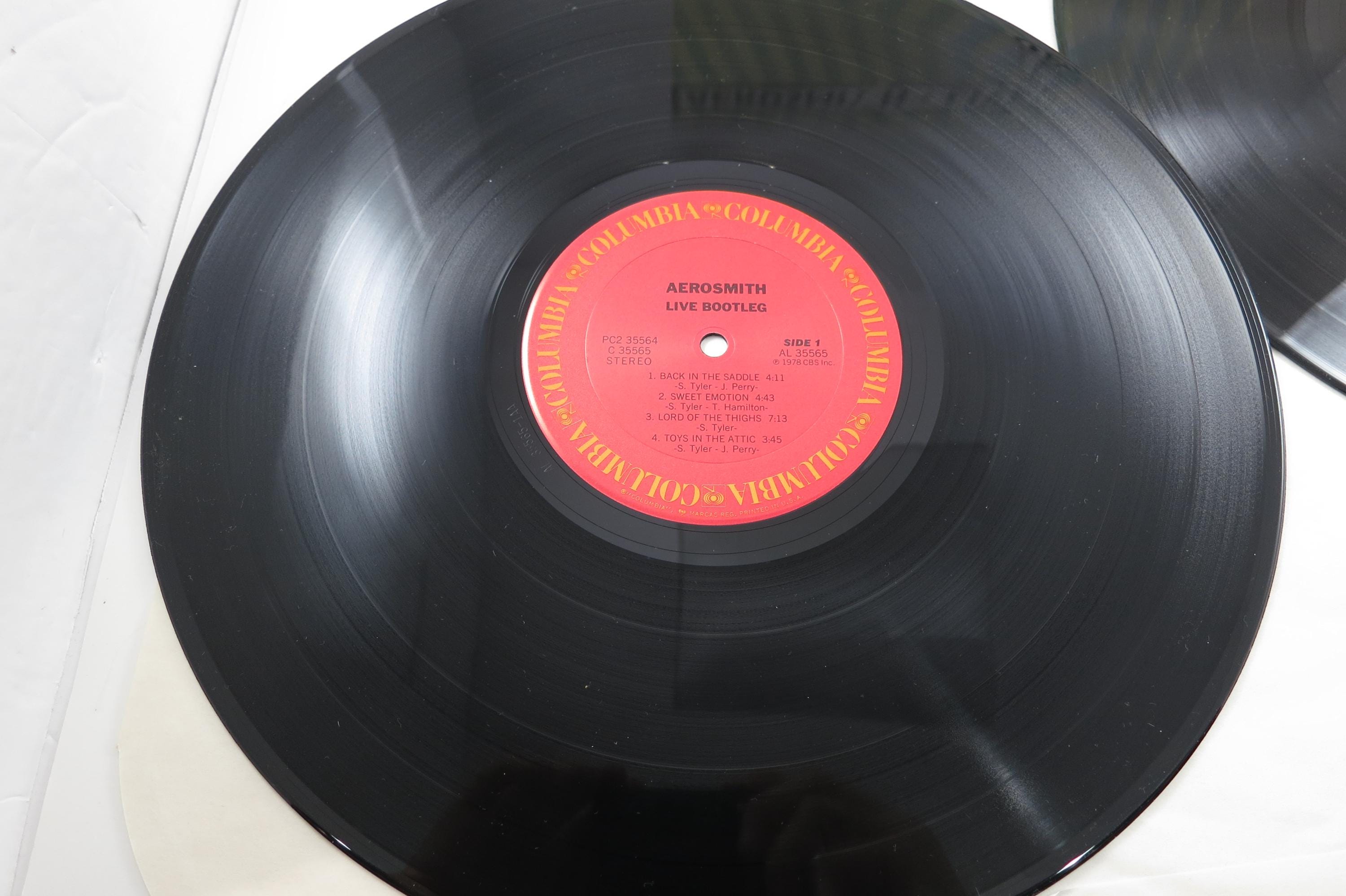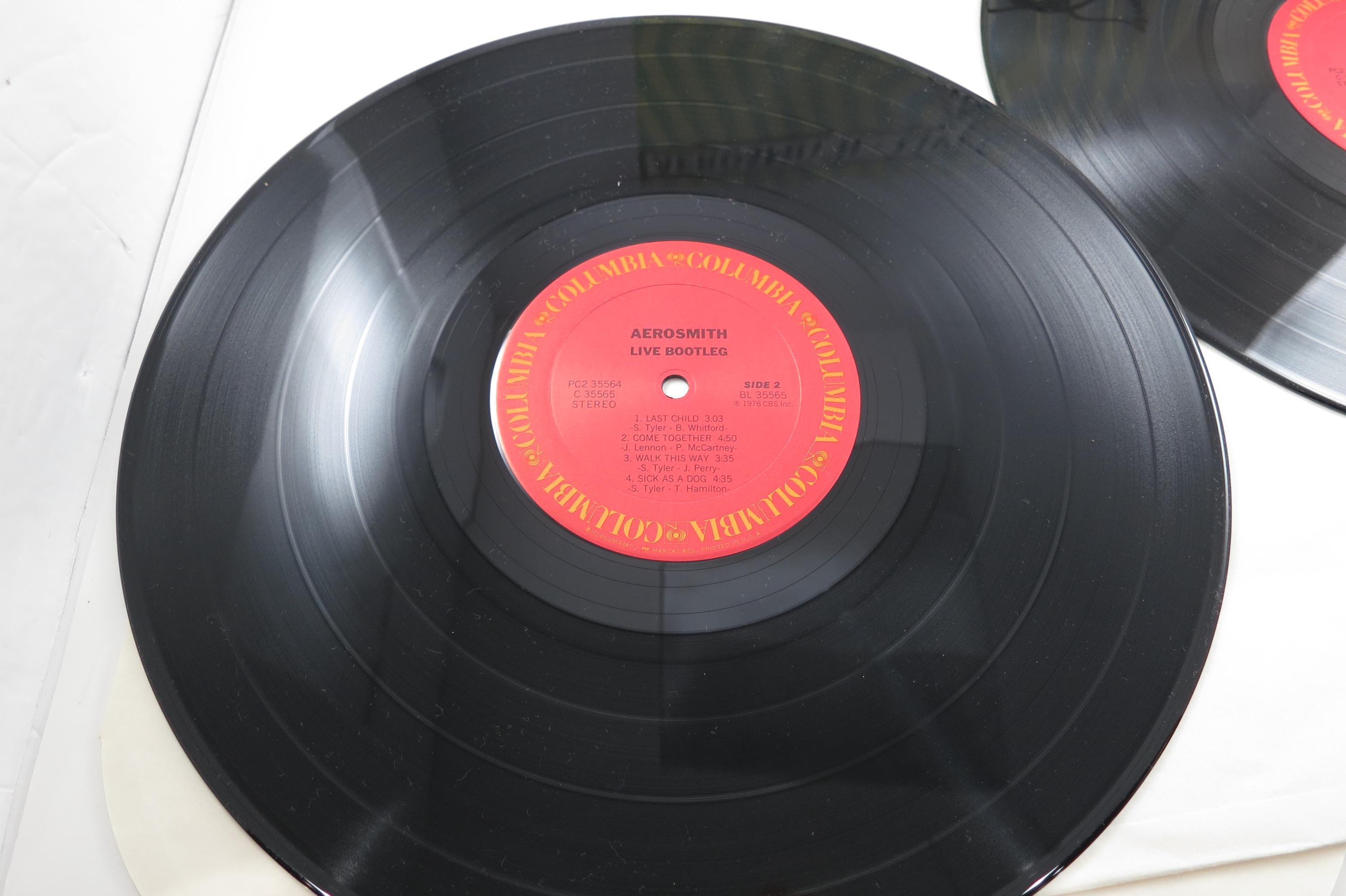 Vintage 1982 LP Record Aerosmith Live Bootleg Two LP Set. Original gate fold cover is in Near Mint condition and includes both inner paper sleeves. Both records are Near Mint as well. Great Gift or addition to any collection. Tracks are as follows