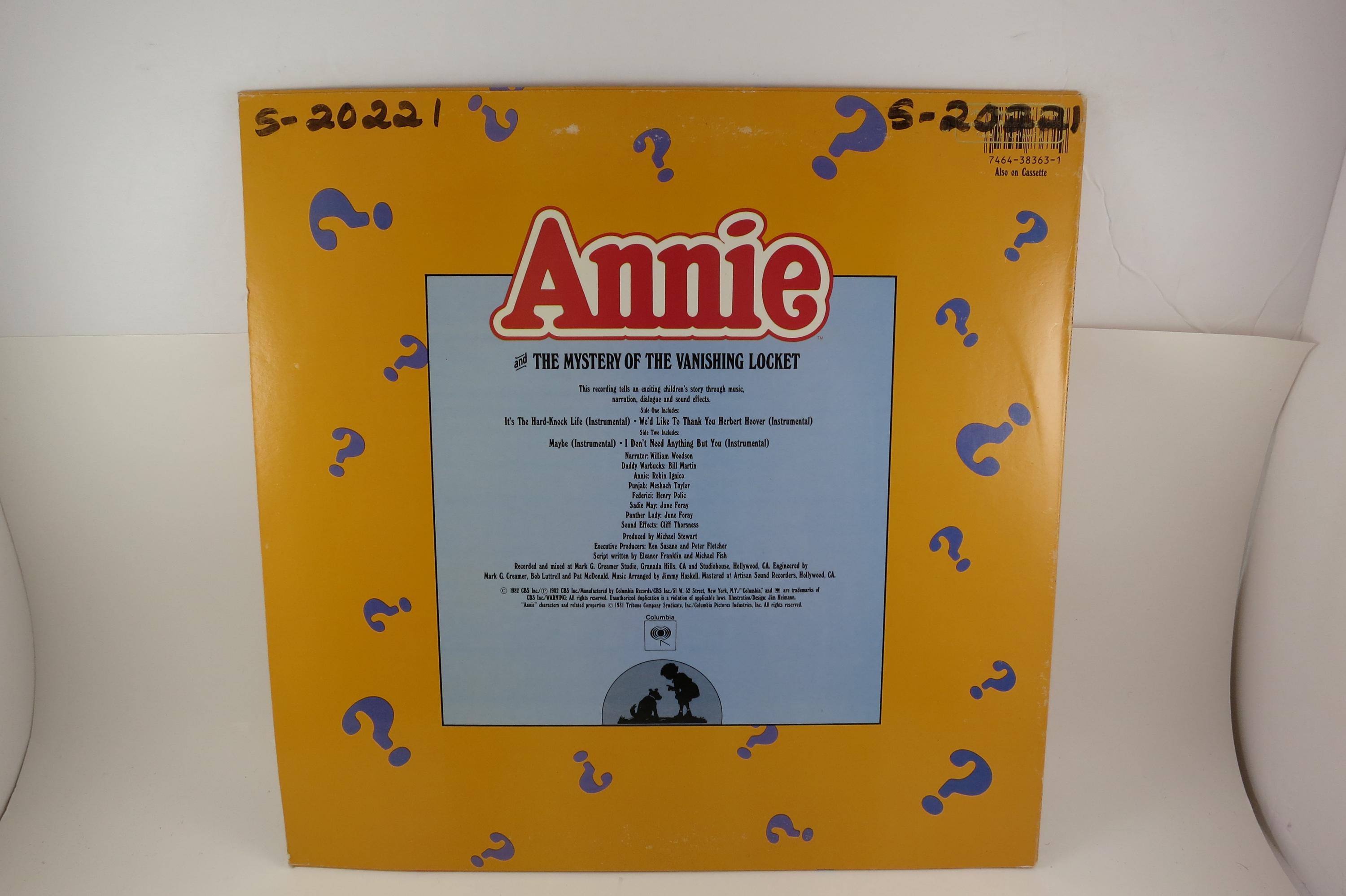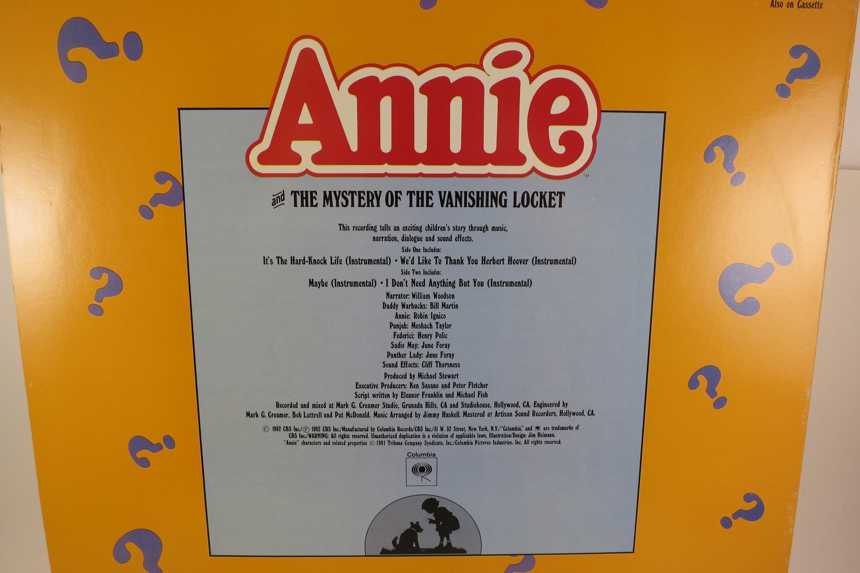 Vintage 1982 Vinyl LP Record Annie The Mystery of the Vanishing Locket Promo NM. Original cover is In excellent condition and includes the inner paper sleeve. Record is Near Mint. Has numbering on the cover and labels.