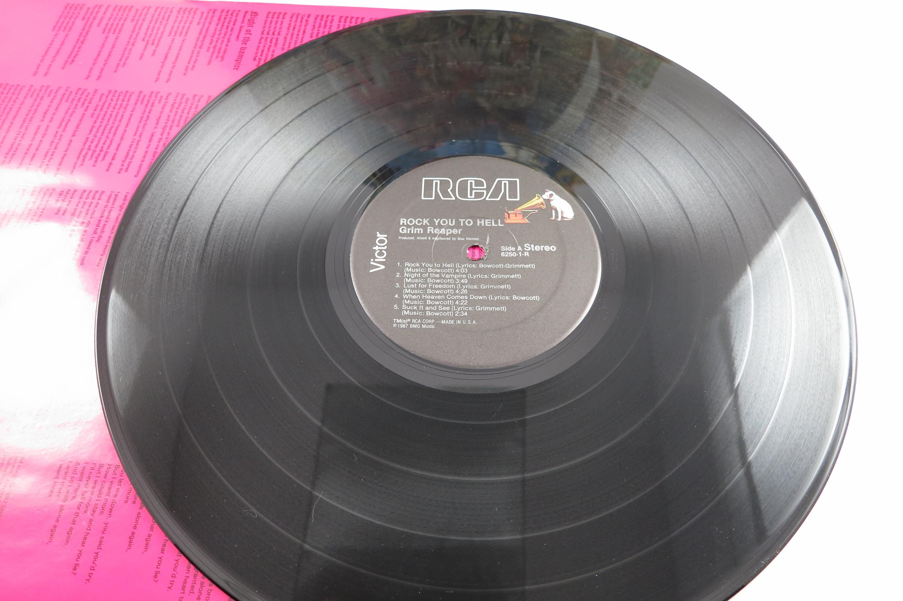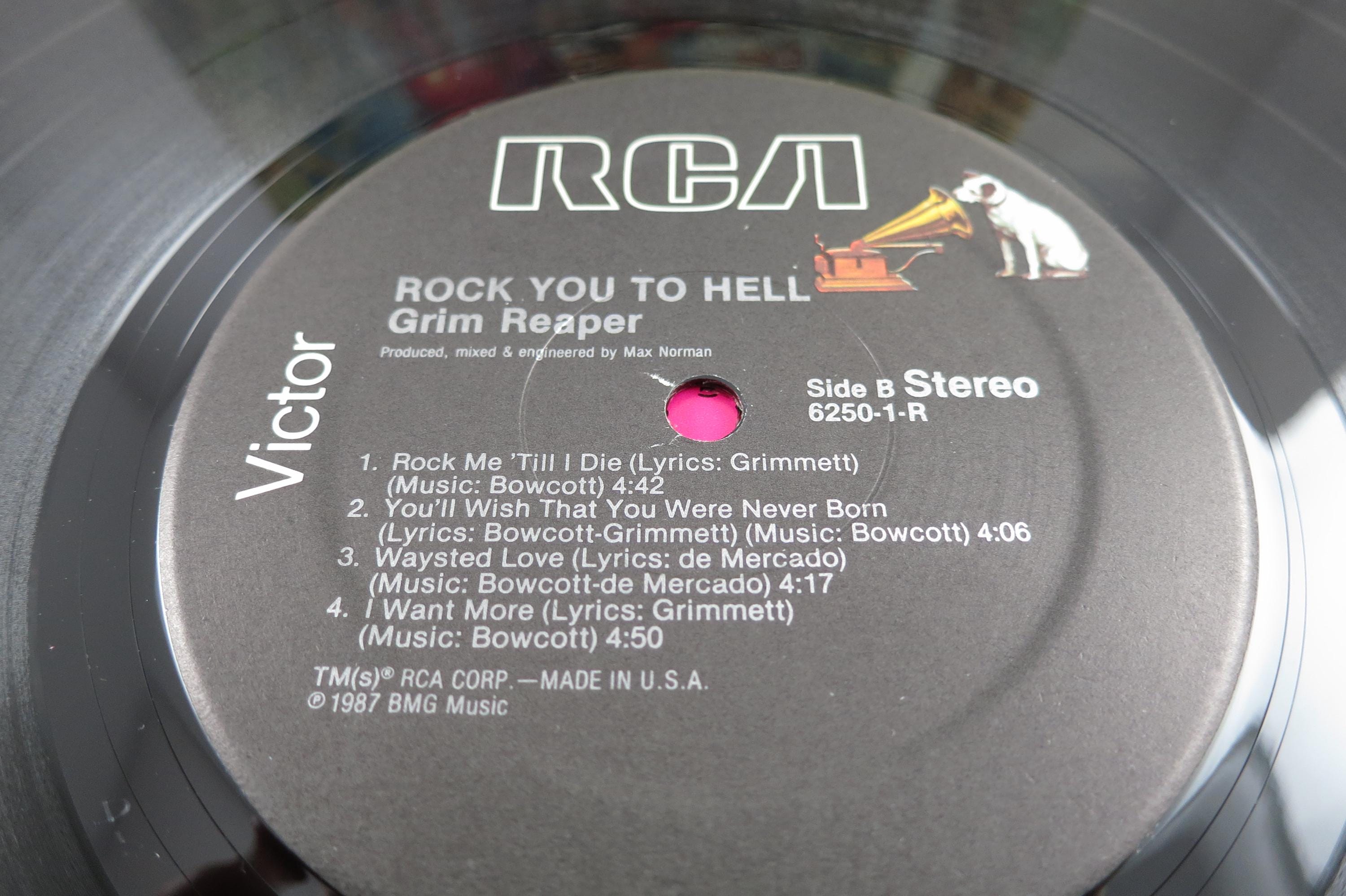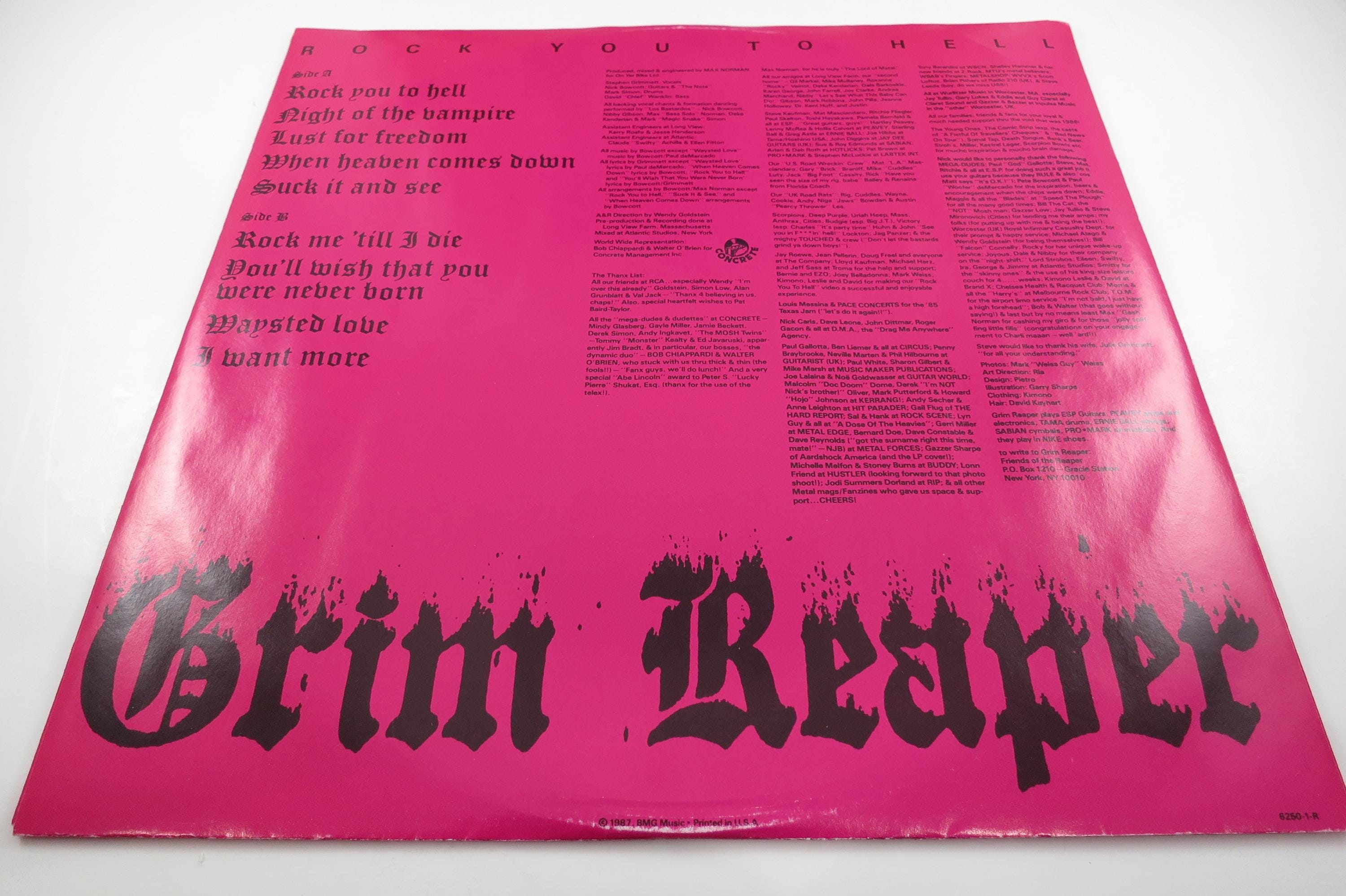 1987 Vinyl LP Record Rock You to Hell Grim Reaper Near Mint Condition. Original cover is in Near Mint condition and includes the original inner paper sleeve. Record is Near Mint as well. Tracks are as follows