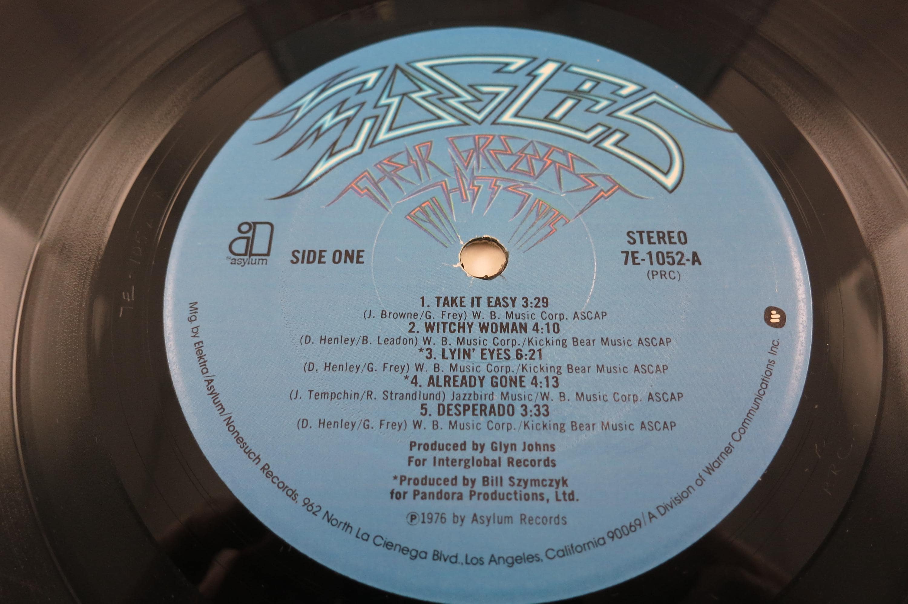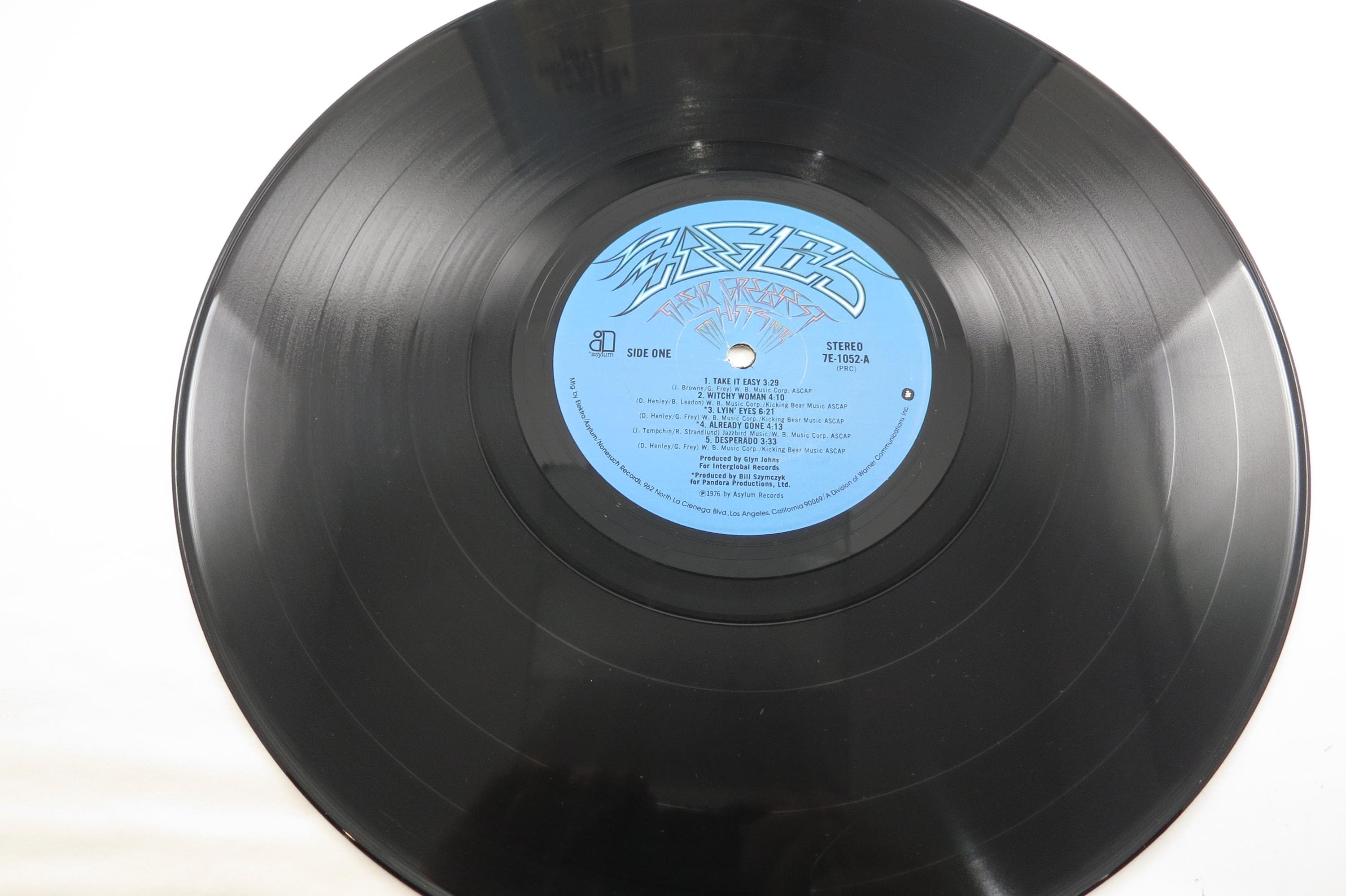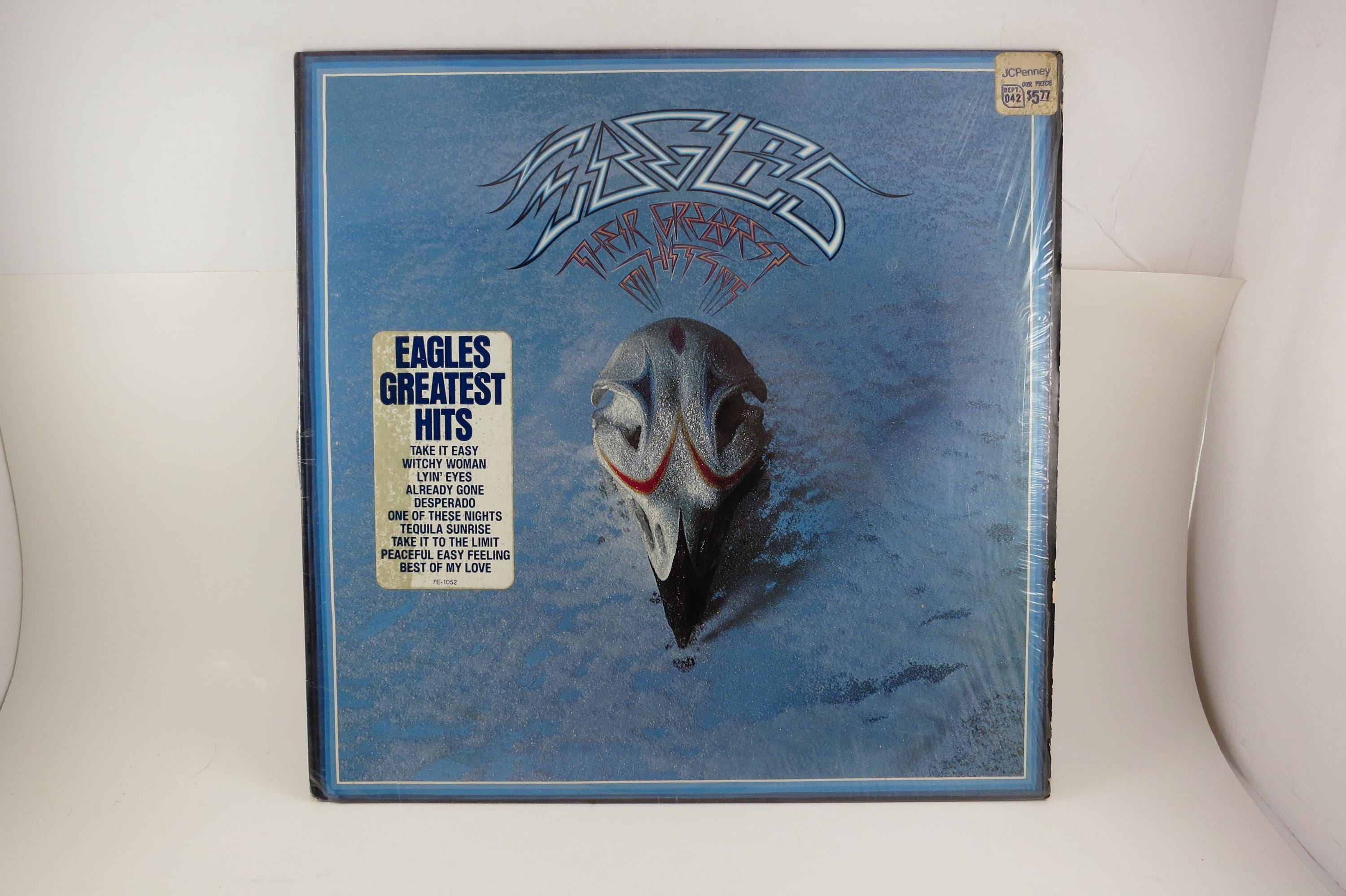 Vintage 1976 LP Vinyl Record The Eagles Greatest Hits Excellent Condition. Original cover is in excellent condition and includes the inner paper sleeve and factory shrink wrap, as well as the hype sticker. Record is excellent with a few light marks that do not affect the play. Tracks are as follows