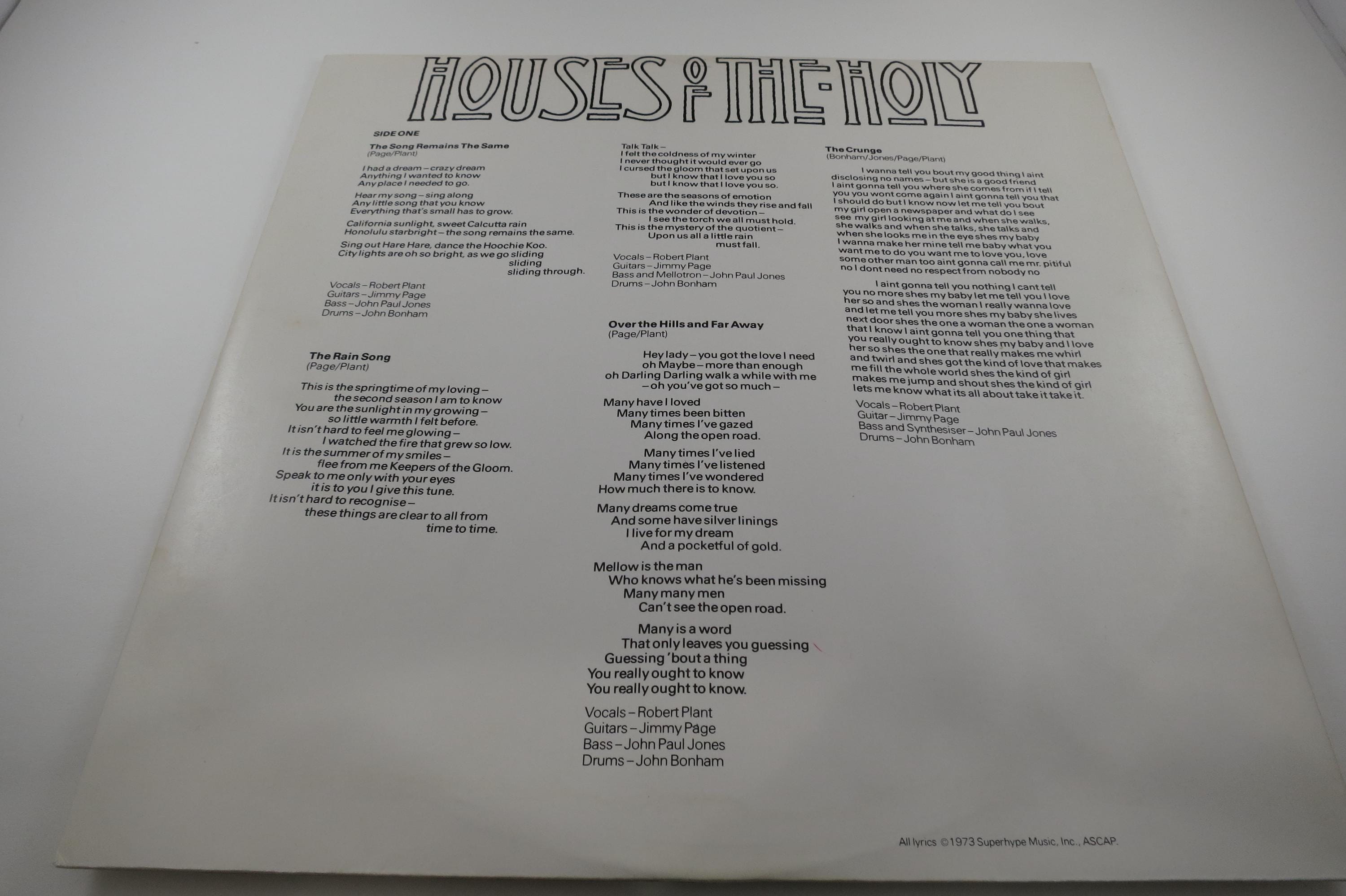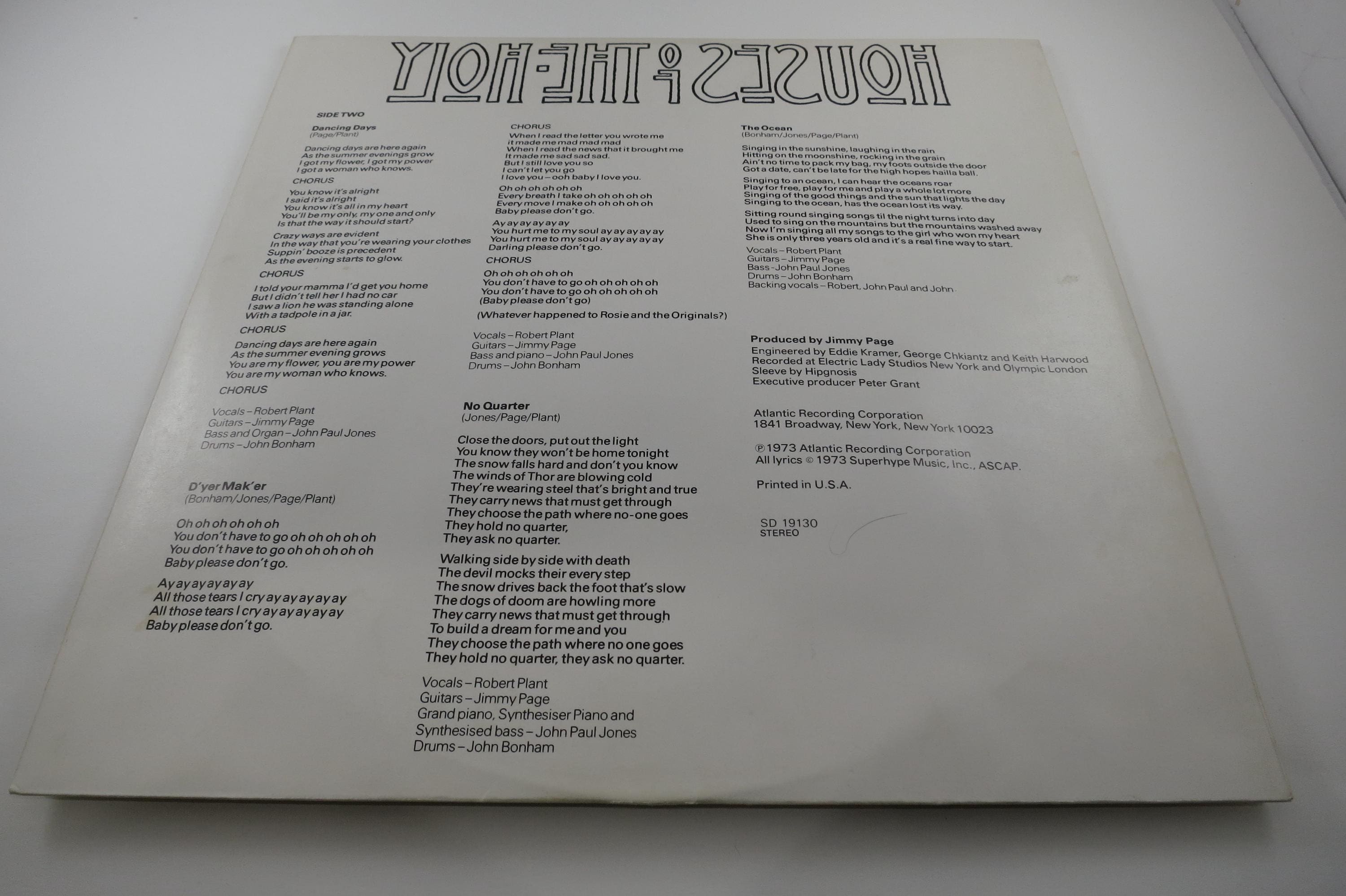 Vintage 1973 LP Vinyl Record Led Zeppelin Houses of the Holy Excellent Condition. Original gate fold cover is very good and includes the original inner sleeve. Record is excellent plus. Tracks are as follows