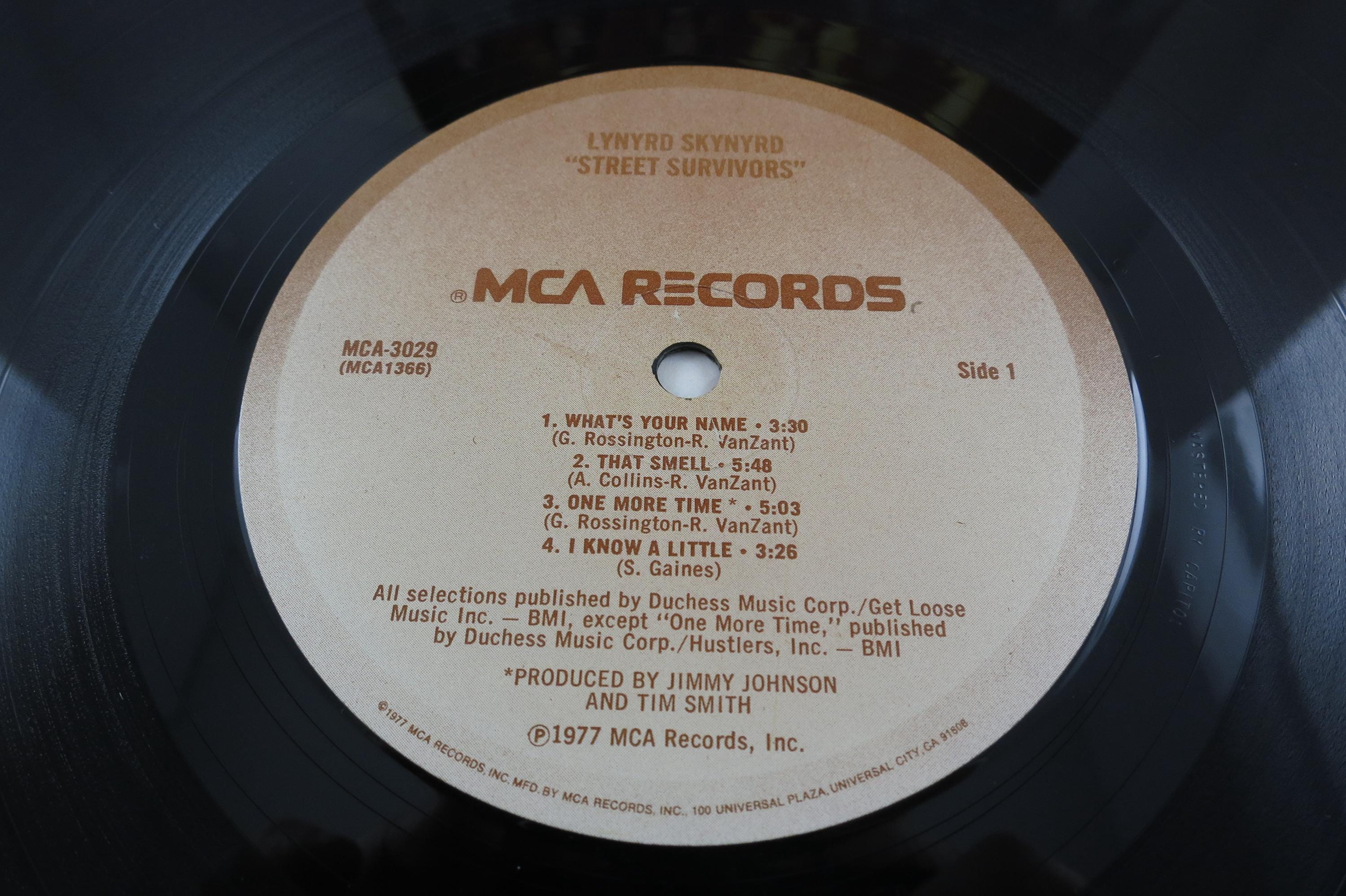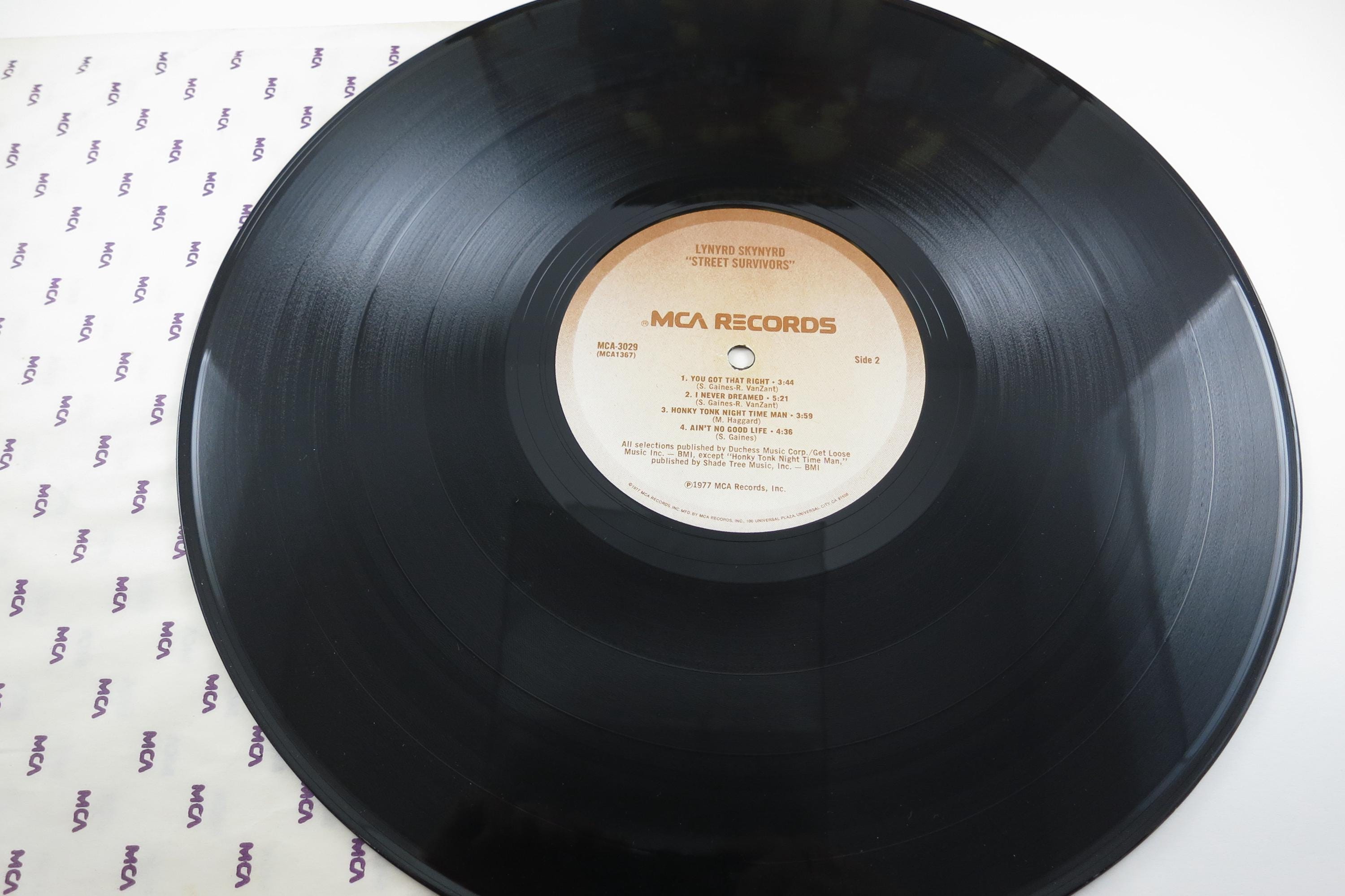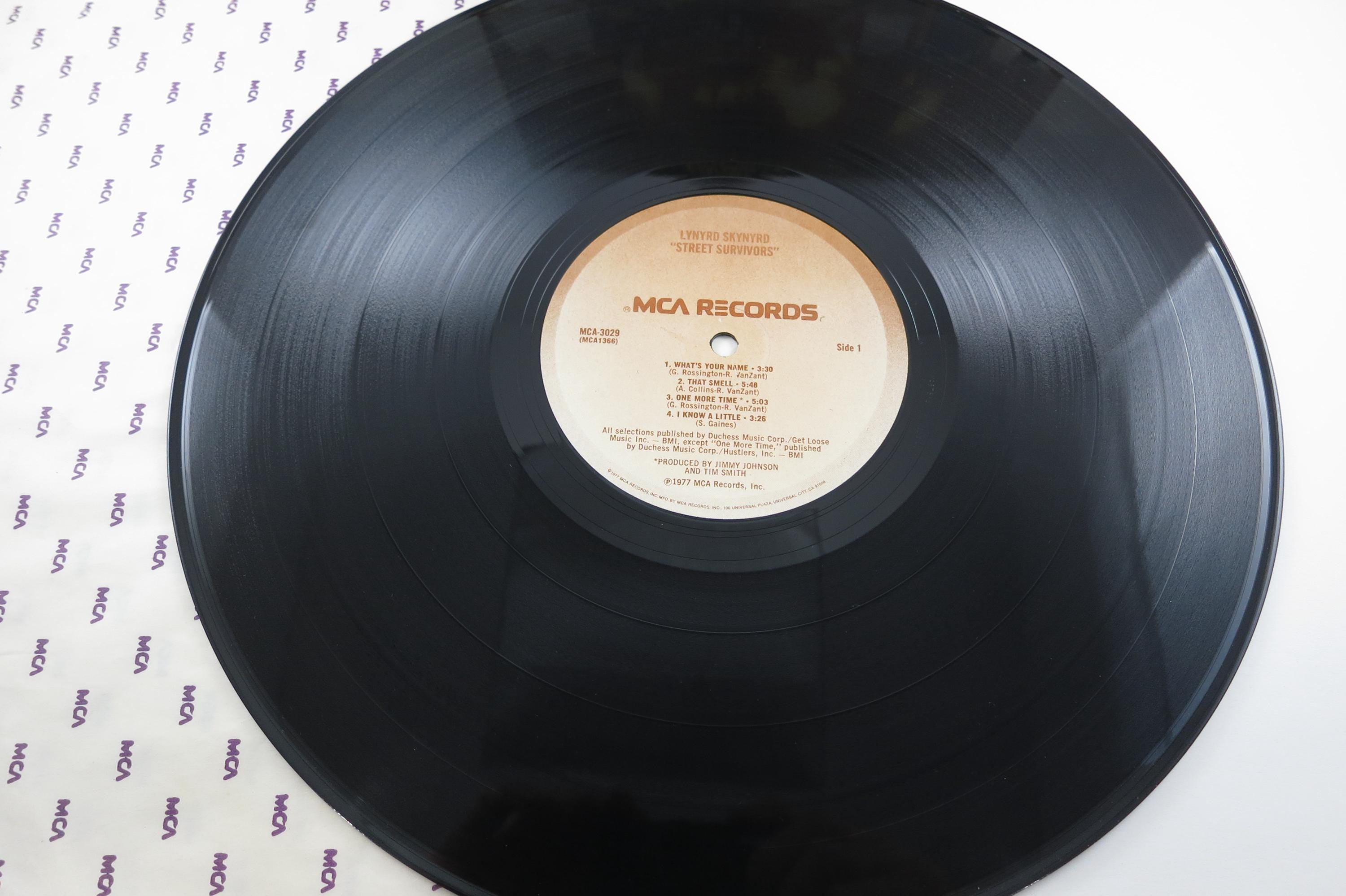Vintage 1977 Vinyl LP Record Lynyrd Skynyrd Street Survivors Excellent Condition. Original cover is in very good condition and the record is in excellent condition. Includes the original insert as well. This is an original US pressing, which was released only three days before the fatal plane crash on October 20, 1977 that claimed the lives of Skynyrd Members Ronnie Van Zant, Steve Gaines, Cassie Gaines, Dean Kilpatrick and the pilots. Out of respect for Steve Gaines, who was the primary figure engulfed in fire on the cover, as well as respect for the others, the cover was withdrawn by MCA records and changed to a similar cover without the flames. As this version was pressed for only a short time, it is far harder to find than the other version of this album. Contains both of the original inserts as well.