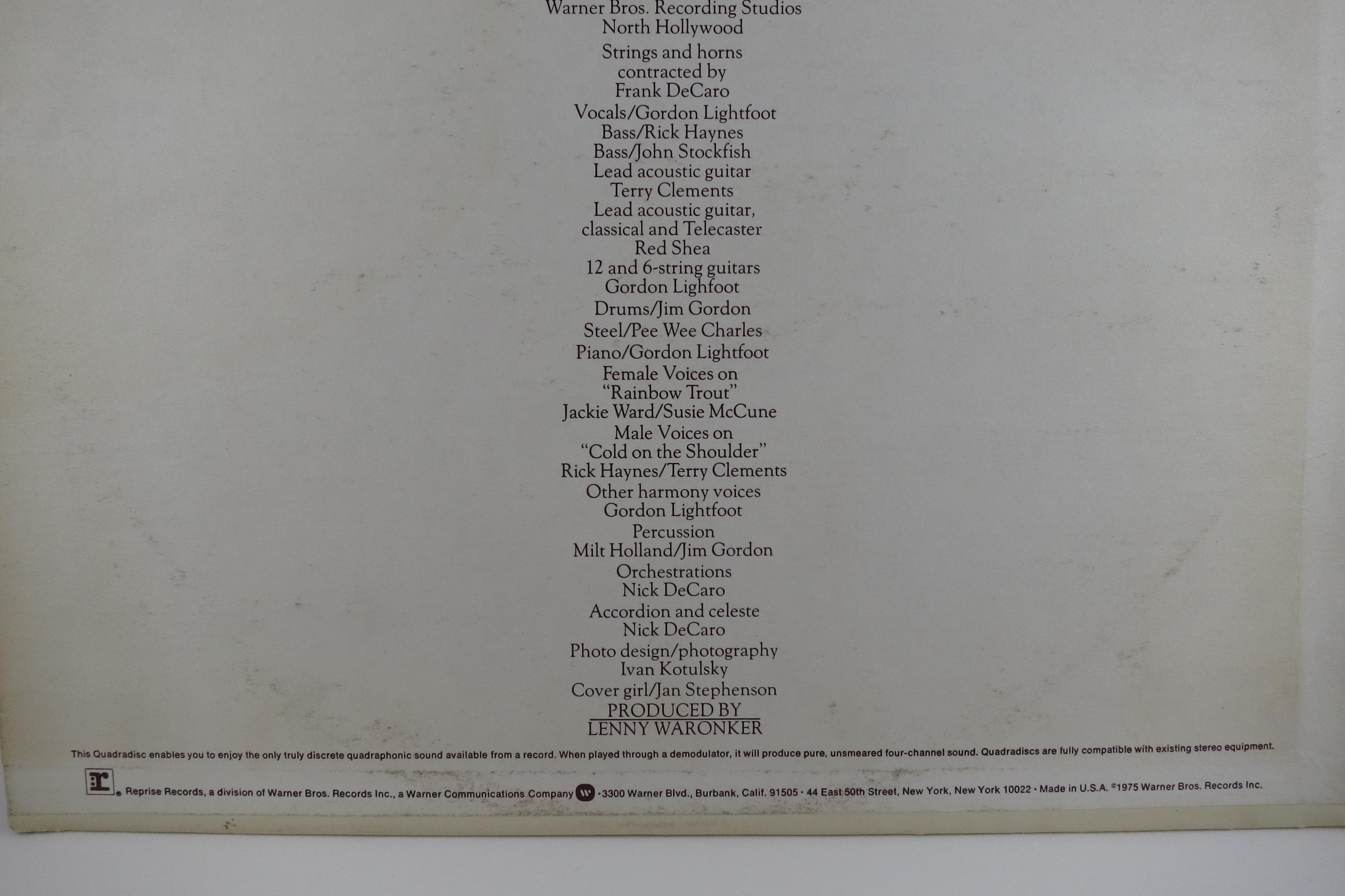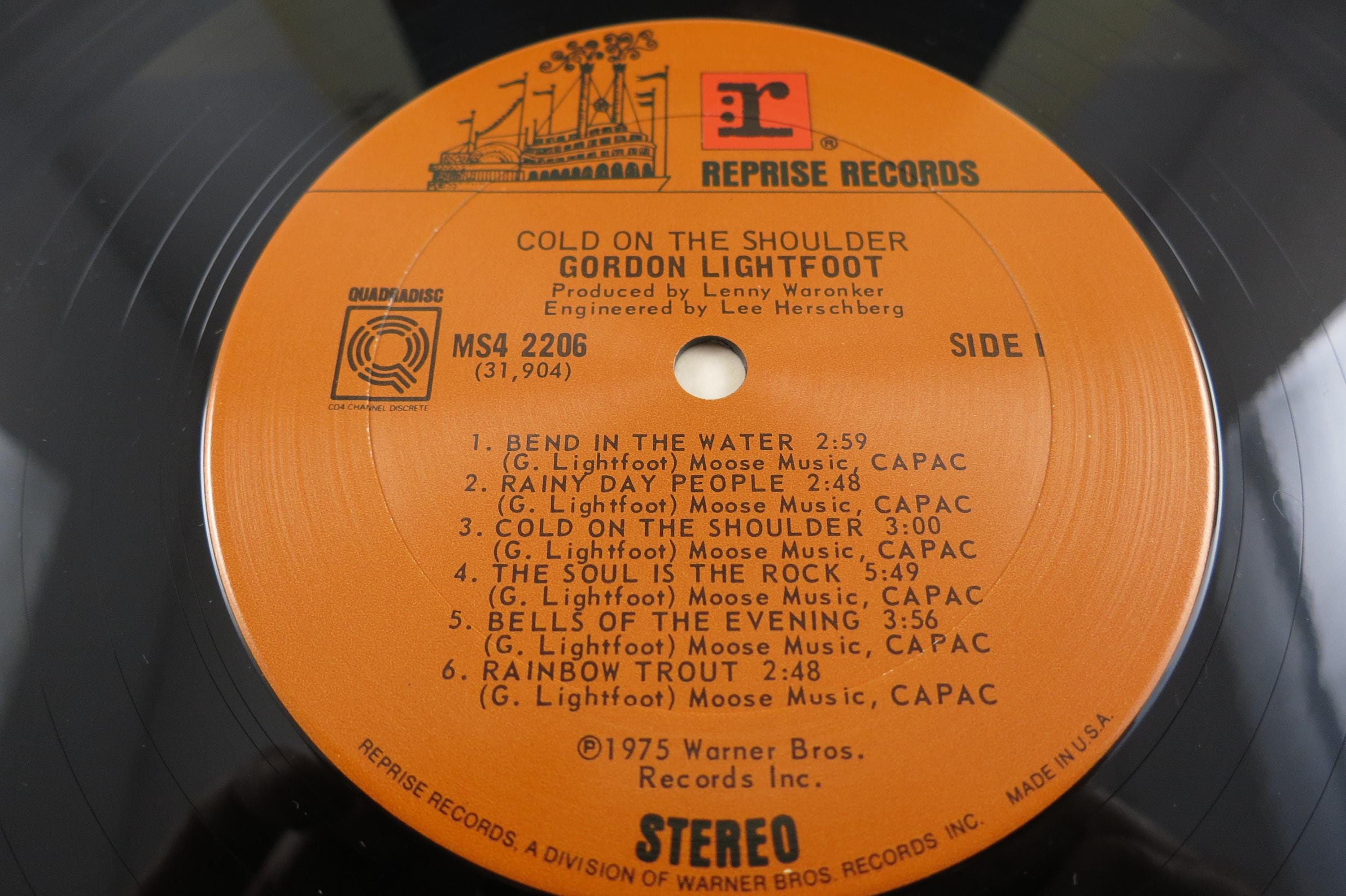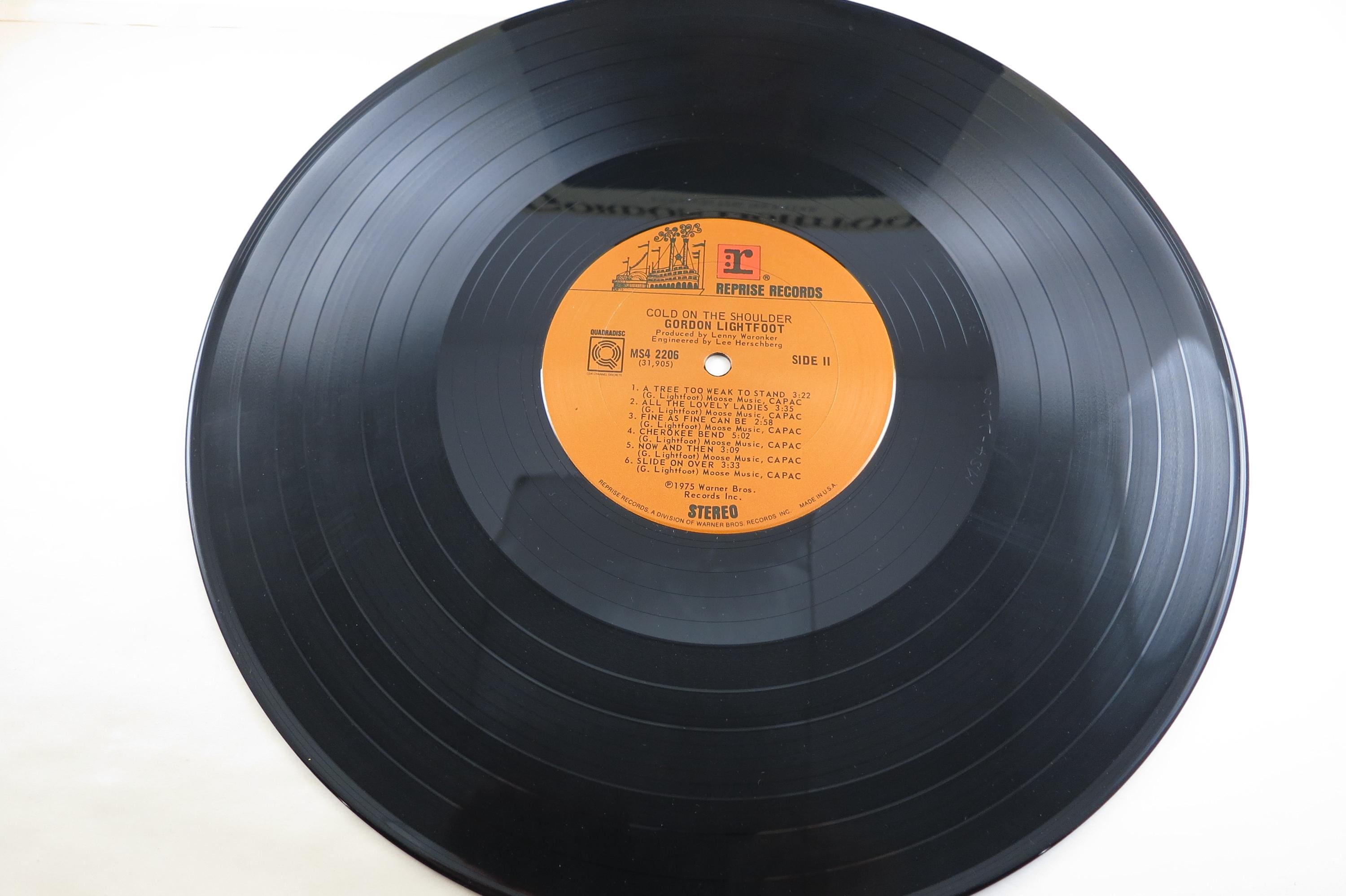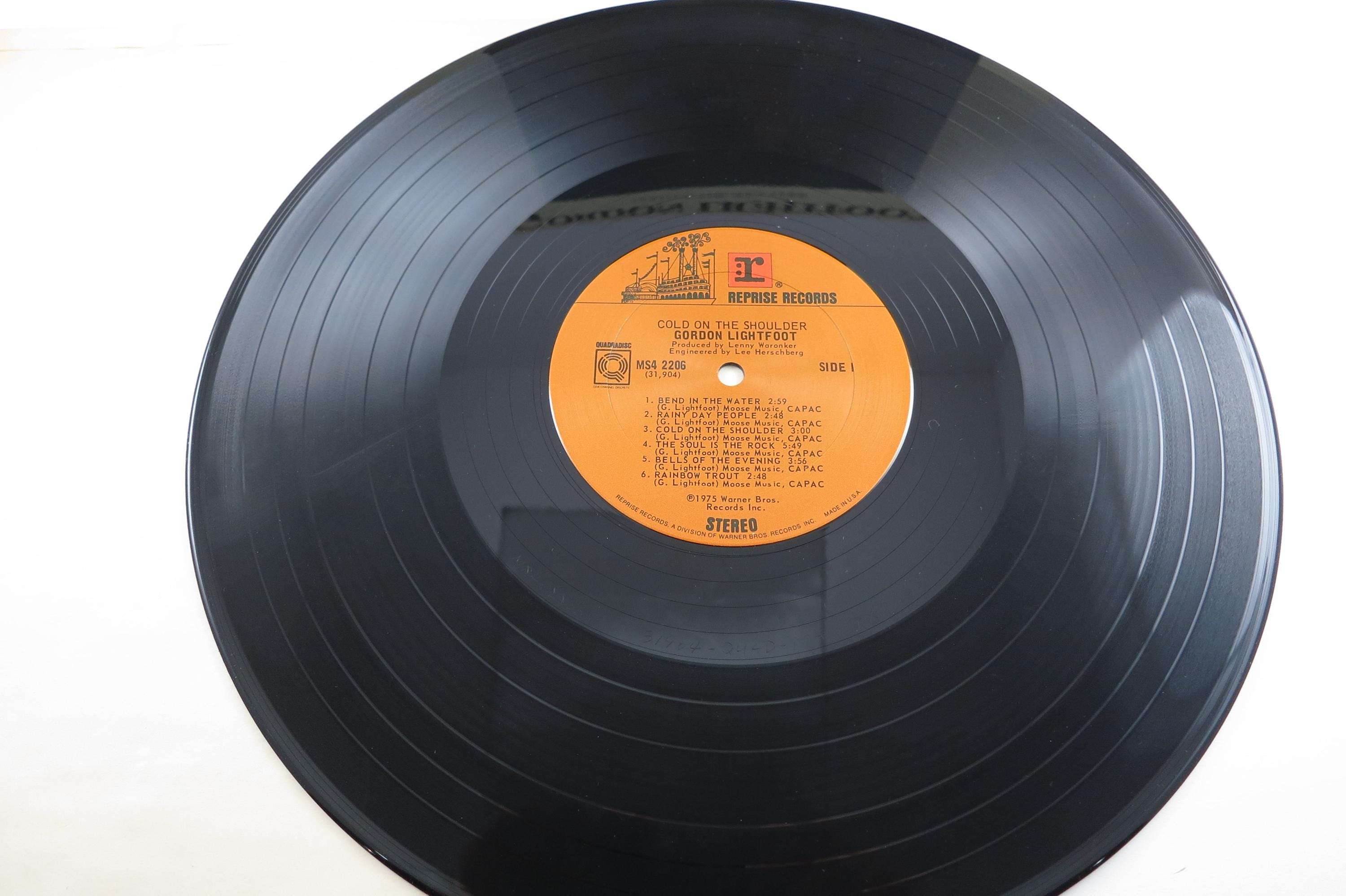 1975 Gordon Lightfoot Vinyl Record, Cold On The Shoulder Quadradisc EX. Original cover is in excellent condition and includes the inner sleeve. Has spine wear. Record is excellent as well. Superior quality Quadradisc pressing.