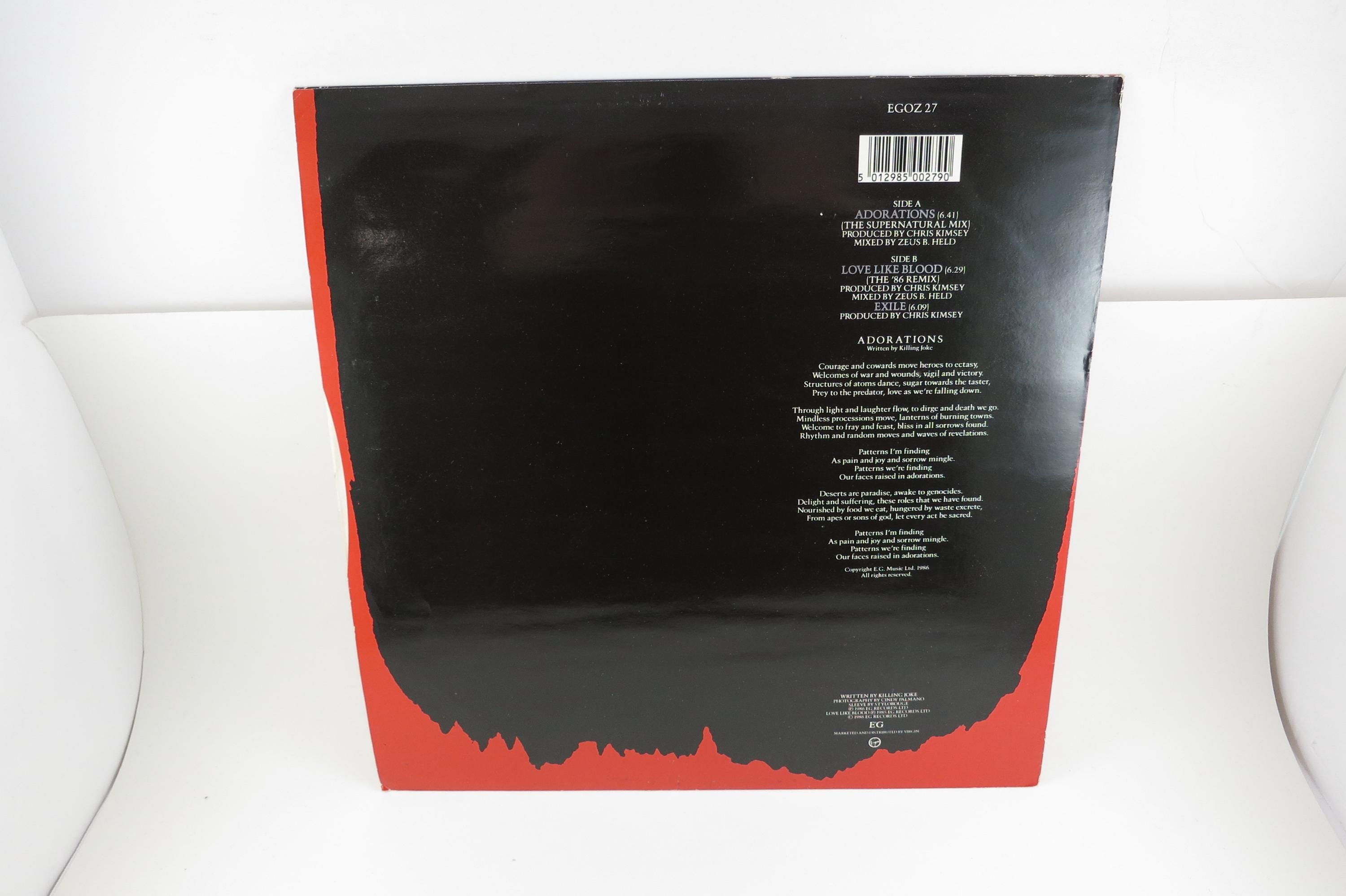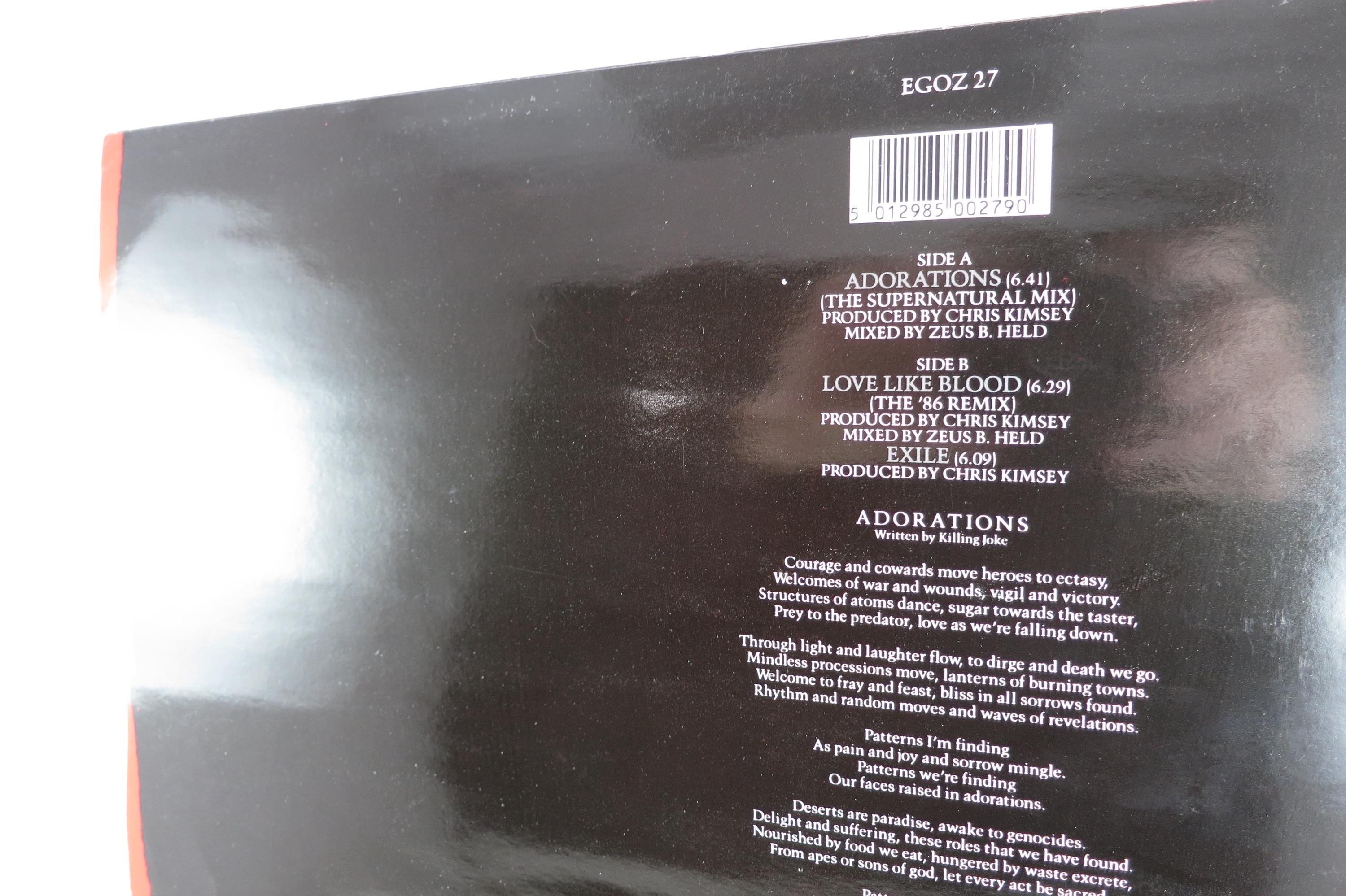 Vintage 1986 EP Vinyl Record Killing Joke Adorations EX. Original cover is excellent and includes the inner paper sleeve. Record is the is also excellent. Tracks are as follows