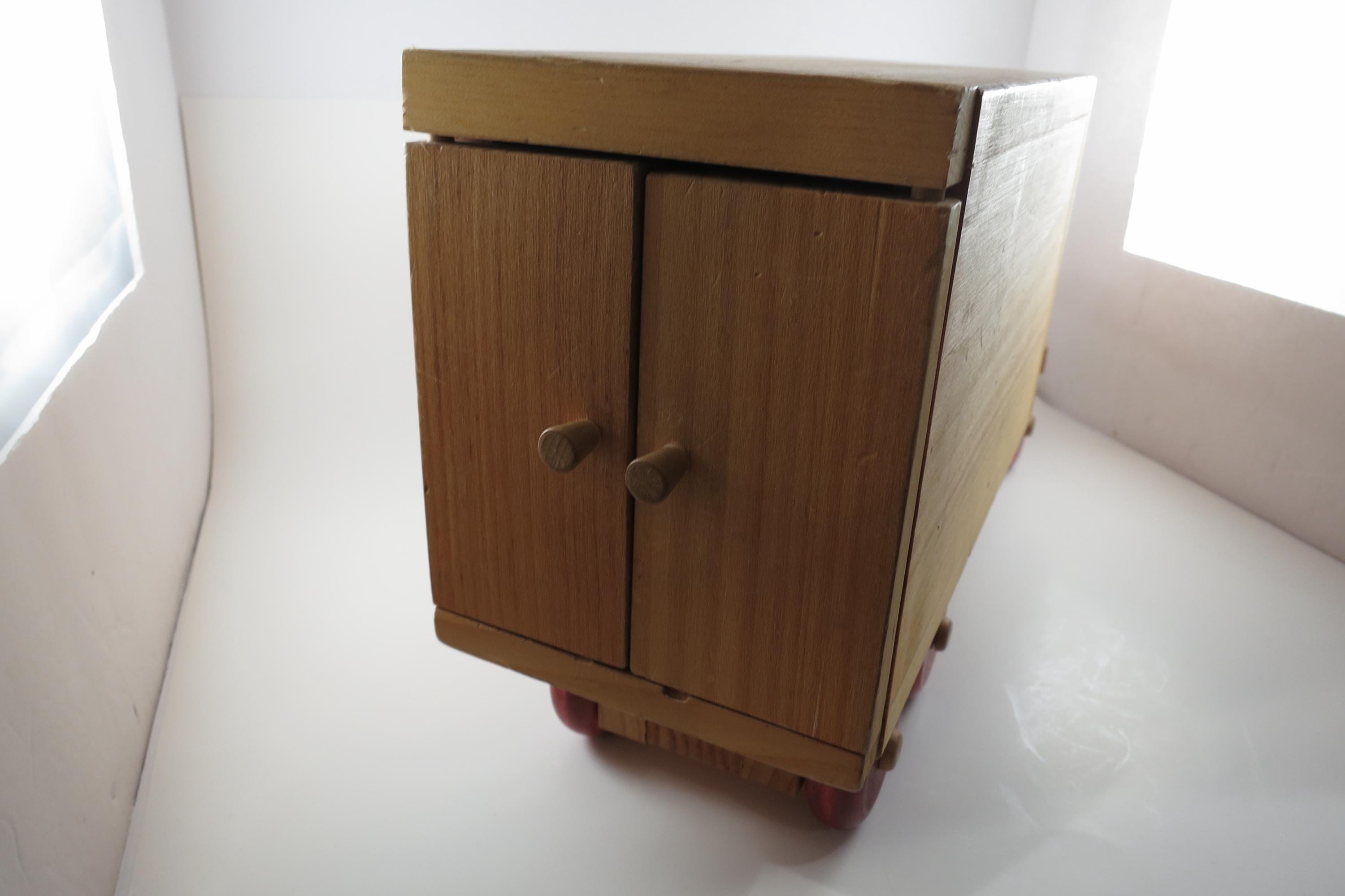 Excellent Original Condition, One of the larger pieces from this line. Measures 19 1/2 inches long, 5 1/4 inches wide and 9 1/2 inches tall. Rear doors open onto a storage/cargo space, wheels roll freely.