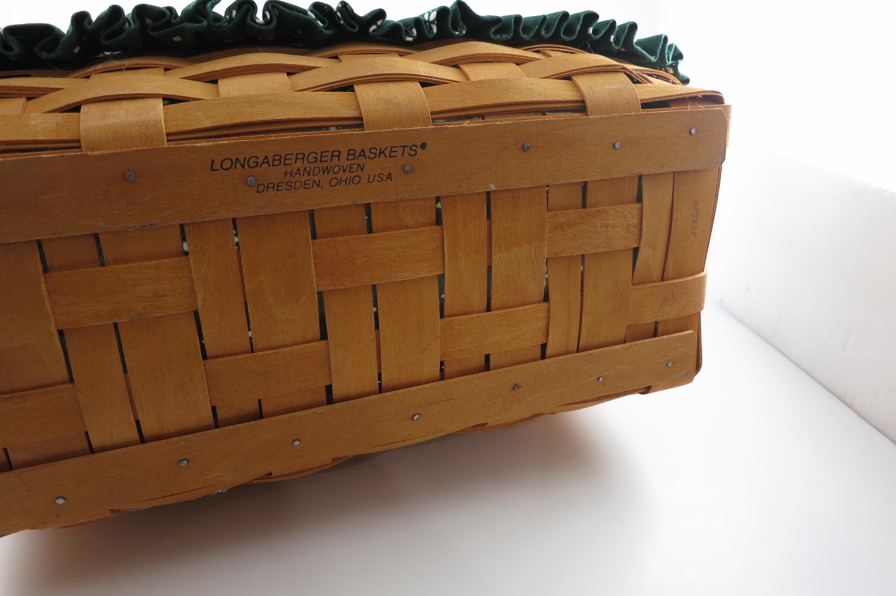 2000 Longaberger Slanted Desktop Basket: Signed & Dated Liner Protector. As with all Authentic Longabergers, this one is artist initialed and dated on the bottom. Measures 14 1/2 inches wide, 8 inches deep and 6 1/4 inches tall in the back, front is 4 1/2 inches tall. Looks great on the desk! Has the plastic insert protector and green liner. Very nice basket!