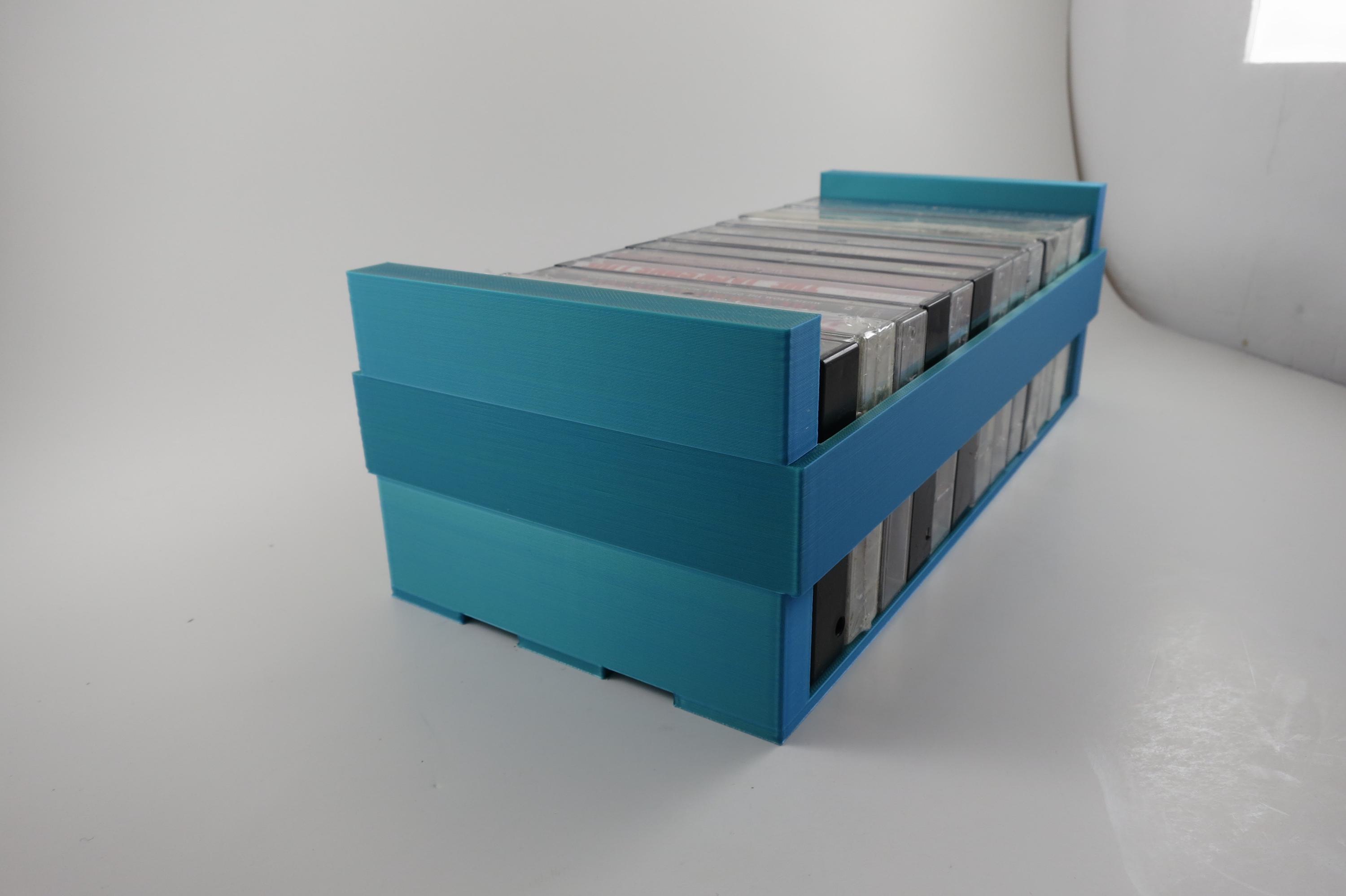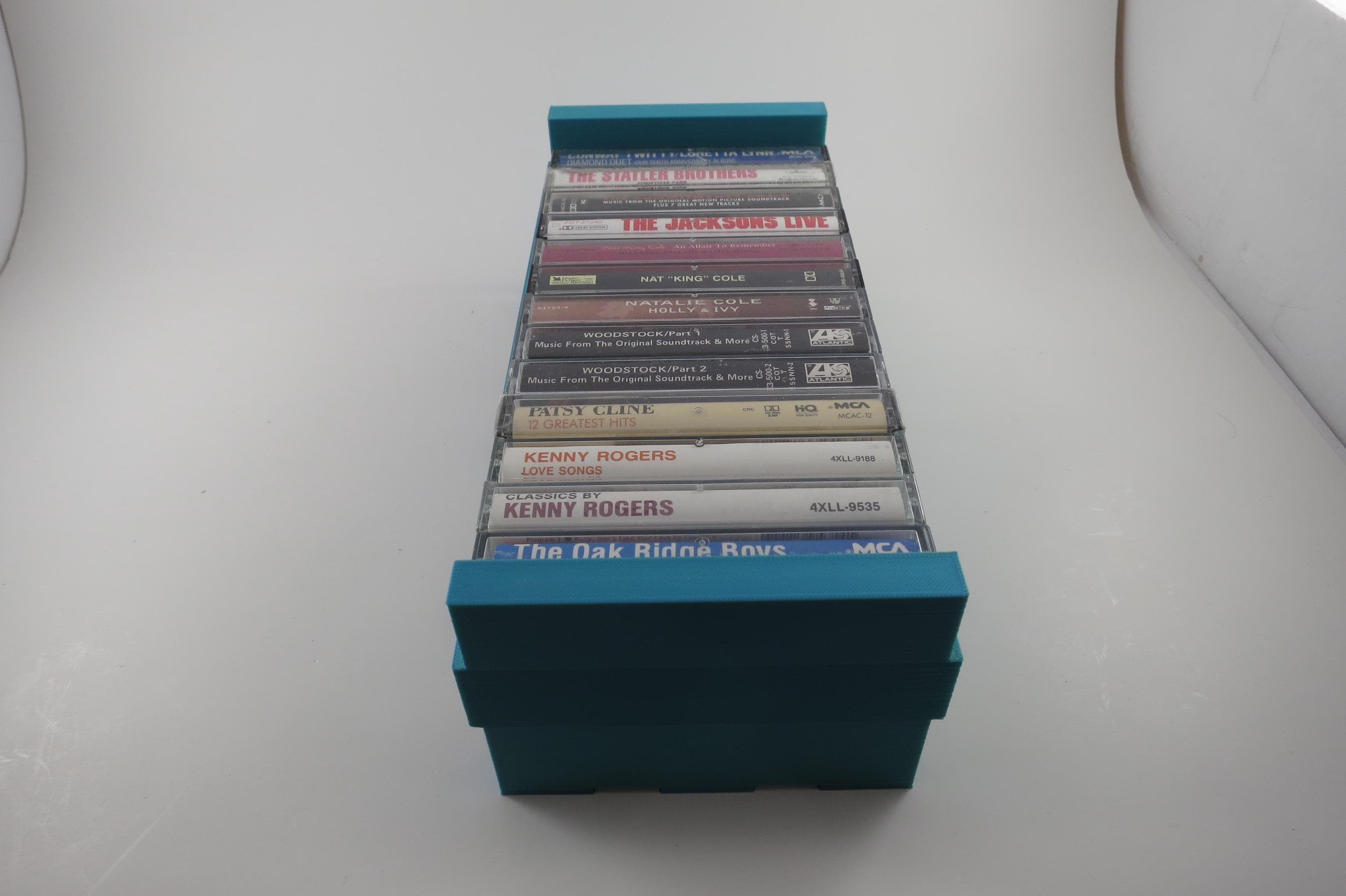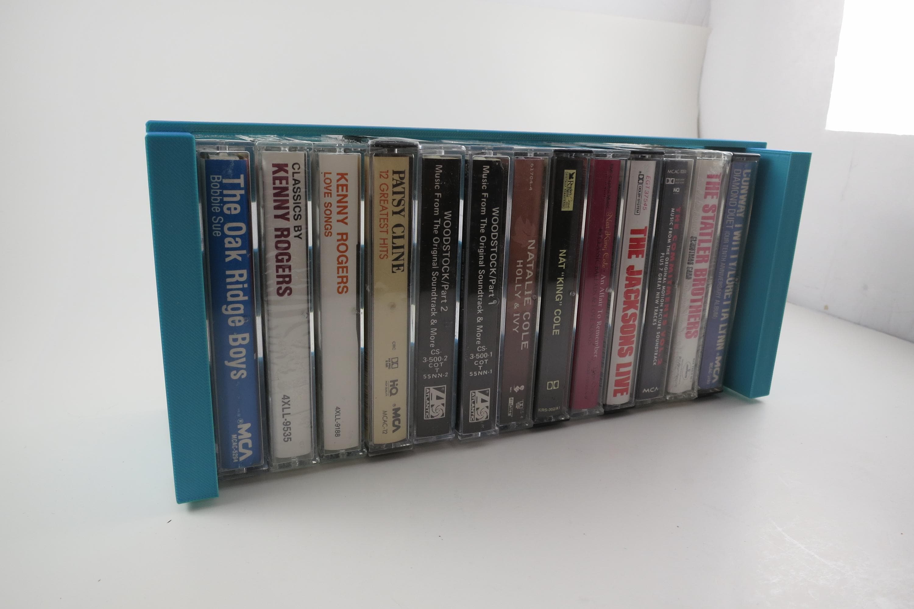 Custom 3D Printed 13 Cassette Holder In Teal Cassette Display. Similar design to the little wooden ones you see, but much more modern and sturdy! Measures 10 inches long, 4 1/2 inches wide and 3 1/2 inches tall. Will hold 13 cassette tapes in their cases. Can be displayed vertical or horizontal, these can also be stacked.