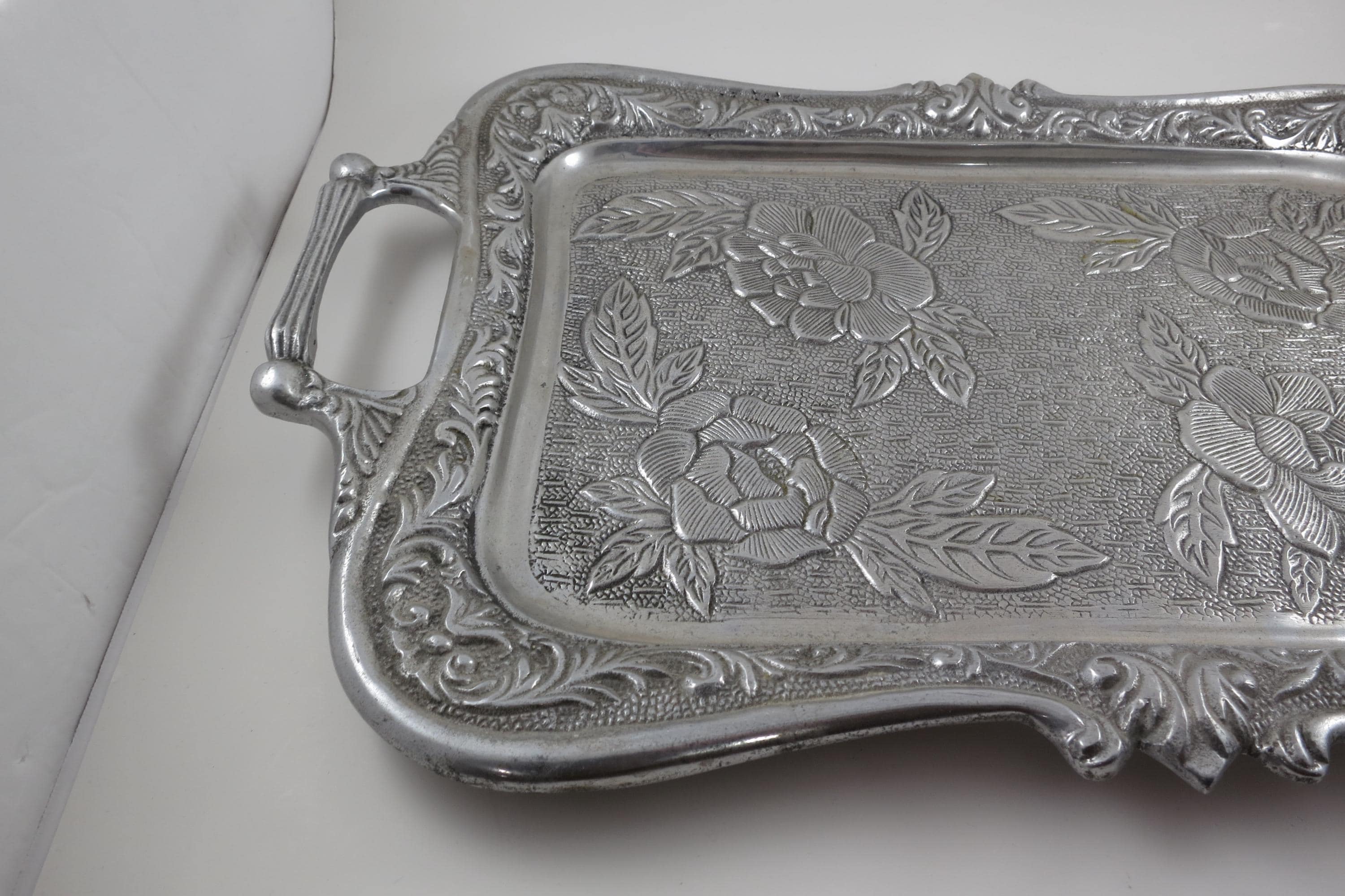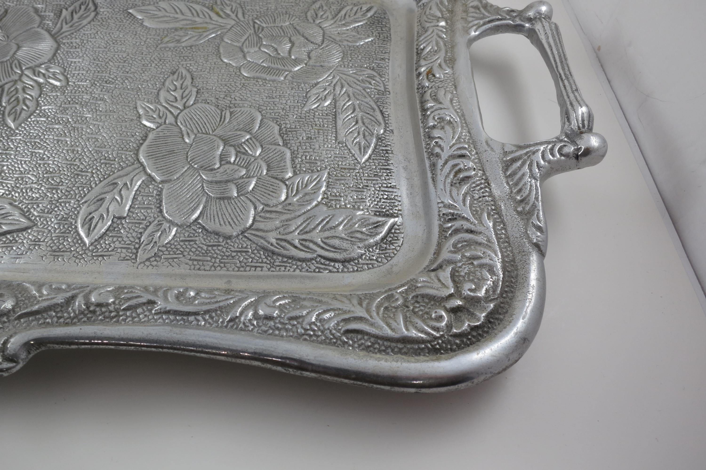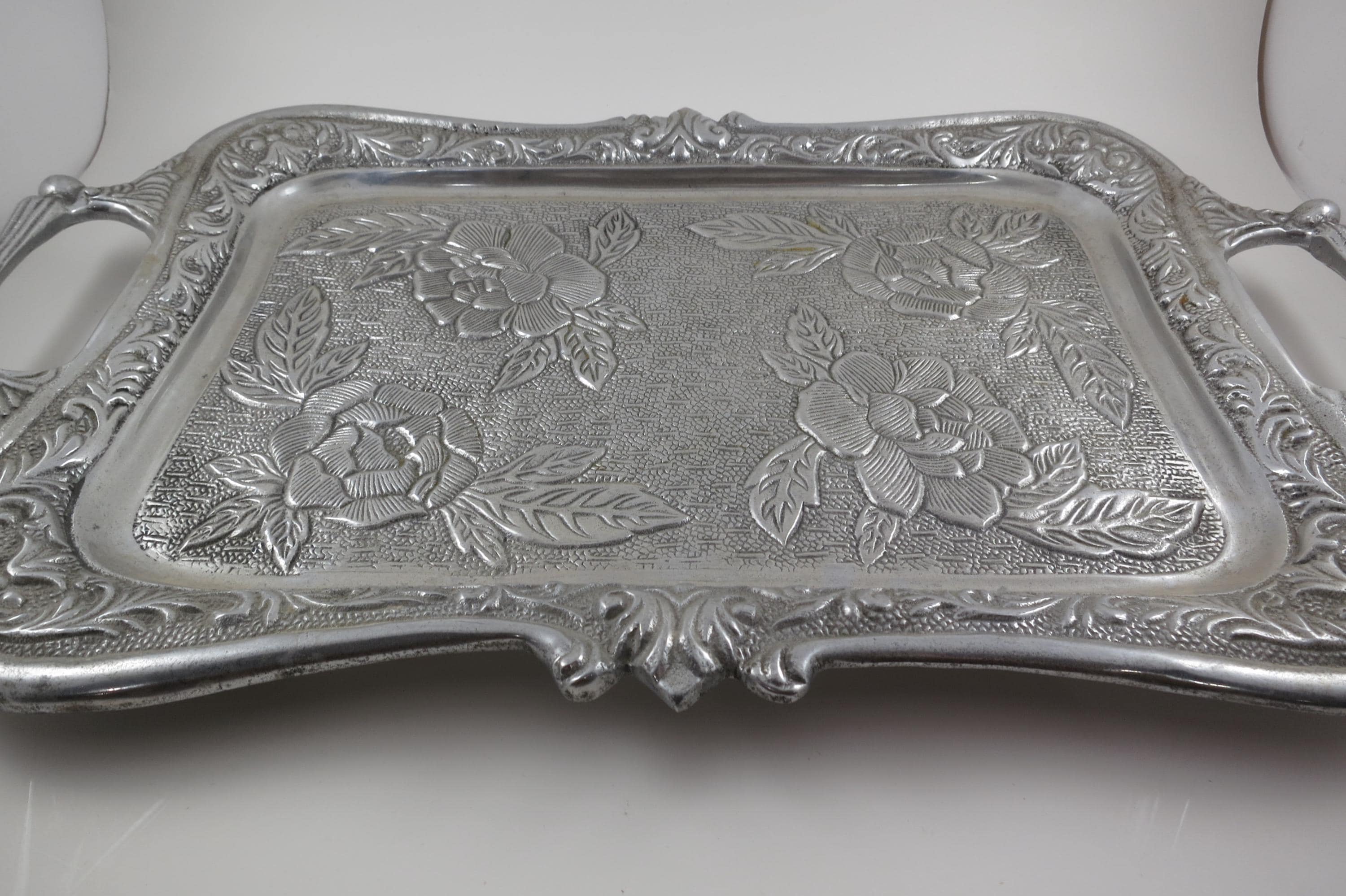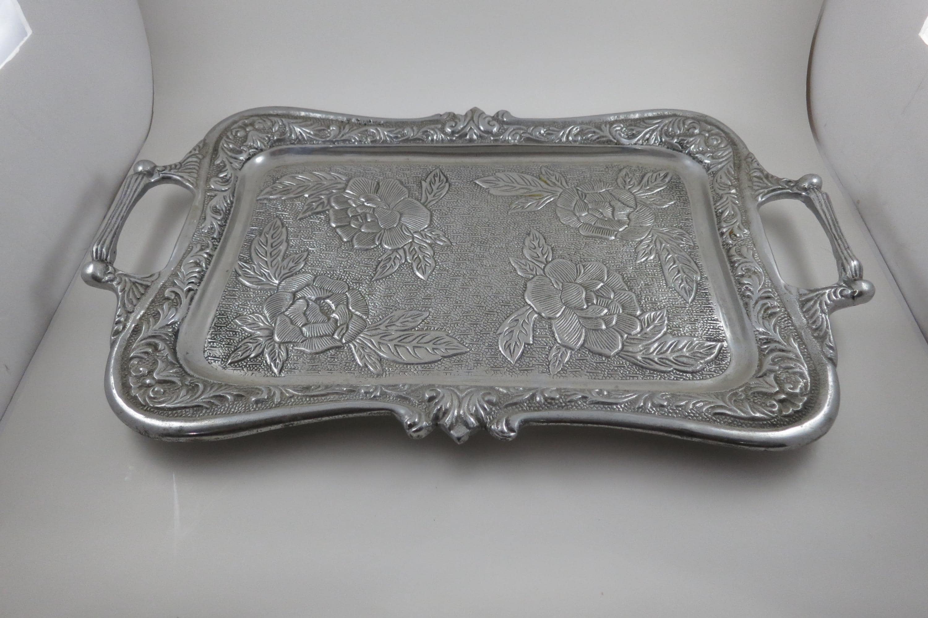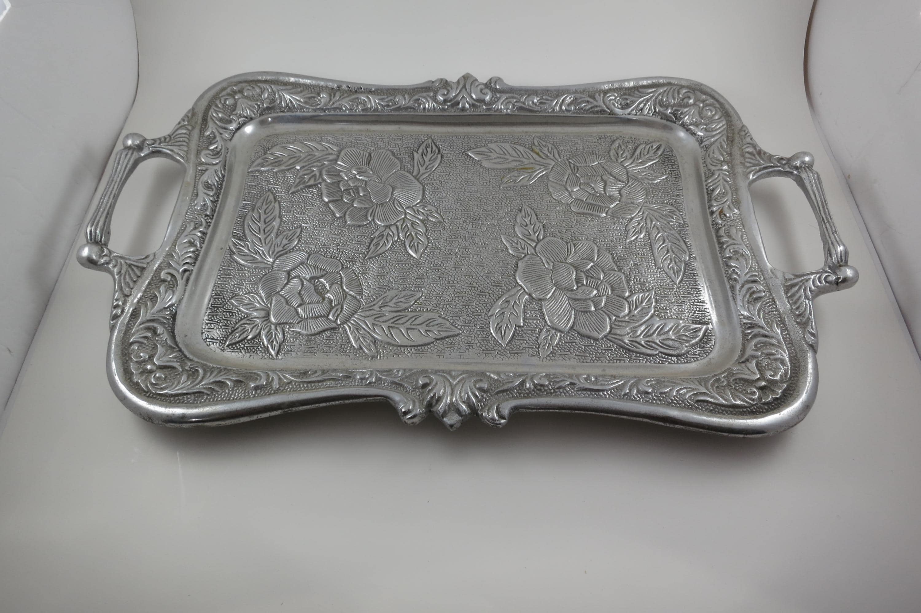 Large Vintage Ornate Hammered Aluminum Double Handled Tray 19x12
