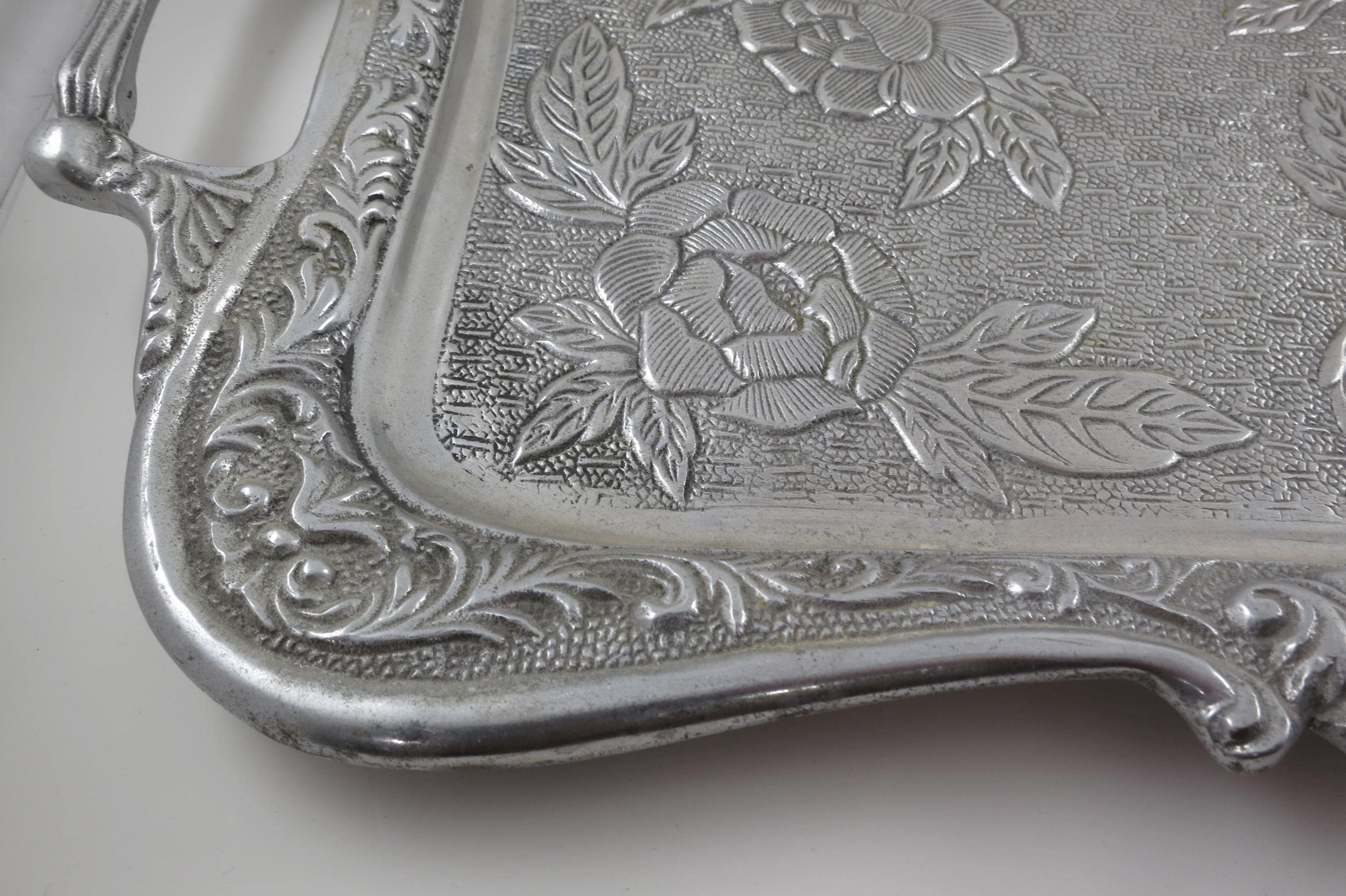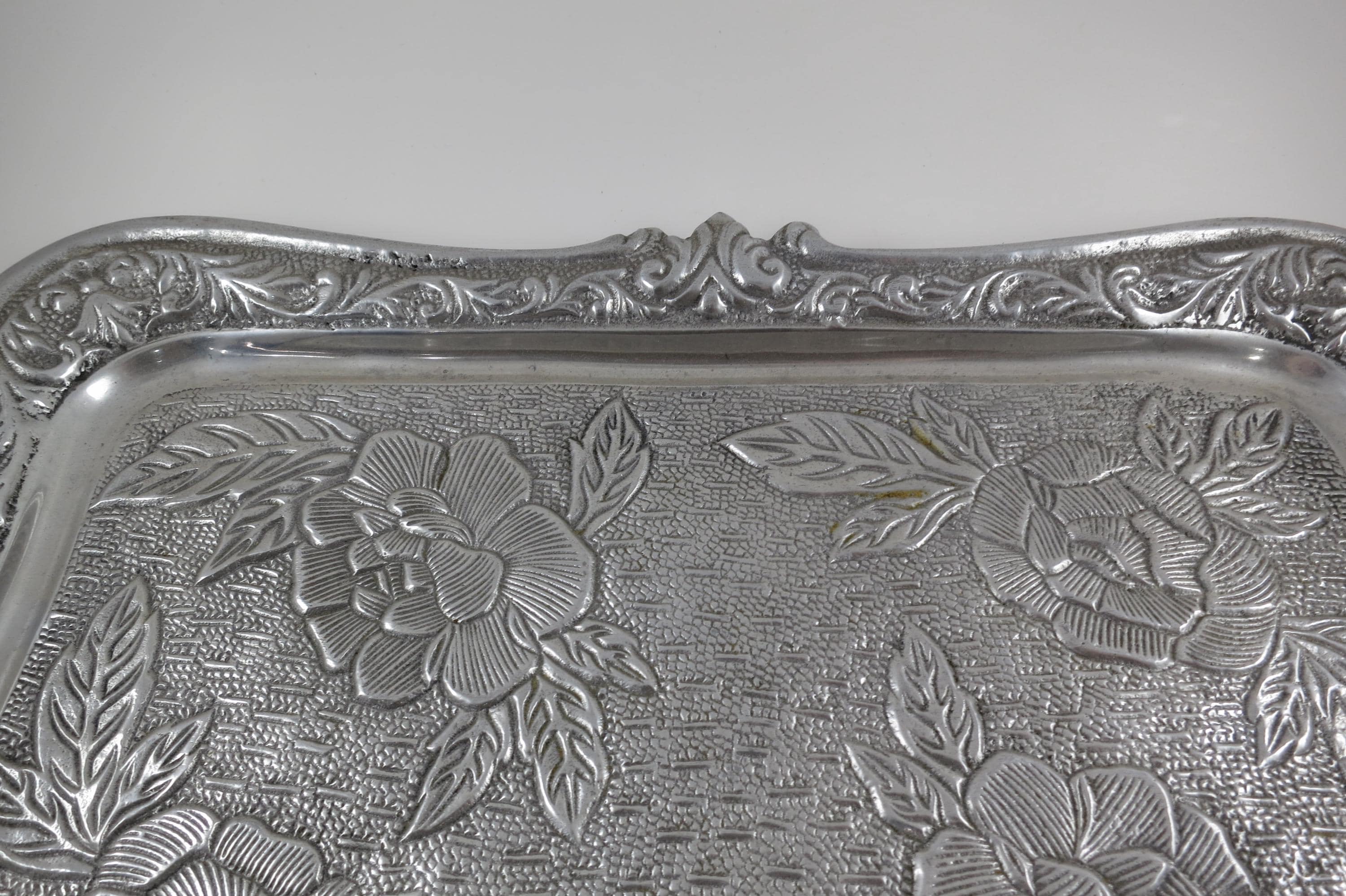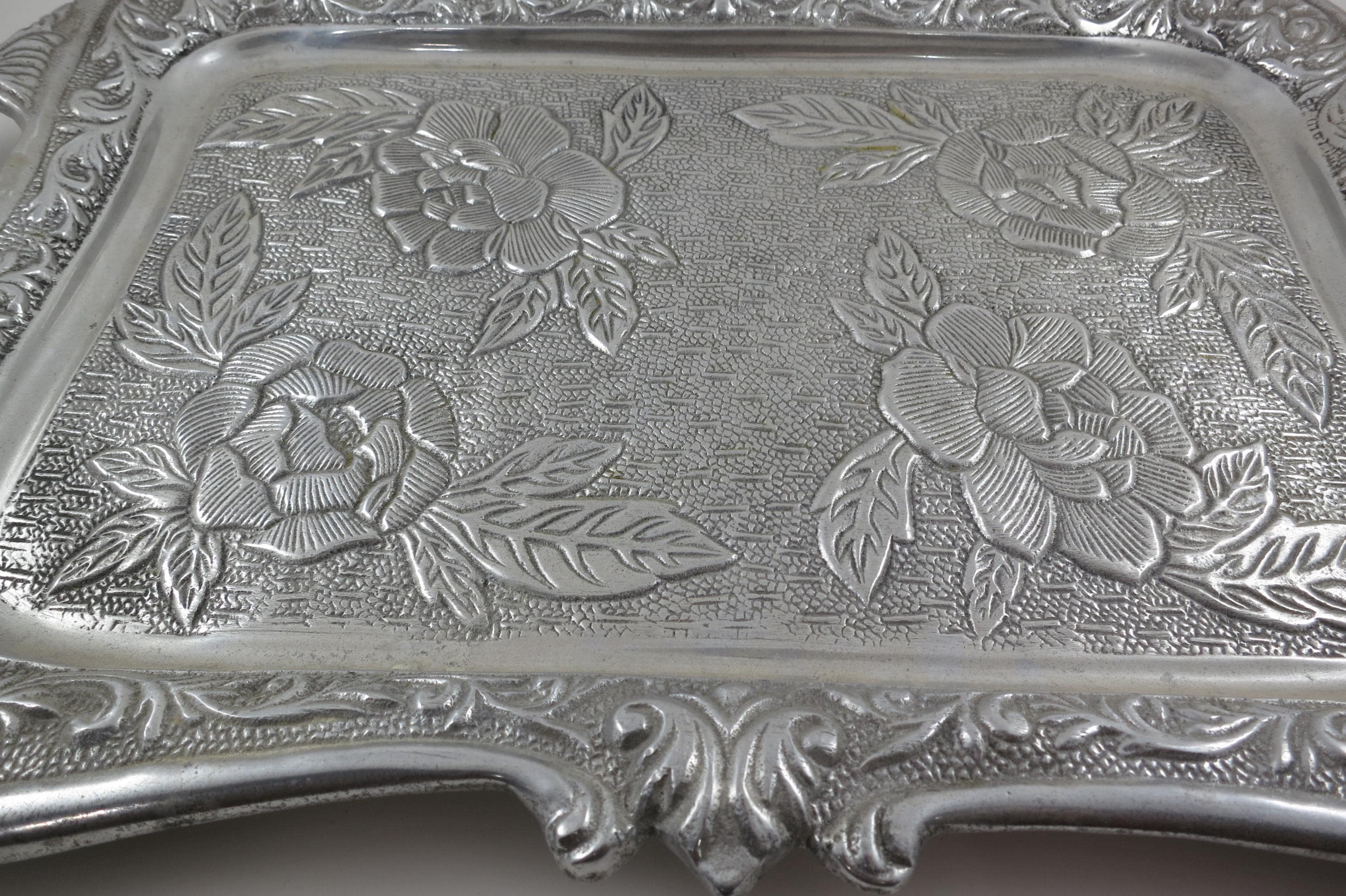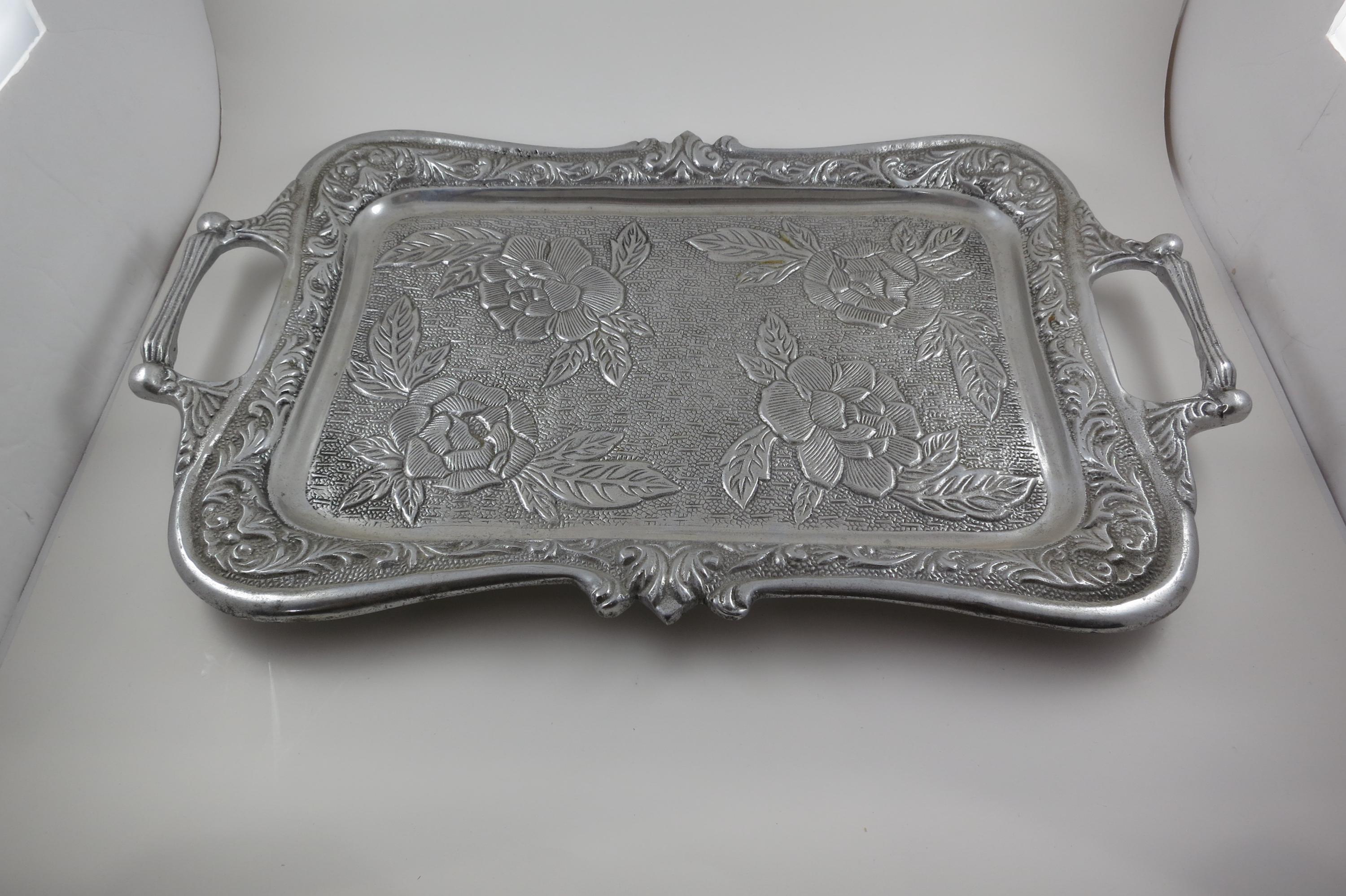 Large Vintage Ornate Hammered Aluminum Double Handled Tray 19x12